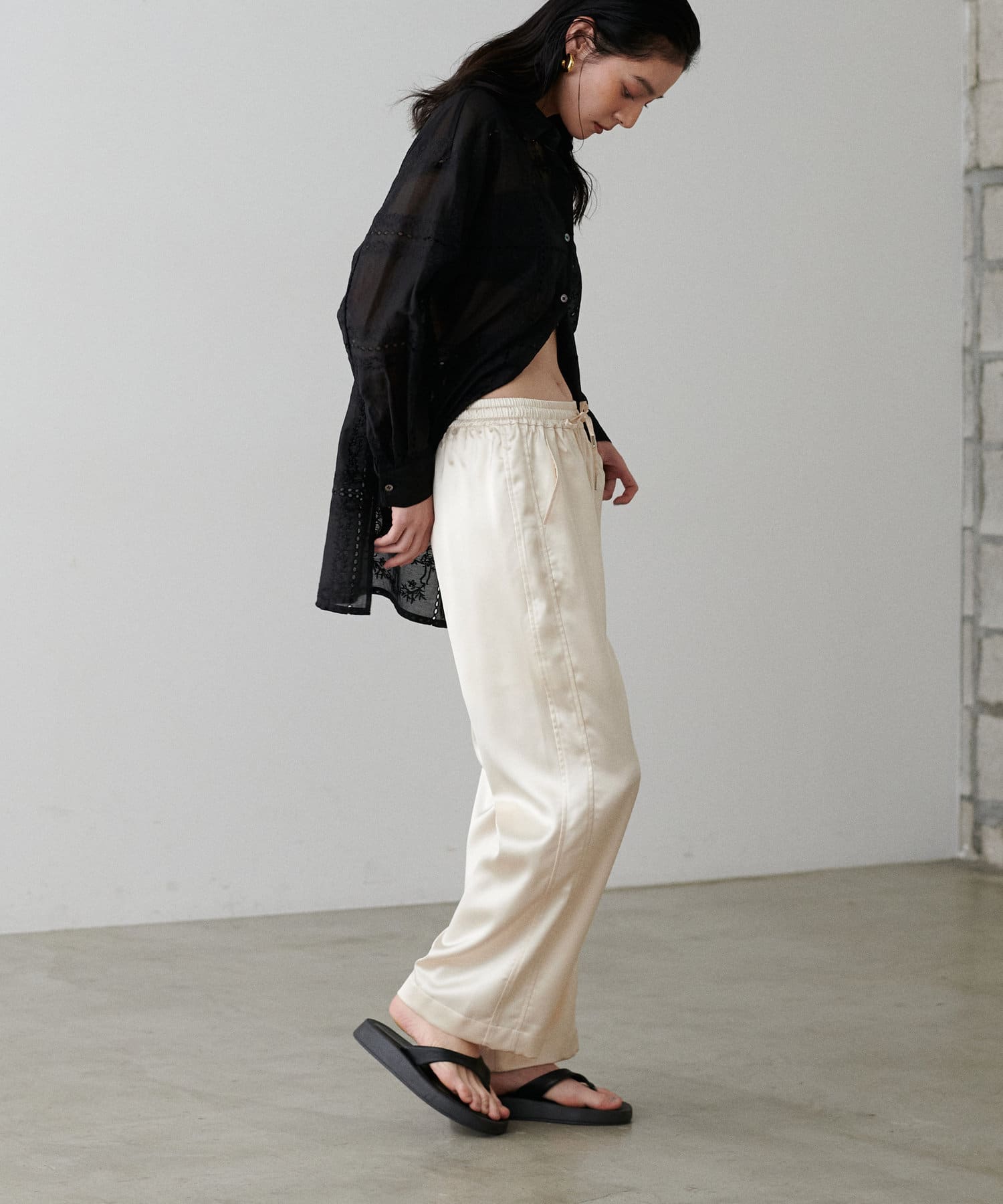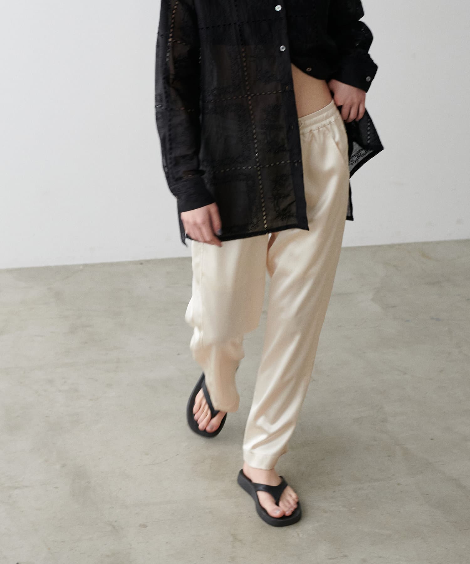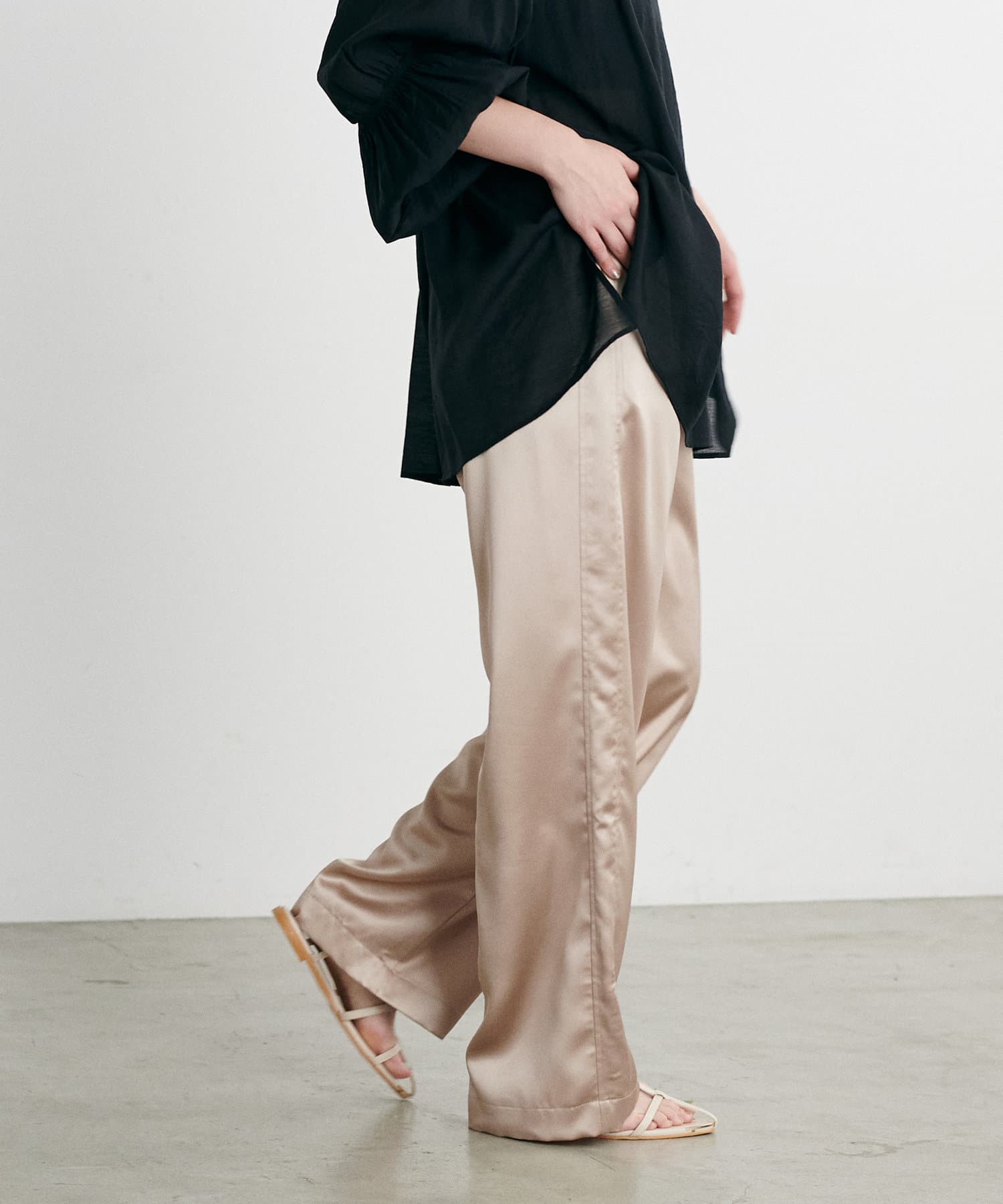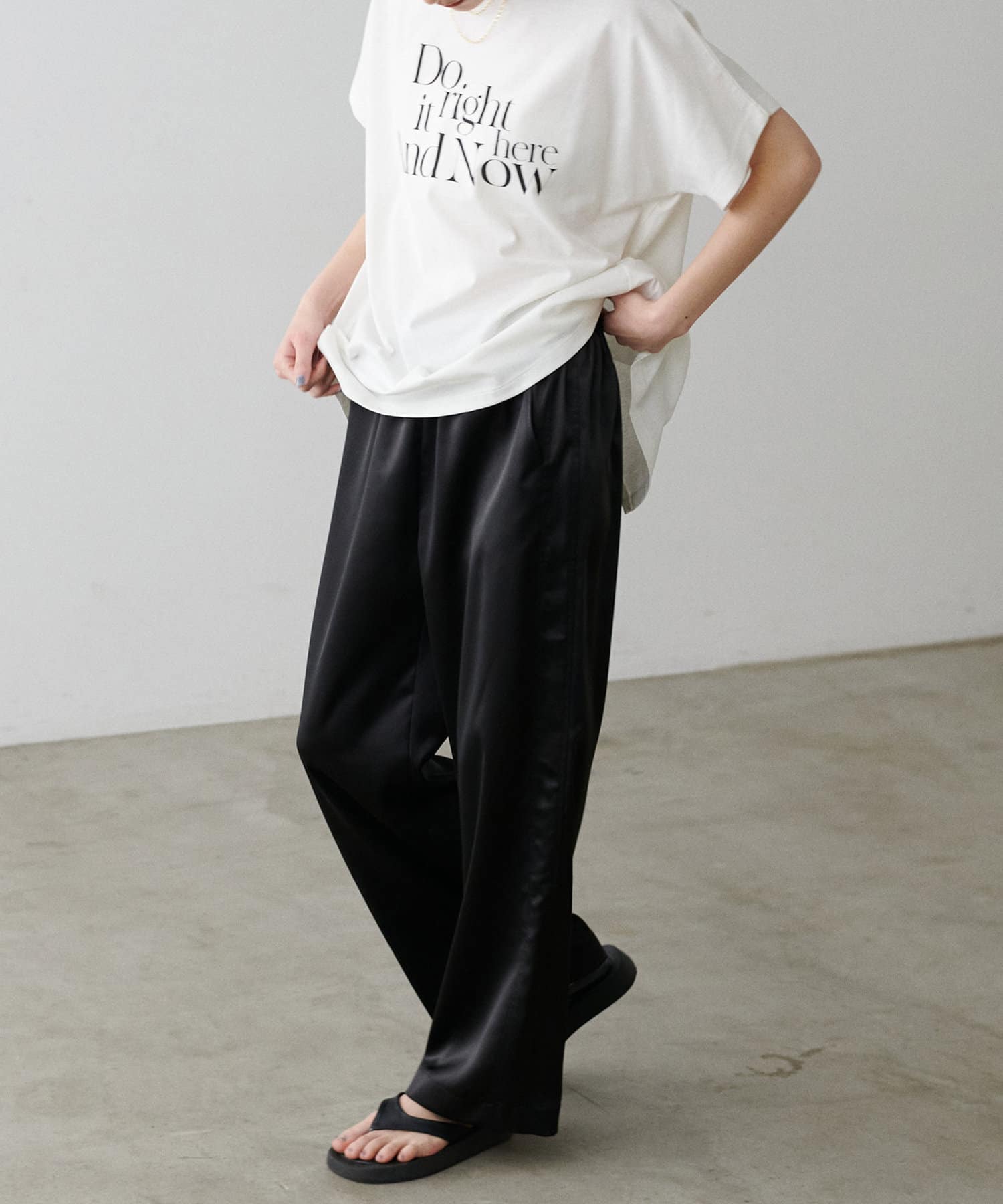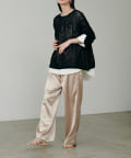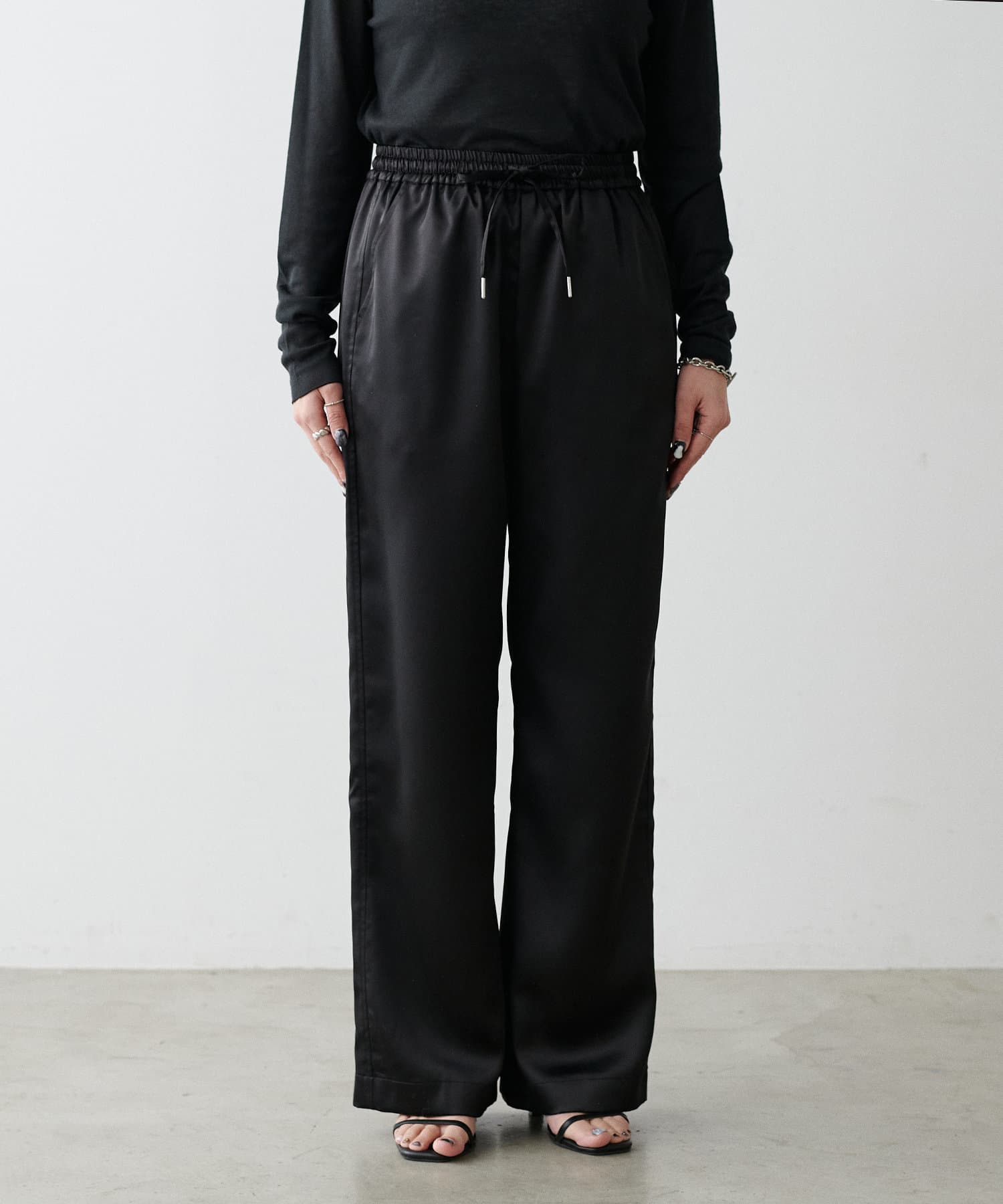 サイドのラインと艶のあるサテン生地がコーディネートのポイントになるイージーパンツ。