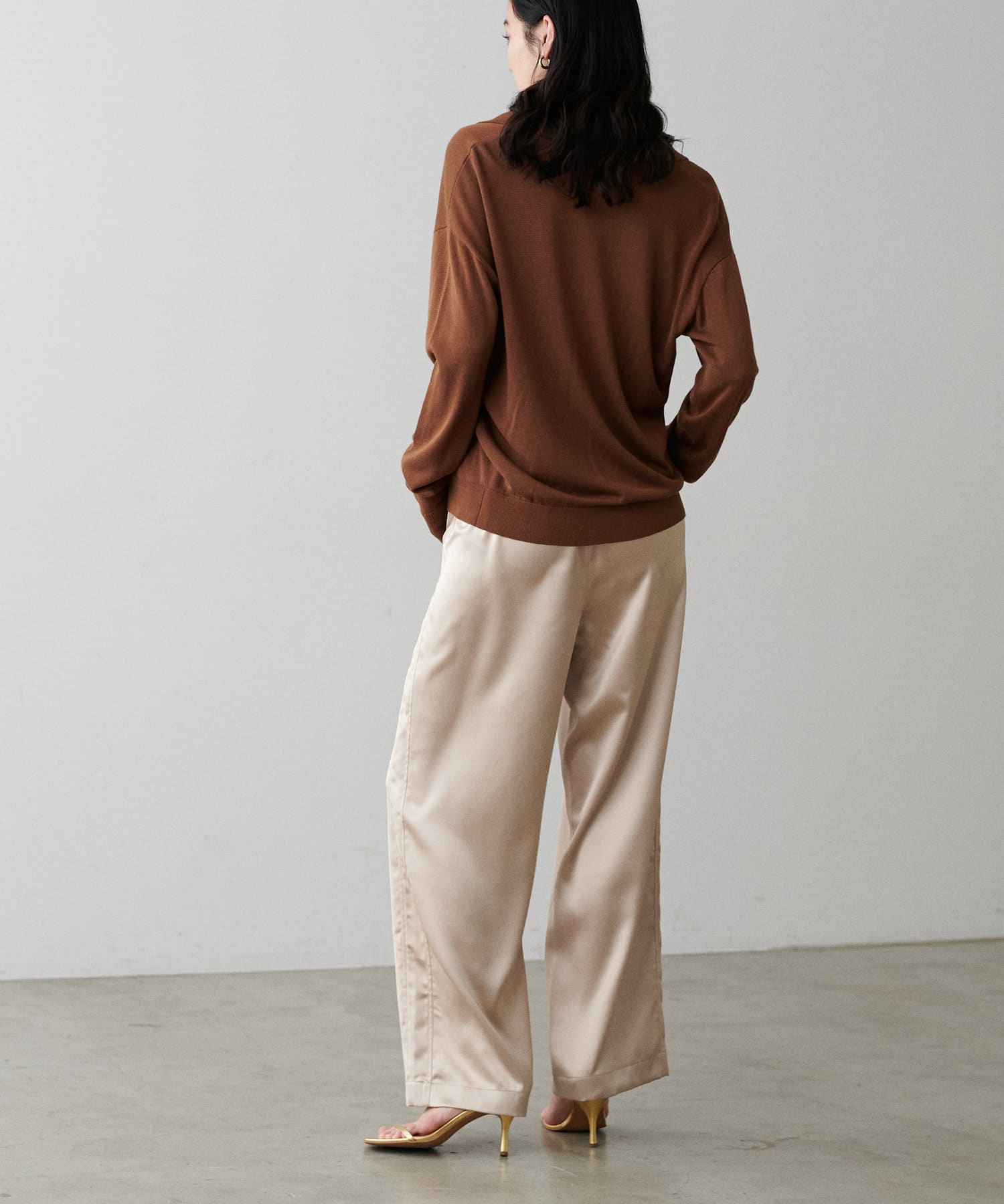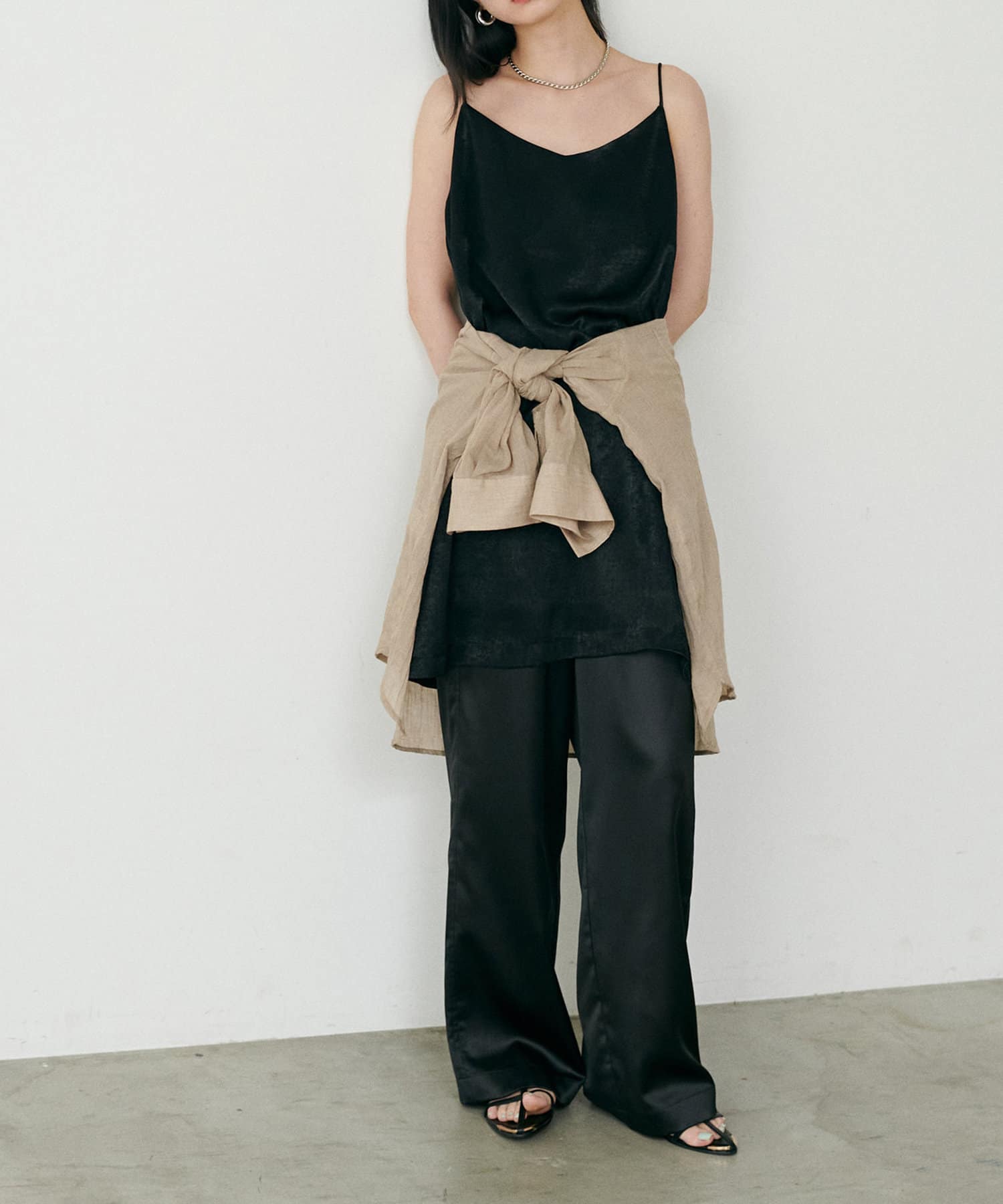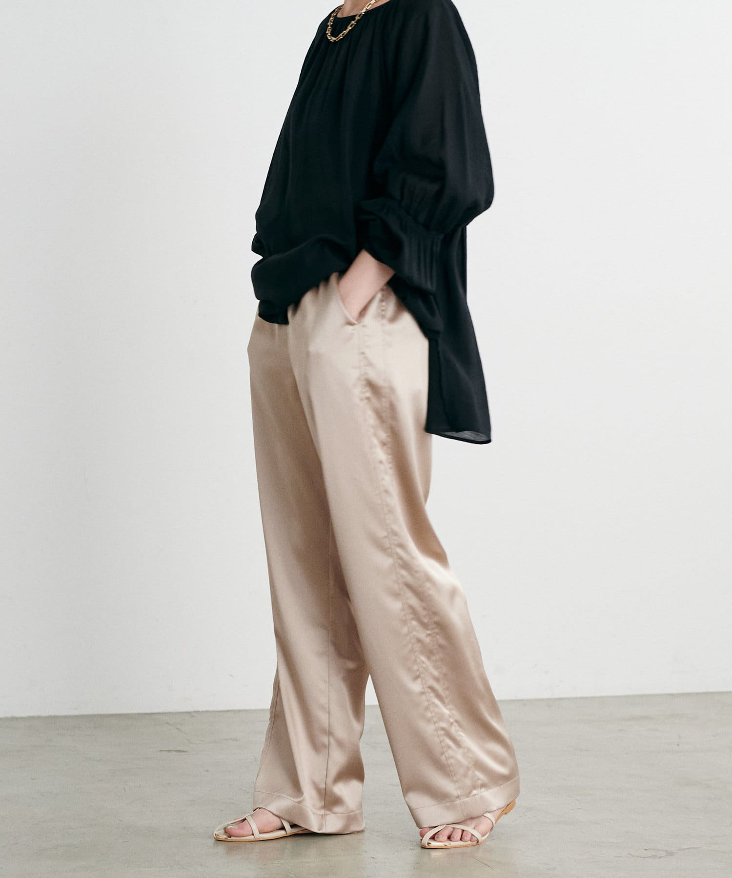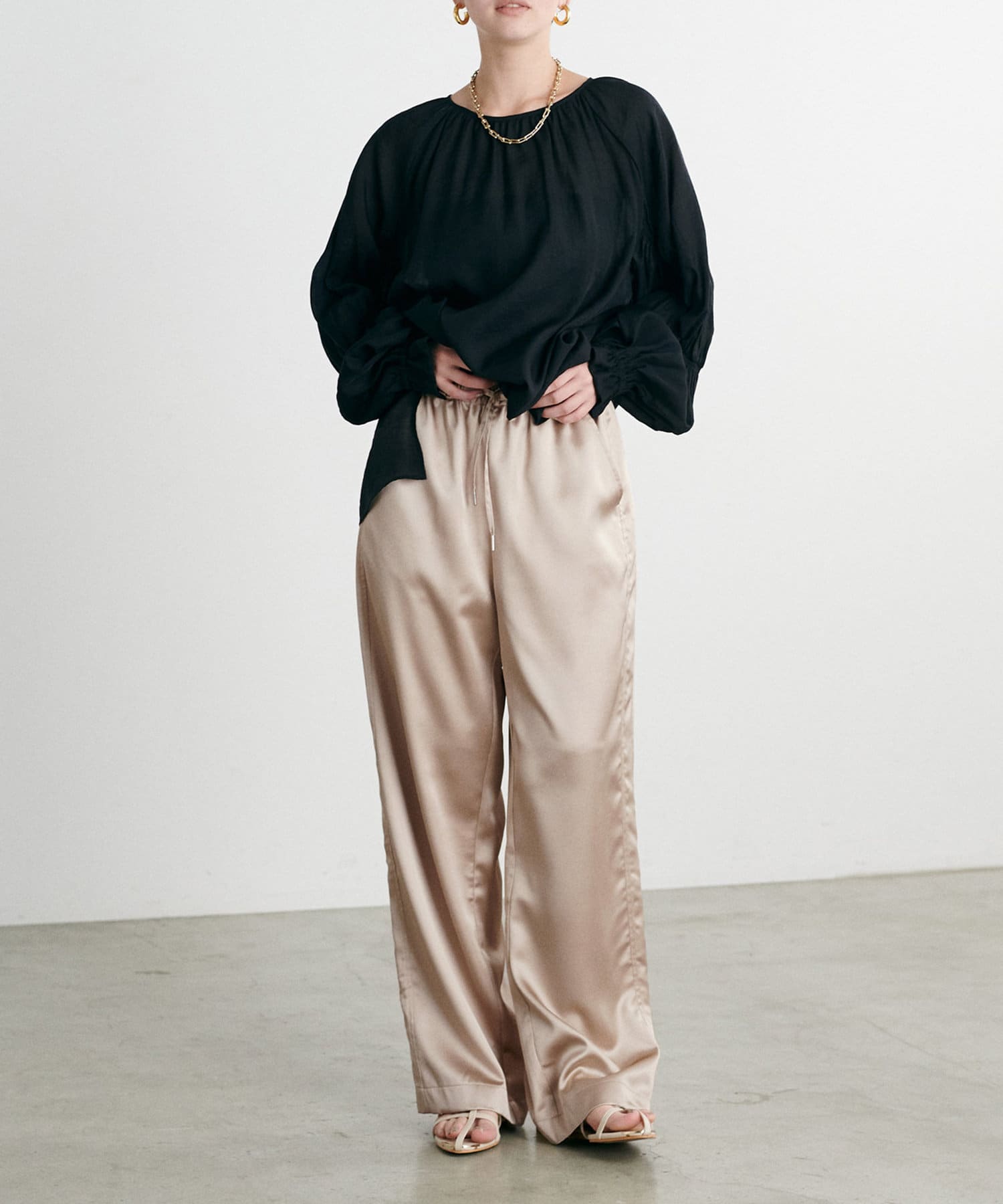 カジュアルな中にもサテンの上品さが光るワンランク上のスタイリングに仕上がります。