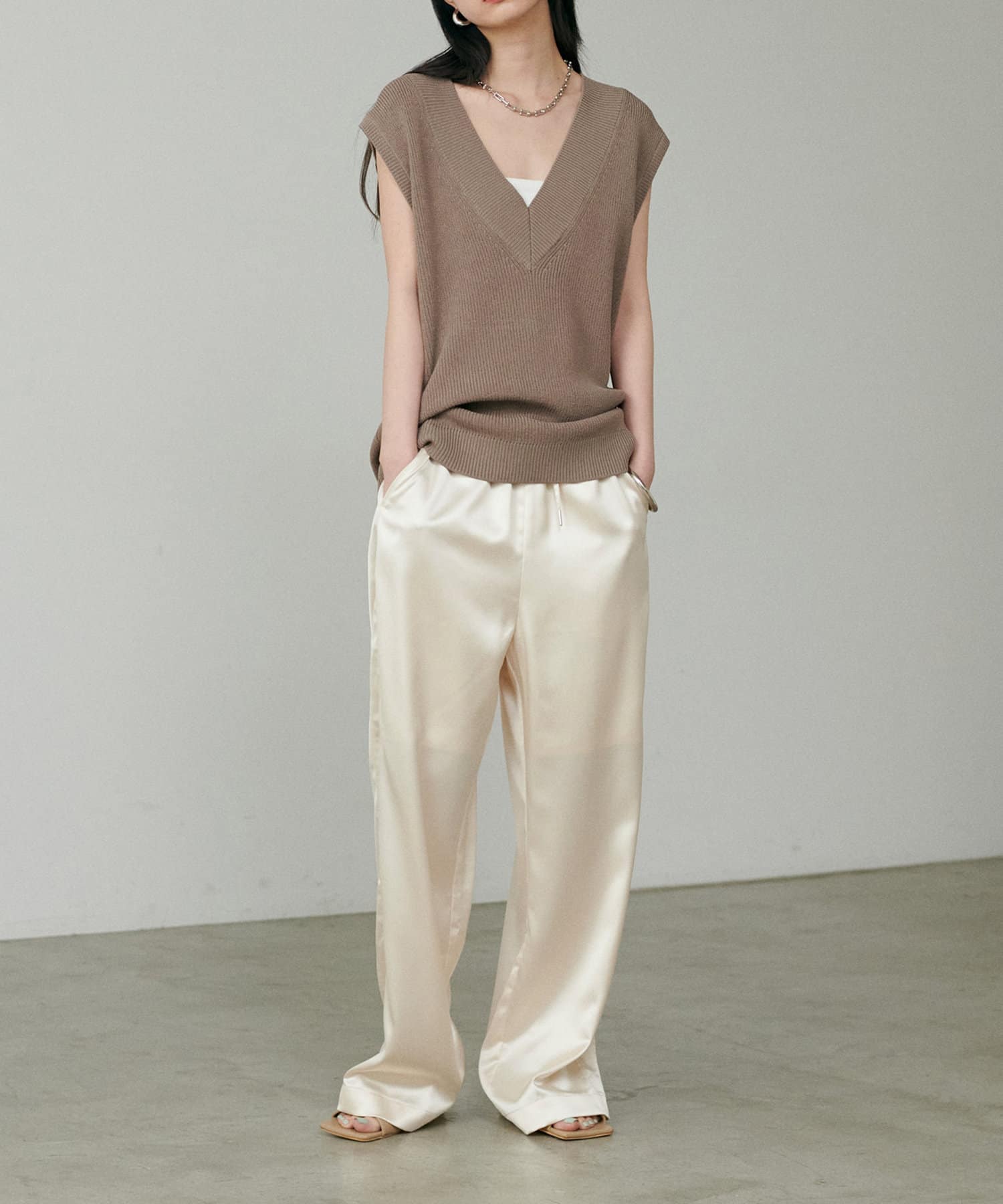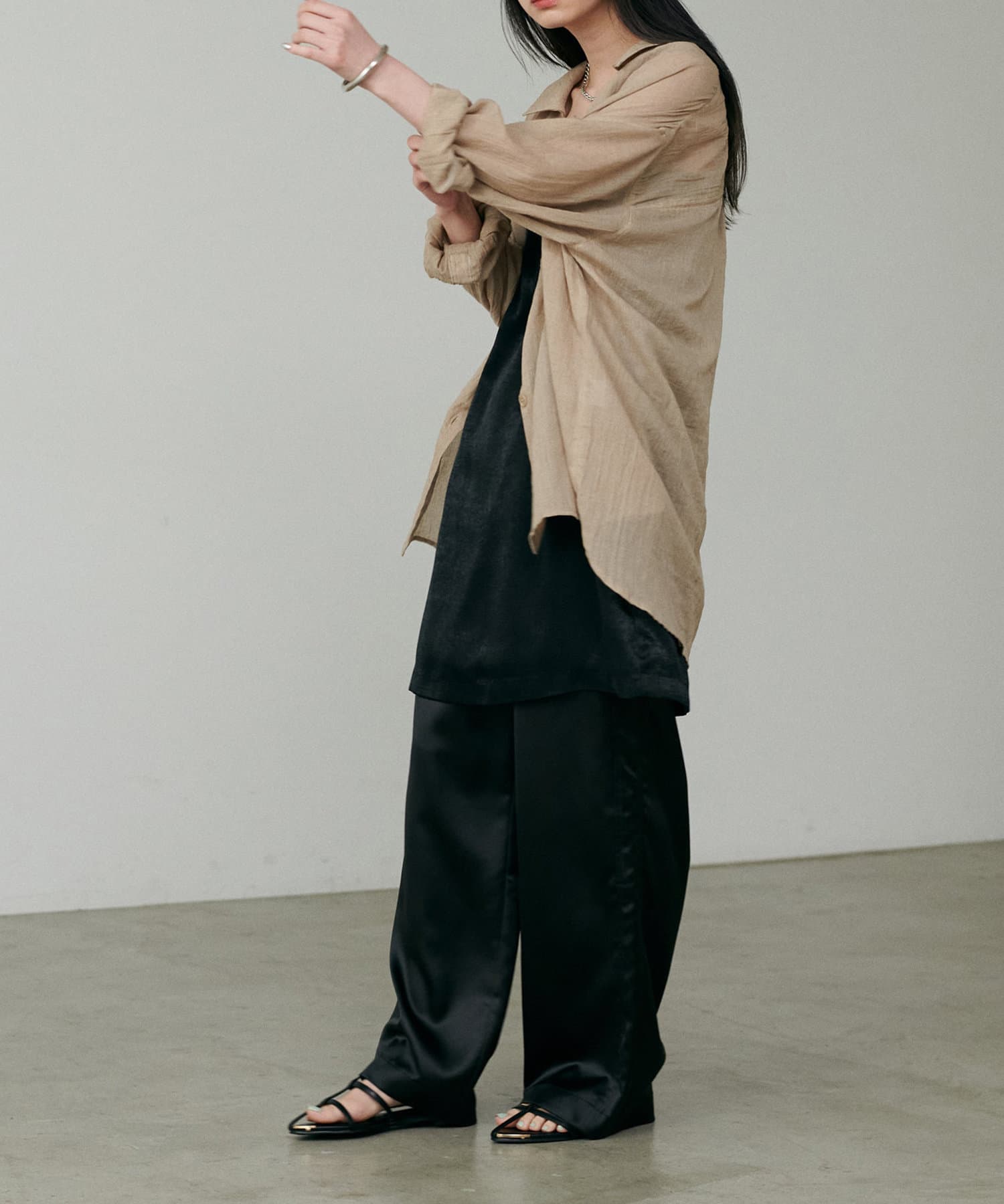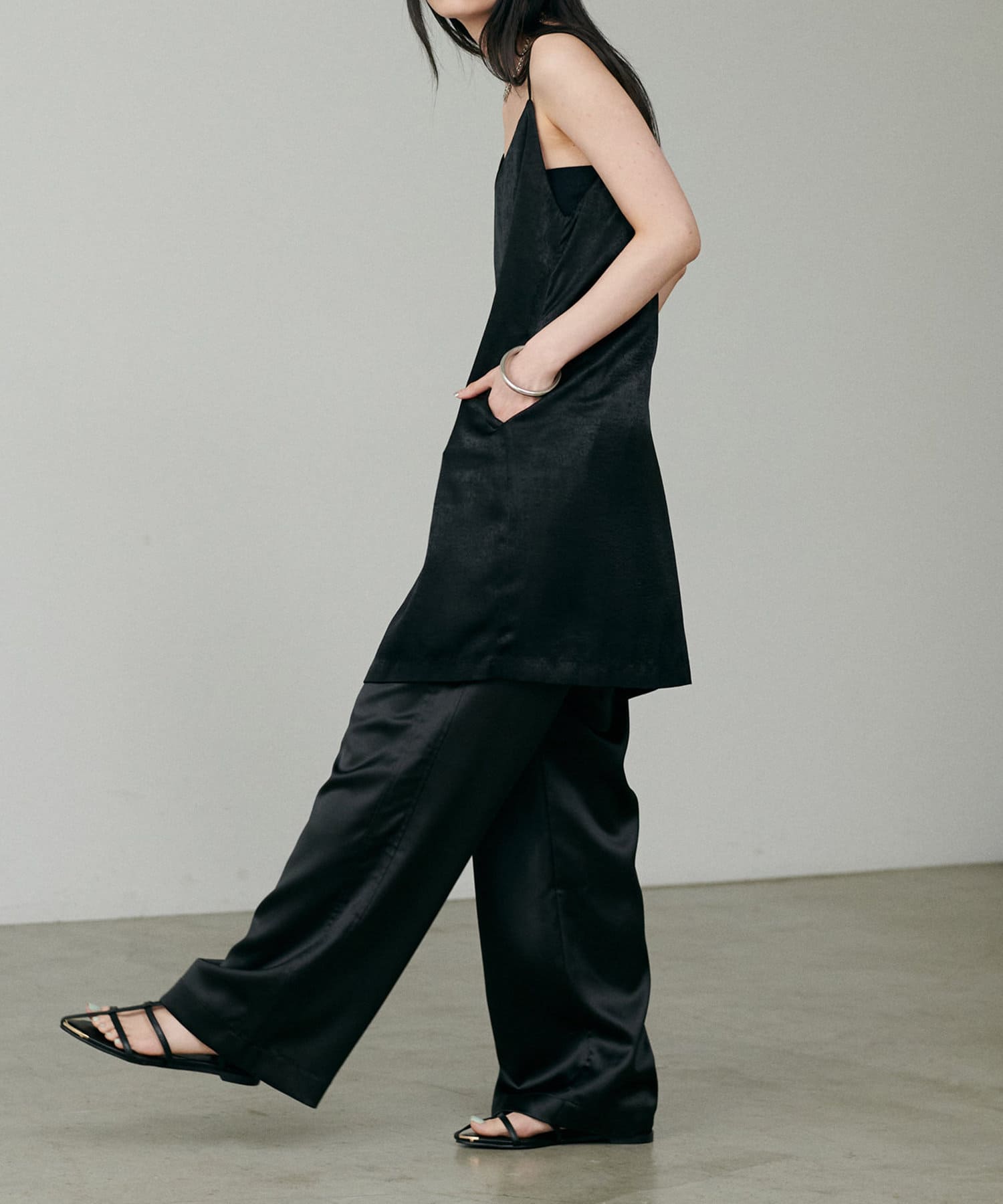 カジュアルな中にもサテンの上品さが光るワンランク上のスタイリングに仕上がります。