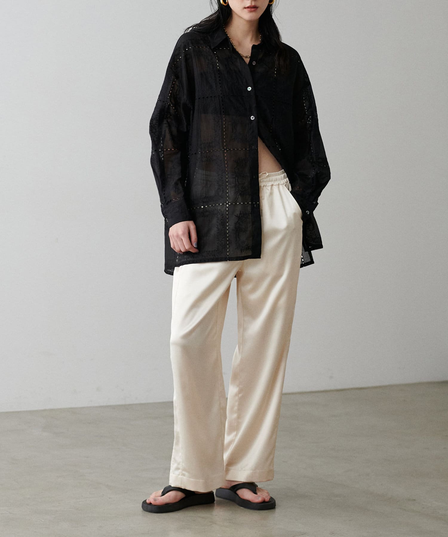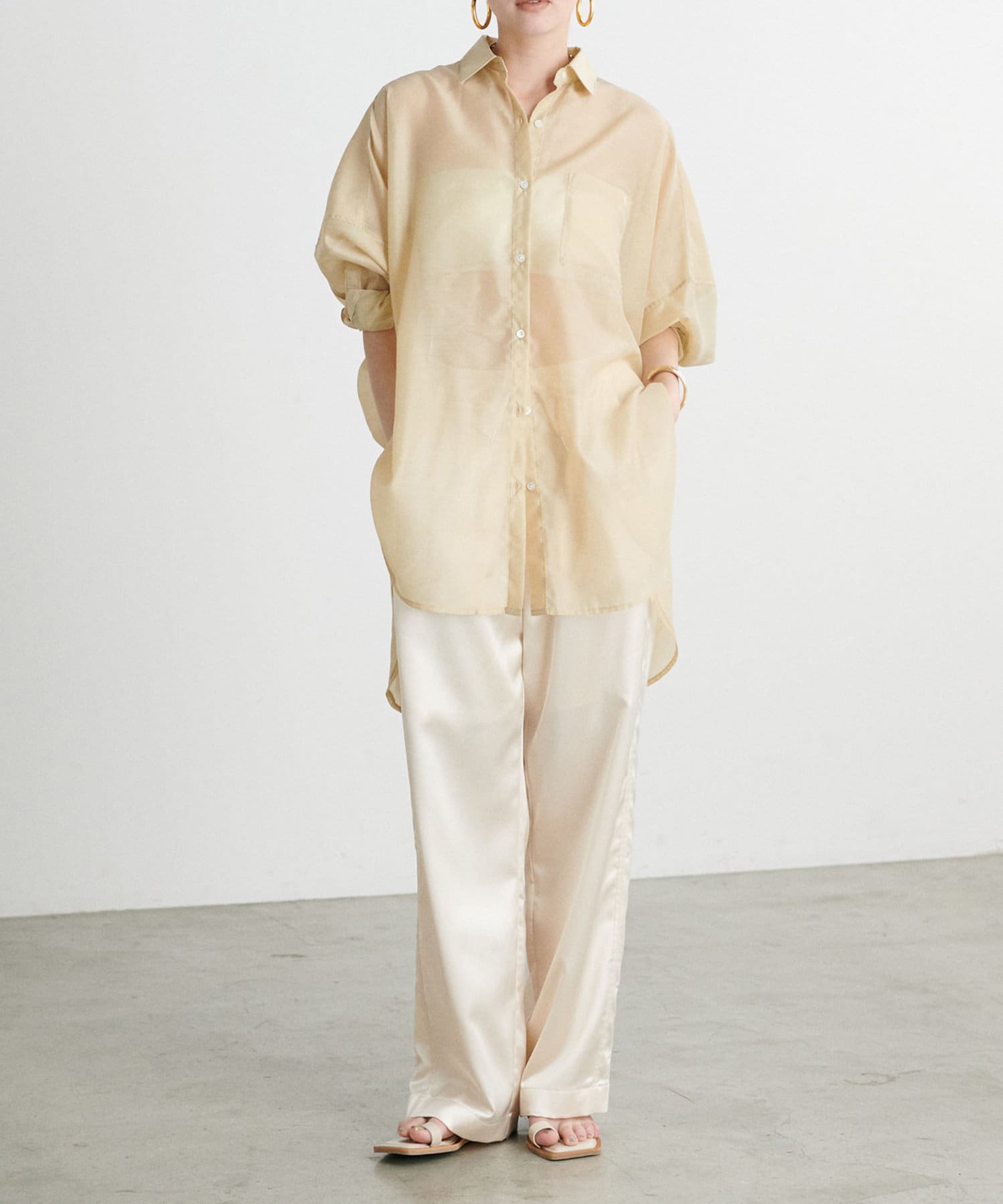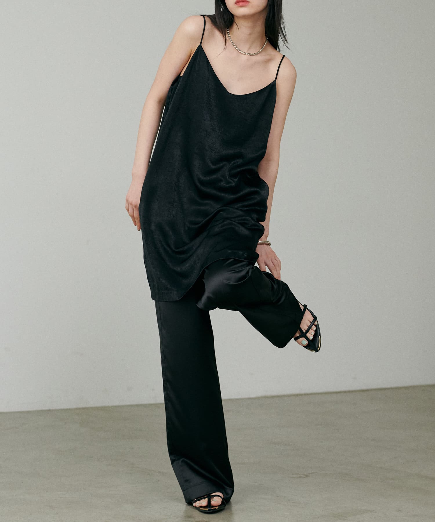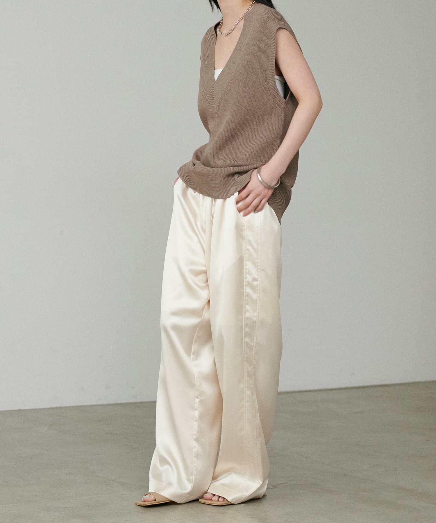 カジュアルな中にもサテンの上品さが光るワンランク上のスタイリングに仕上がります。