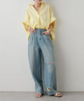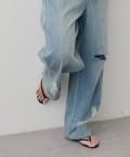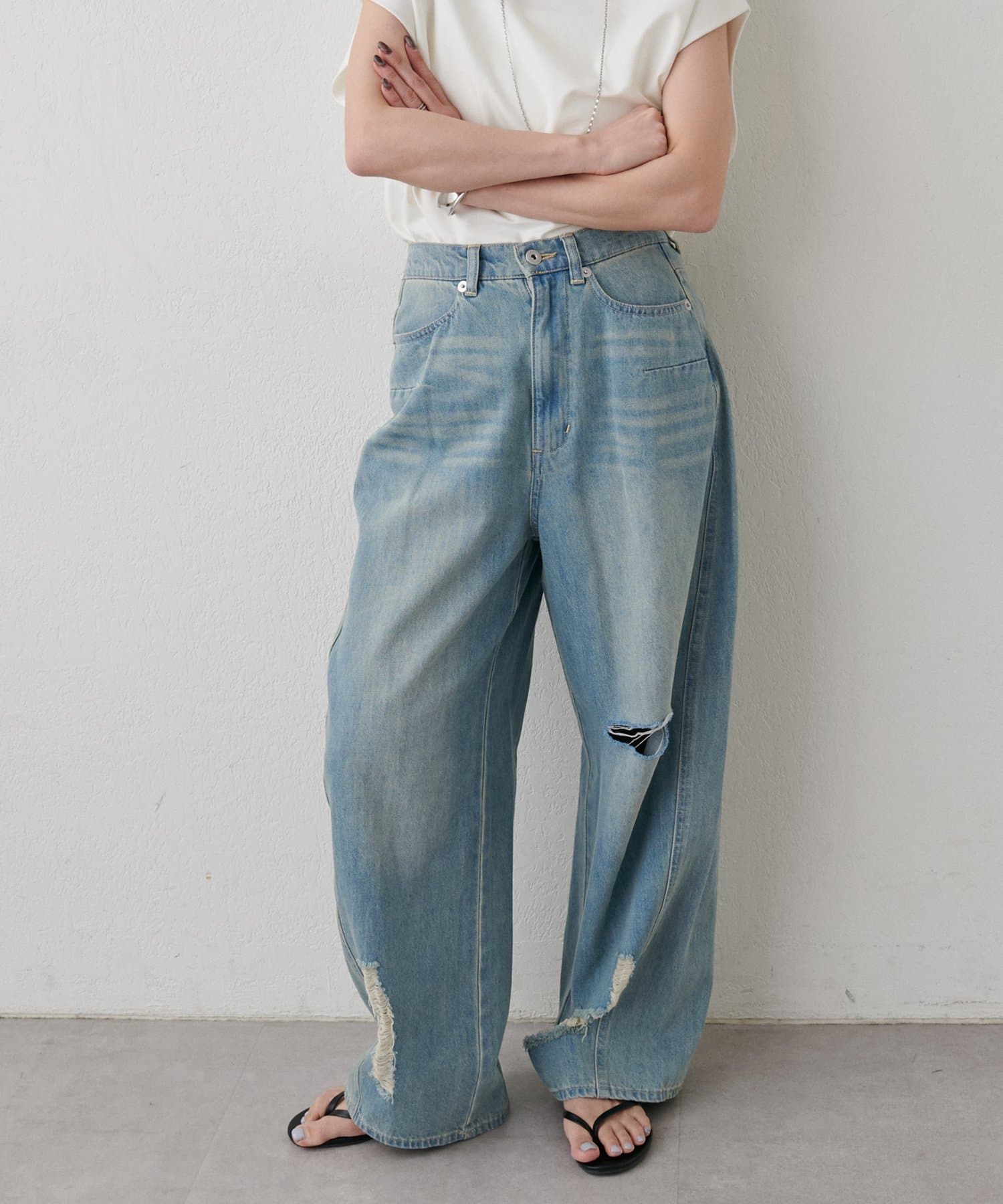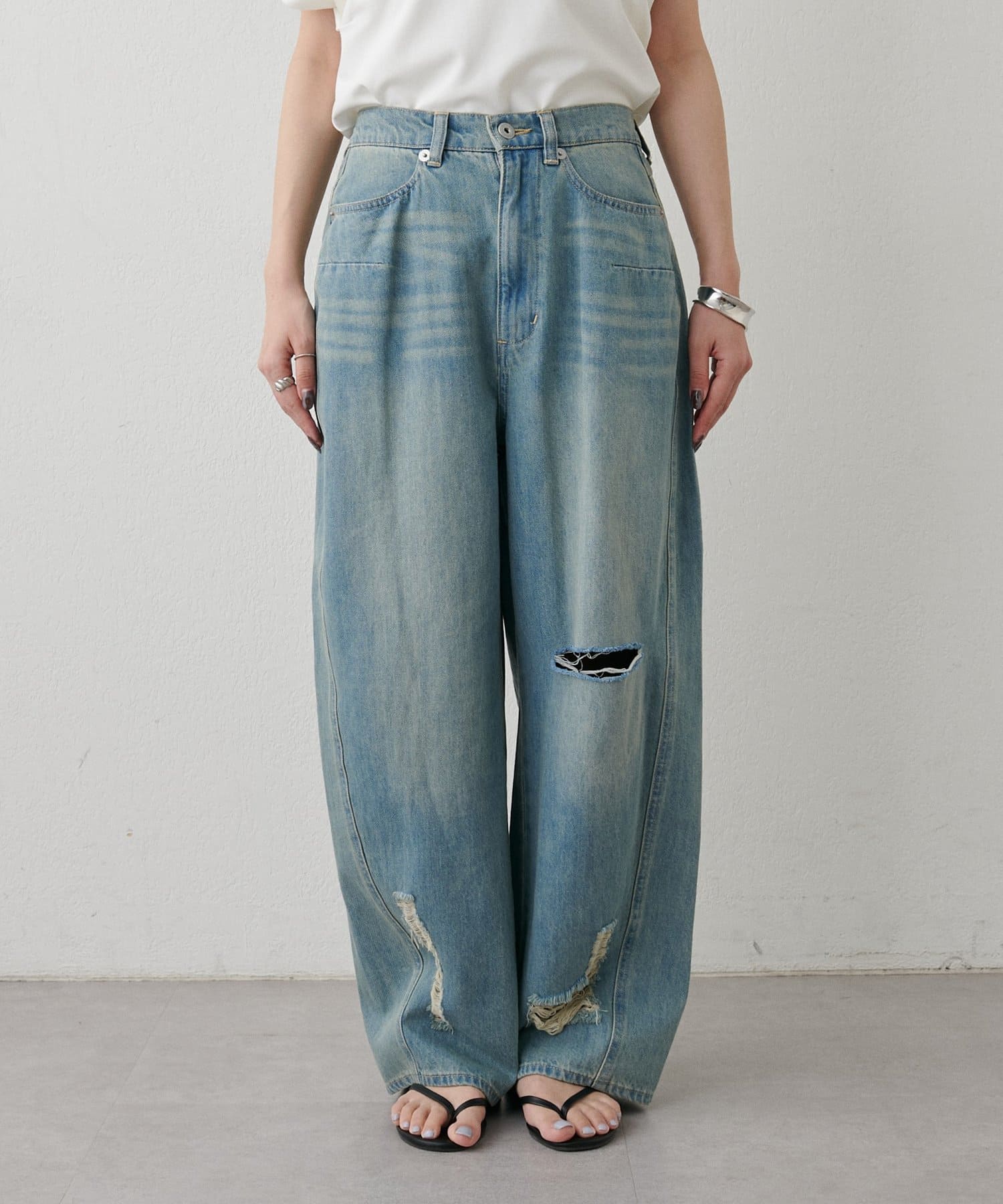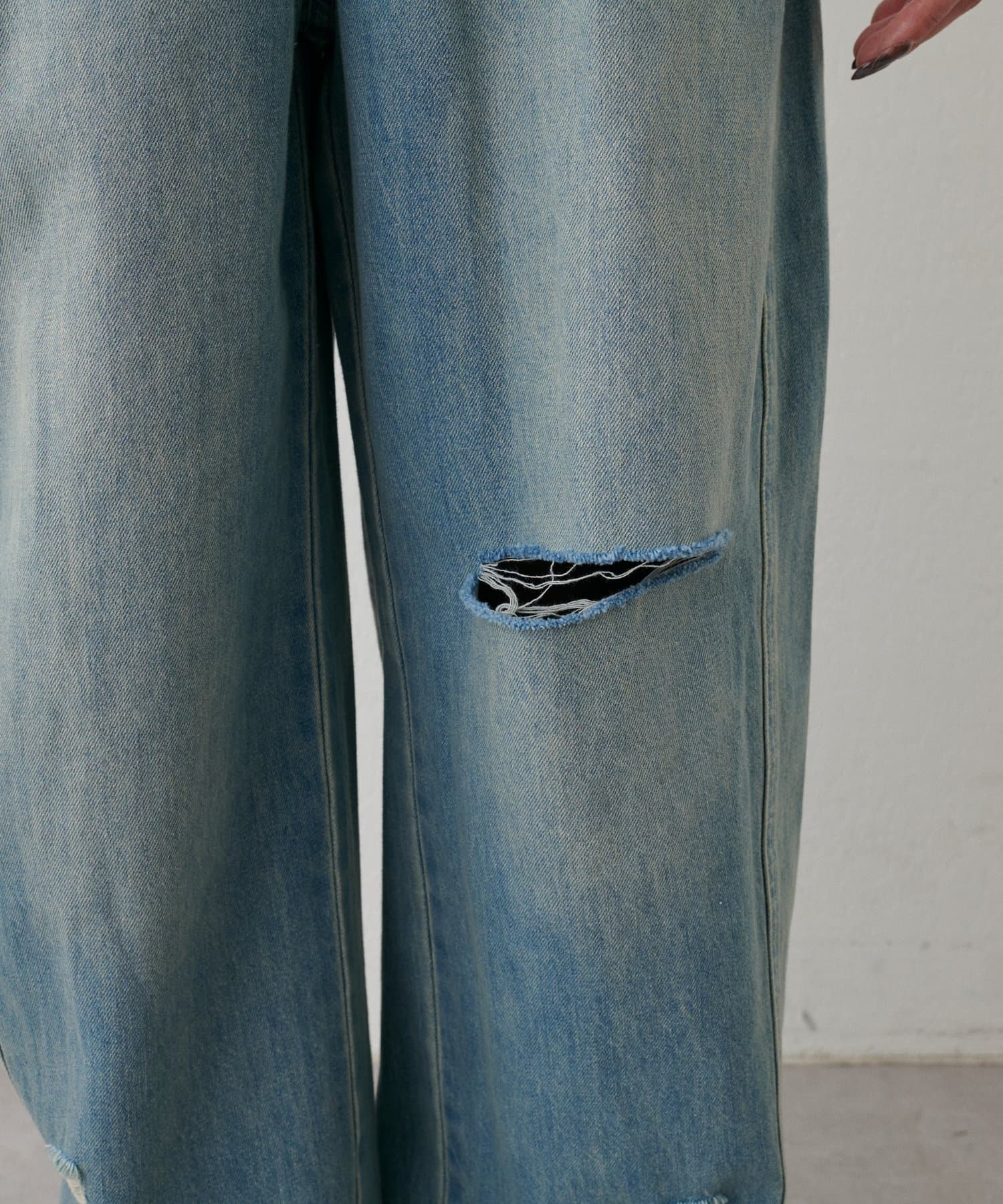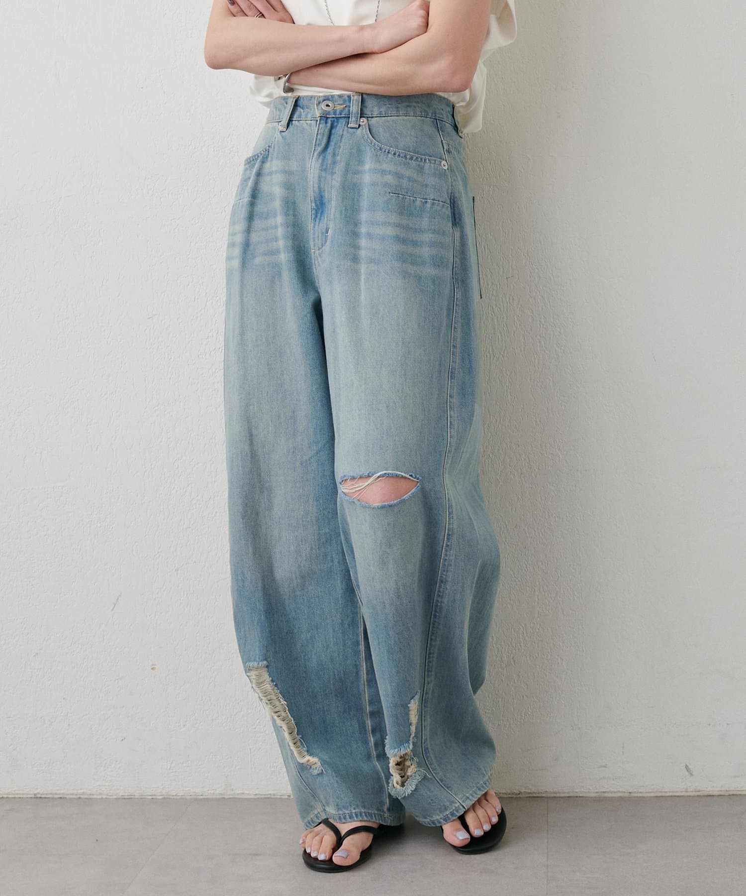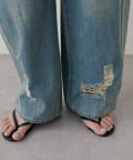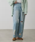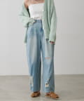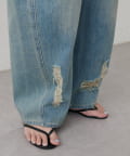 目を引く大胆なクラッシュ加工が、エッジの効いたアクセントになったデニム。