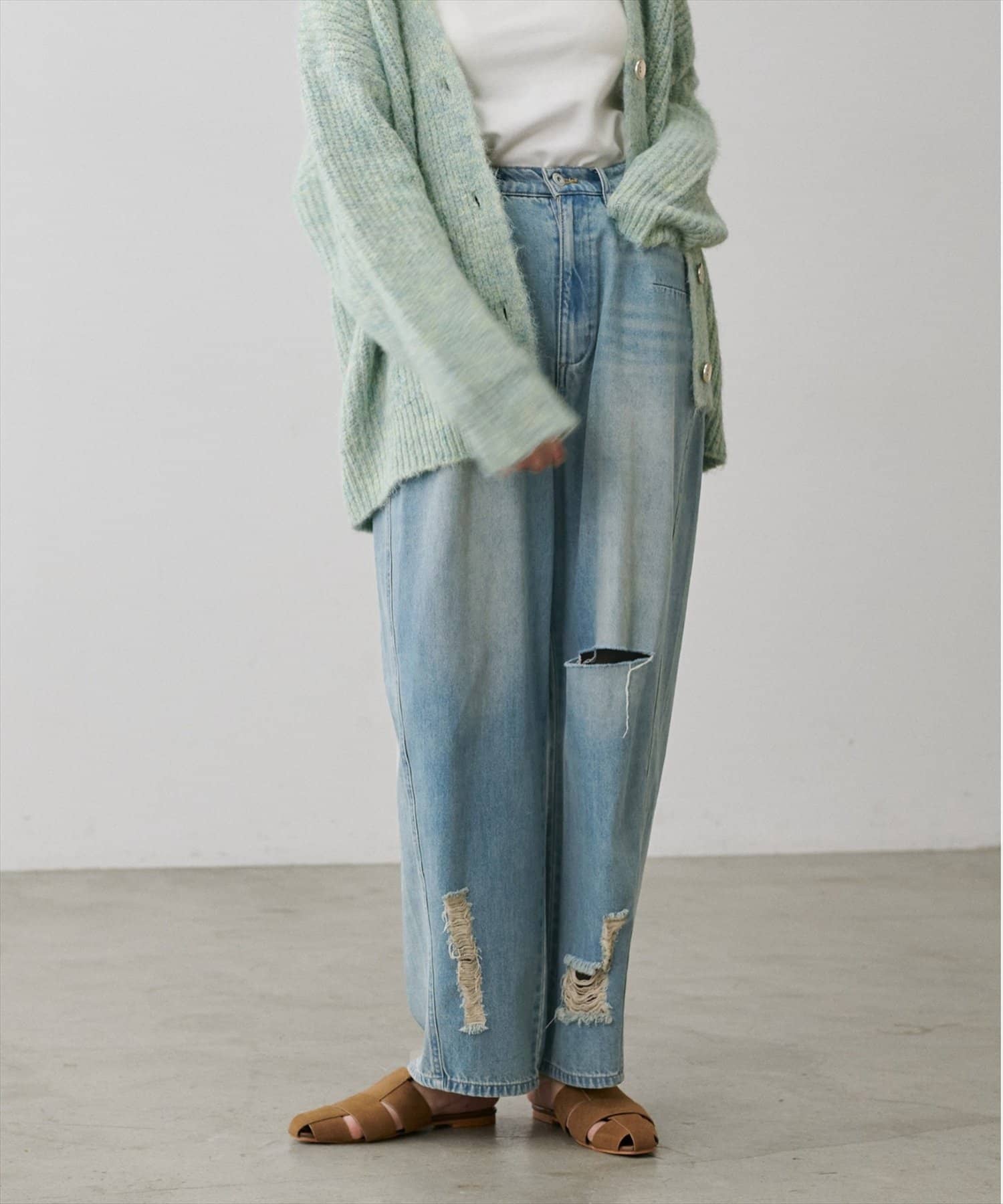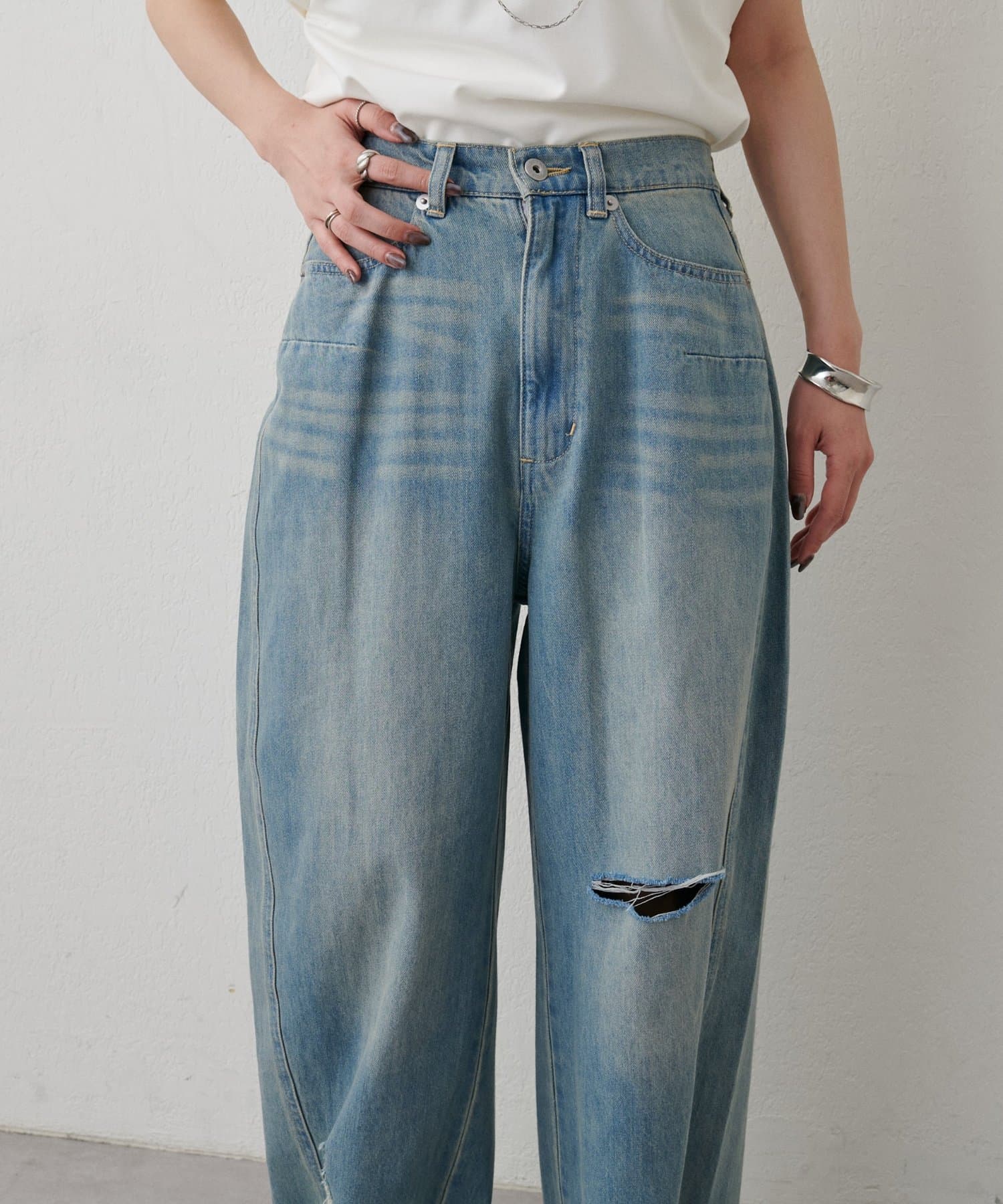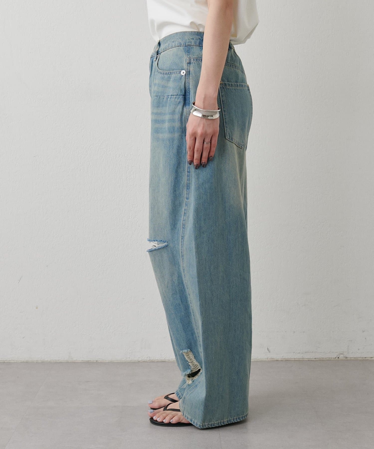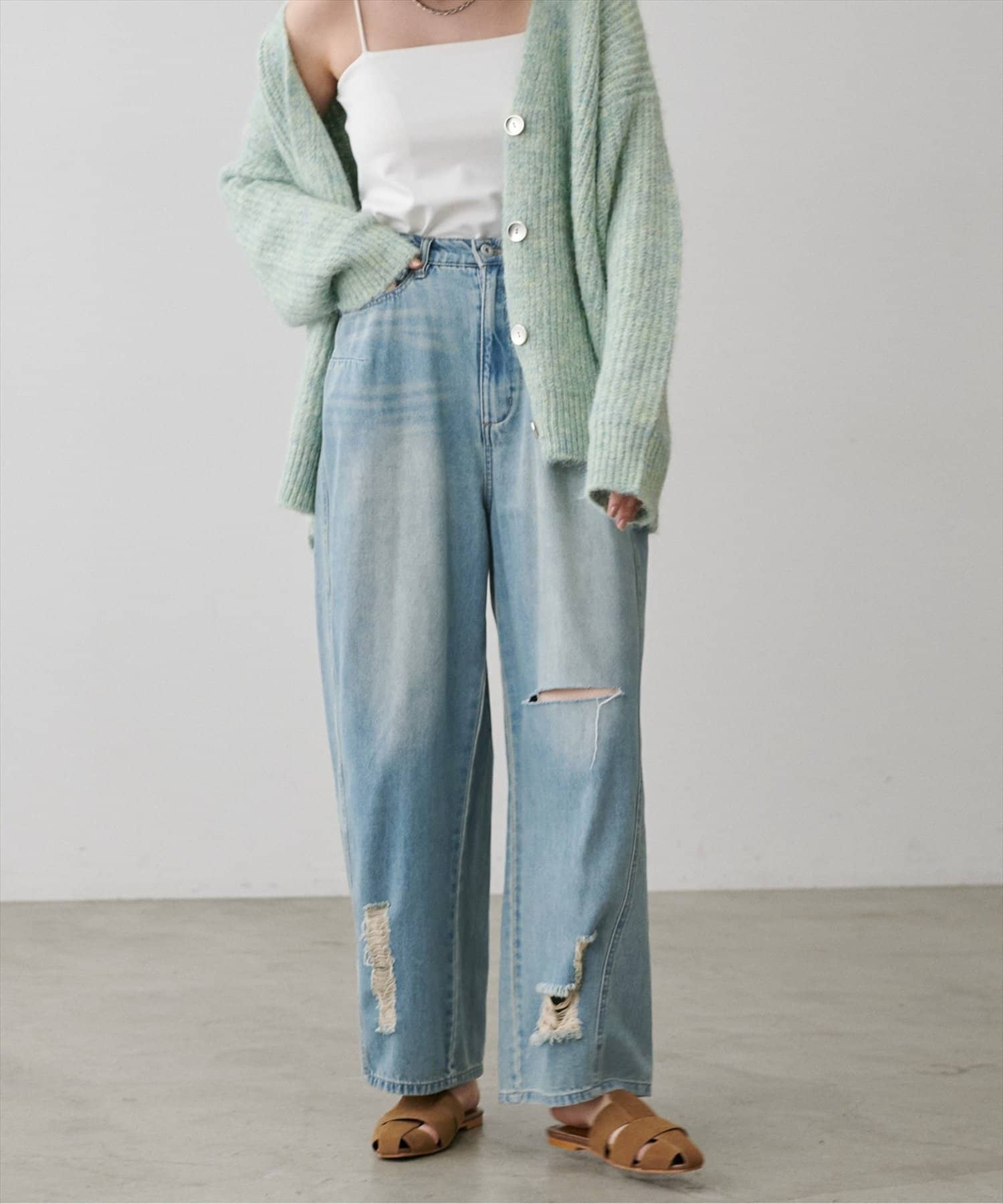 目を引く大胆なクラッシュ加工が、エッジの効いたアクセントになったデニム。