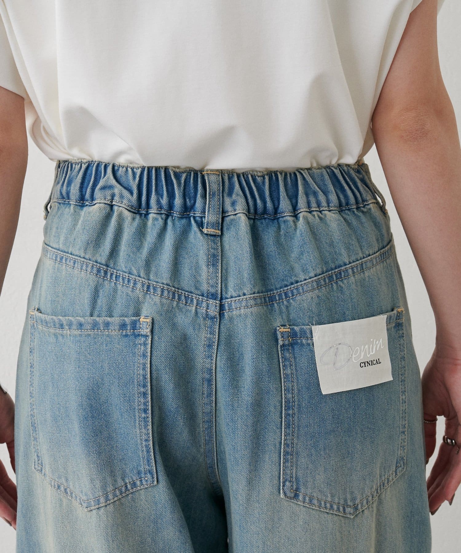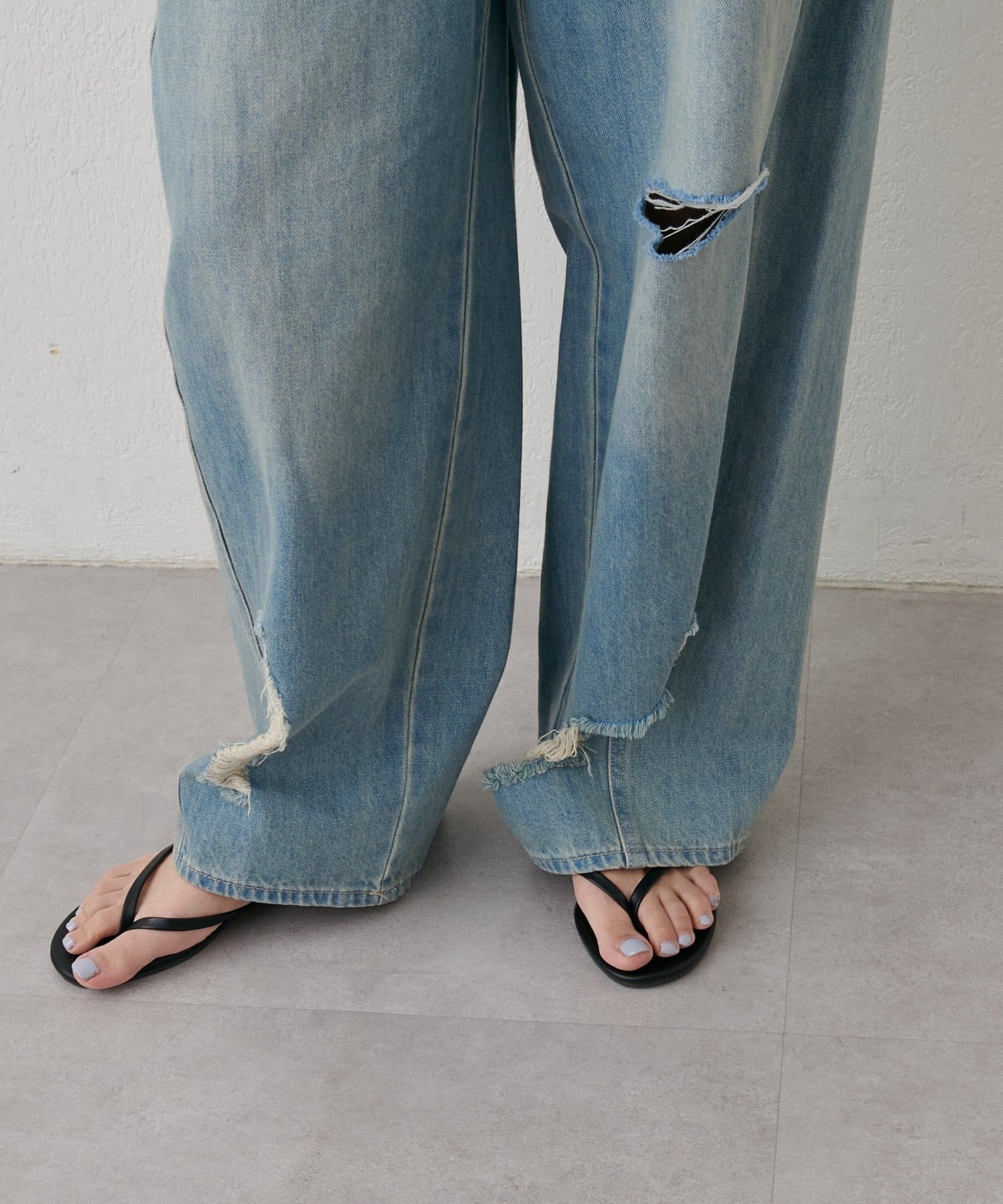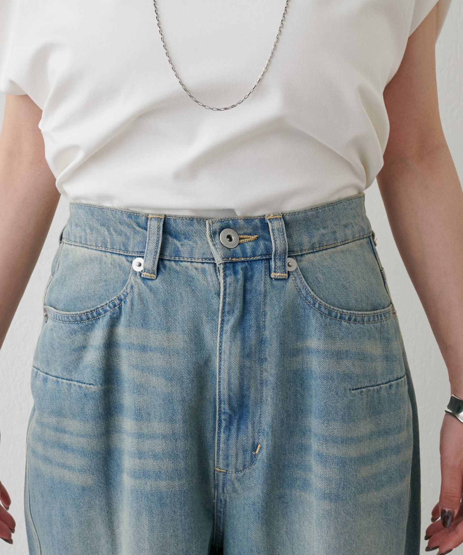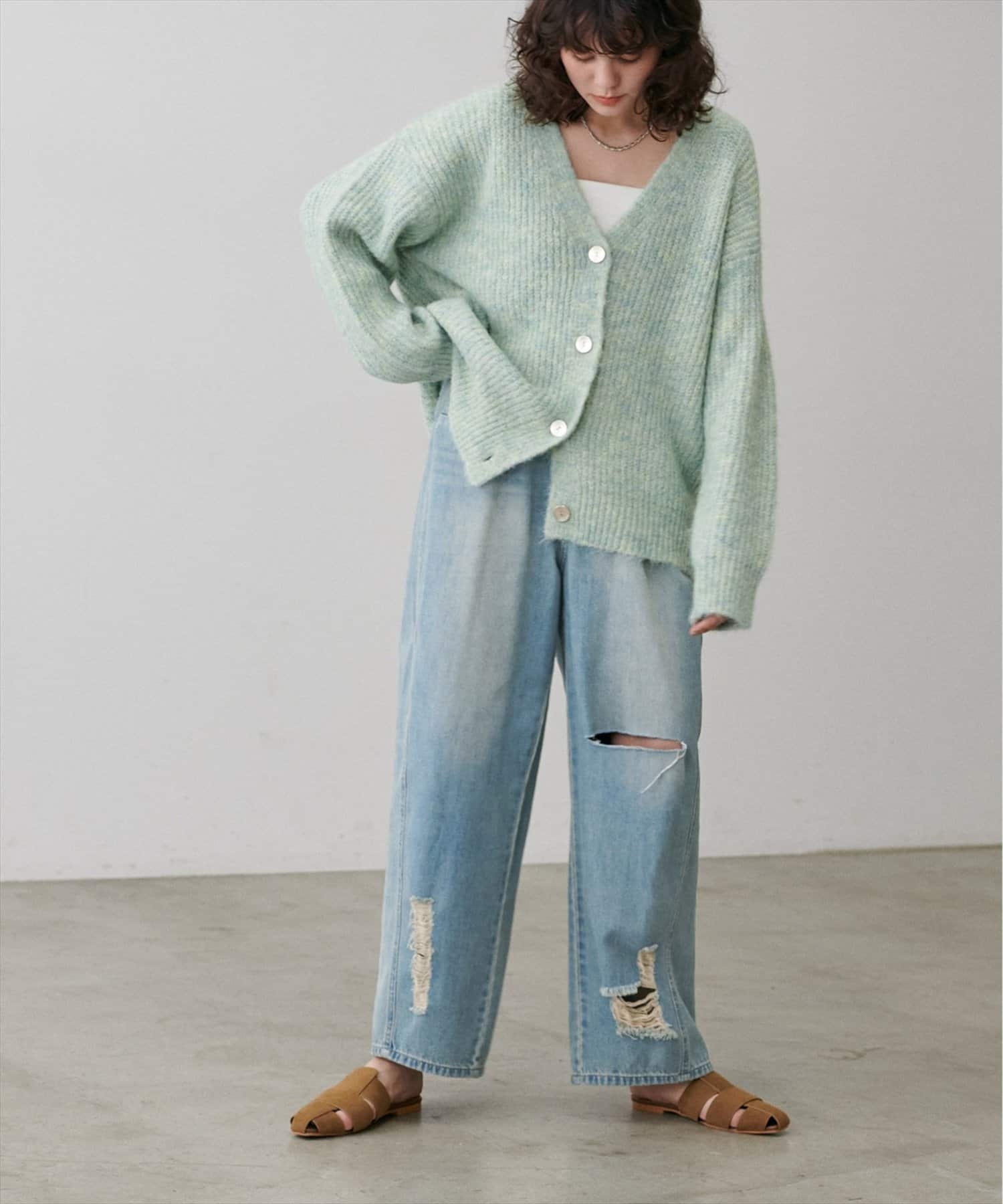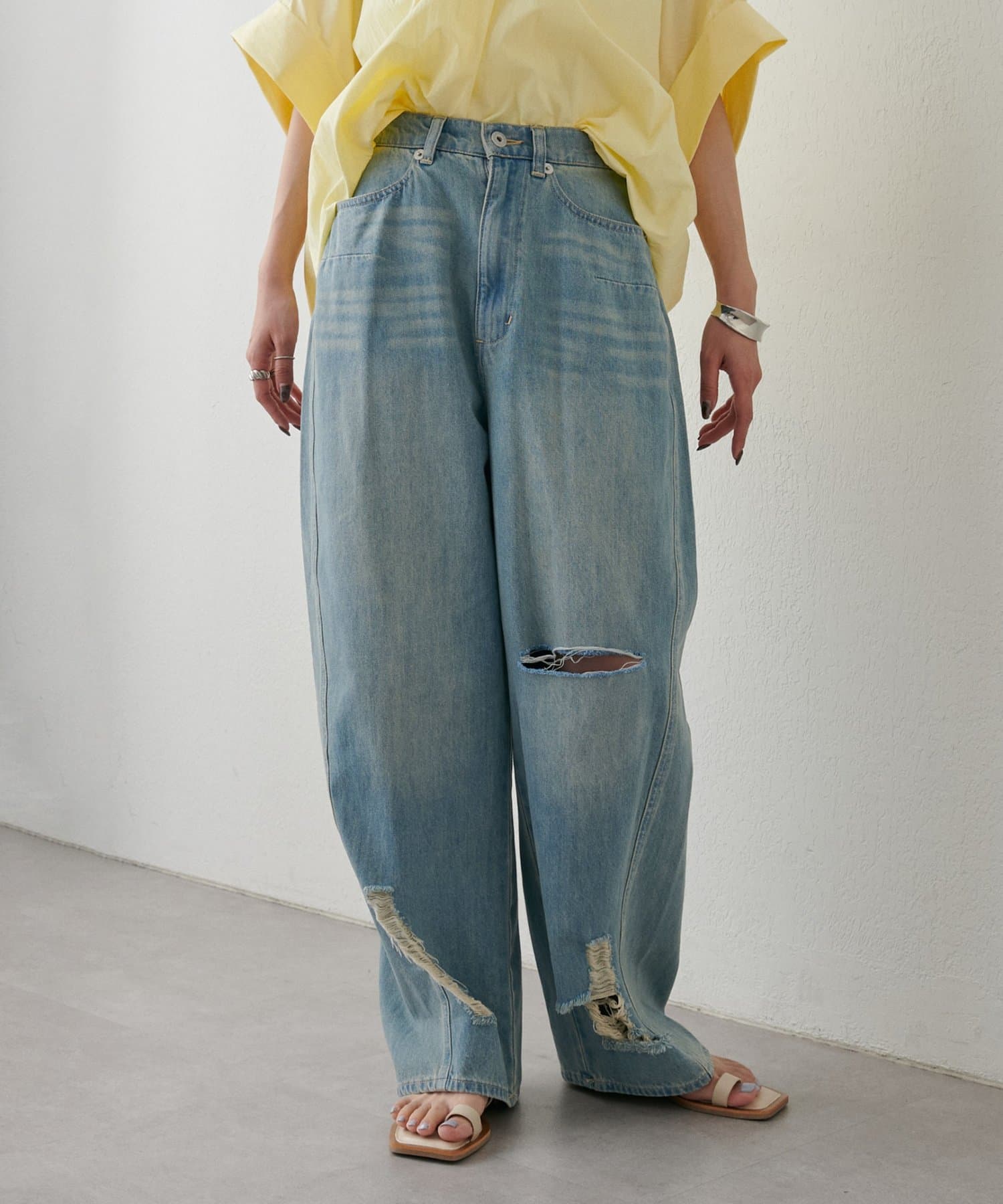 目を引く大胆なクラッシュ加工が、エッジの効いたアクセントになったデニム。
