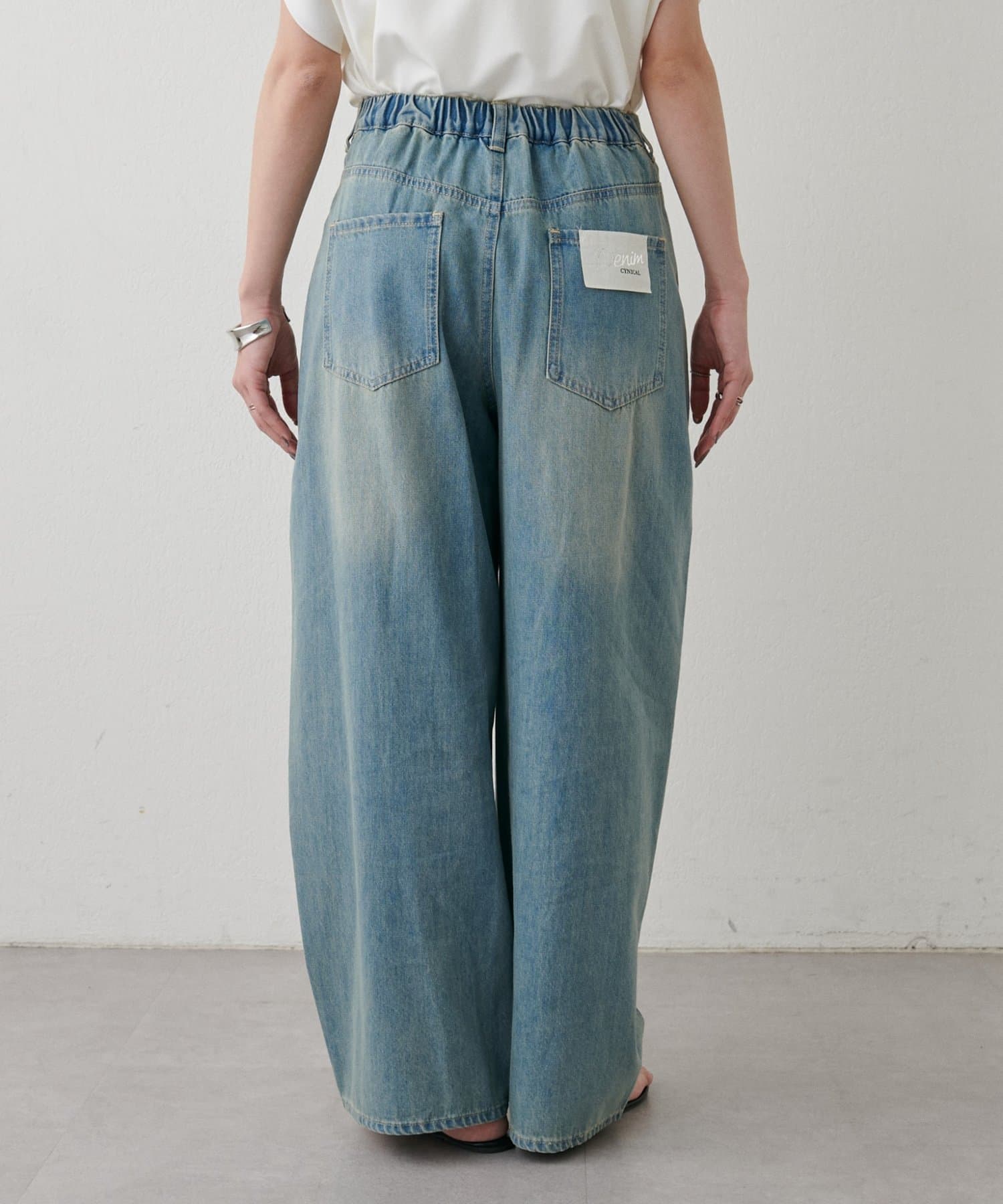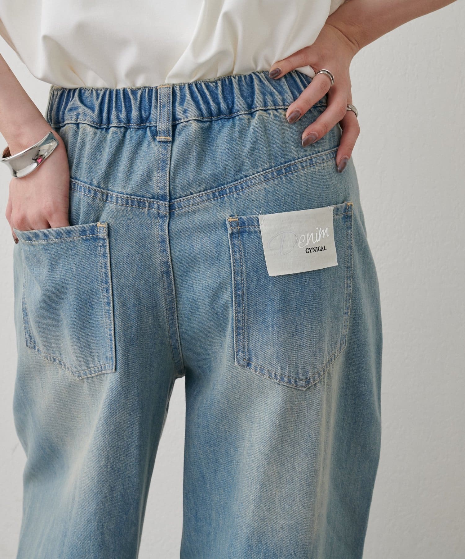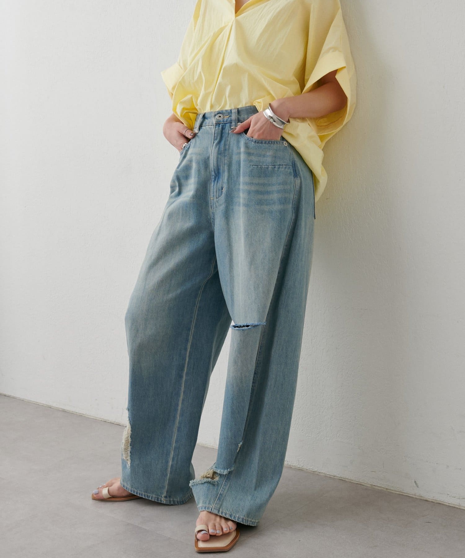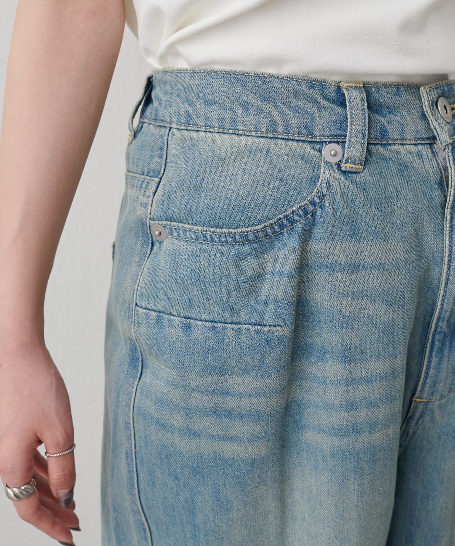 目を引く大胆なクラッシュ加工が、エッジの効いたアクセントになったデニム。