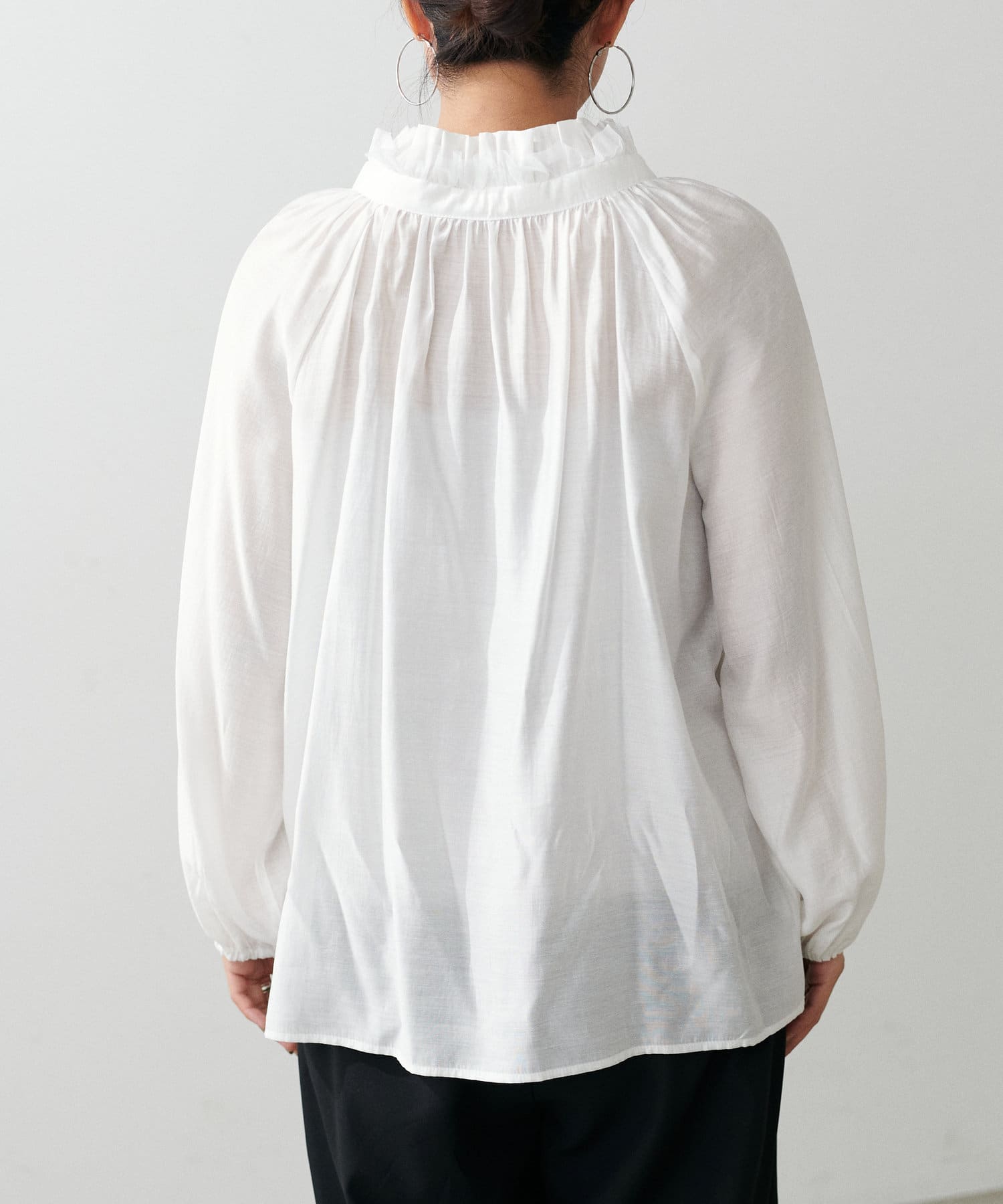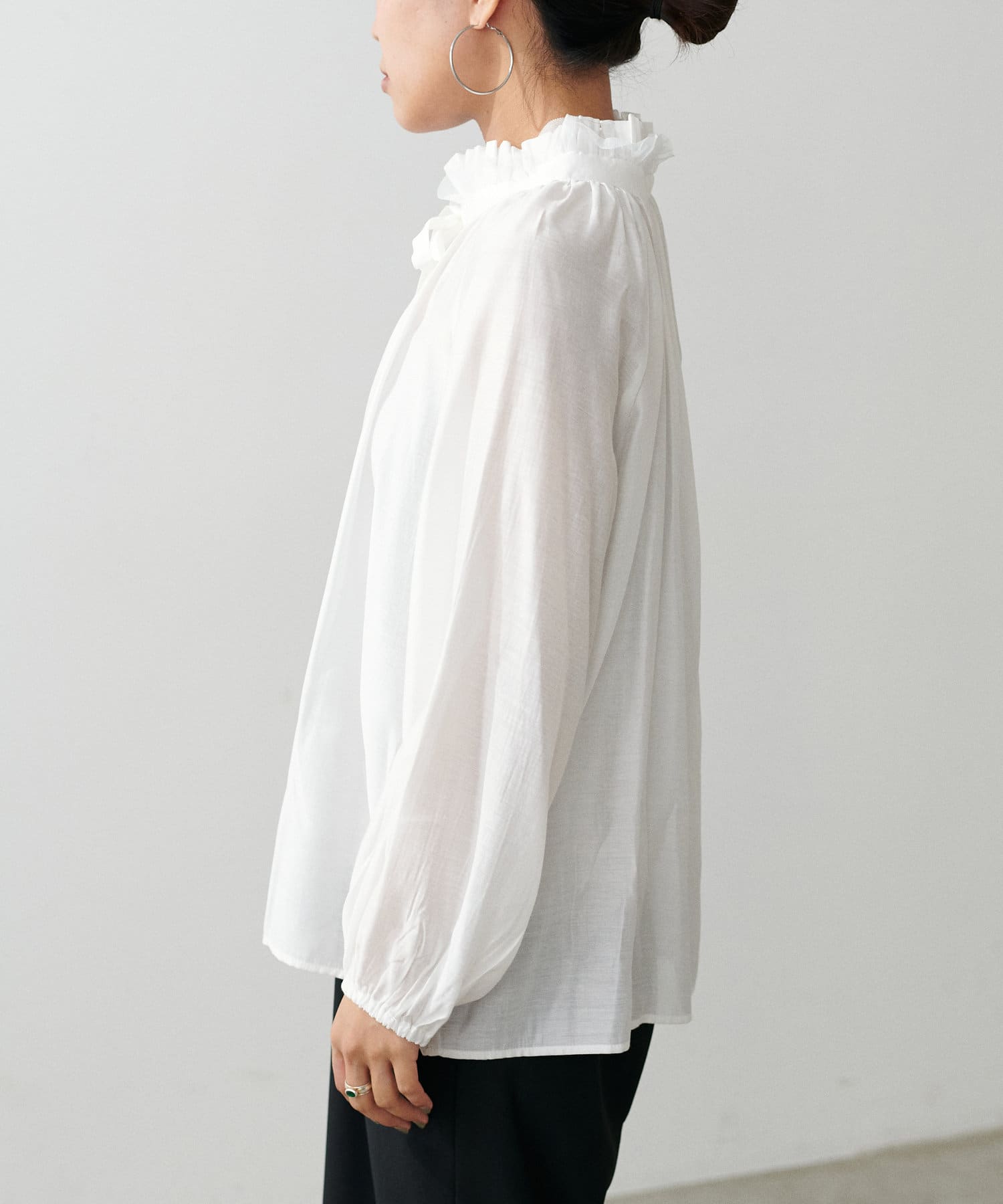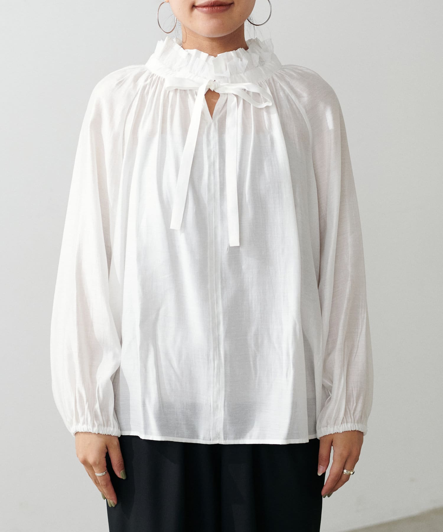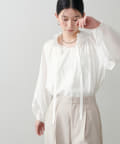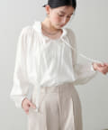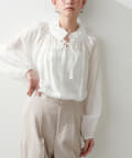 首元のフリルギャザーデザインが可愛らしいブラウス。