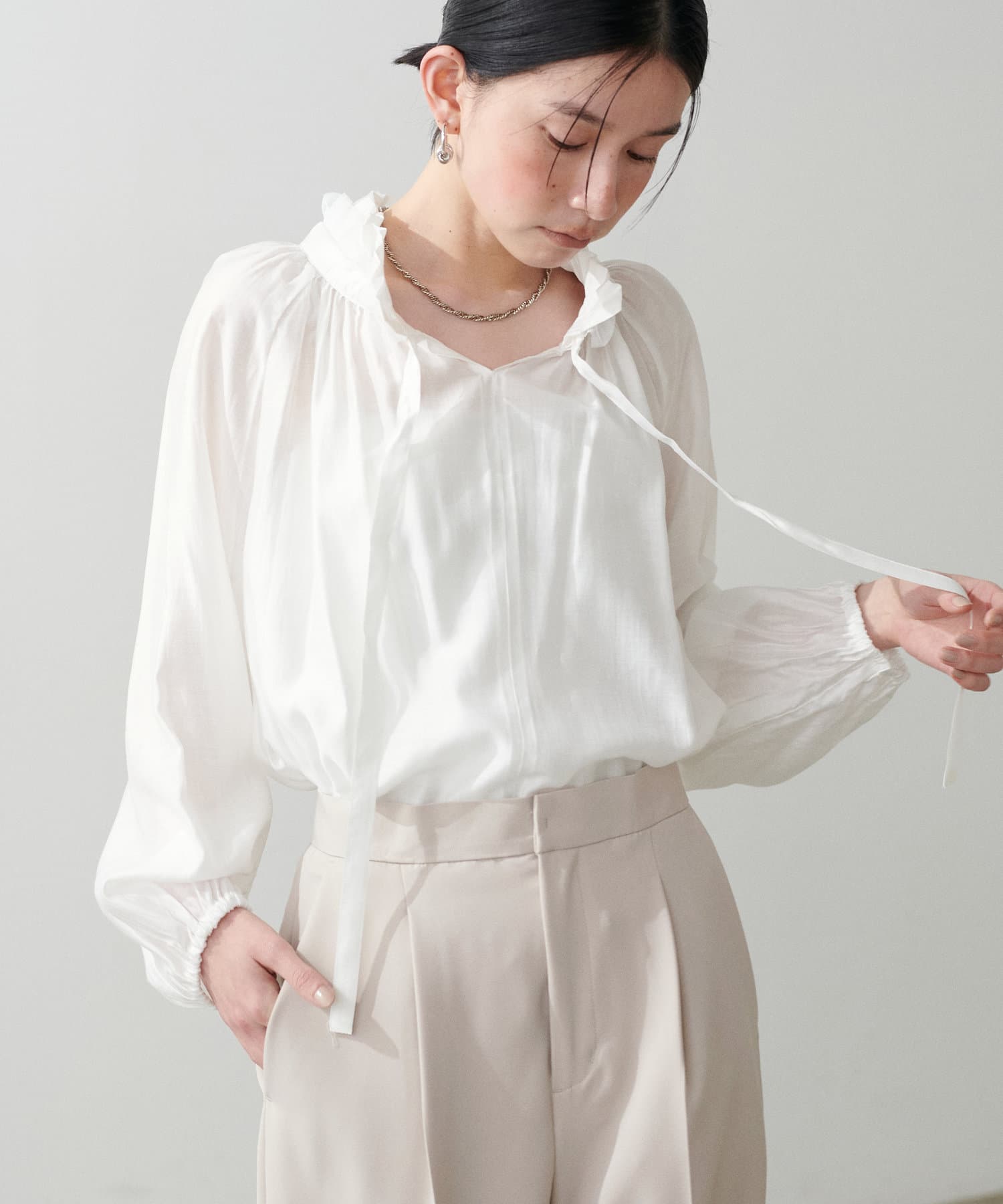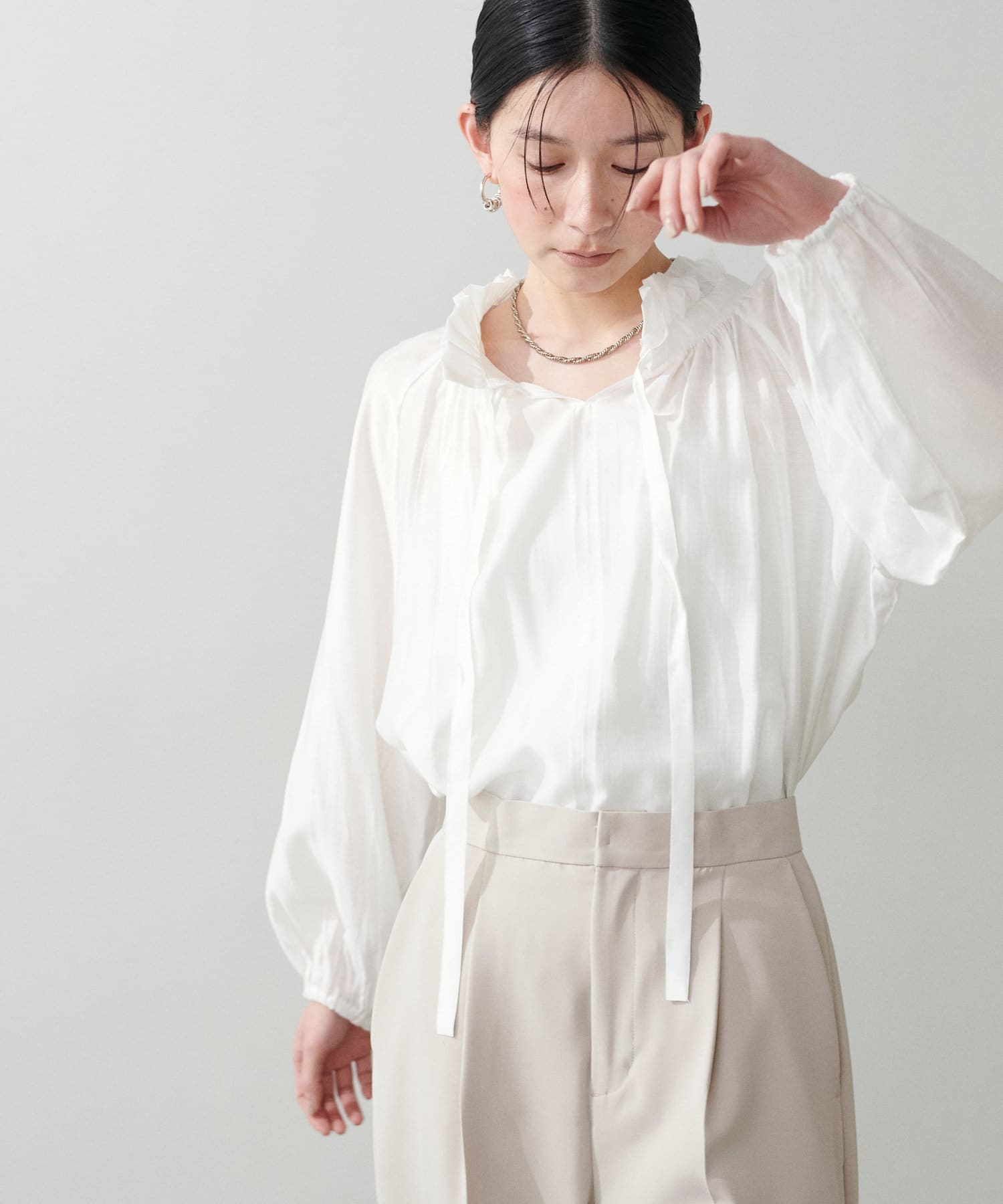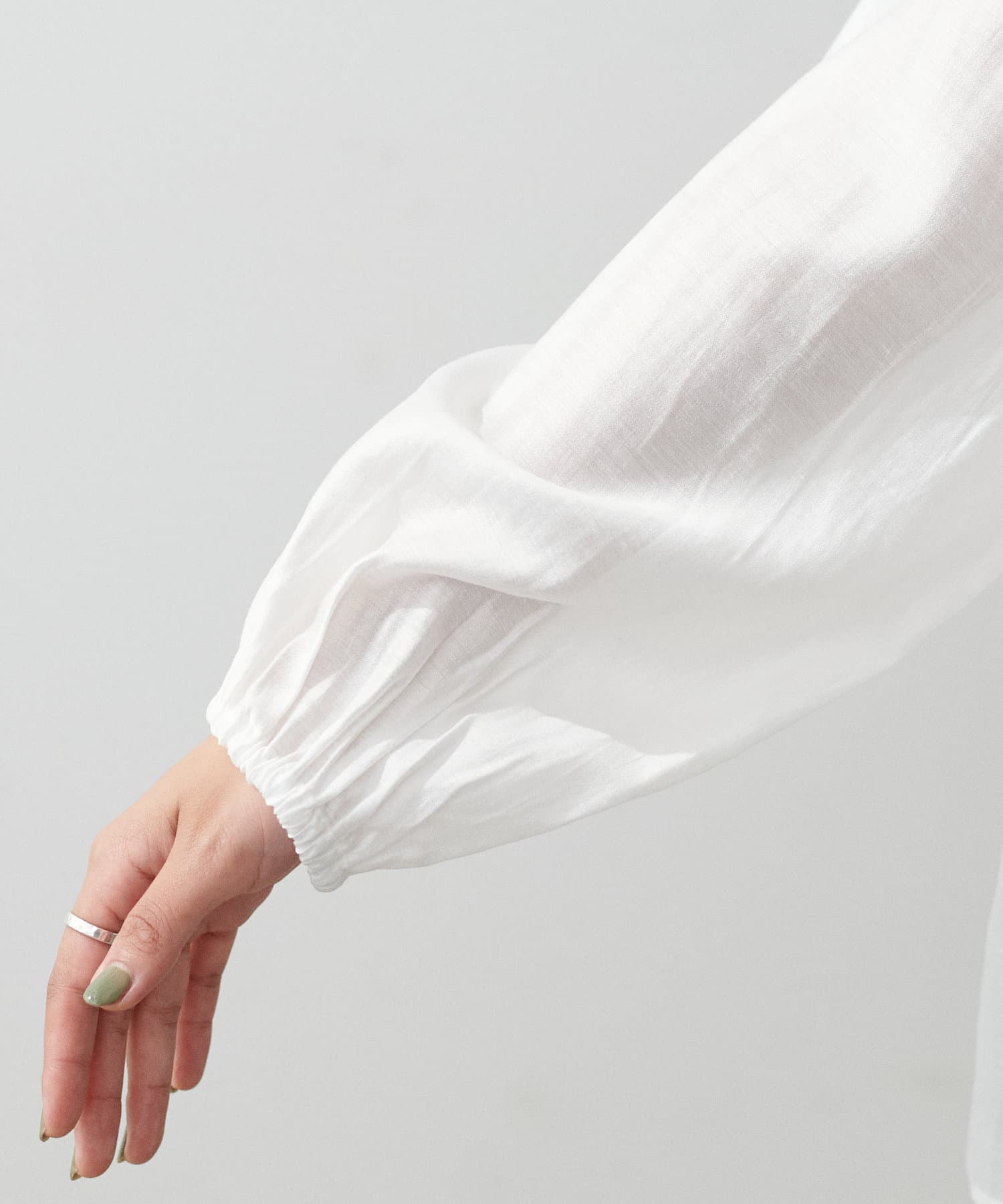 やや透け感のある滑らかな生地で、自然と柔らかな印象を与える1枚。