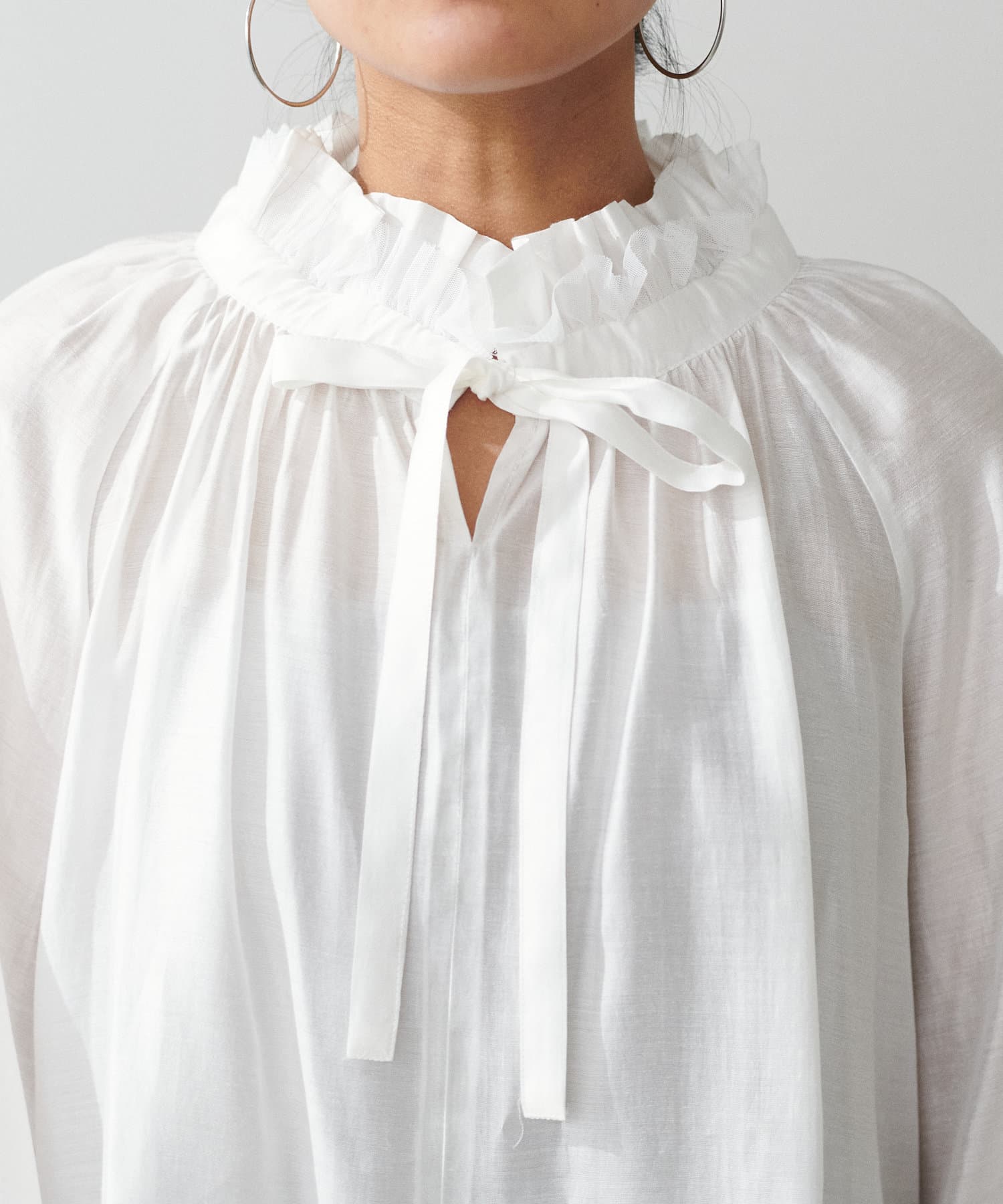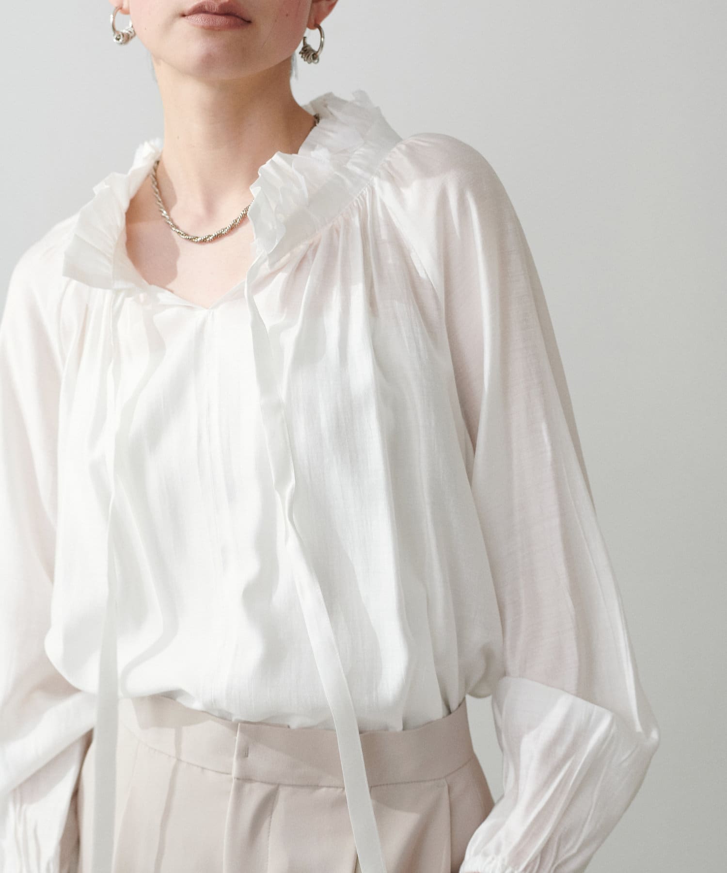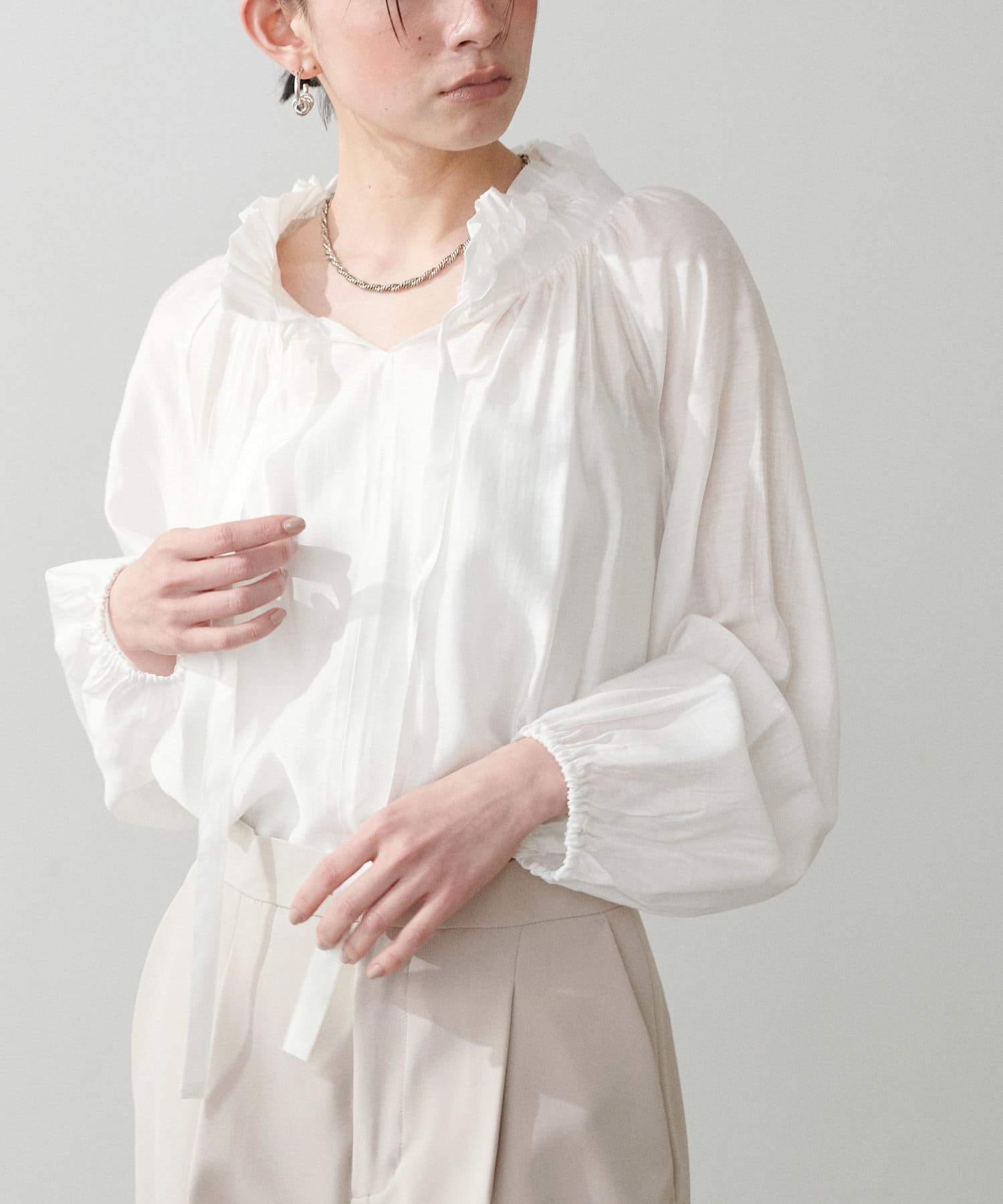 やや透け感のある滑らかな生地で、自然と柔らかな印象を与える1枚。