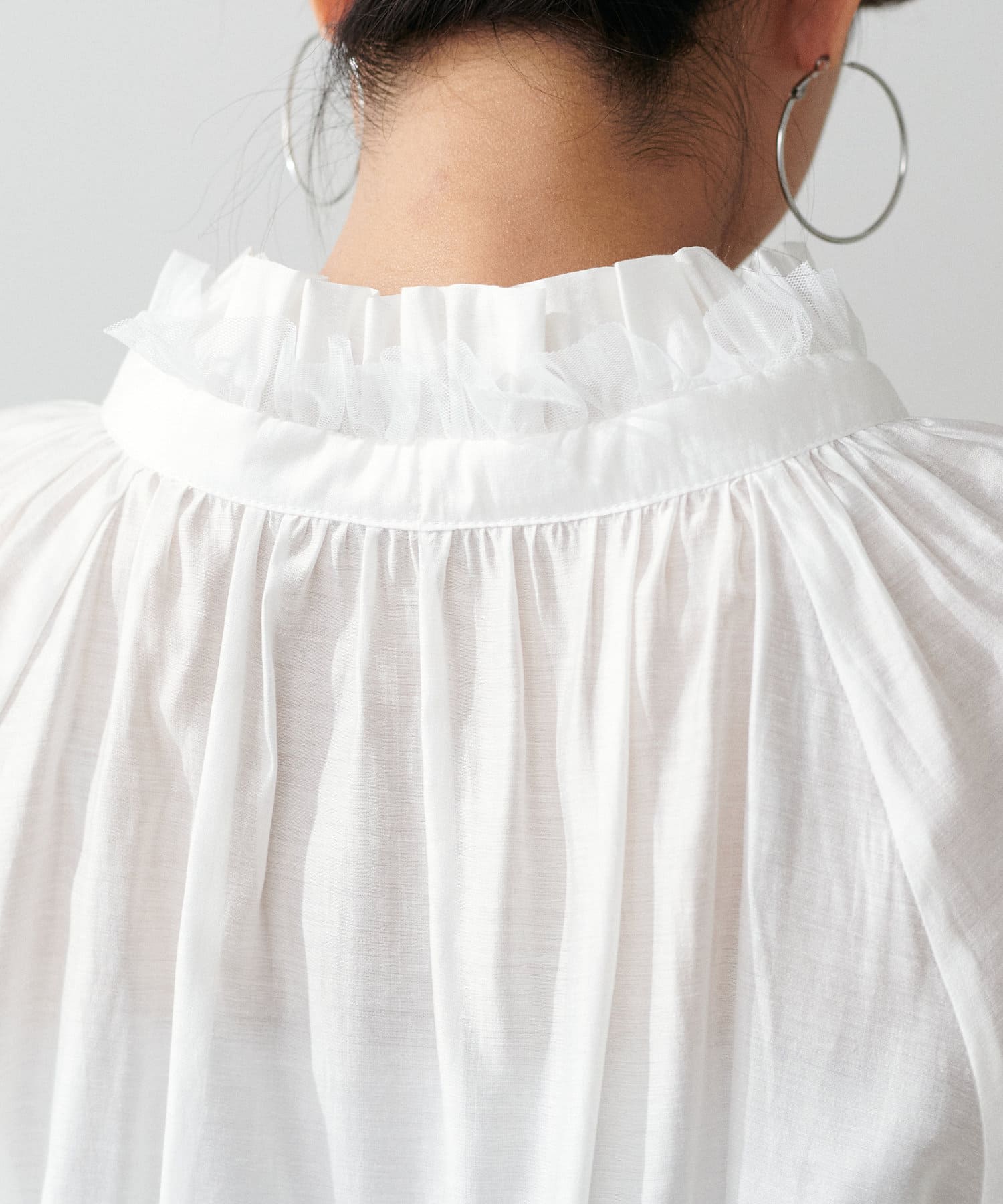 チュールを重ねたギャザーデザインがコーディネートのアクセントに。