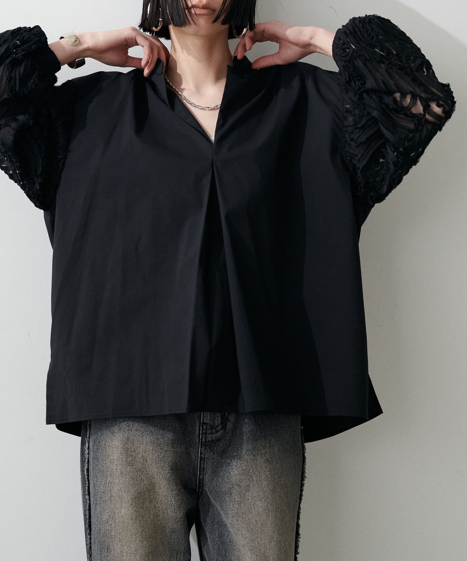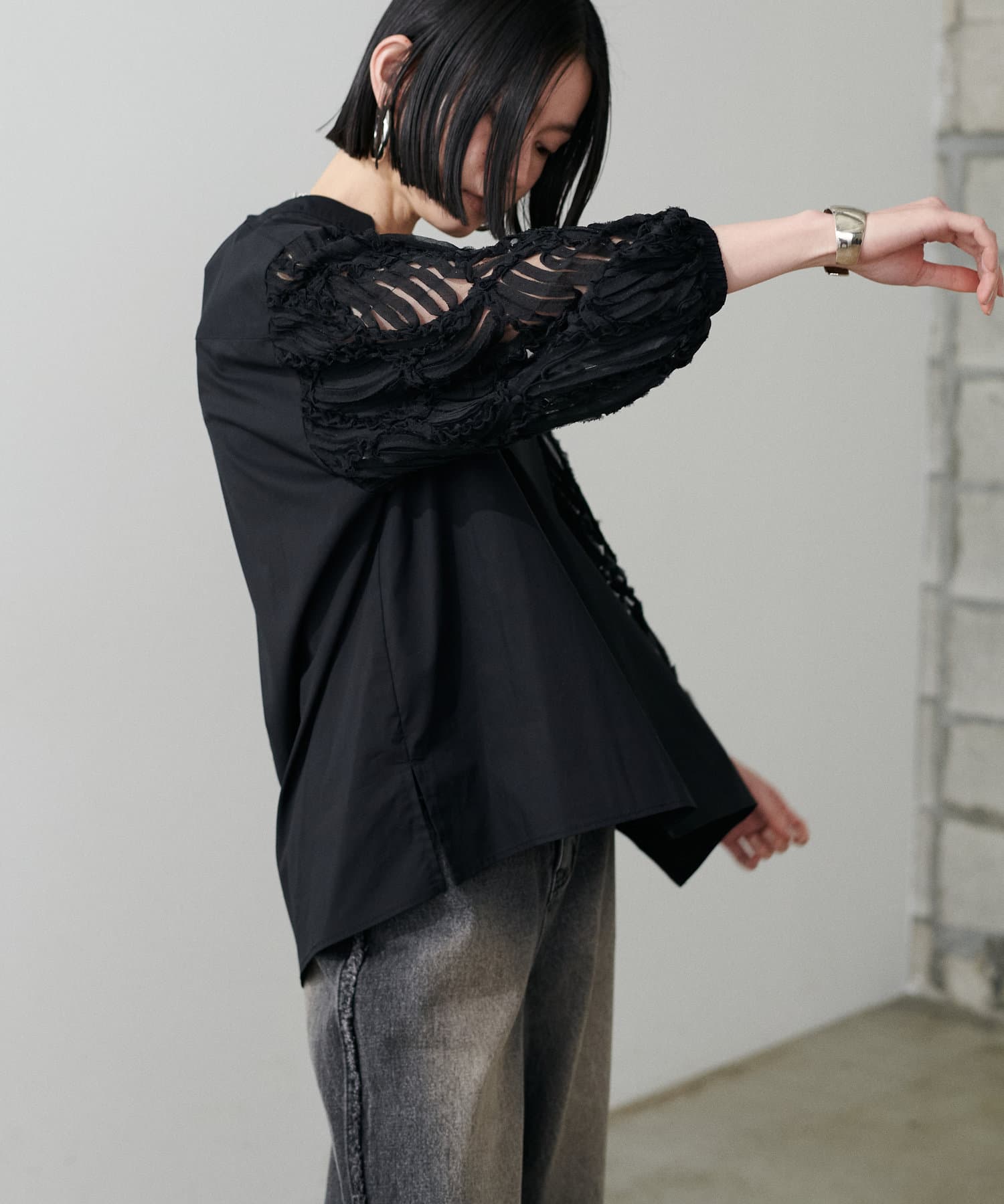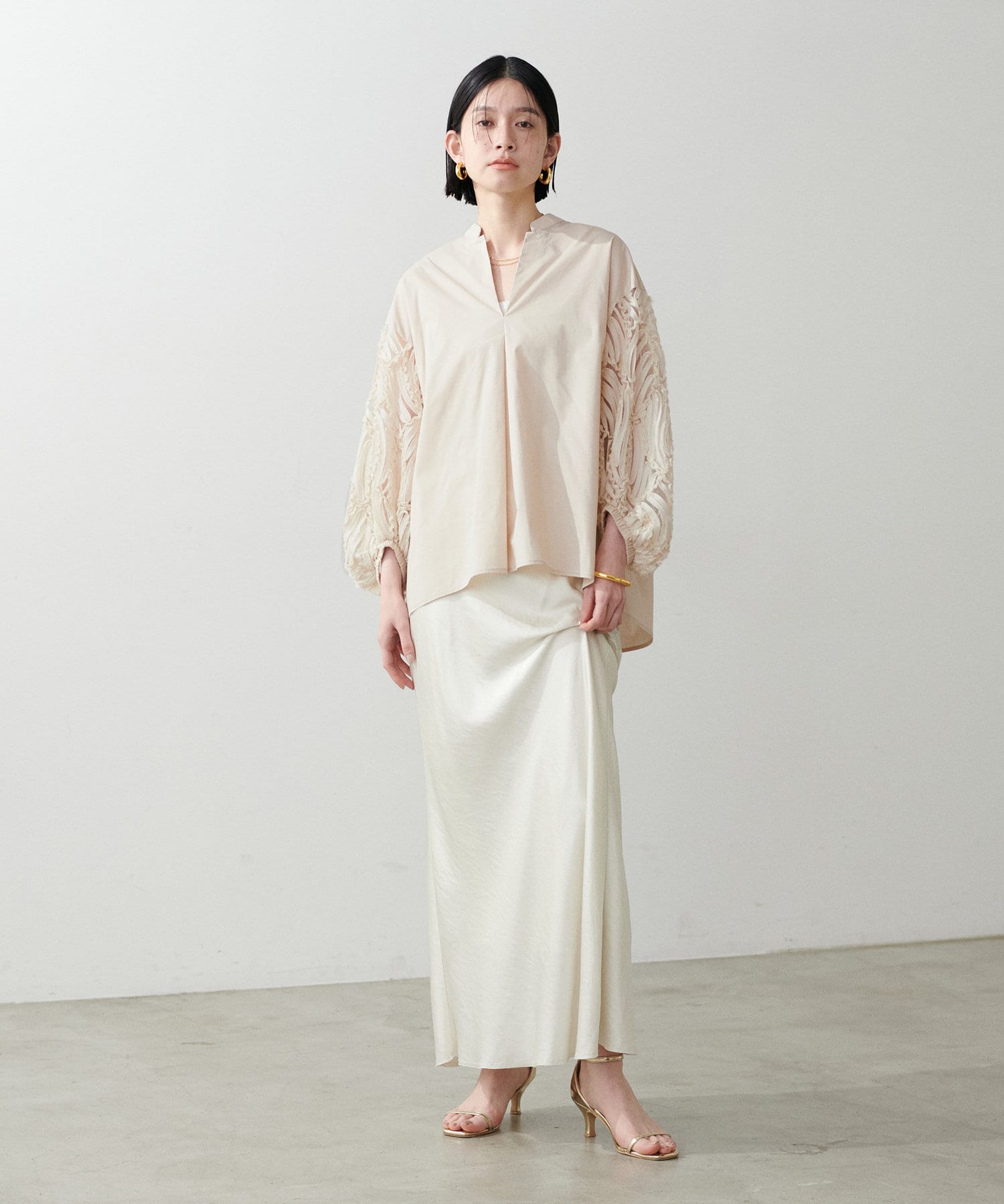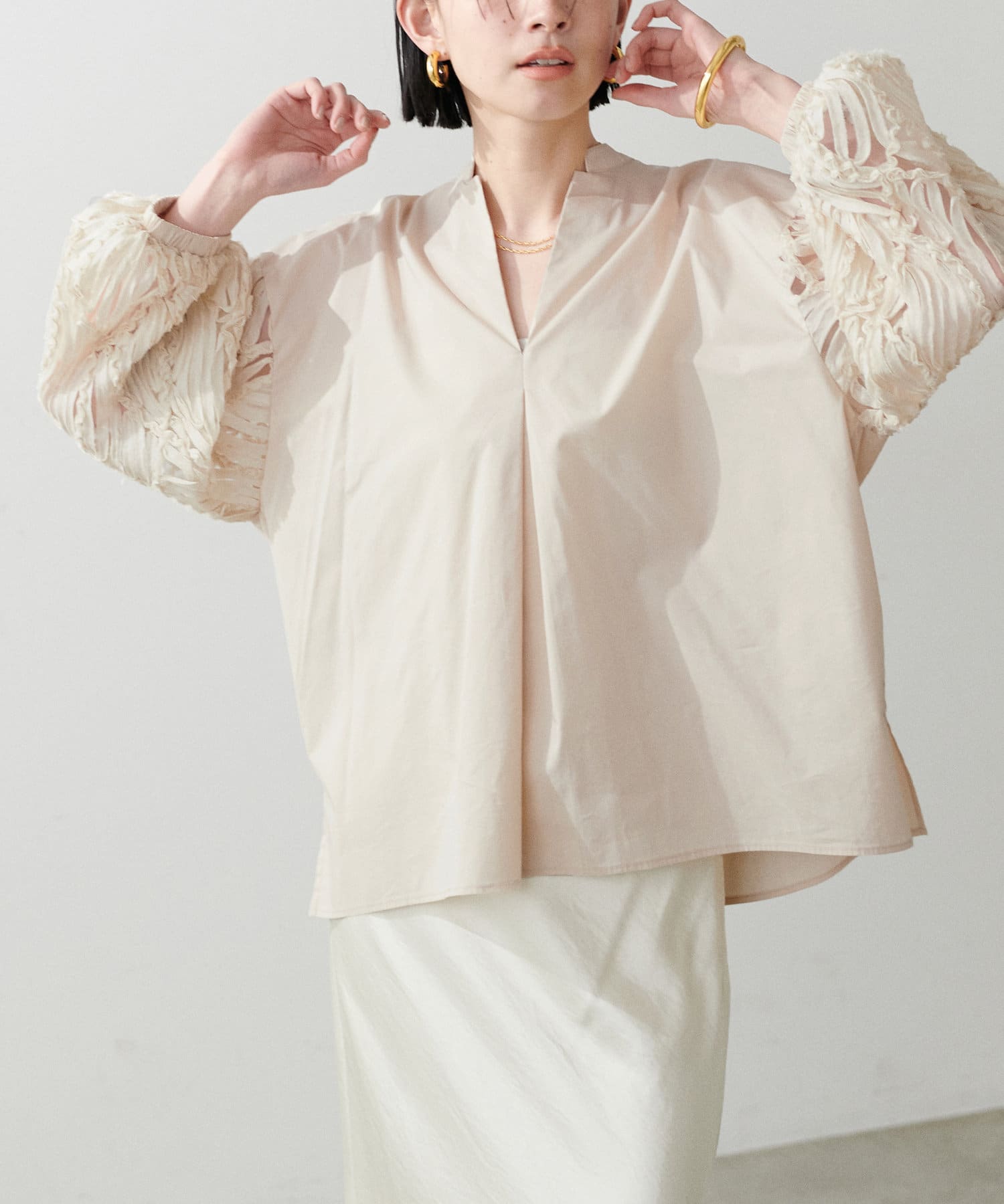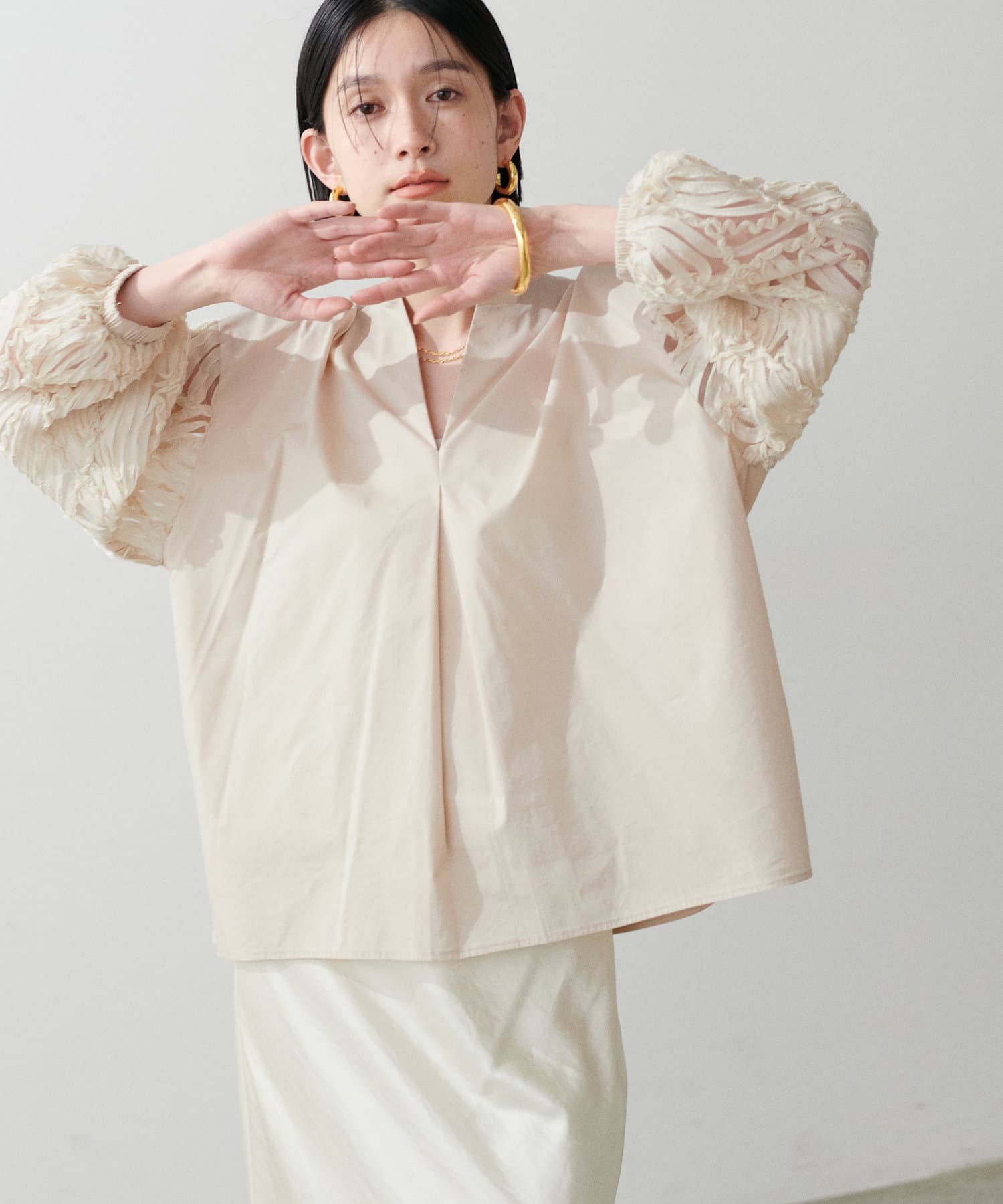 袖のニュアンスのレースデザインが上品なブラウスが登場。