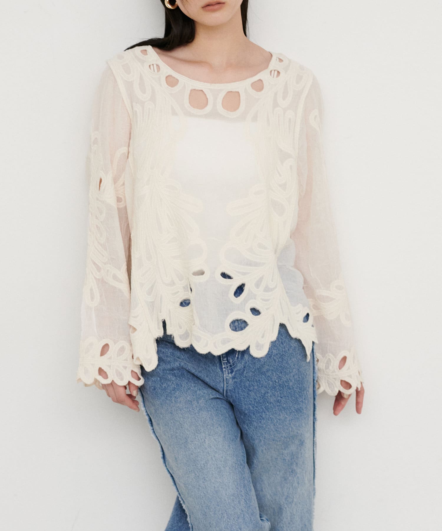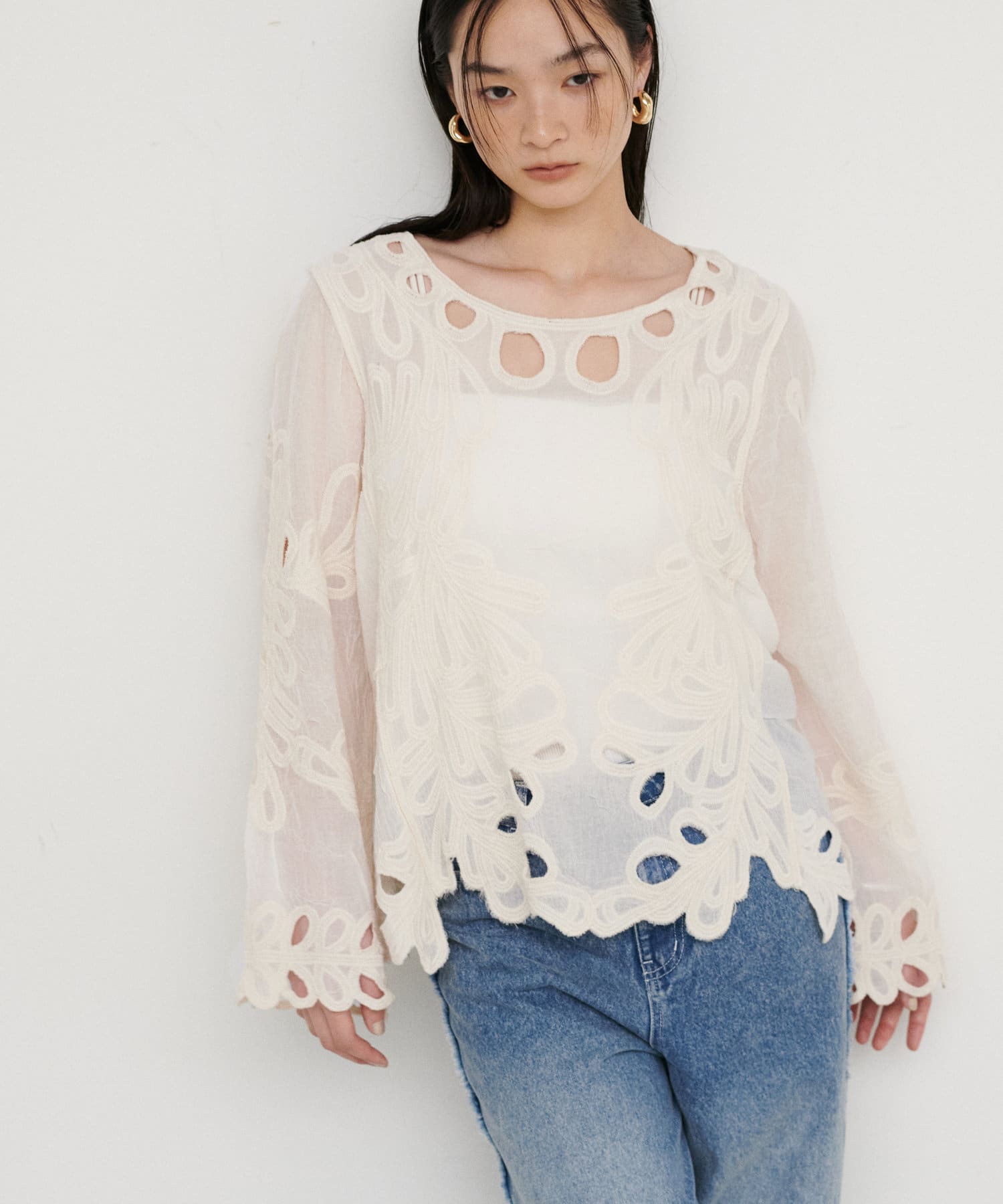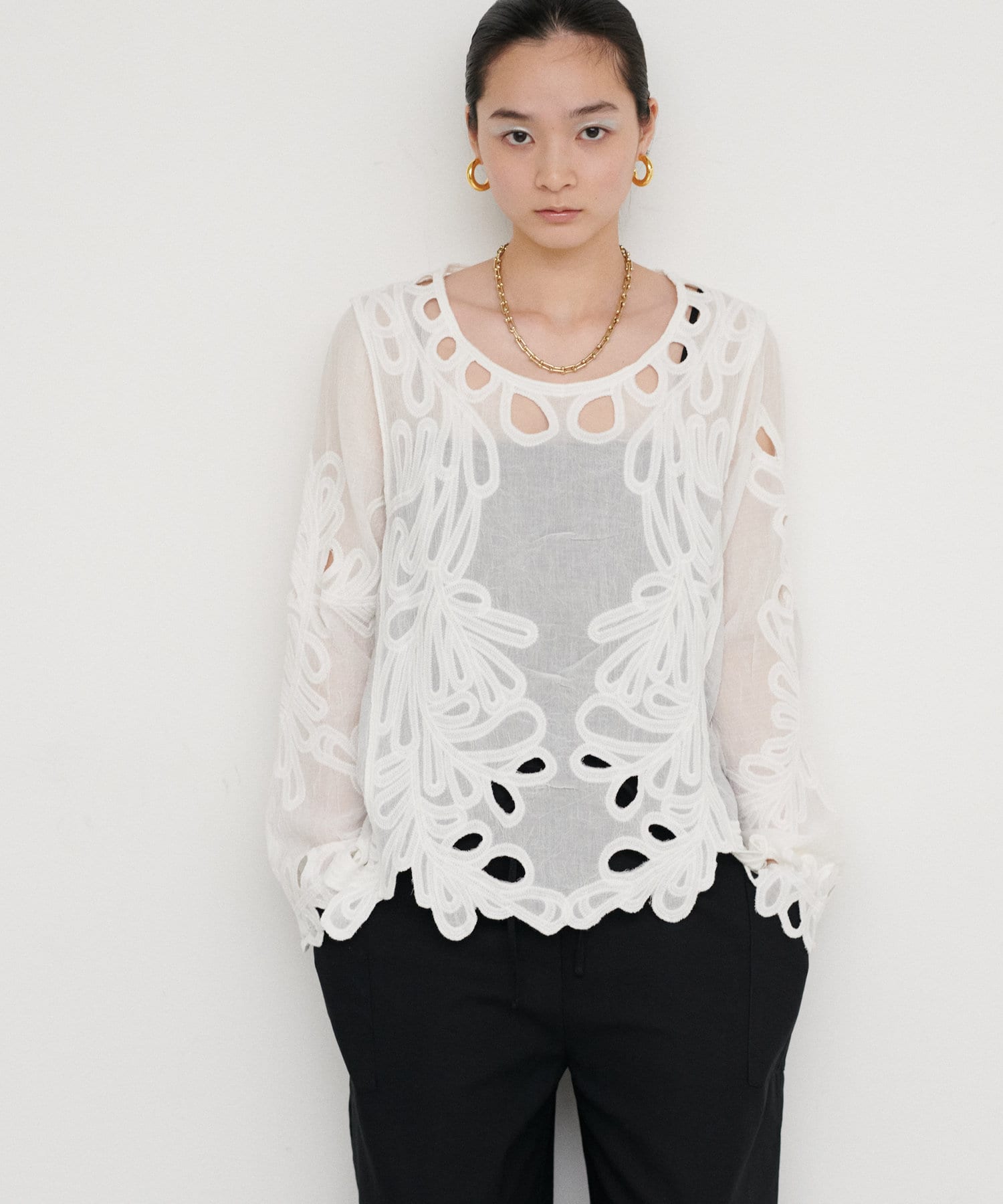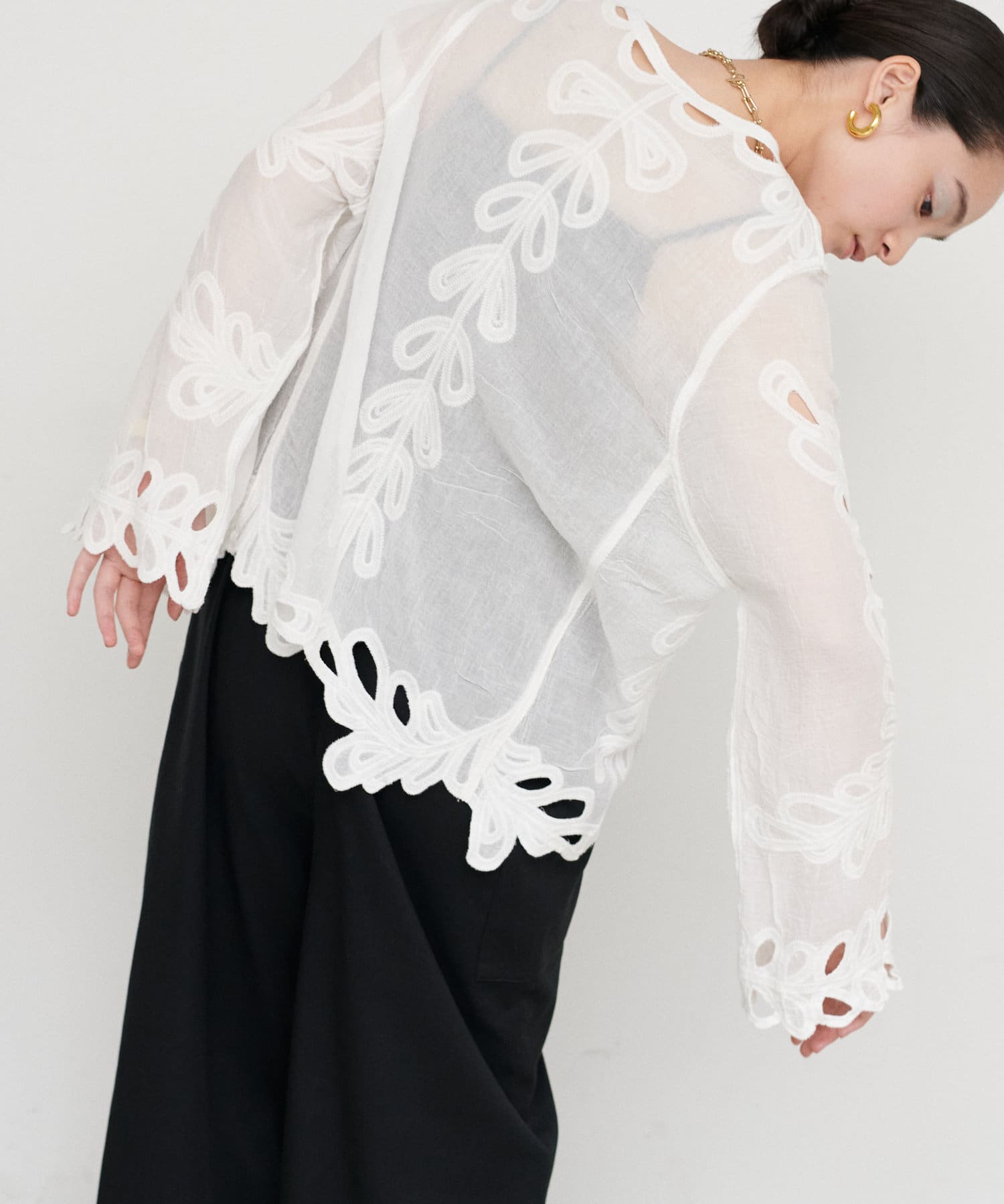 軽やかな透け感と繊細な刺繍が、大人の女性らしさを引き立てるトップス。