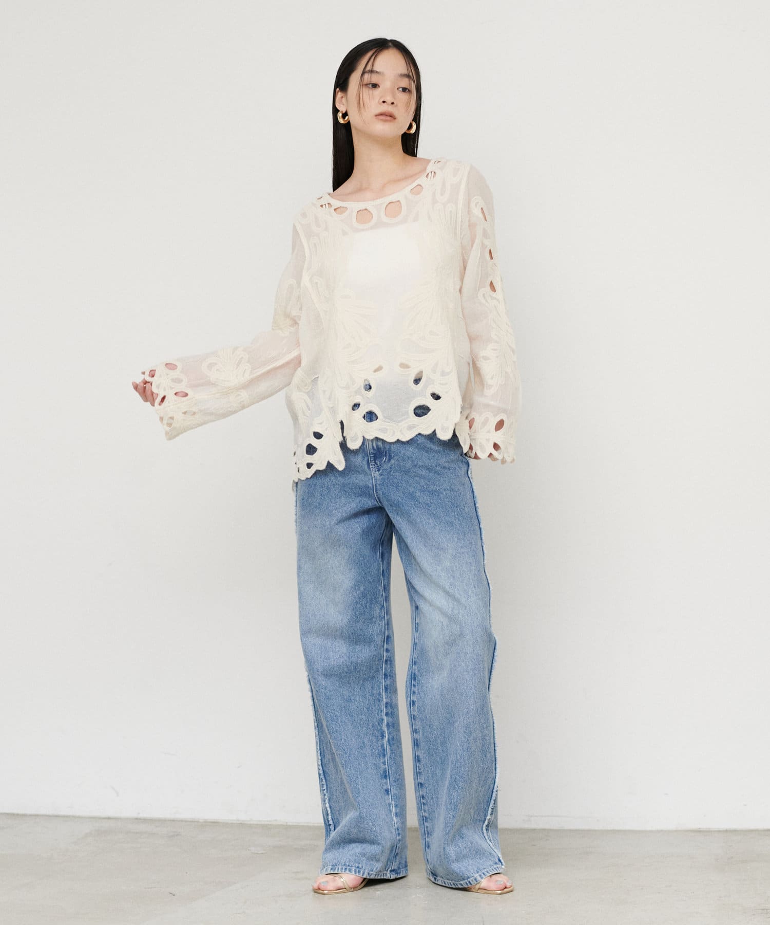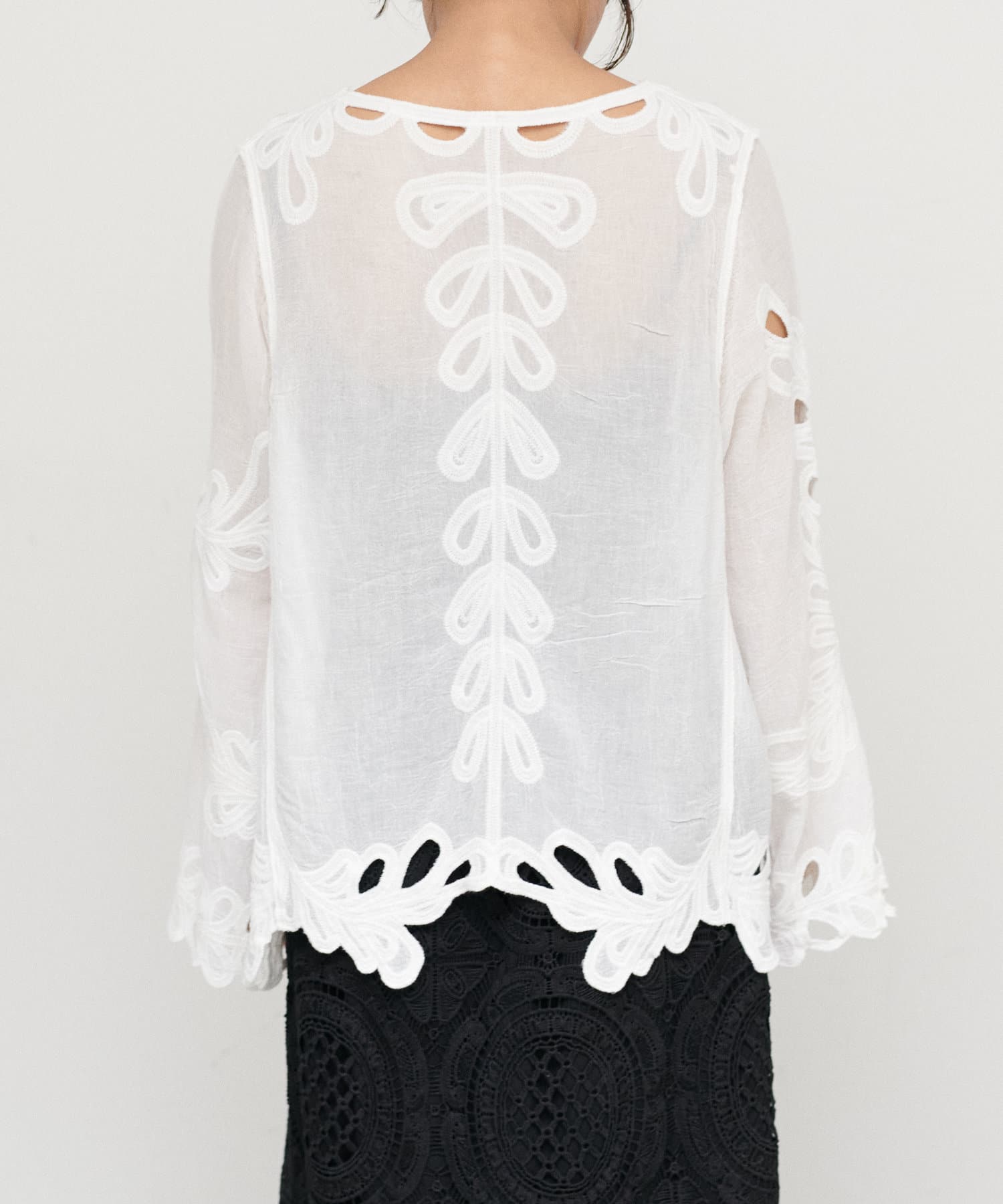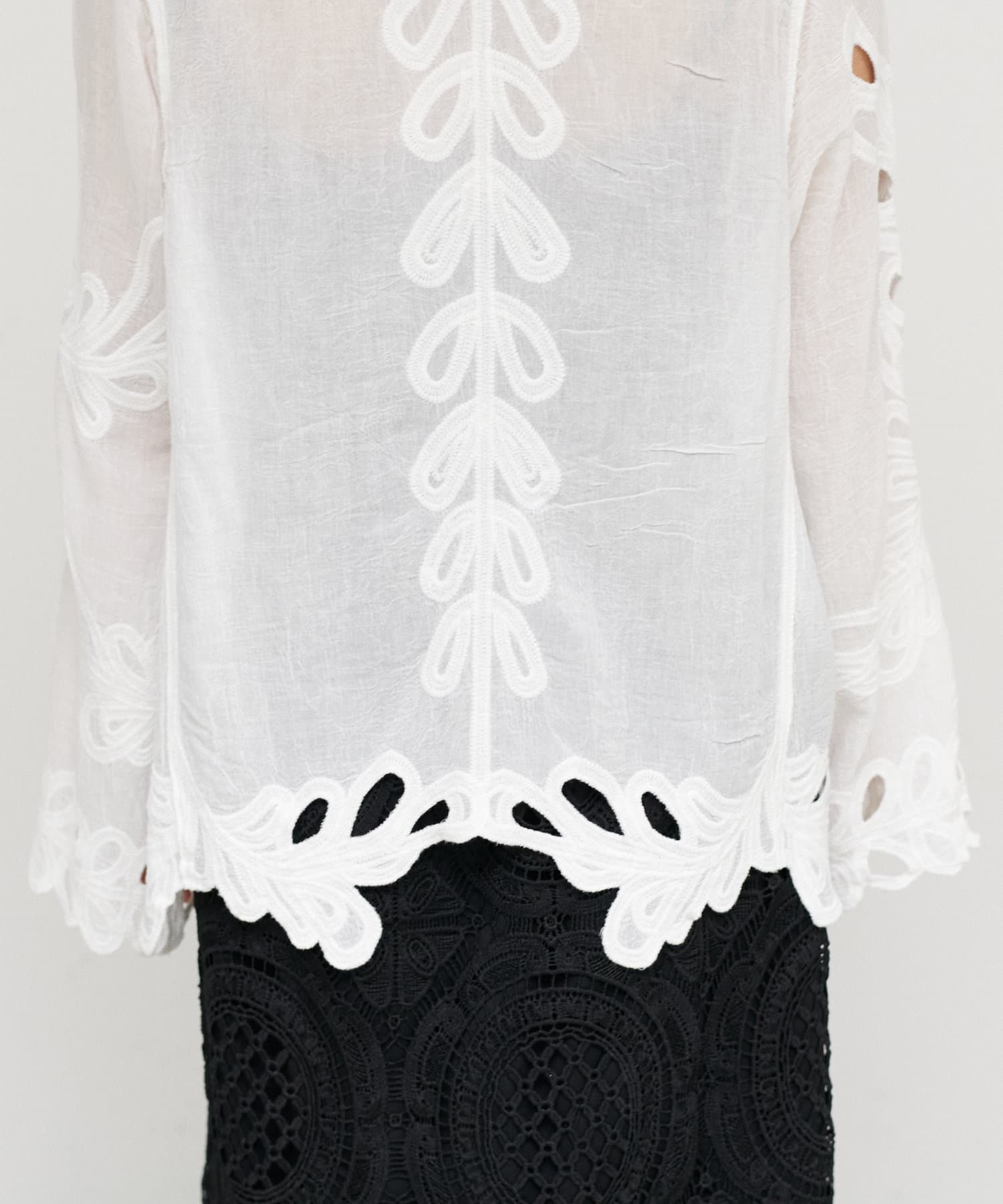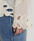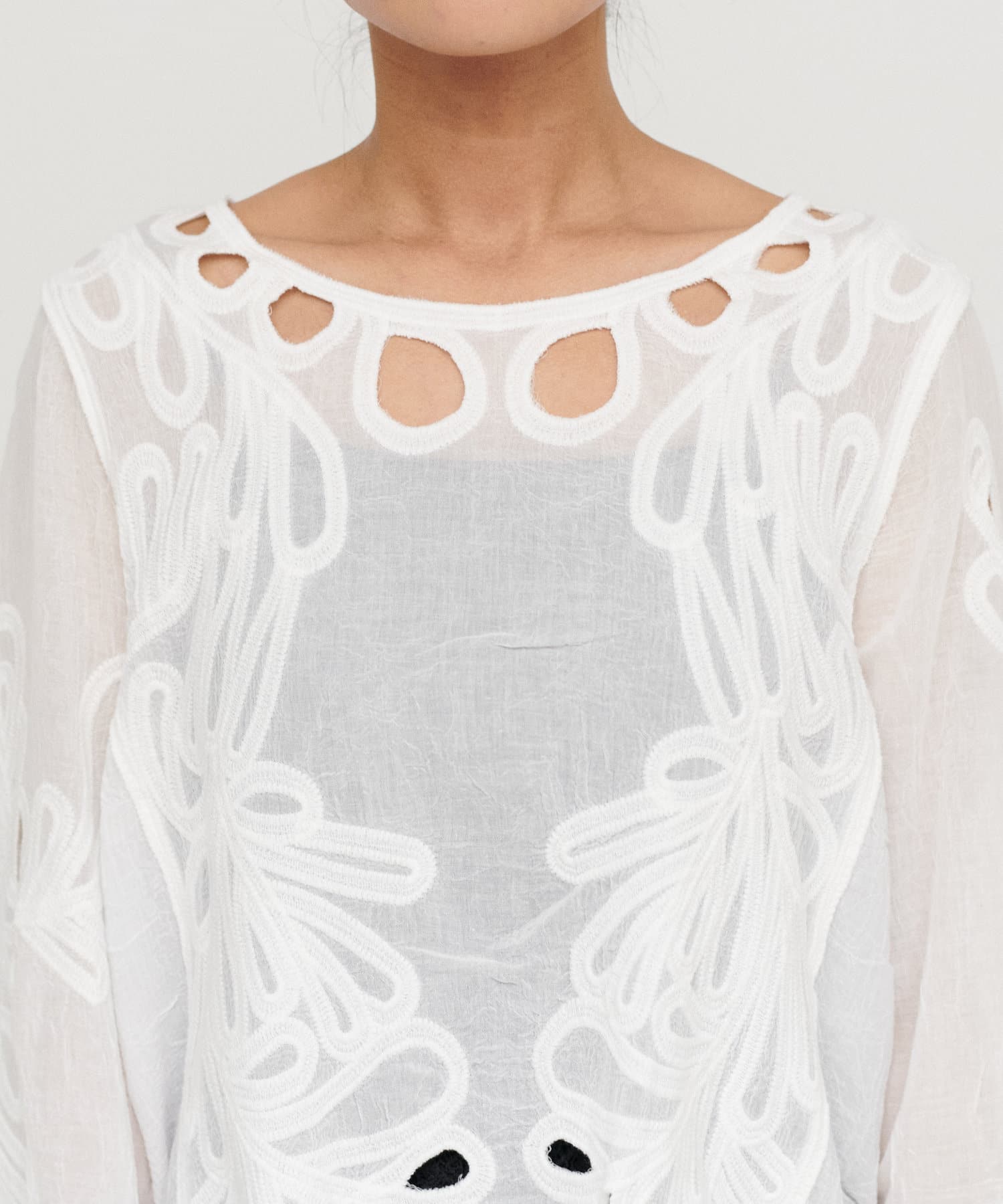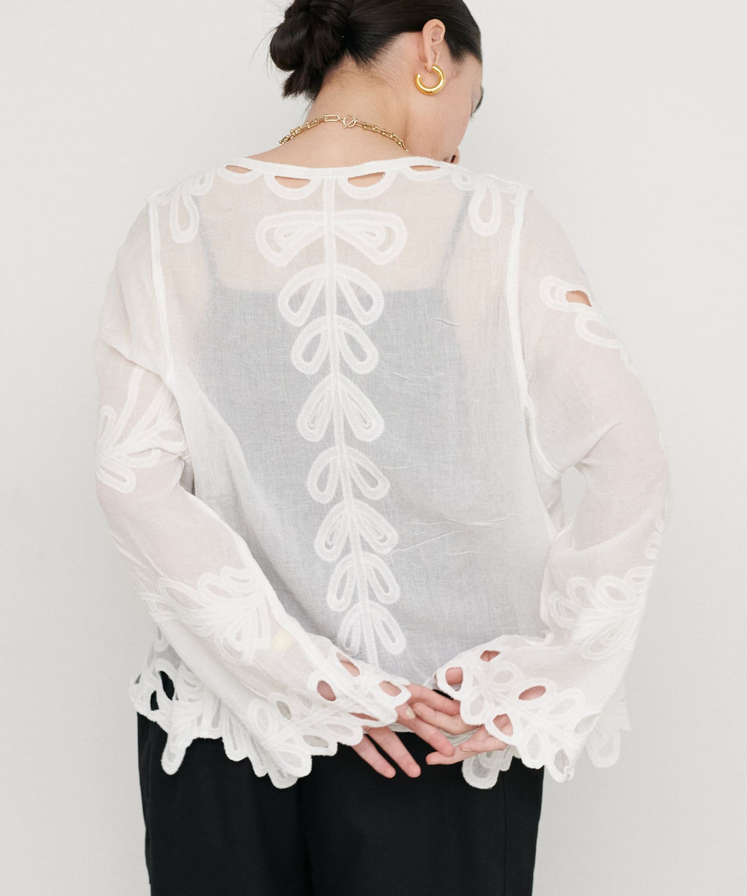 軽やかな透け感と繊細な刺繍が、大人の女性らしさを引き立てるトップス。