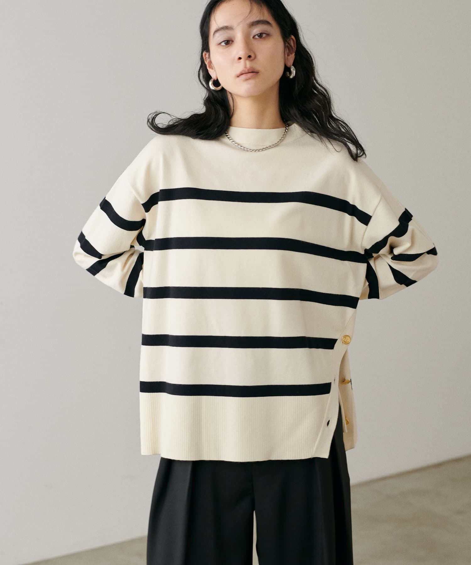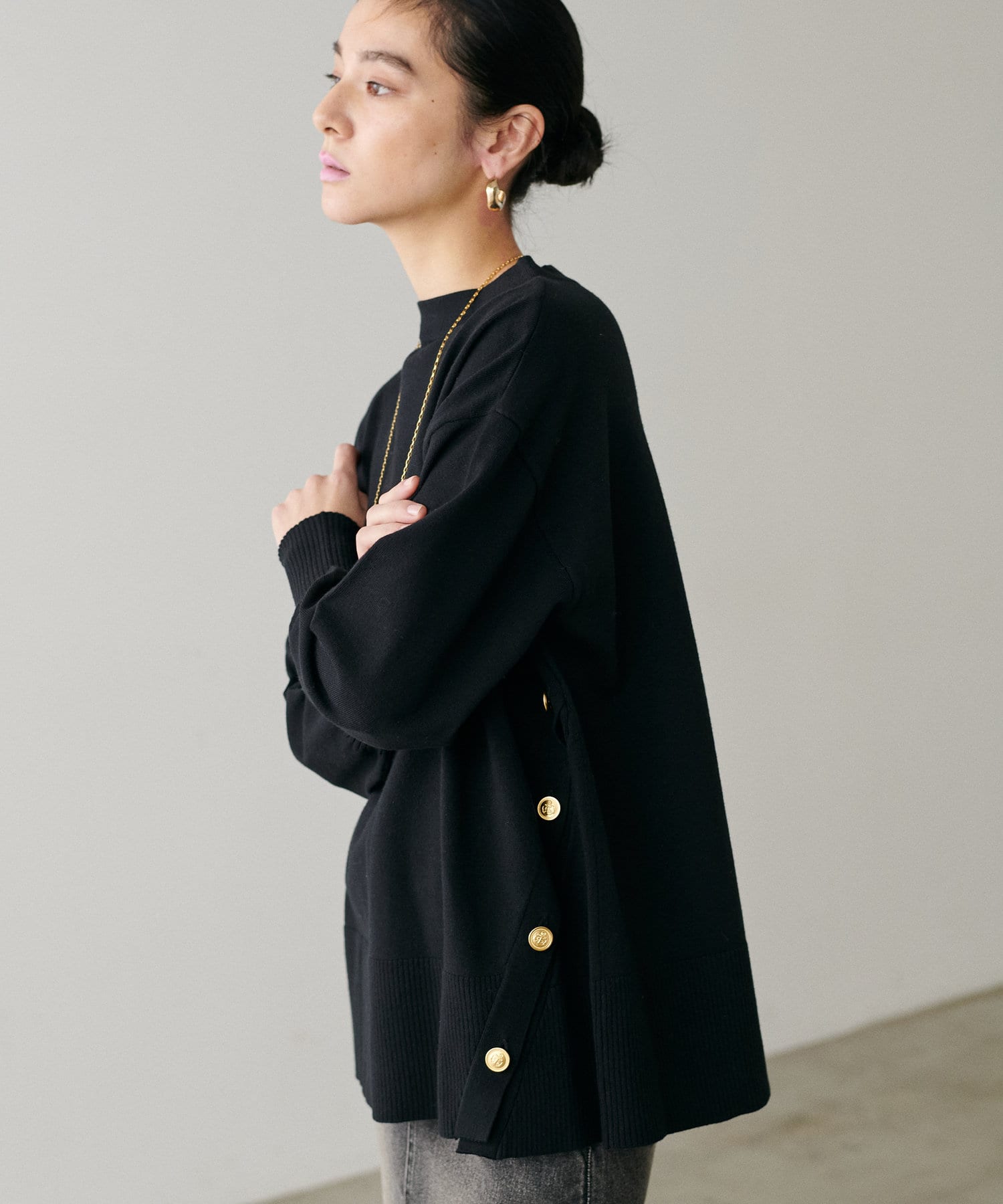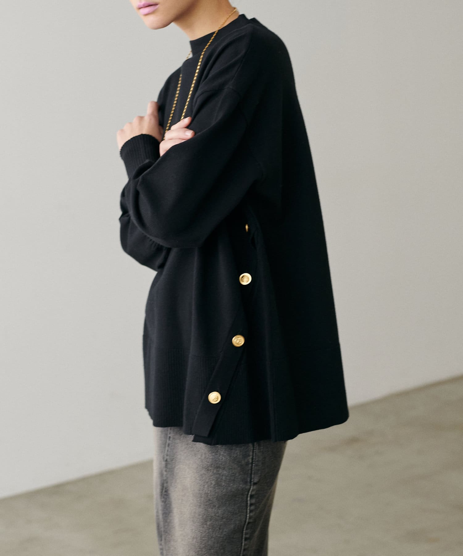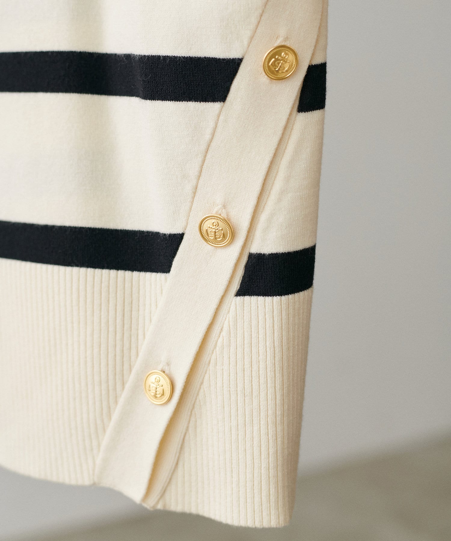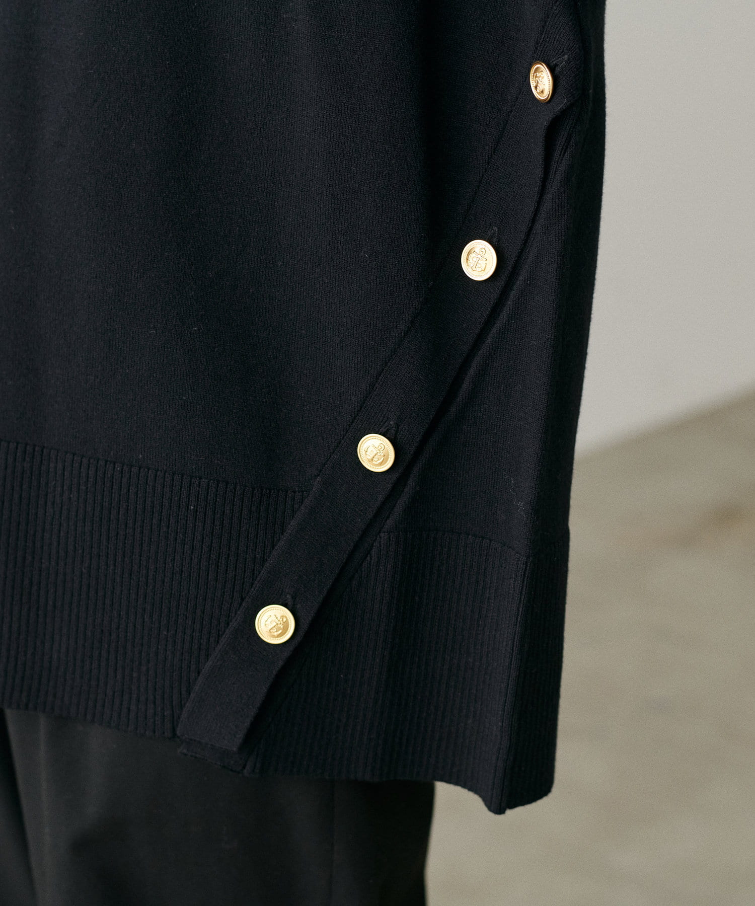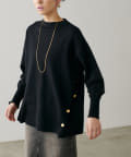 サイドに金釦がついたシンプルながらもアクセントが効いたニットが登場。