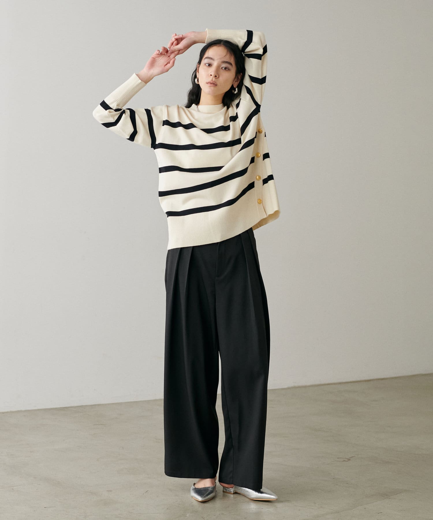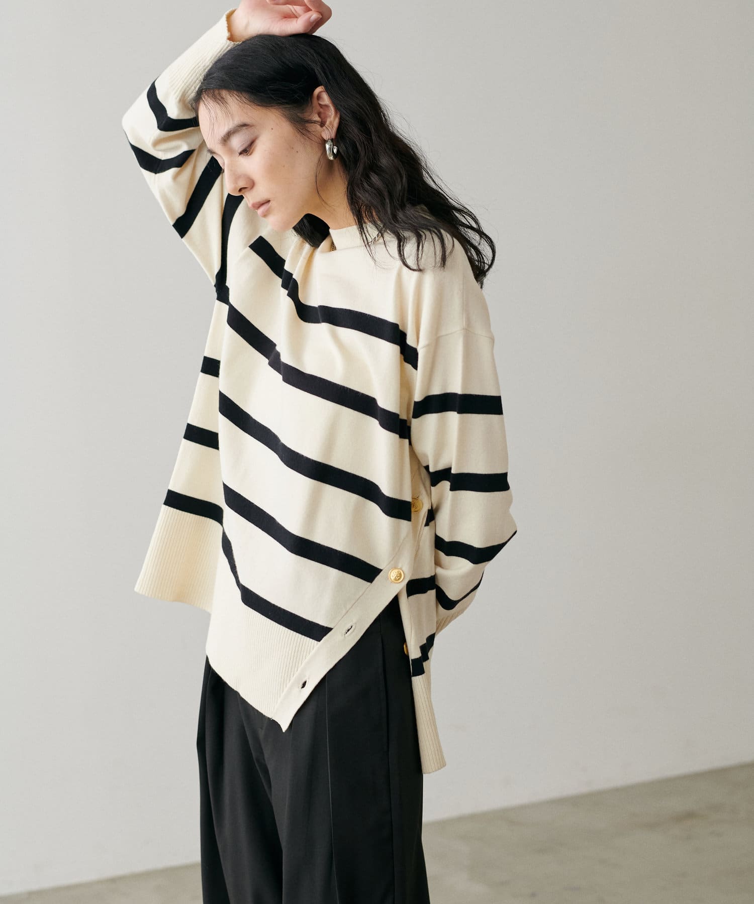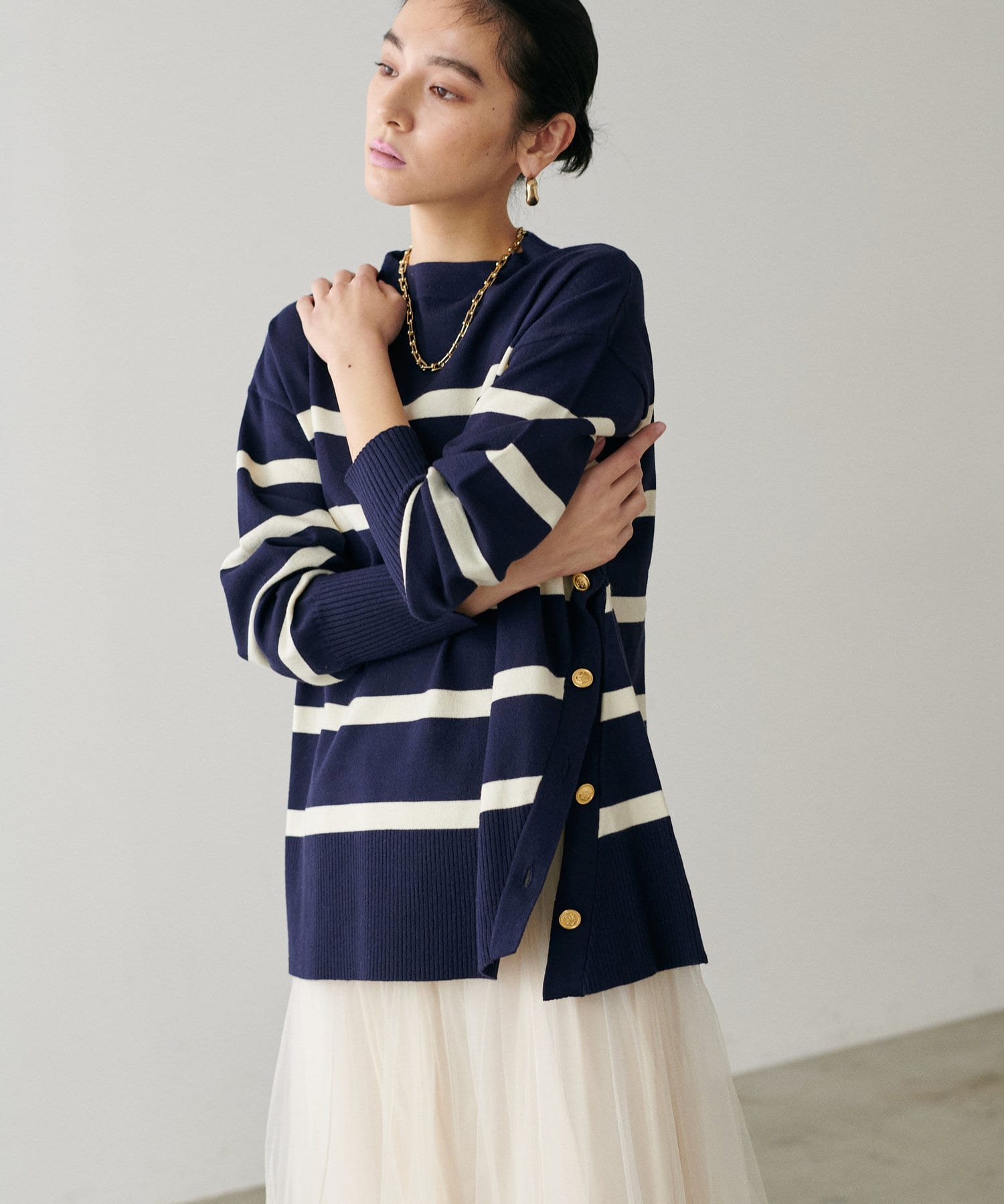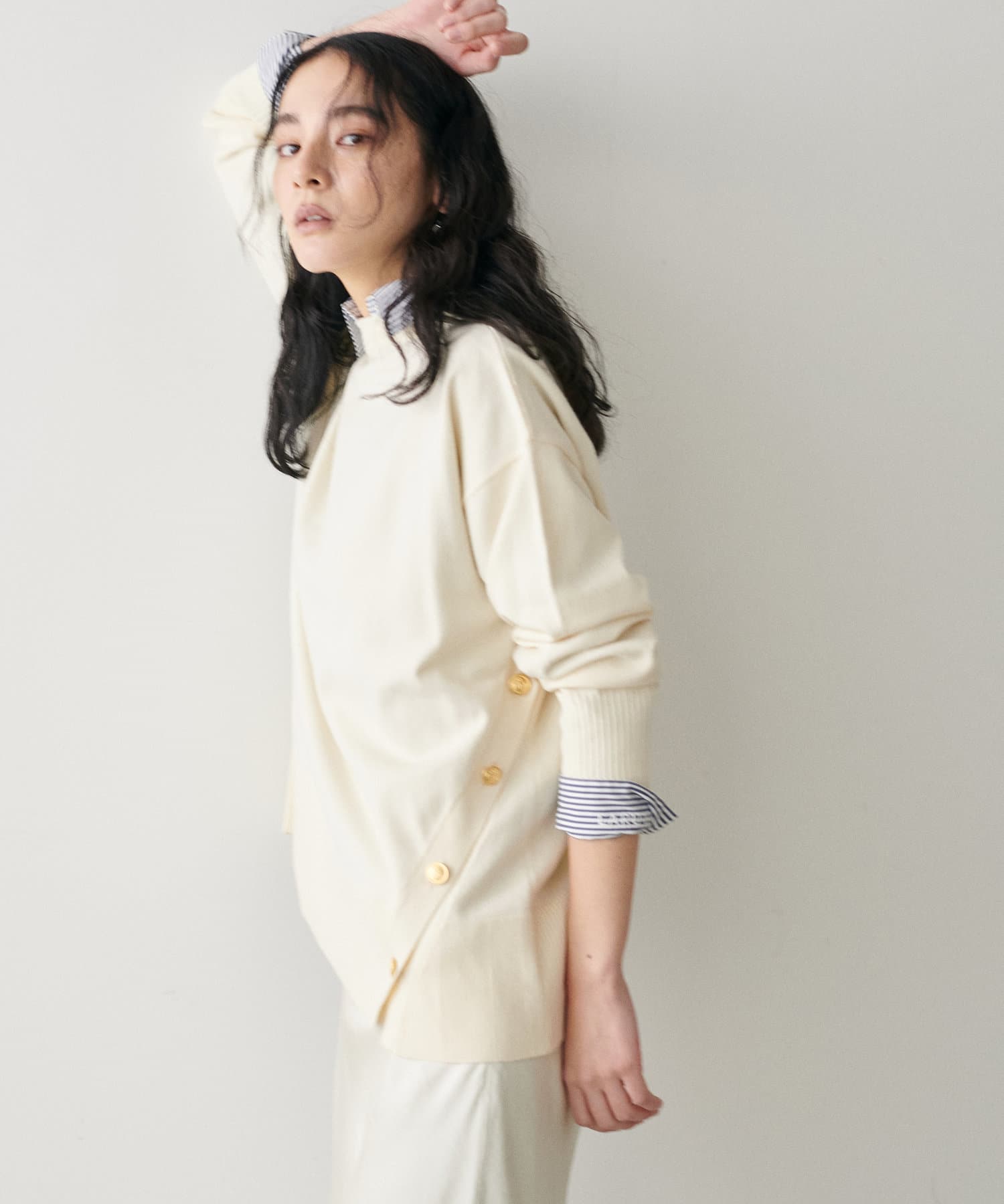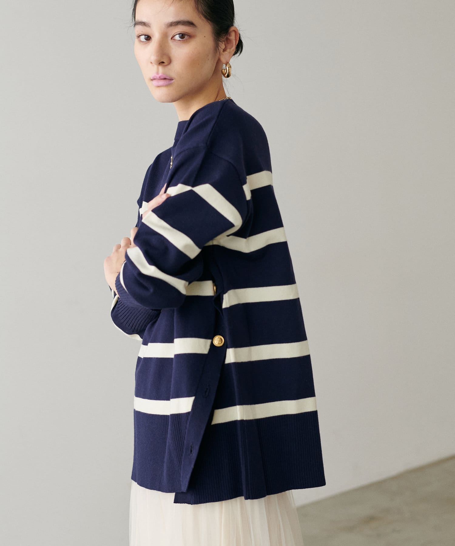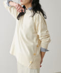 サイドに金釦がついたシンプルながらもアクセントが効いたニットが登場。