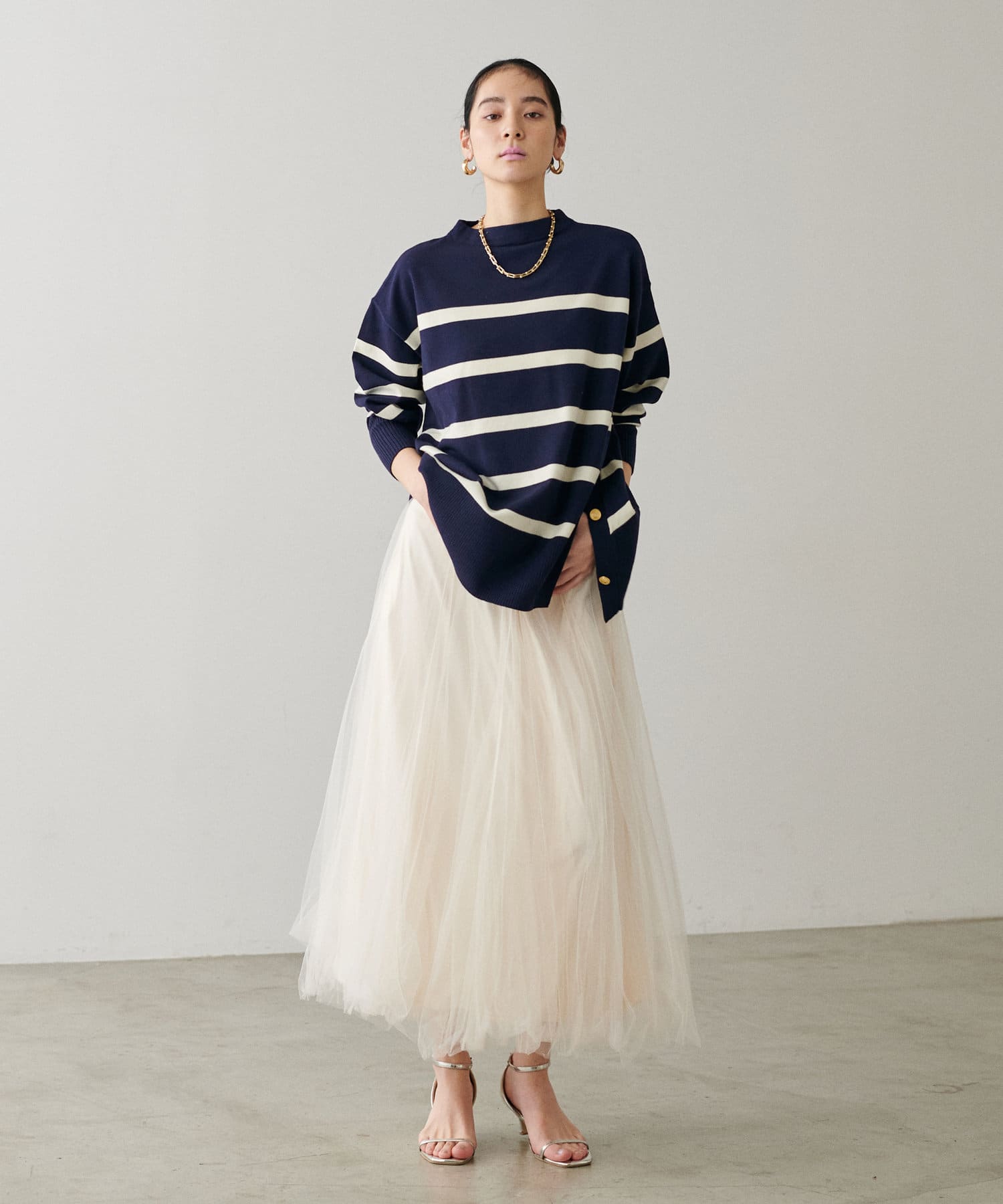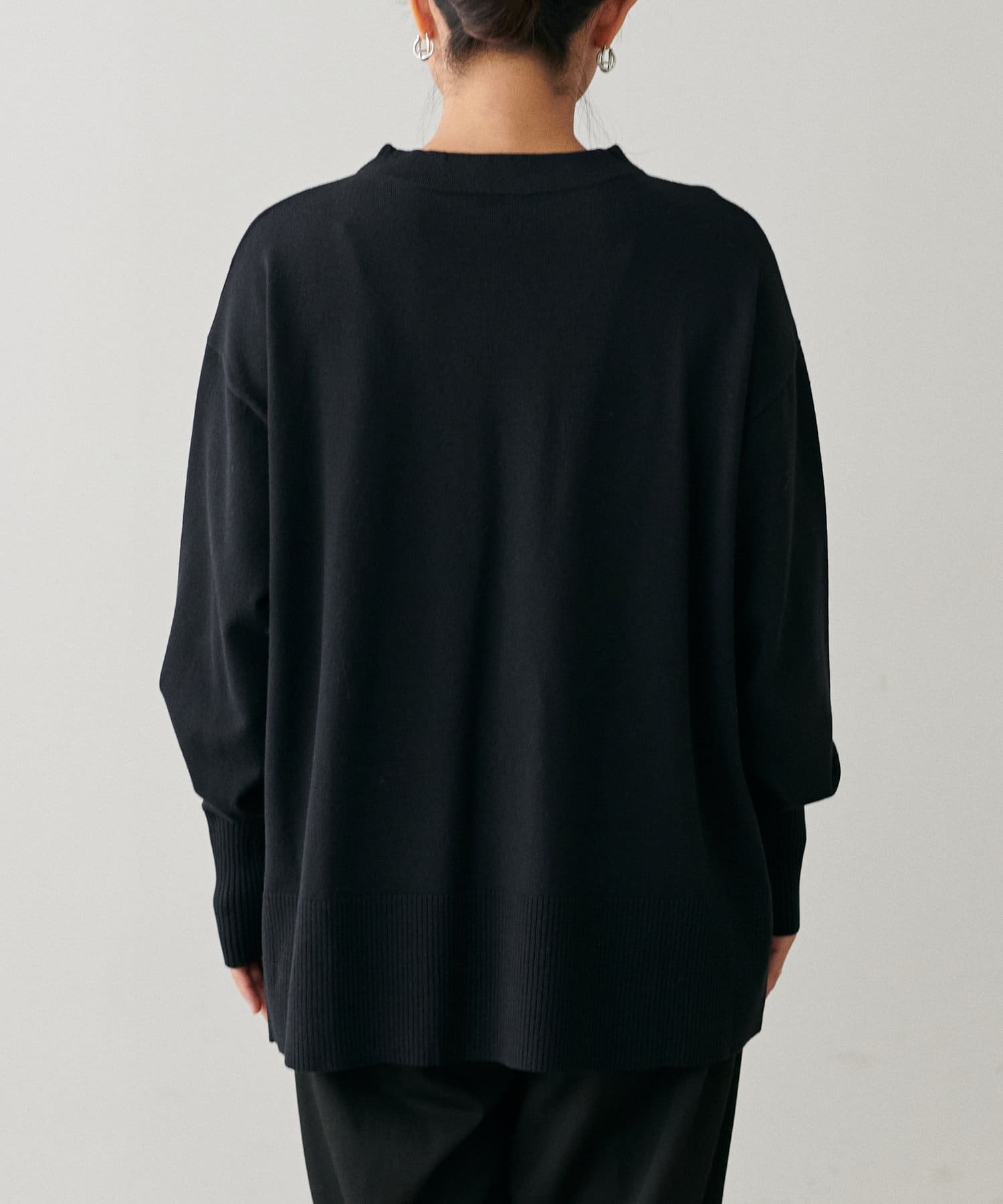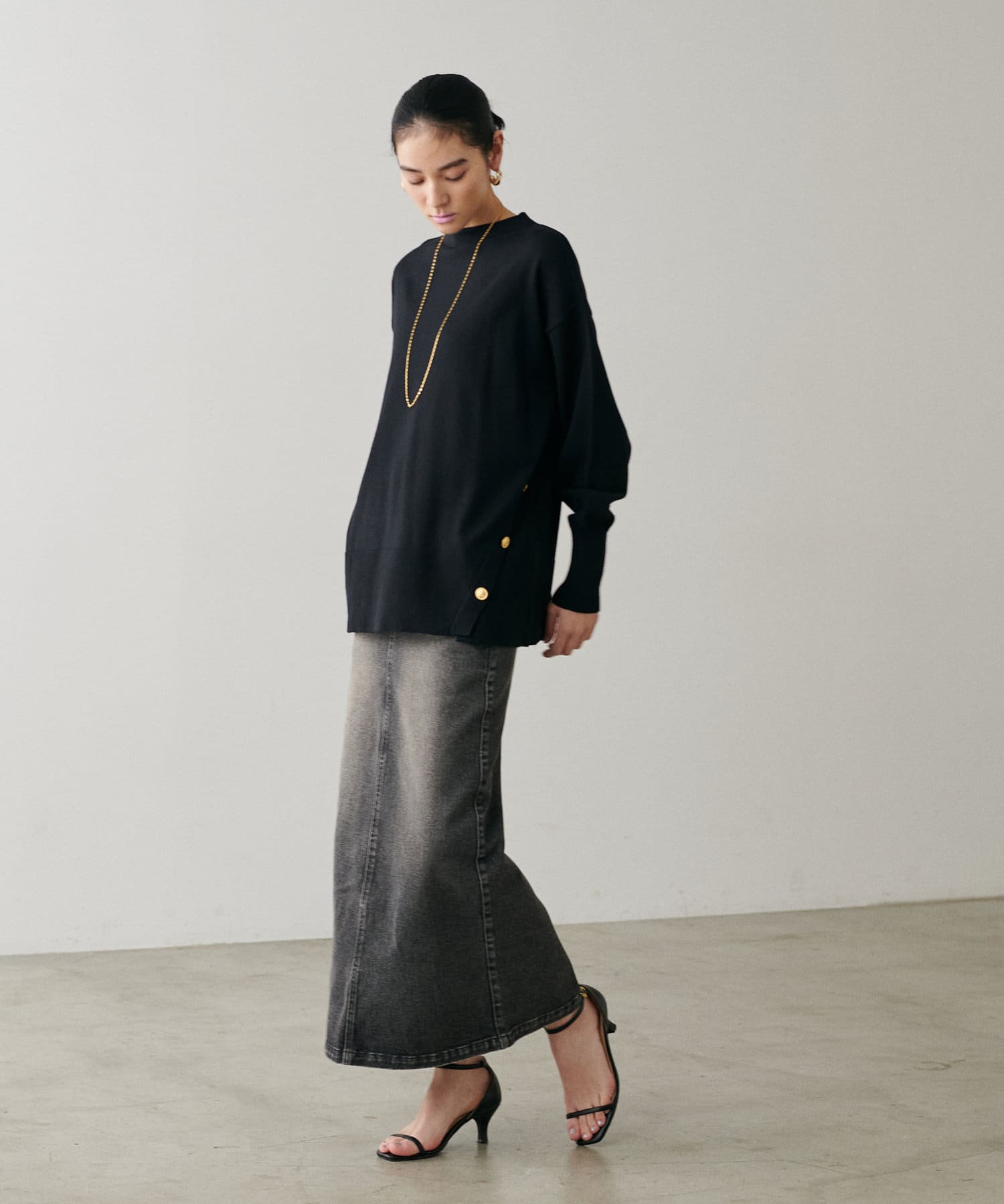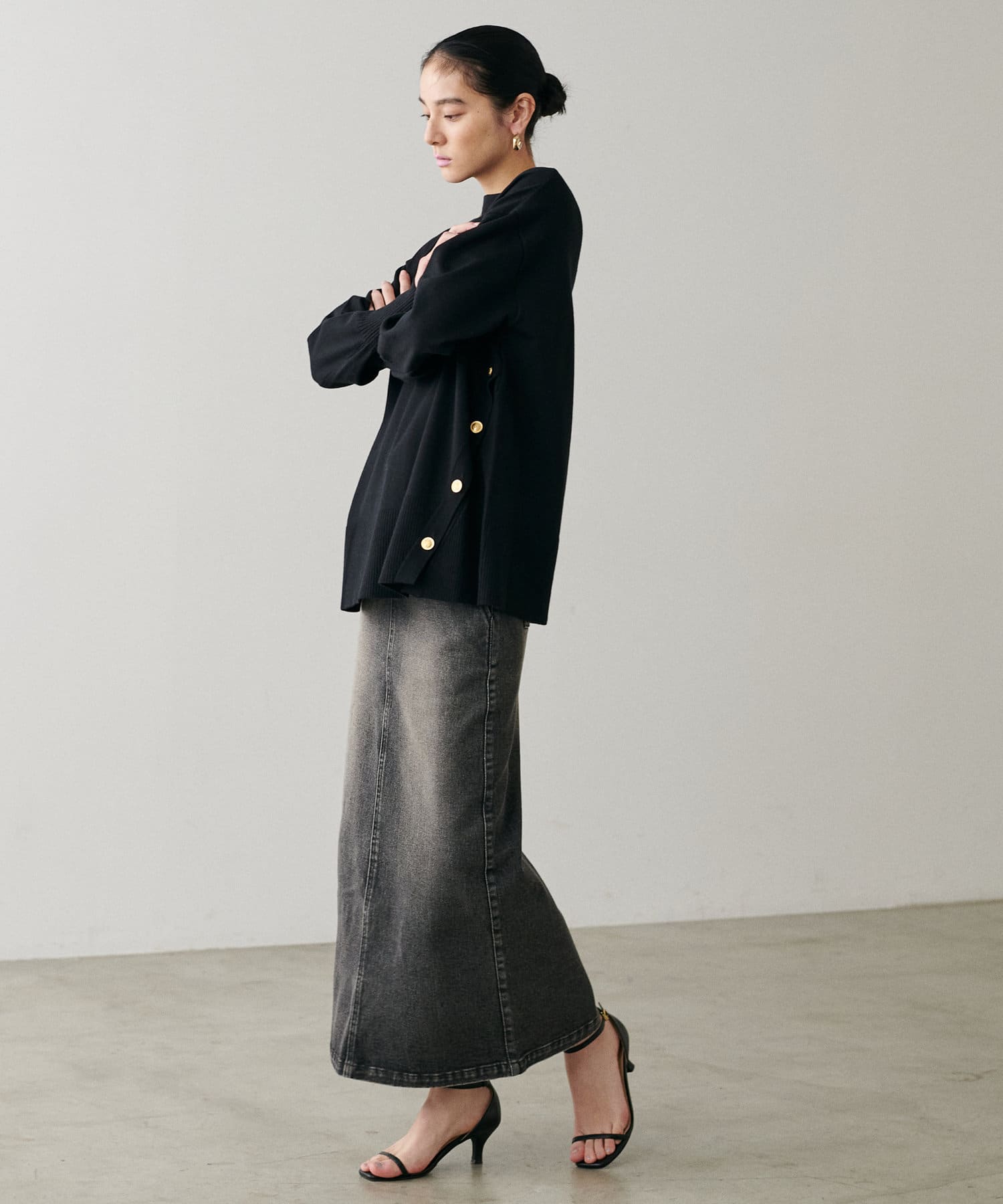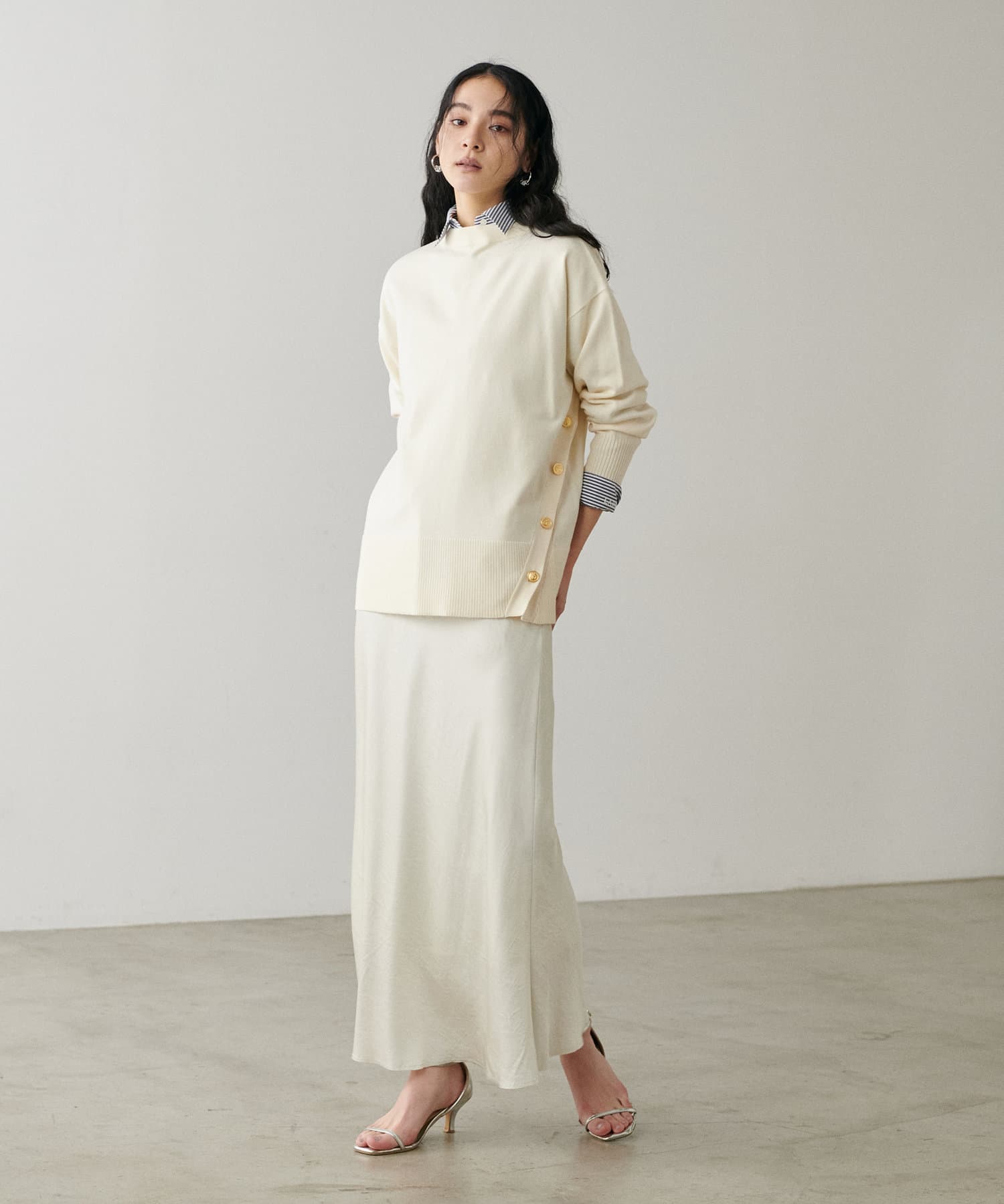 サイドに金釦がついたシンプルながらもアクセントが効いたニットが登場。