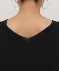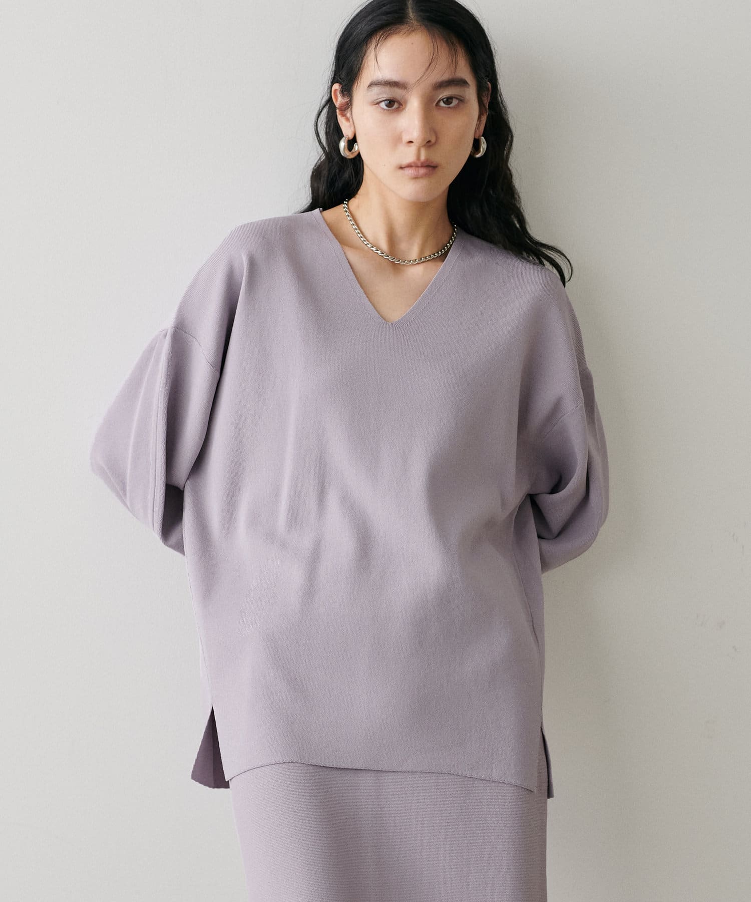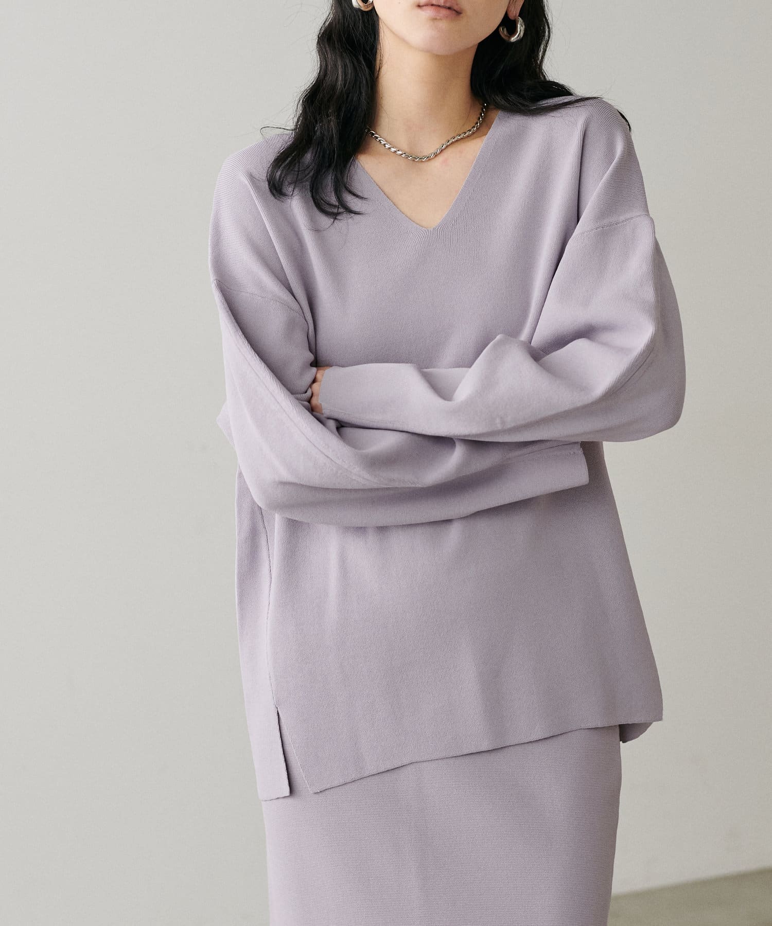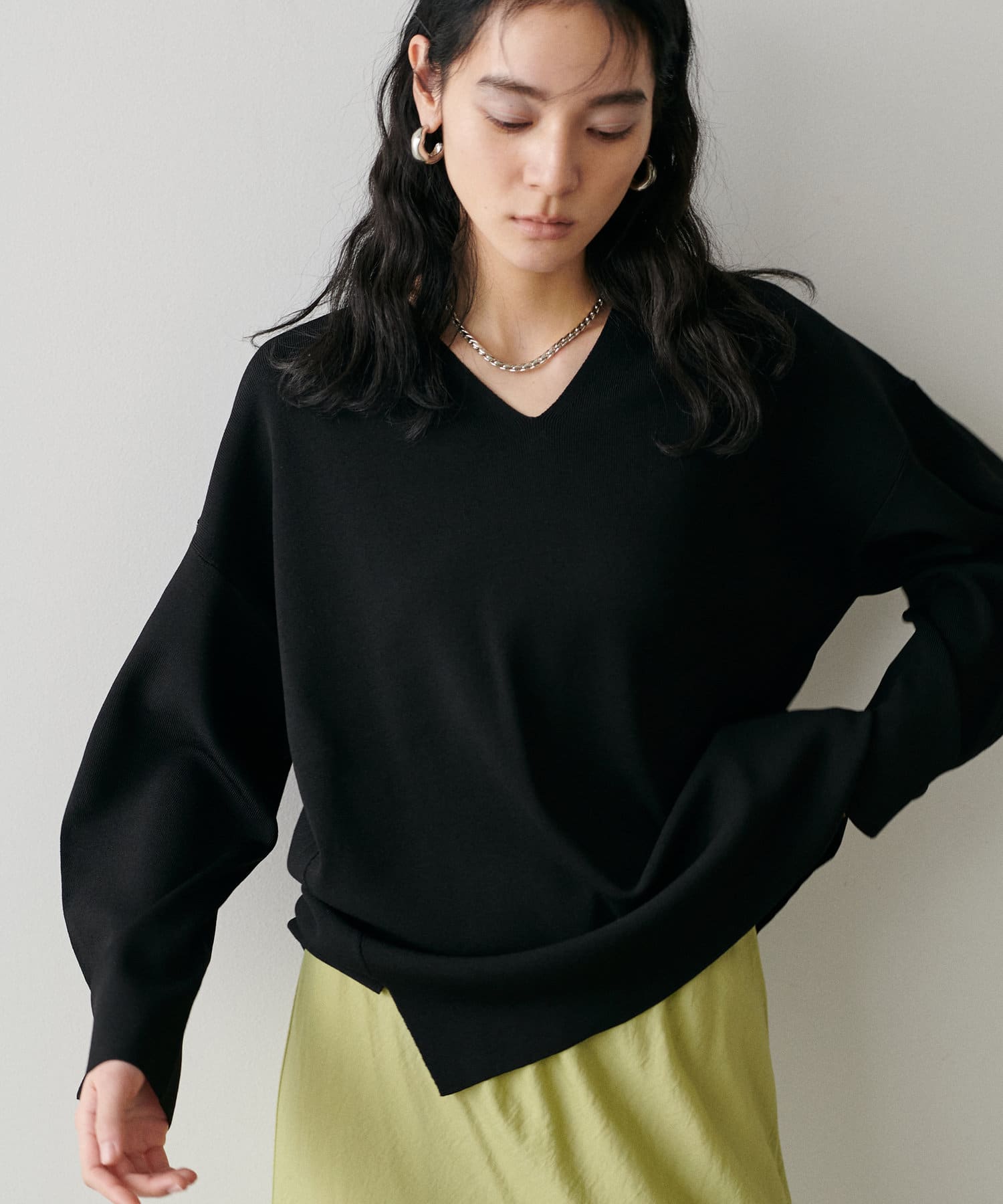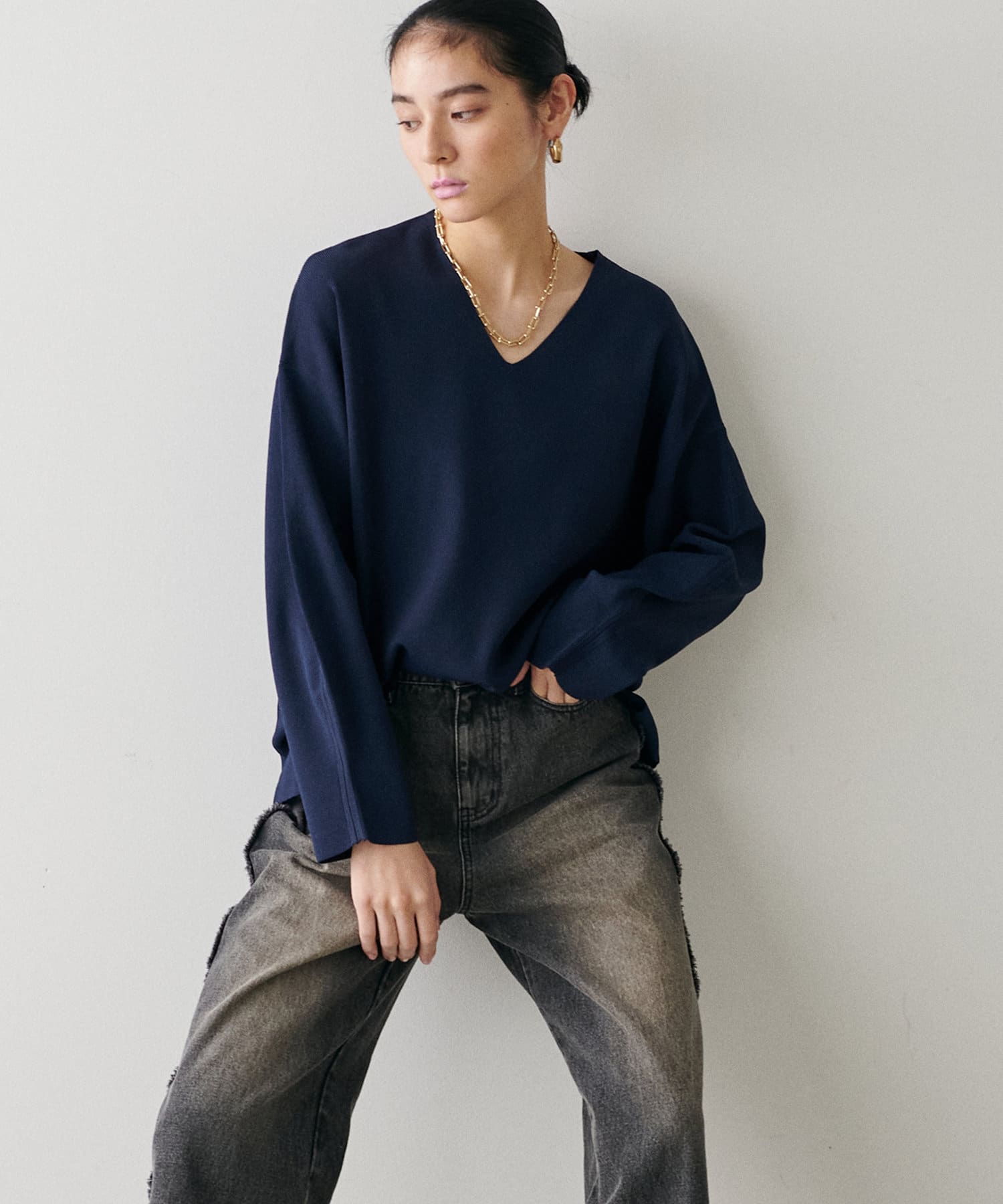 叶えています。深めのVネックが顔周りをきれいに見せ、