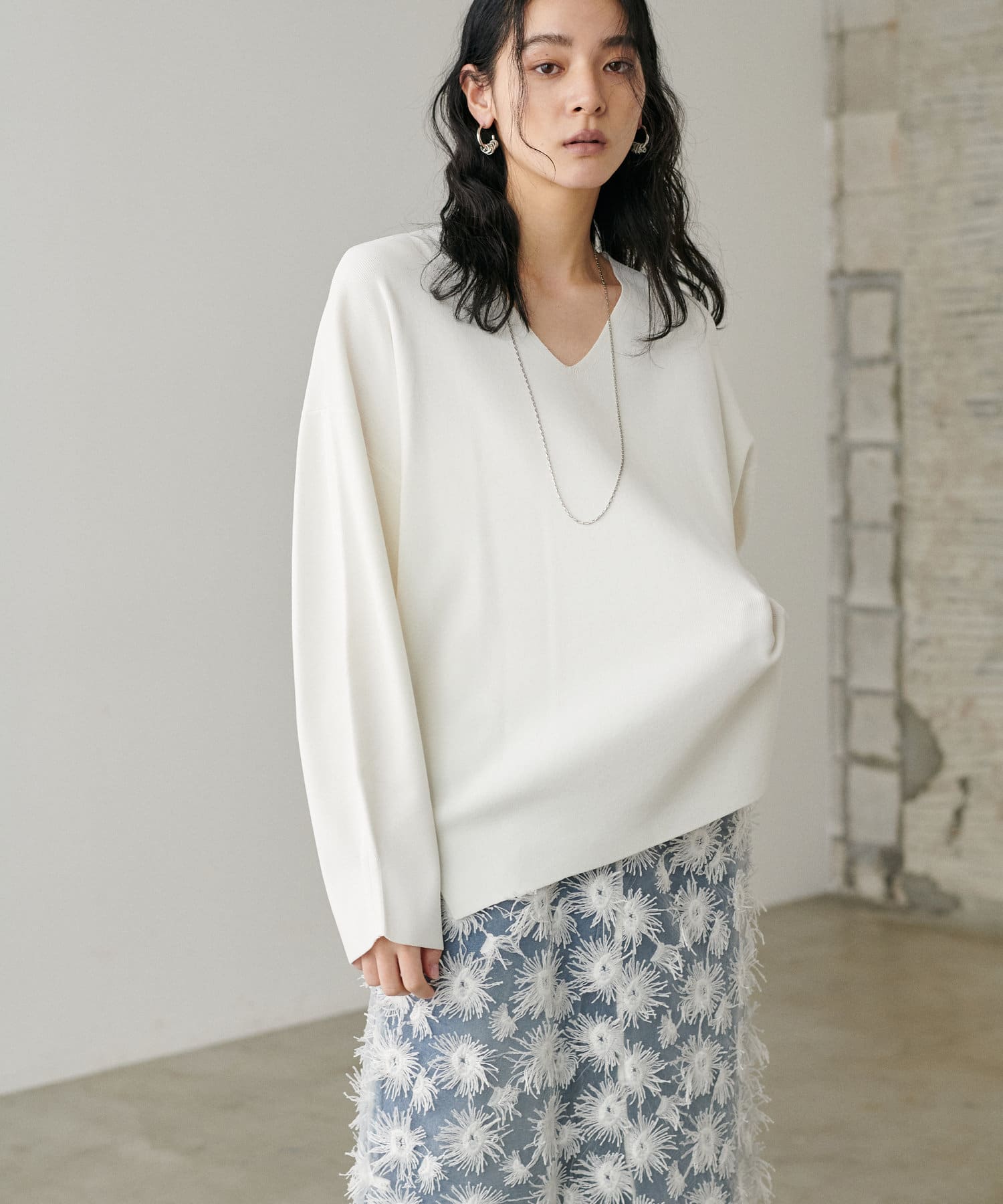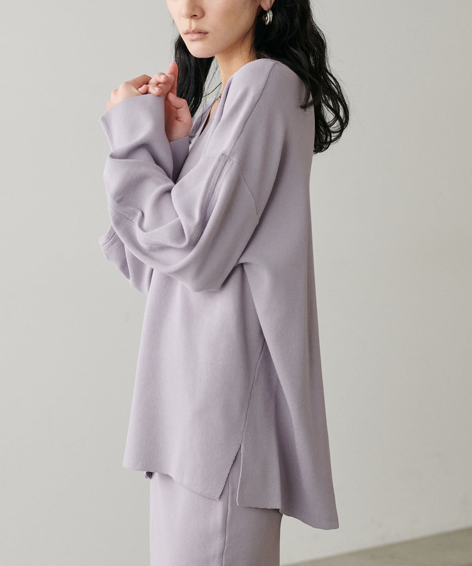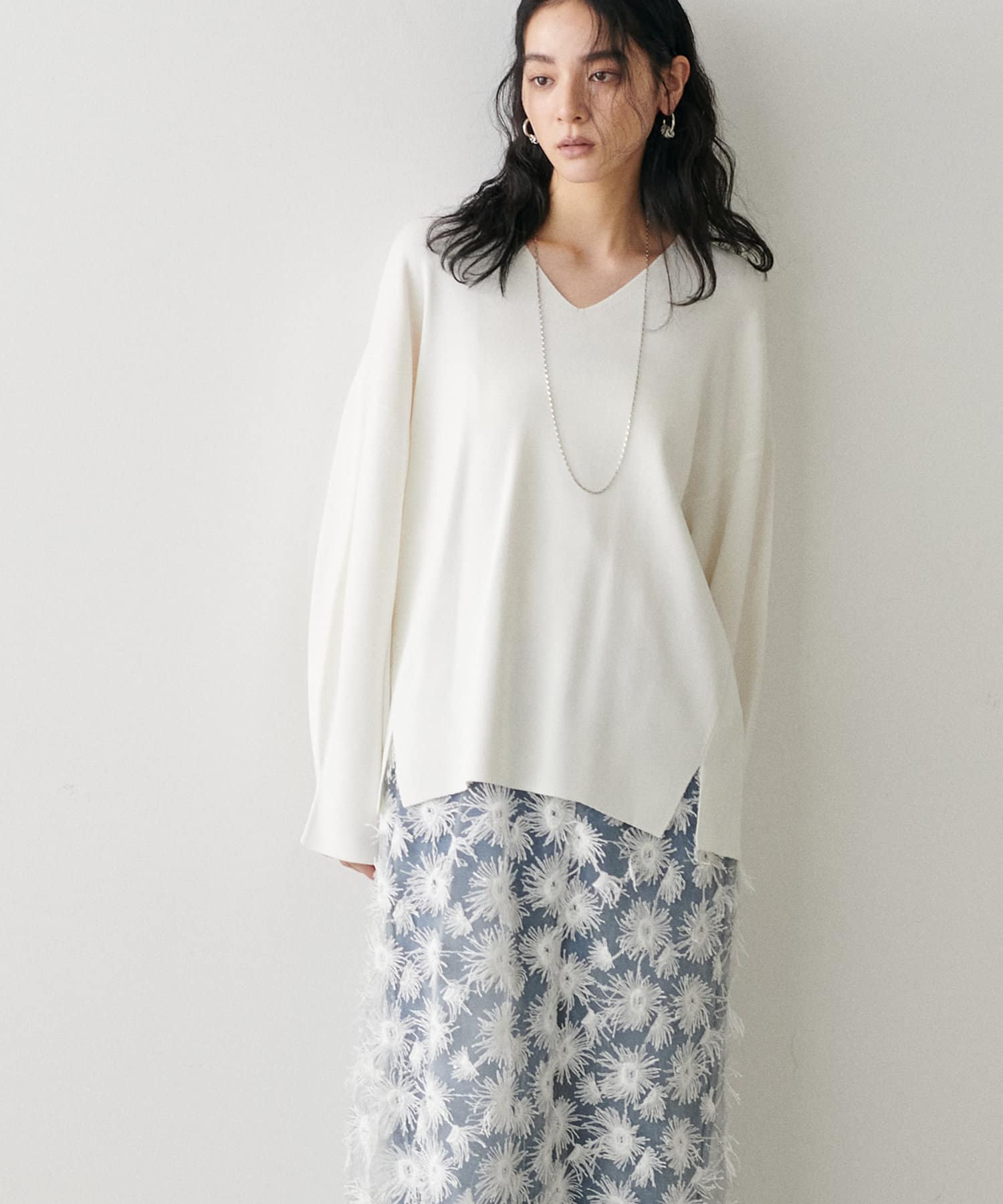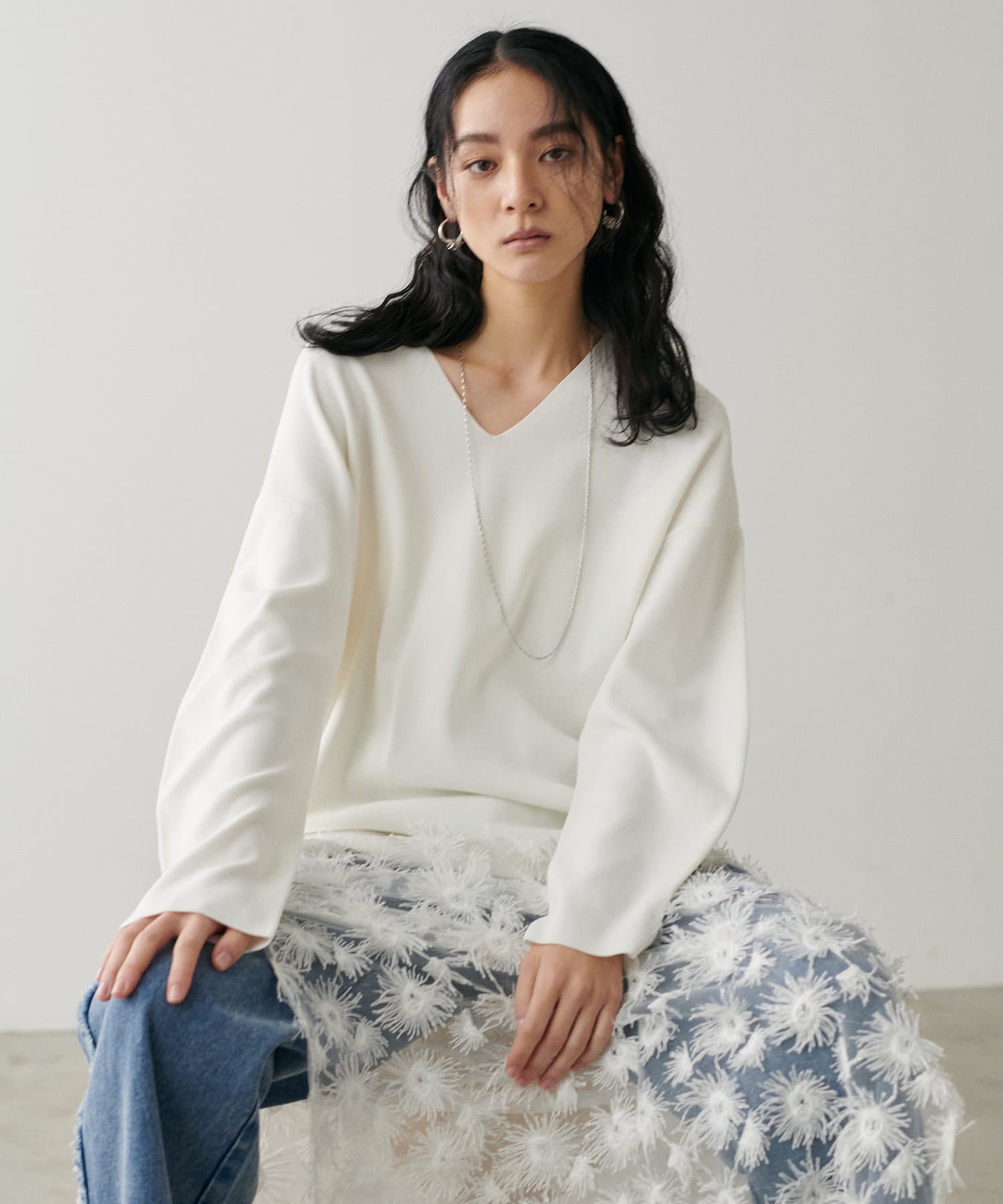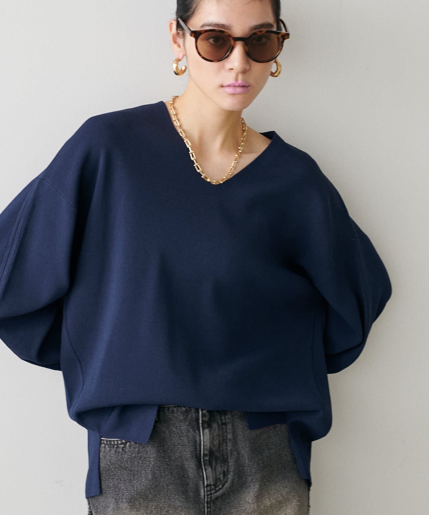 叶えています。深めのVネックが顔周りをきれいに見せ、