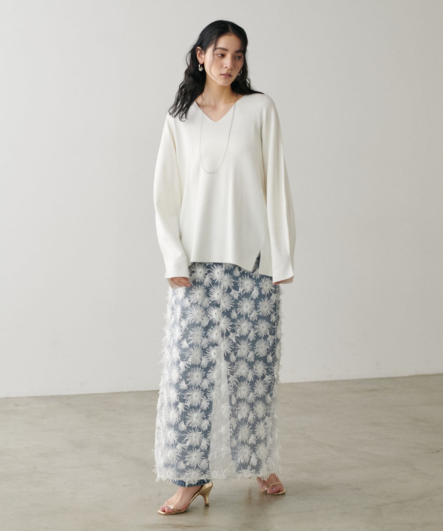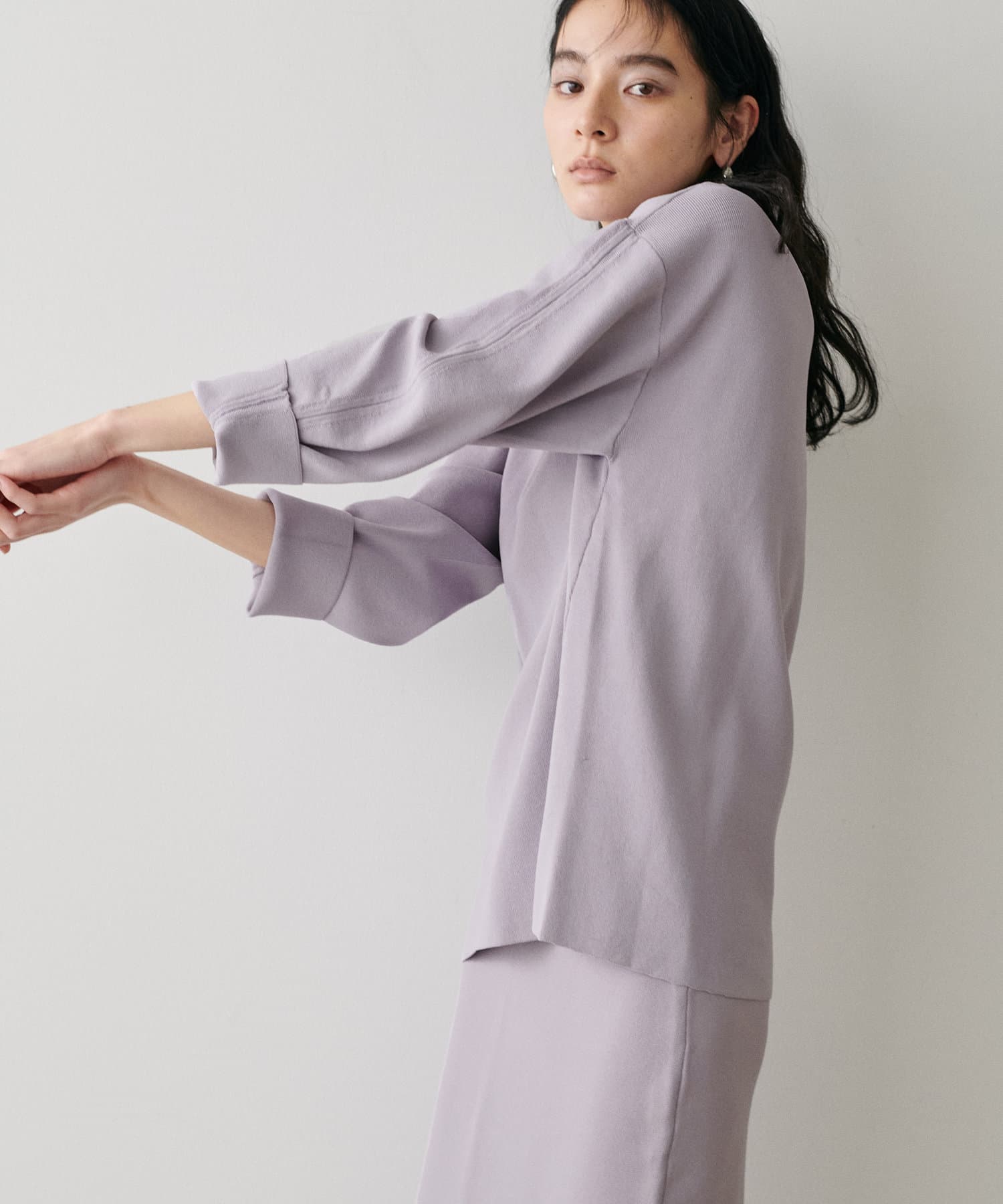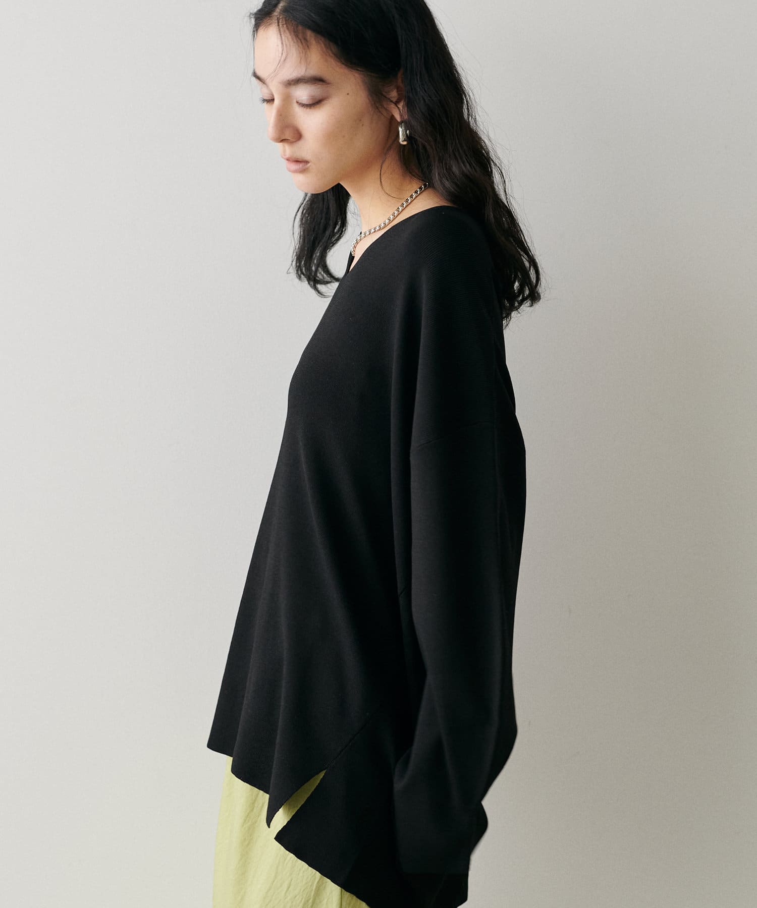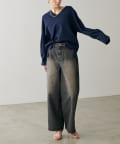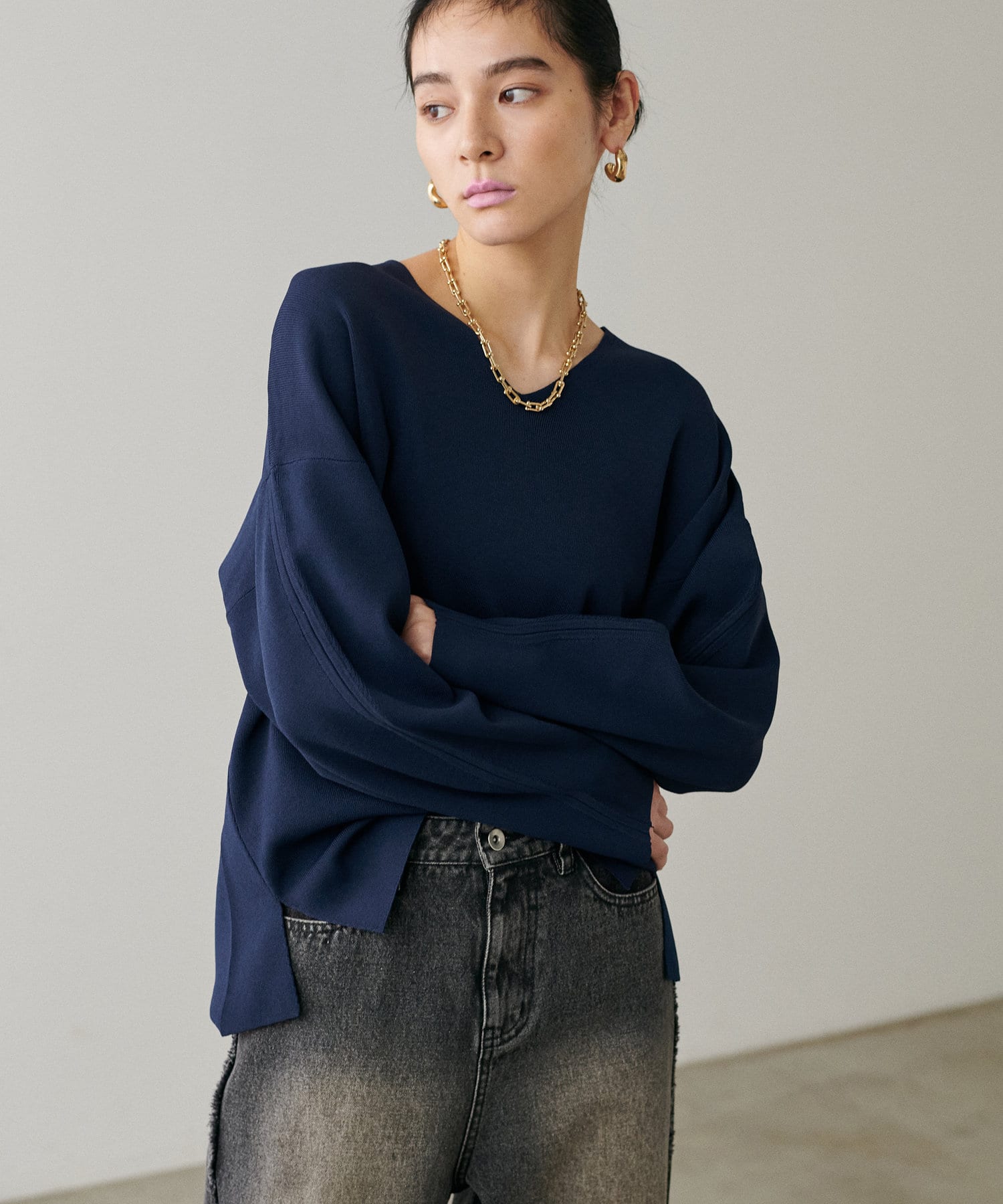 叶えています。深めのVネックが顔周りをきれいに見せ、