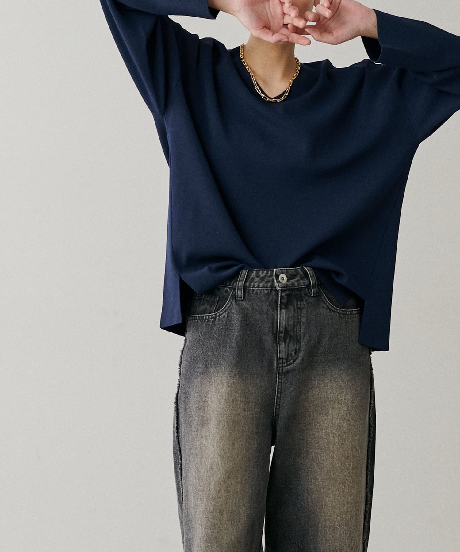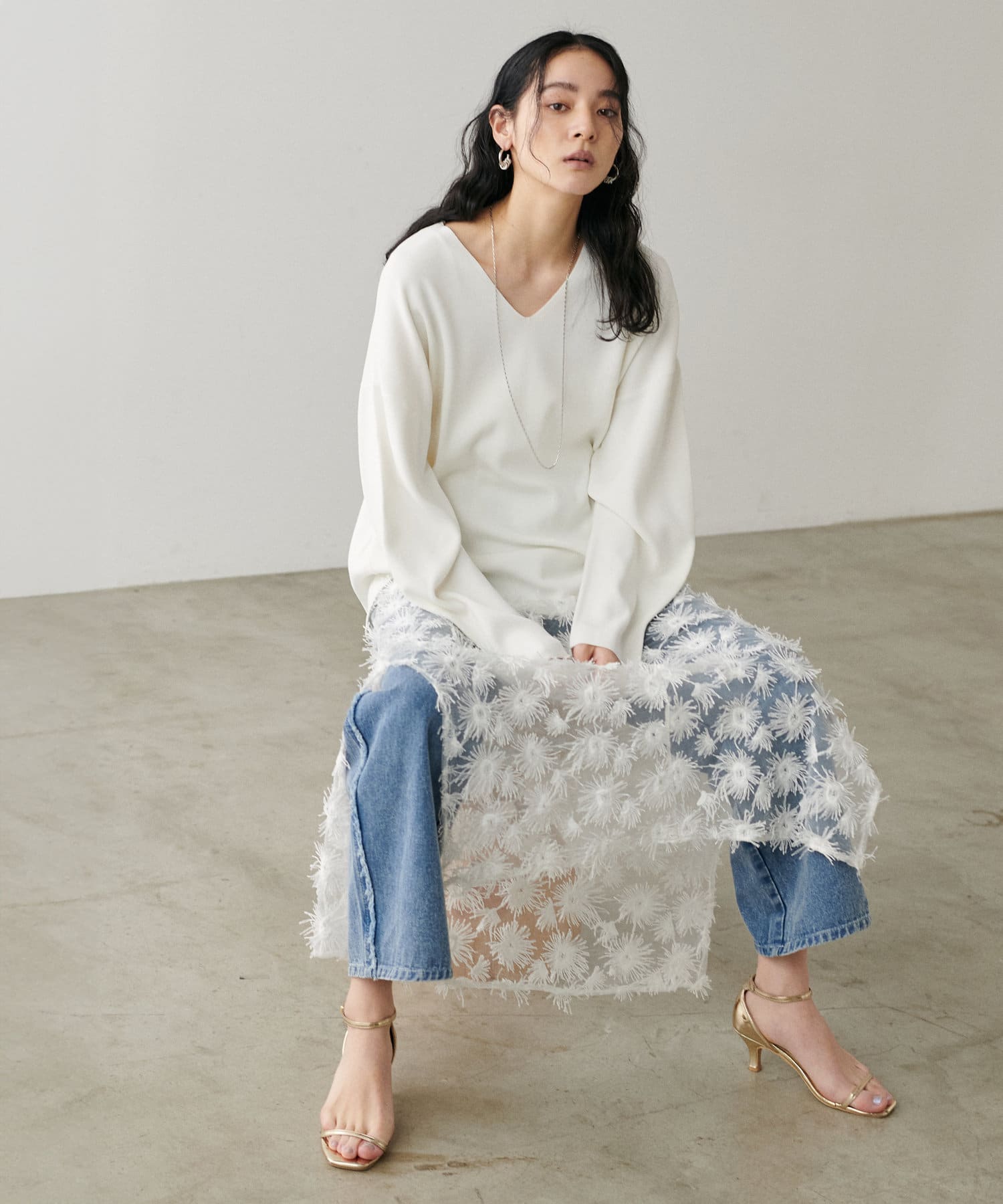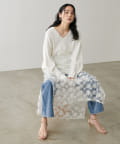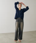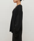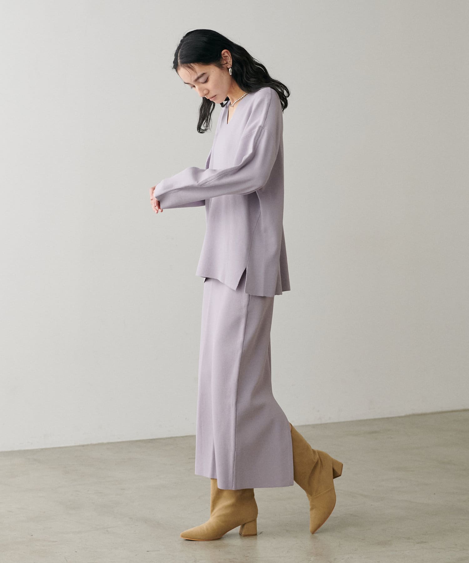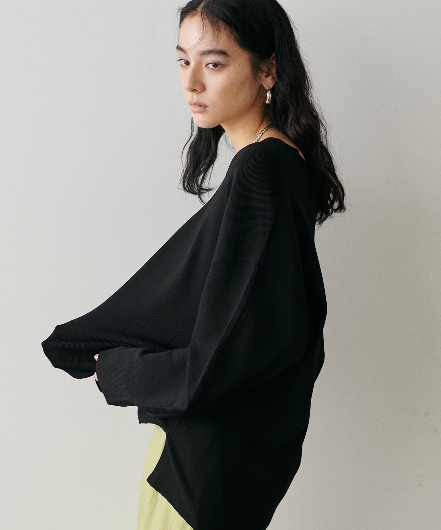 叶えています。深めのVネックが顔周りをきれいに見せ、