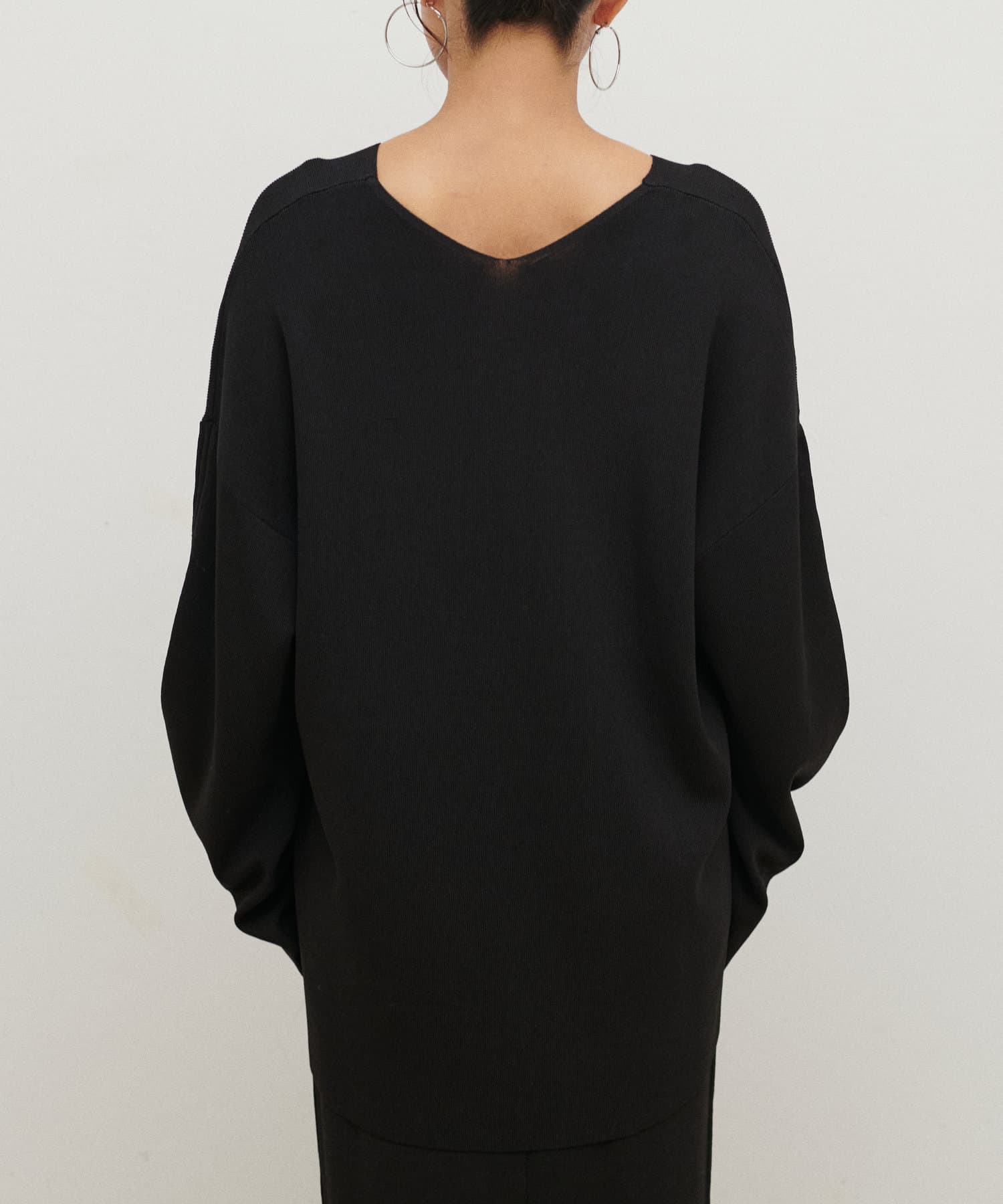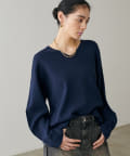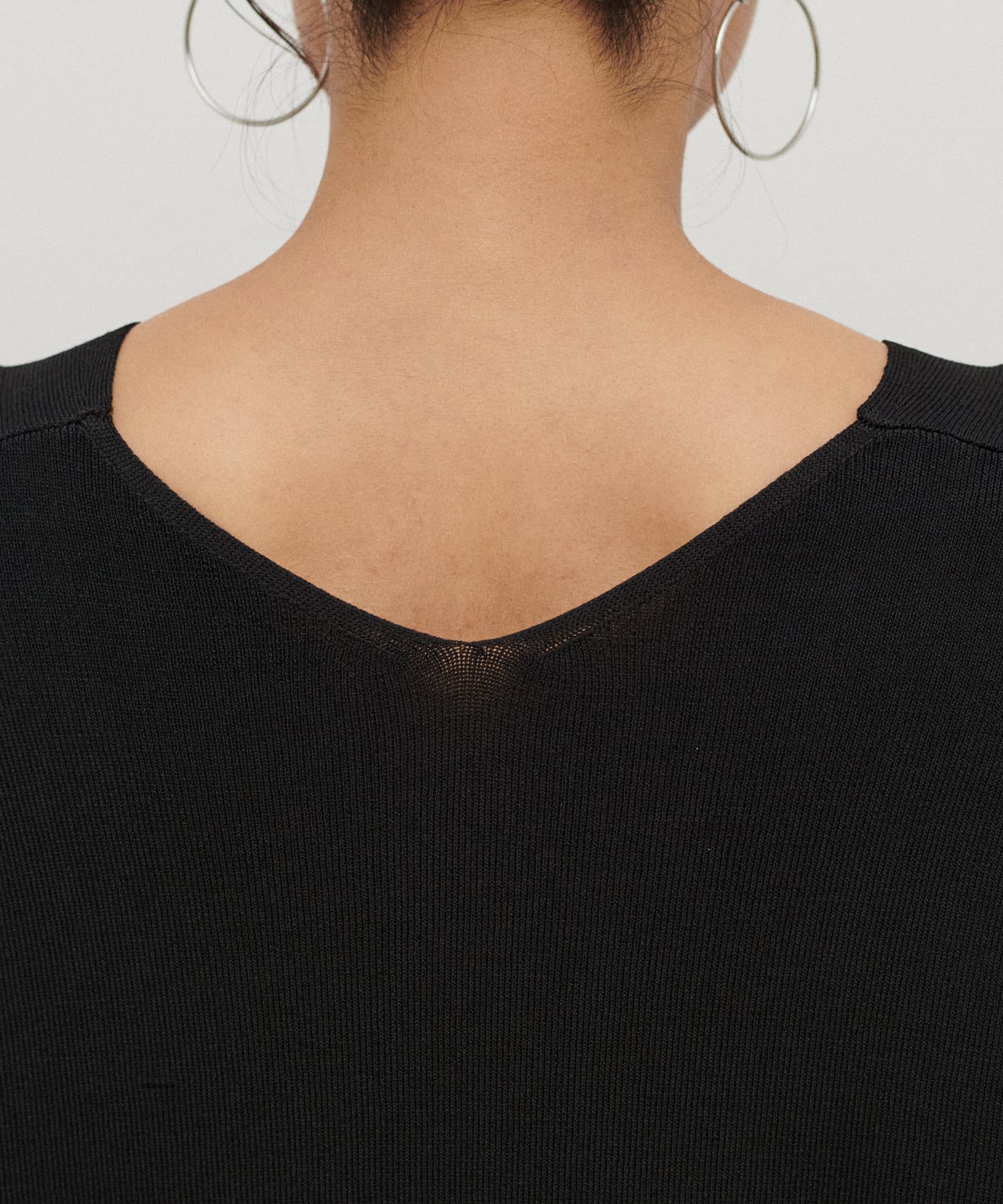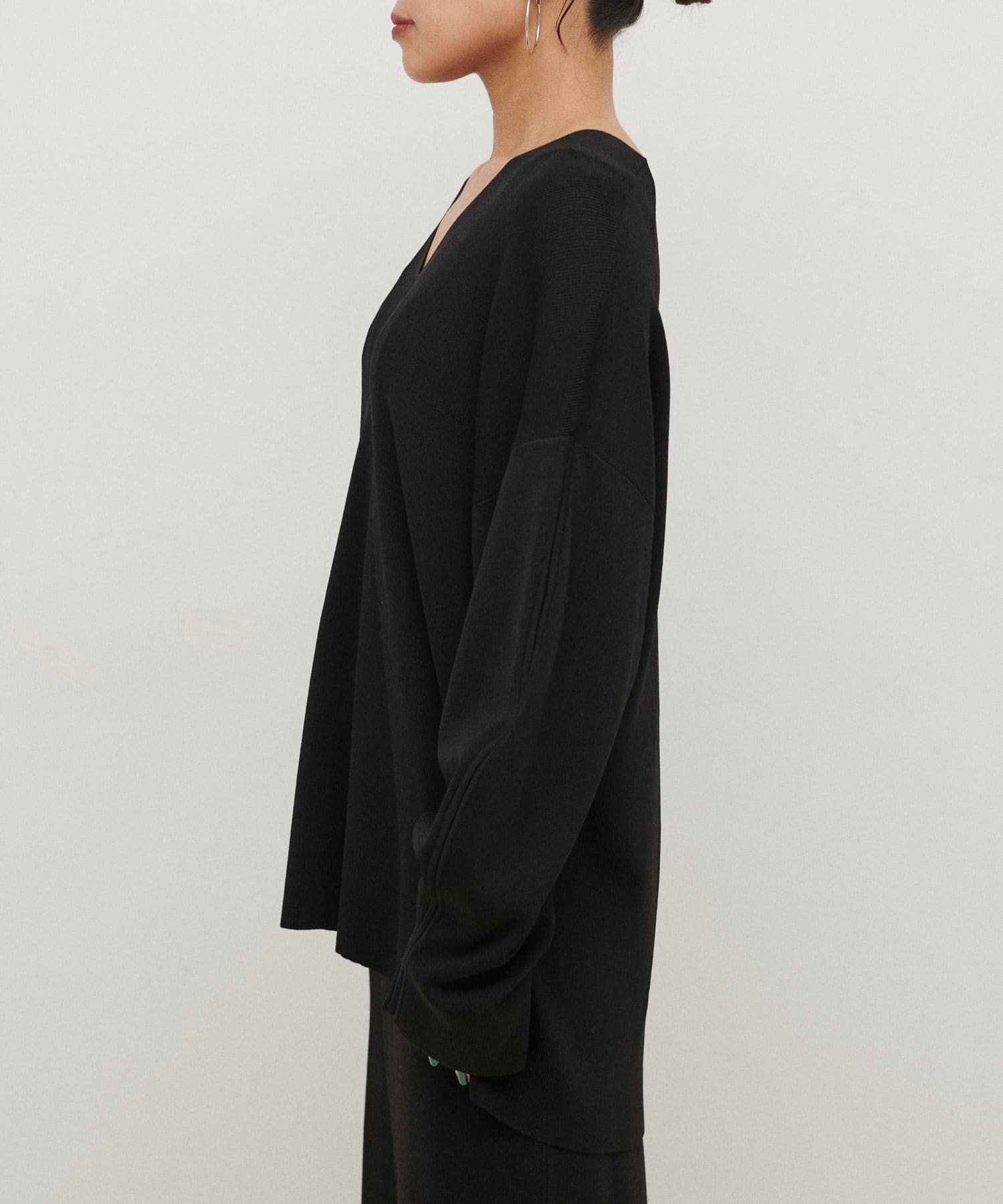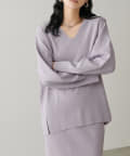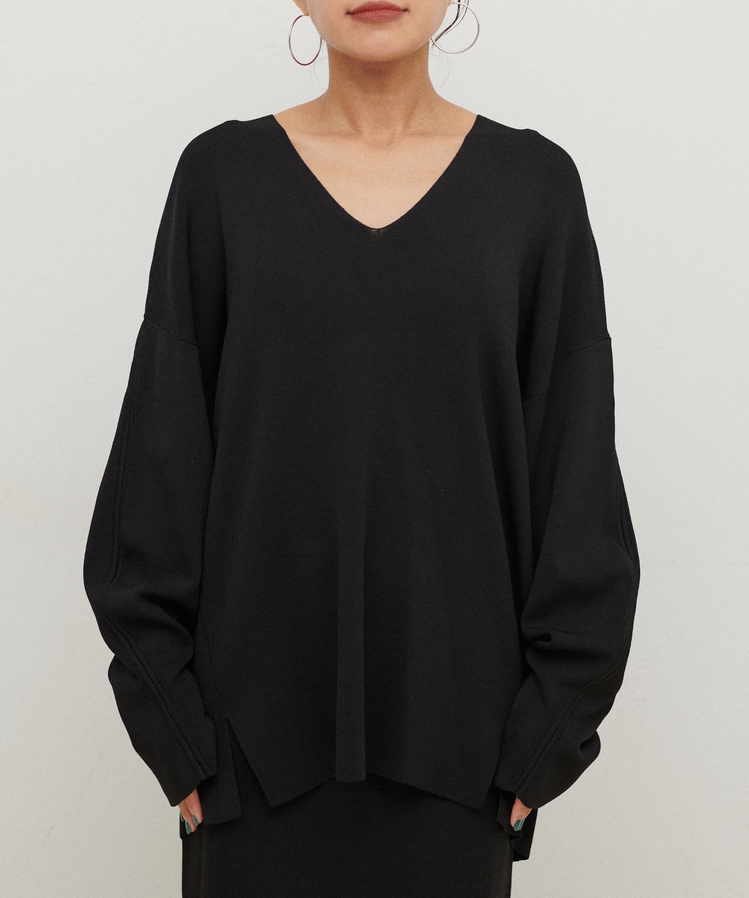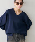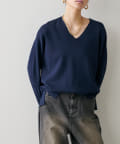 深めのVネックが印象的なシンプルなニットトップス。
