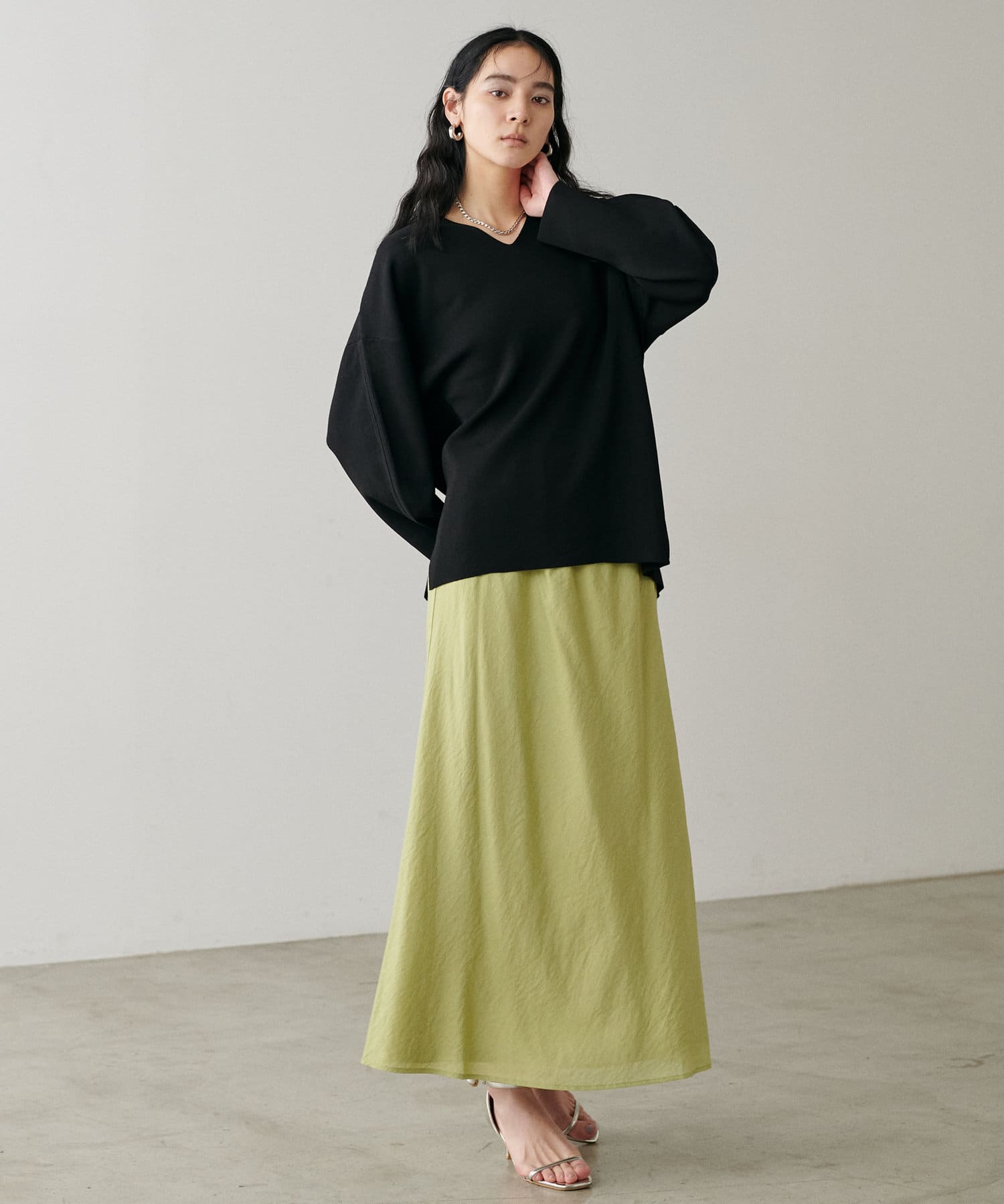 光沢感のあるスカートと合わせるのもおすすめ。