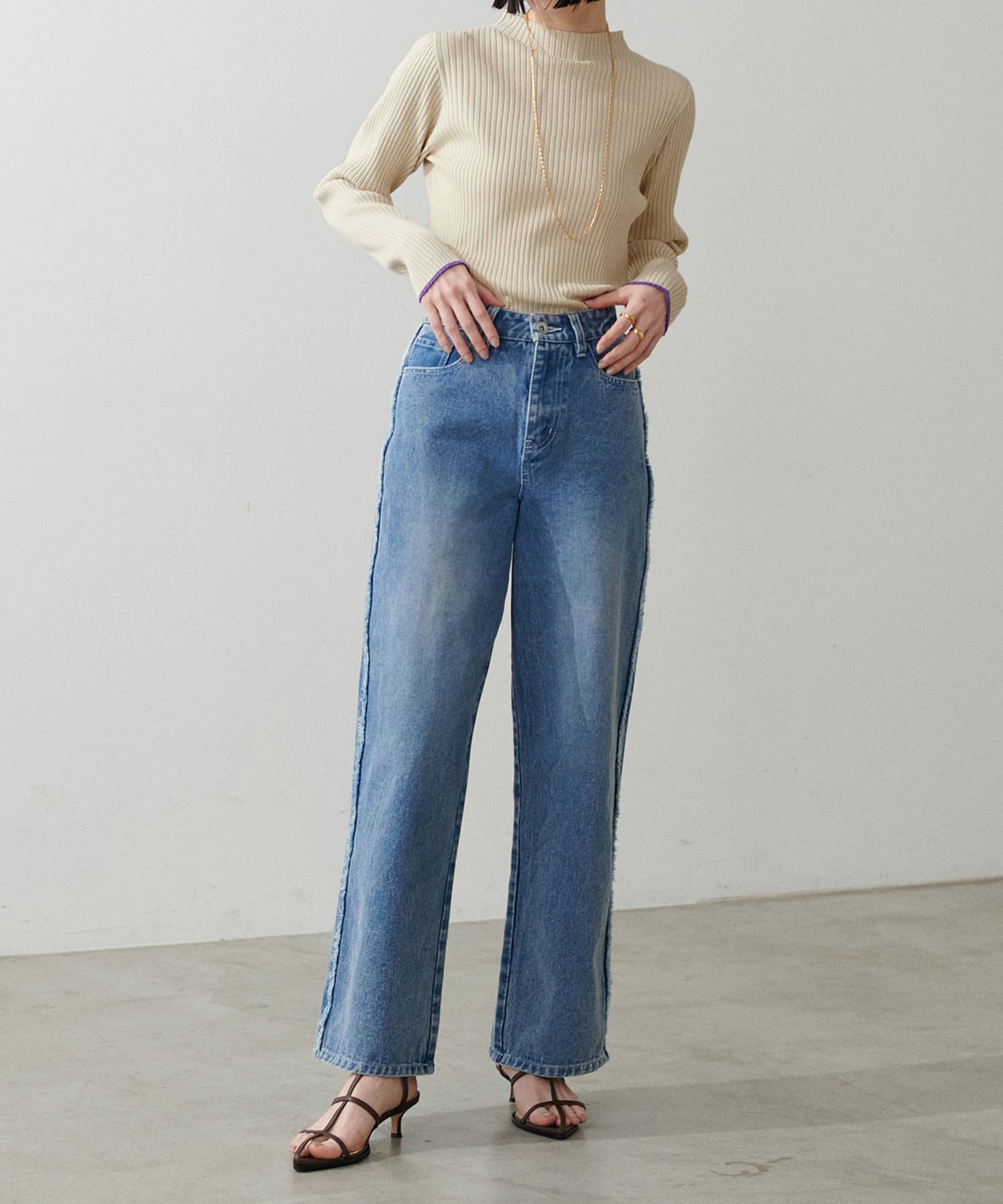 シンプルに1枚で、サイドフリンジデニムなどと合わせても大人のラフコーデに。