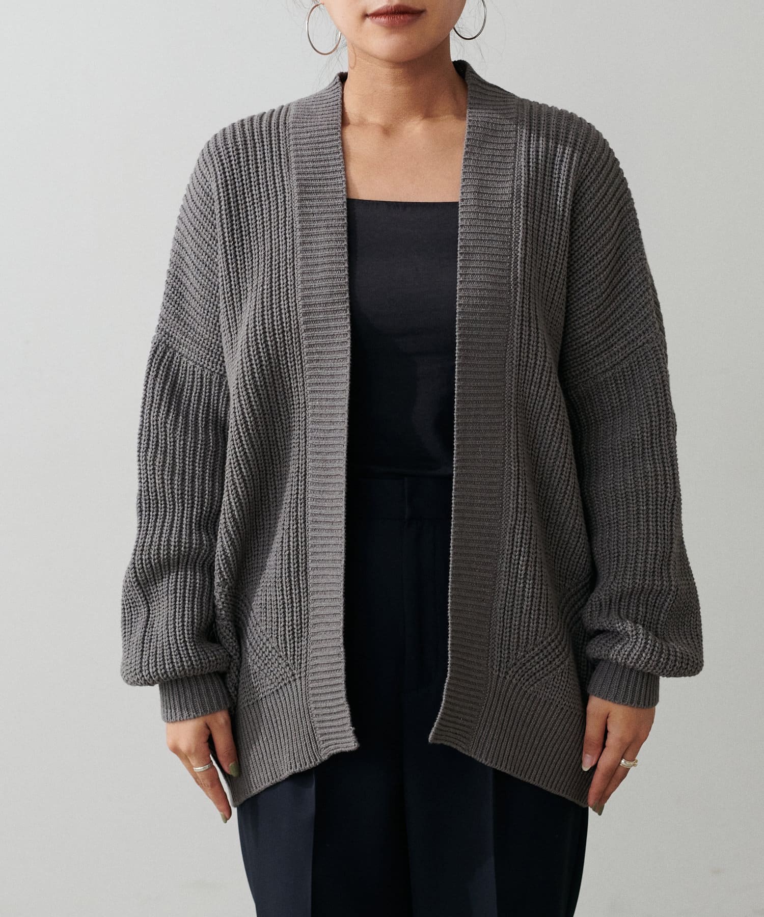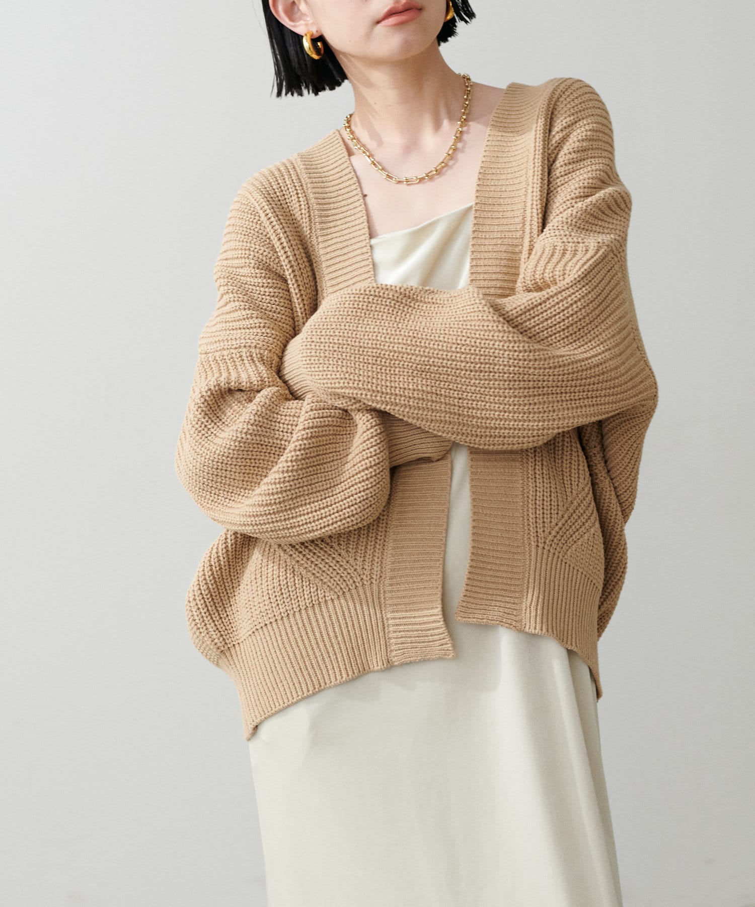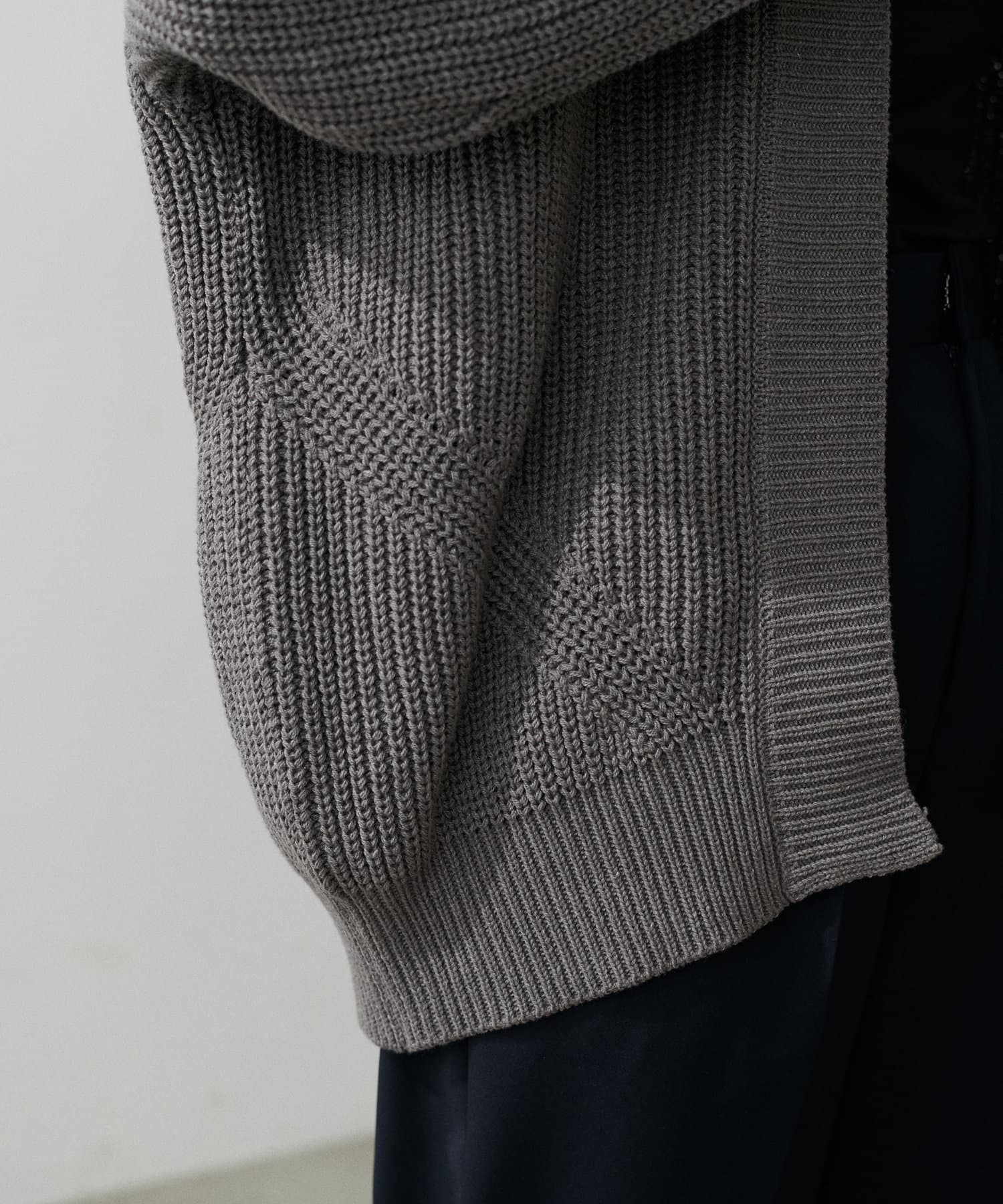 片畦のざっくりとした網目が特徴のニットカーディガン。
