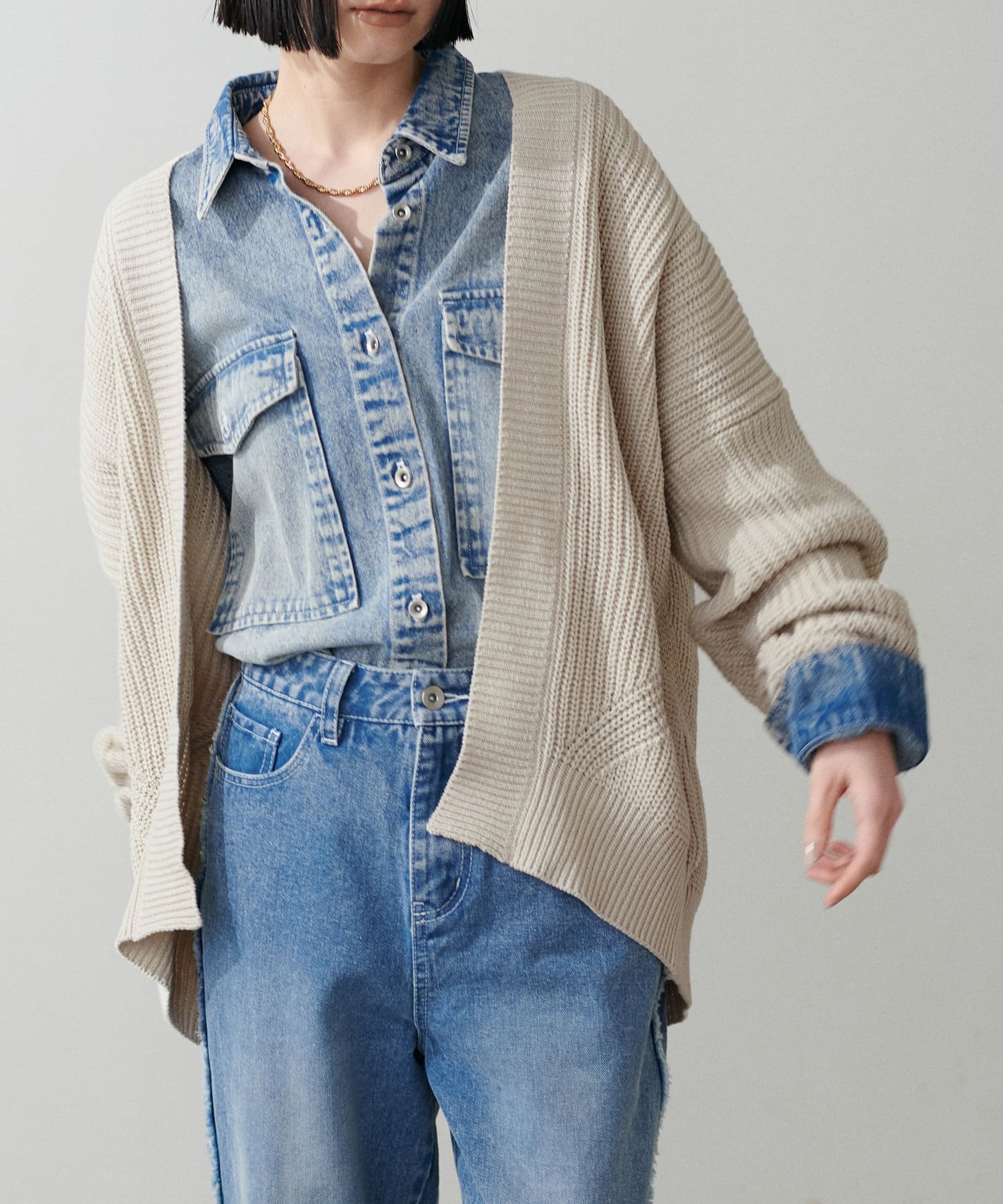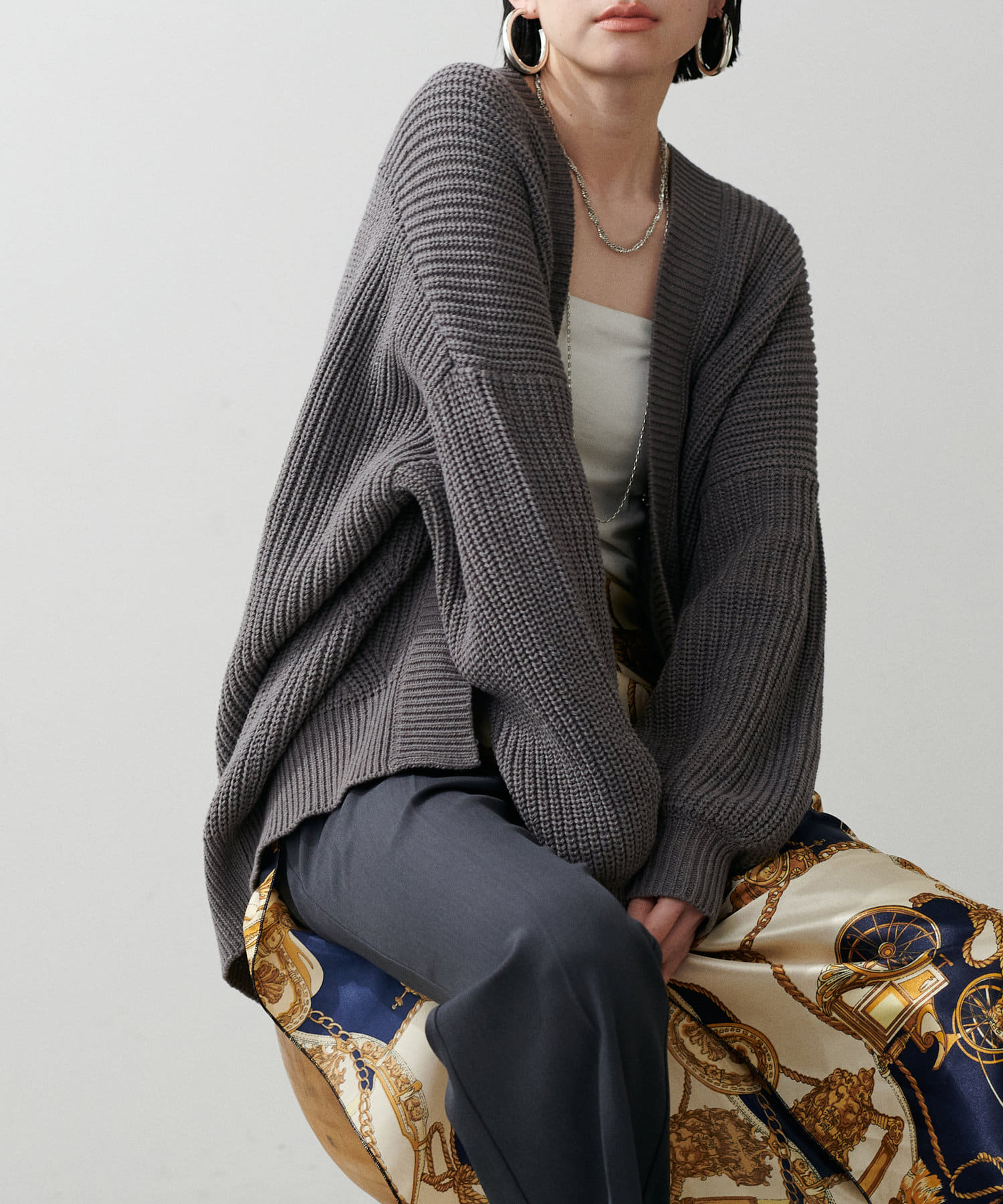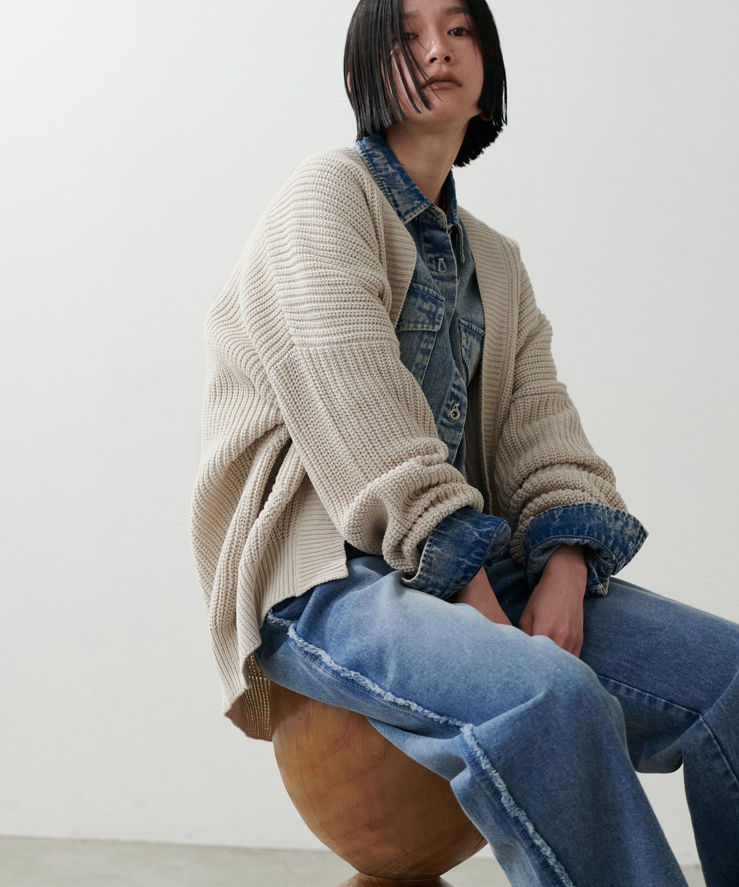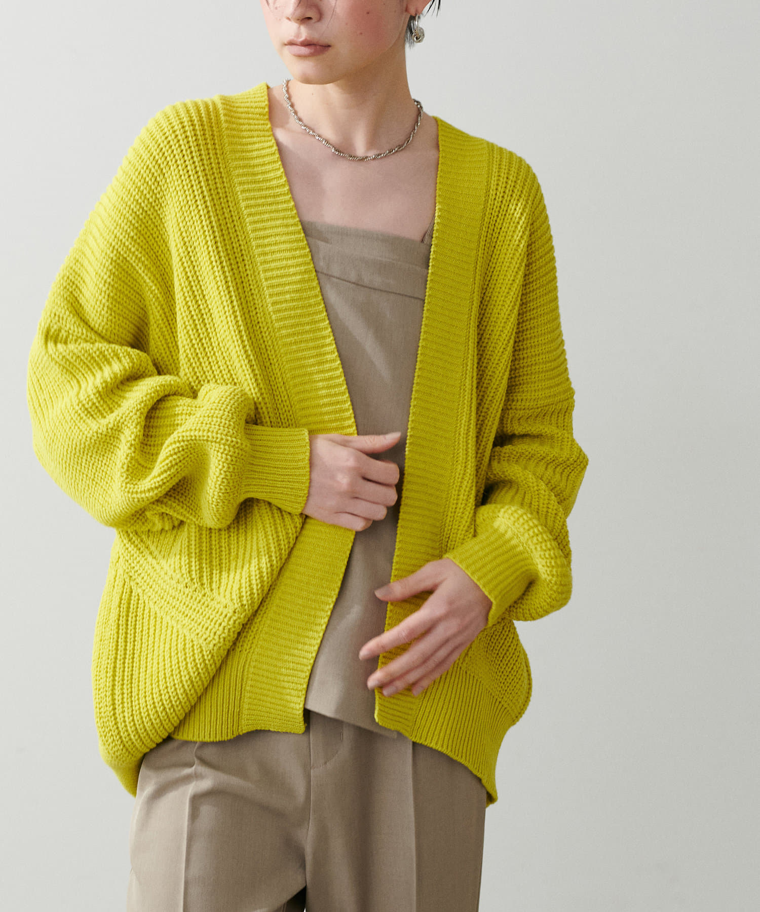片畦のざっくりとした網目が特徴のニットカーディガン。