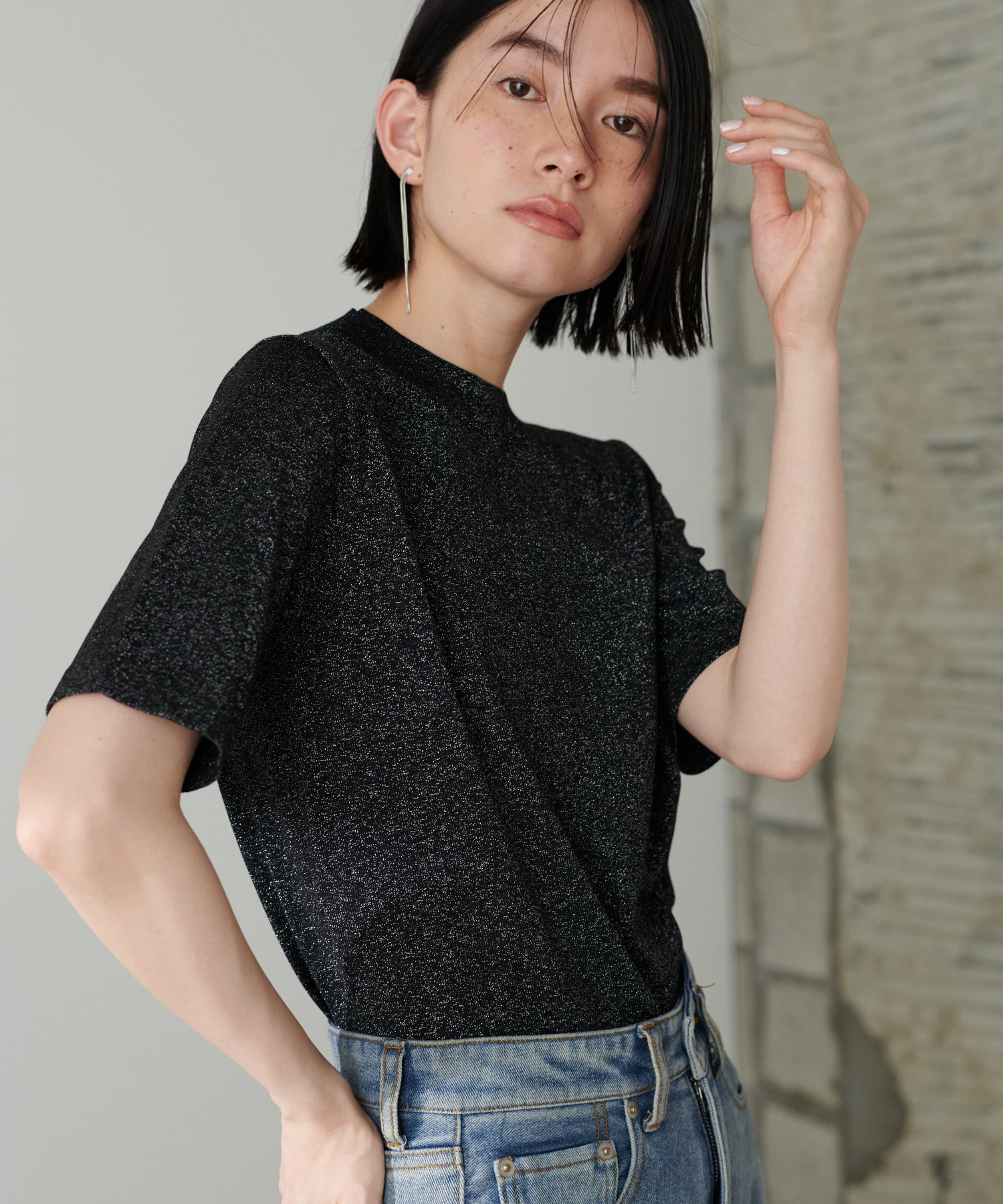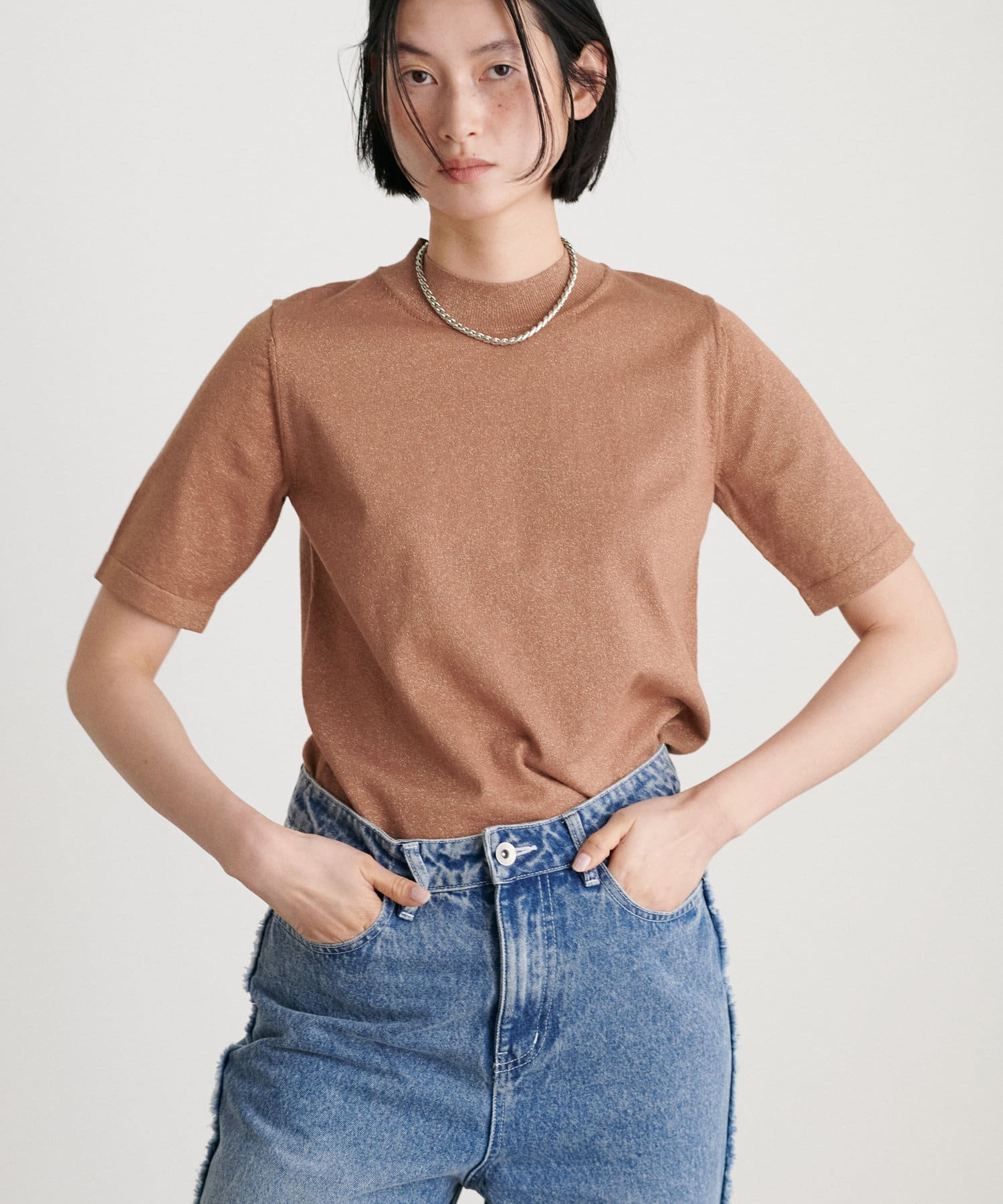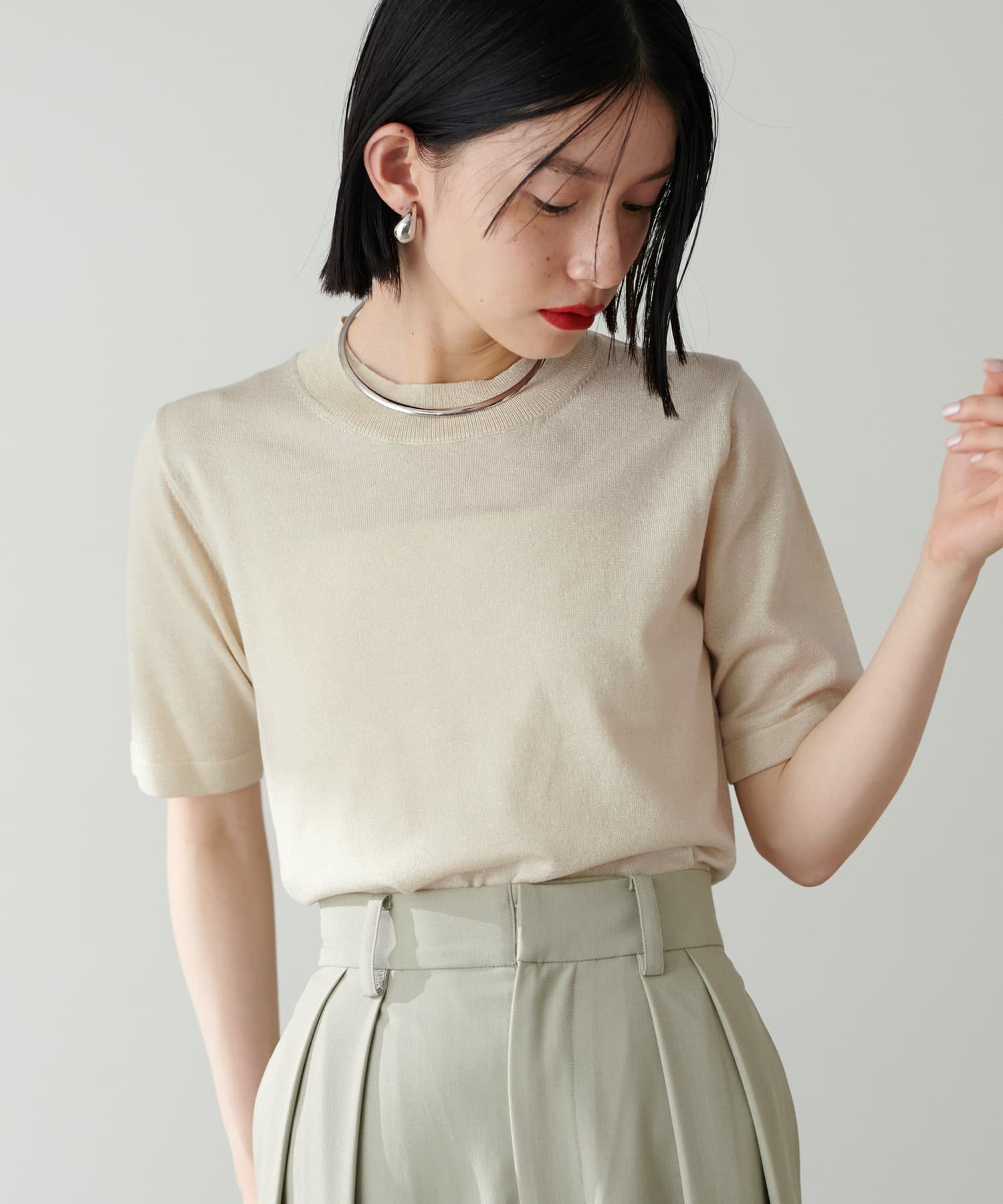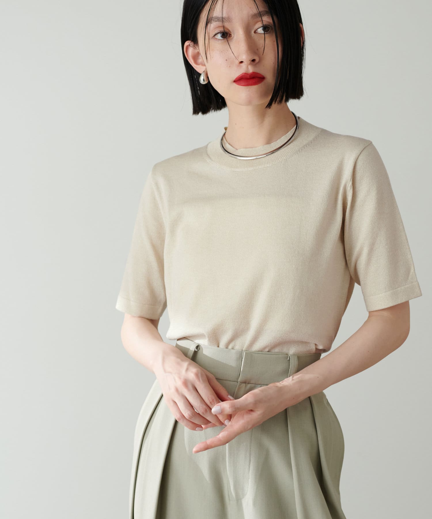 上品なラメの表情がポイントの半袖ニットプルオーバー。
