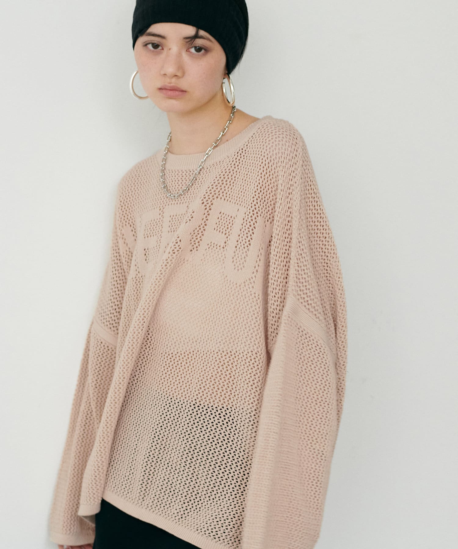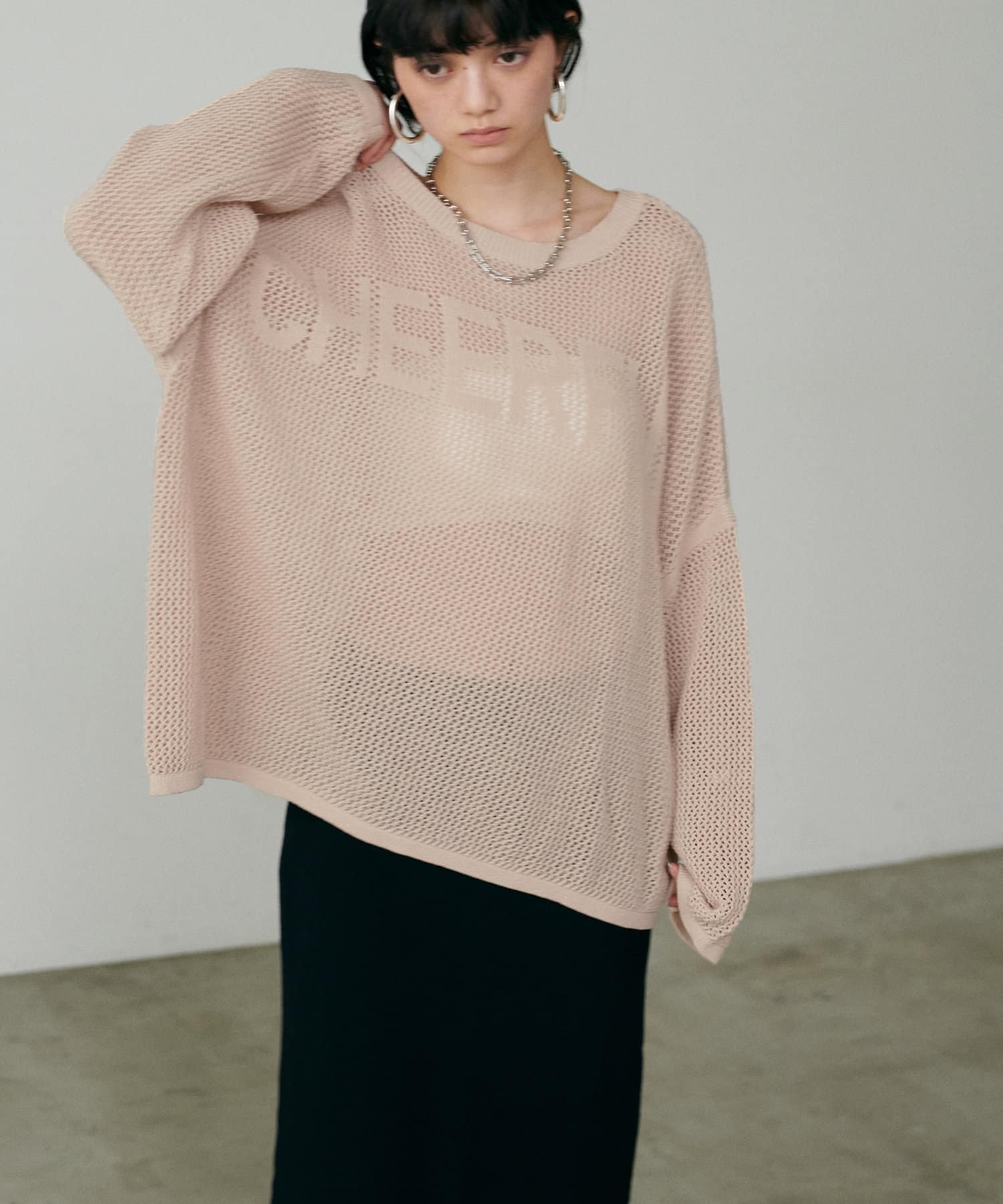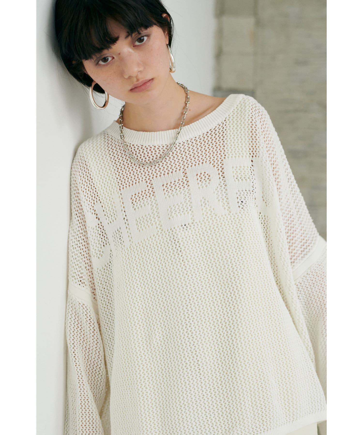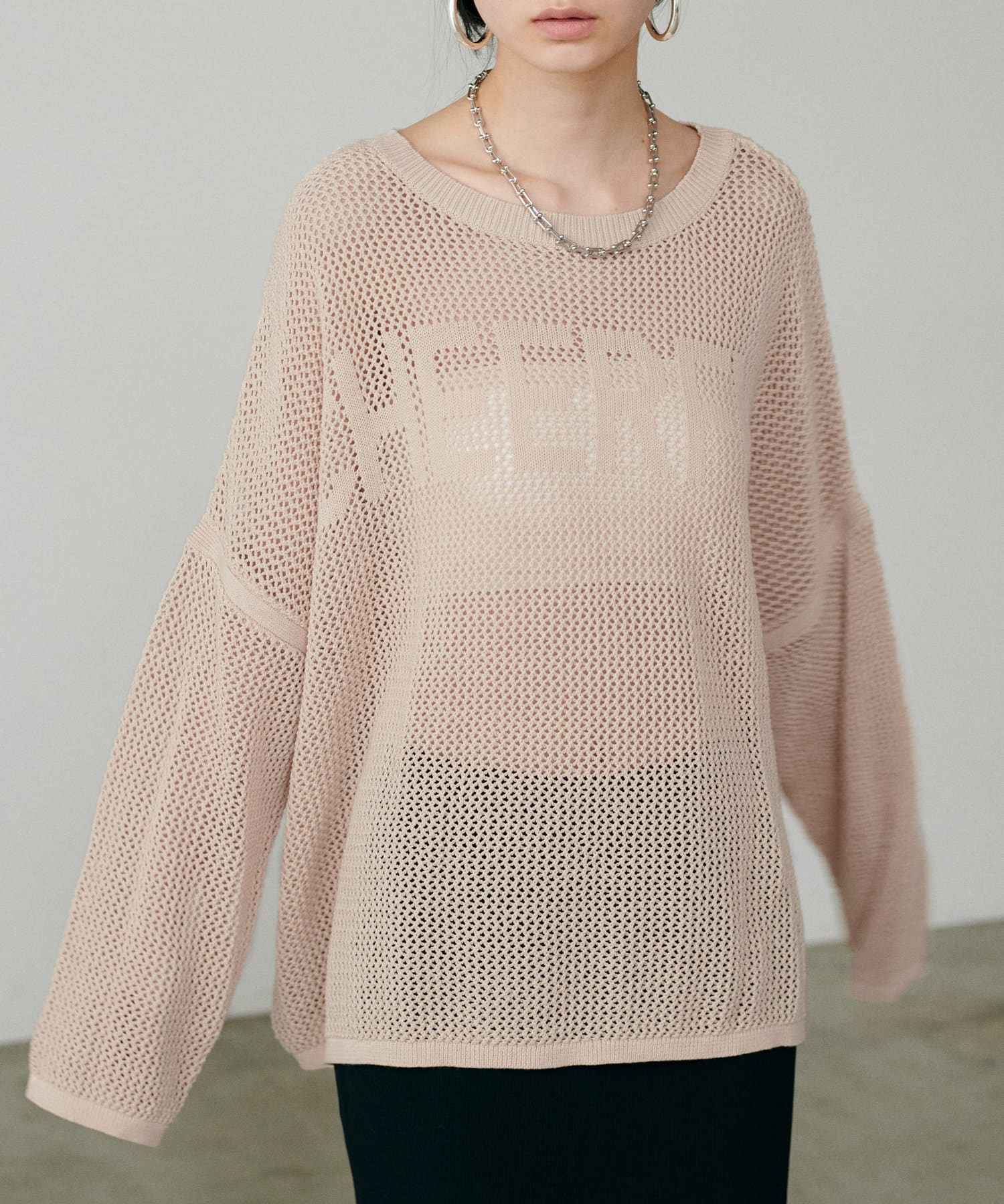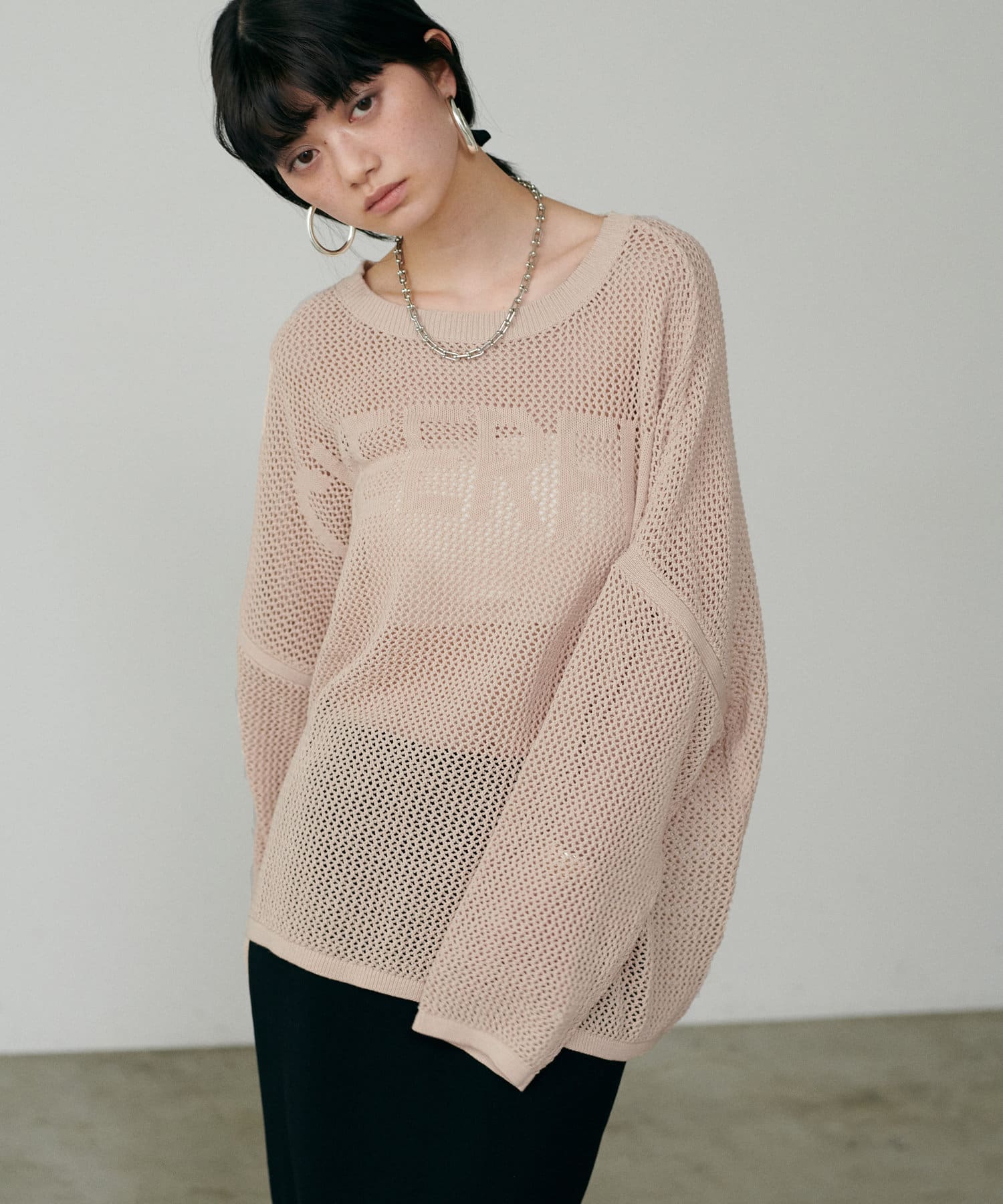 胸にロゴ刺繍入りのざっくりメッシュのニットプルオーバー。