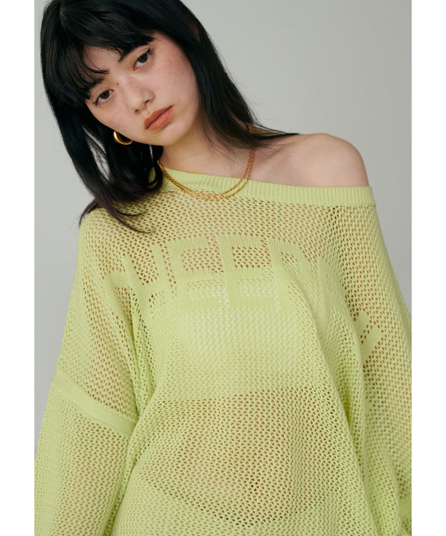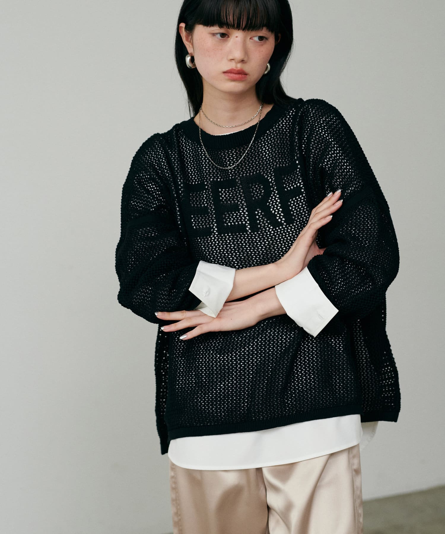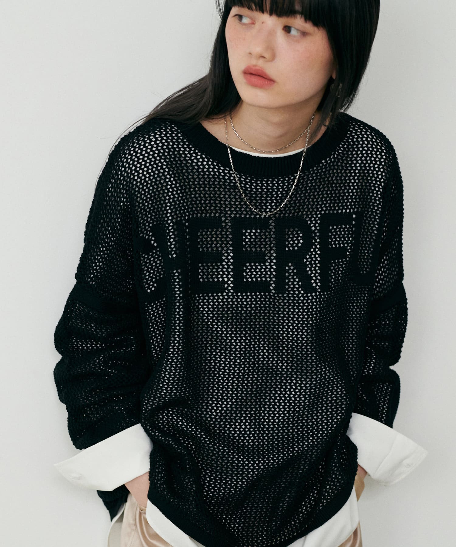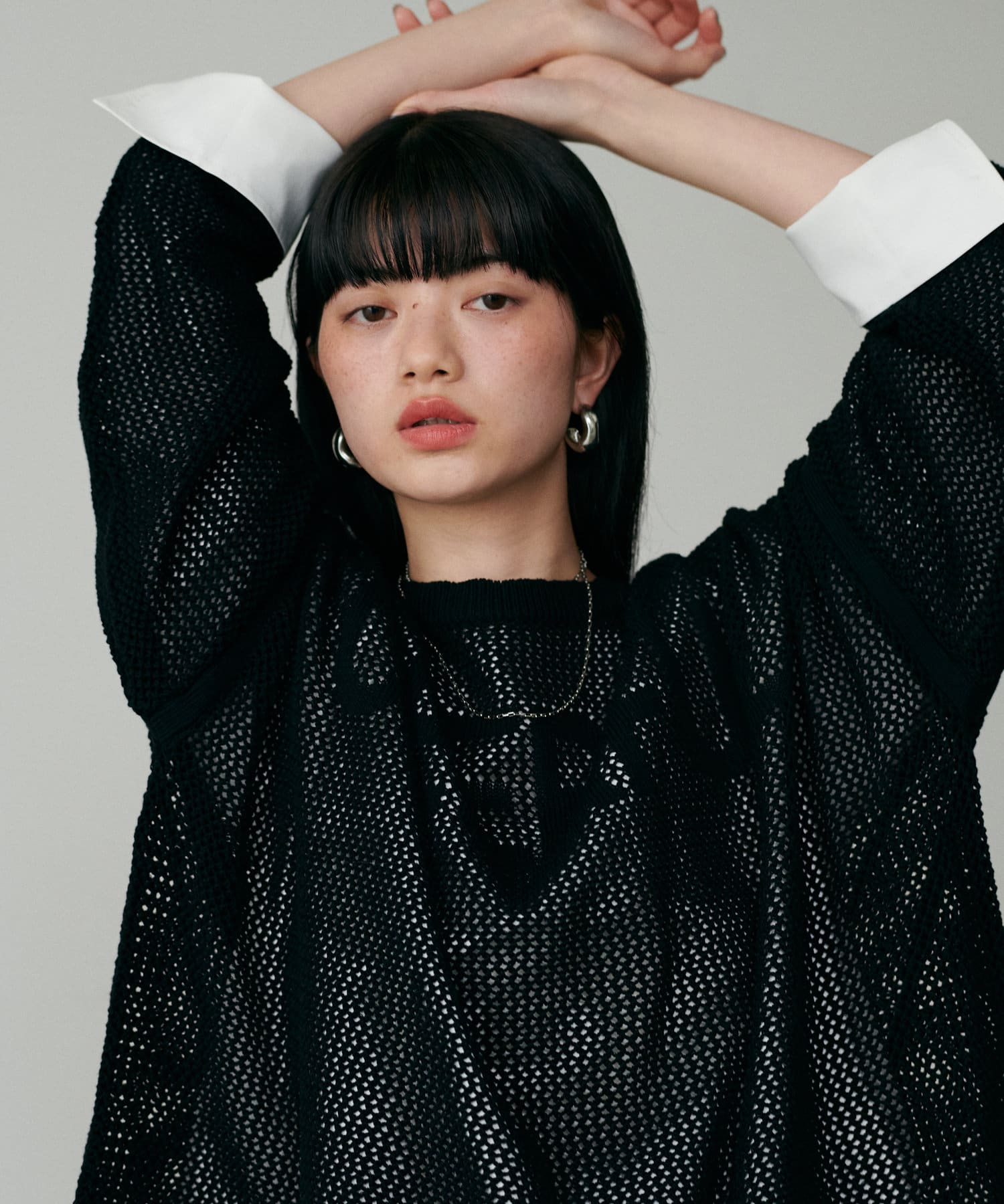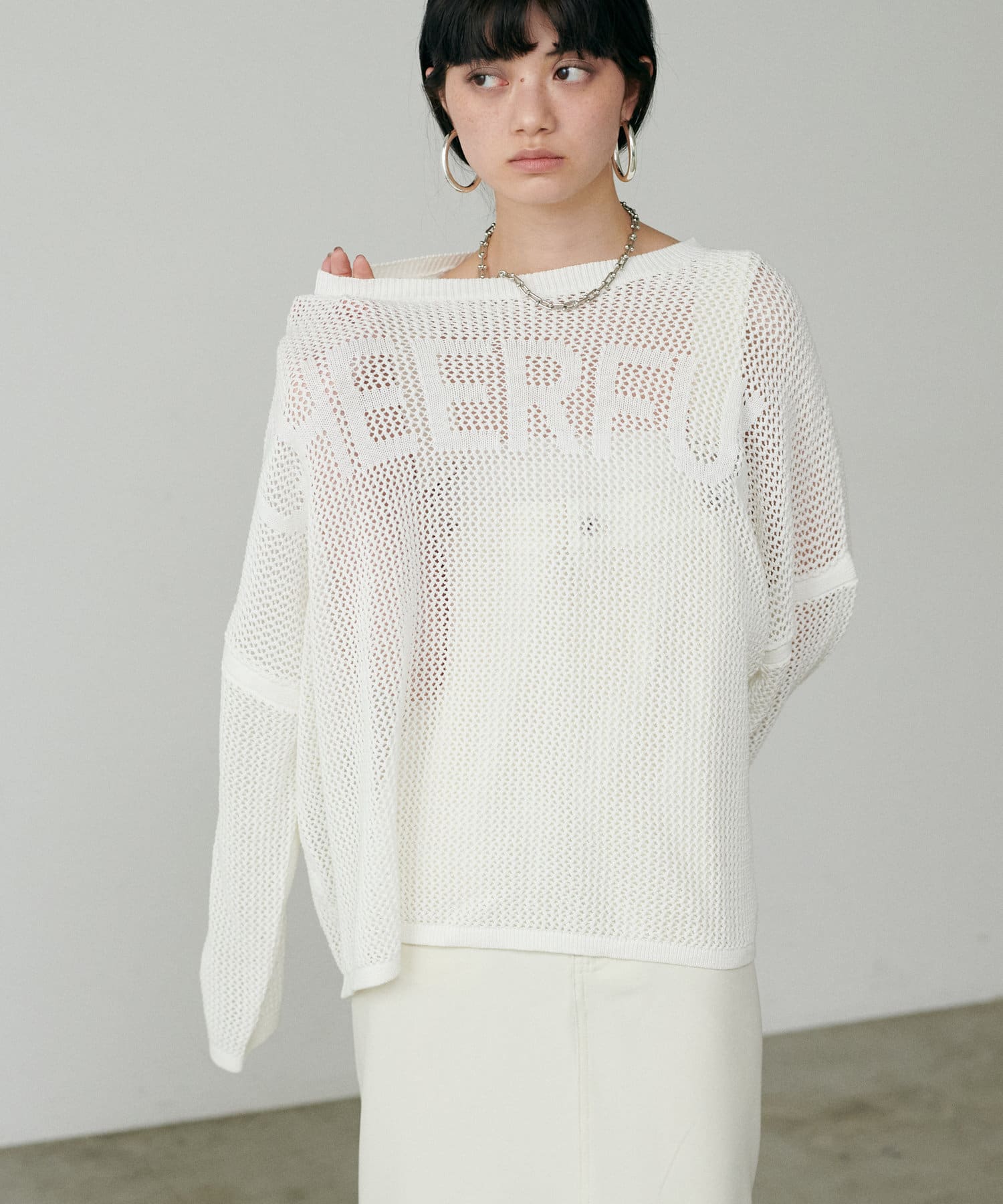 胸にロゴ刺繍入りのざっくりメッシュのニットプルオーバー。