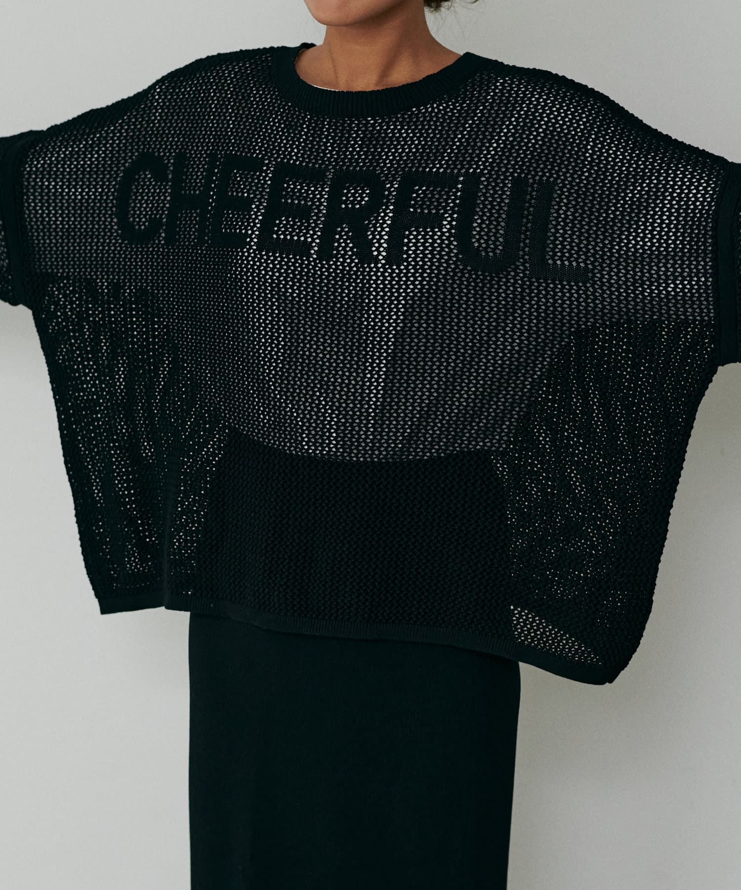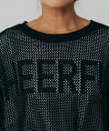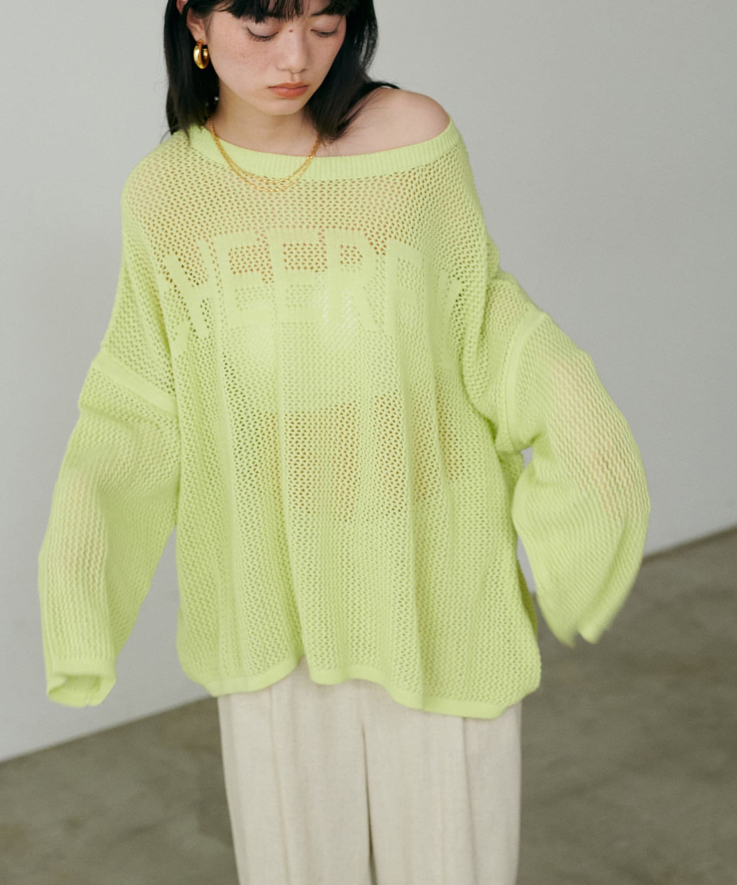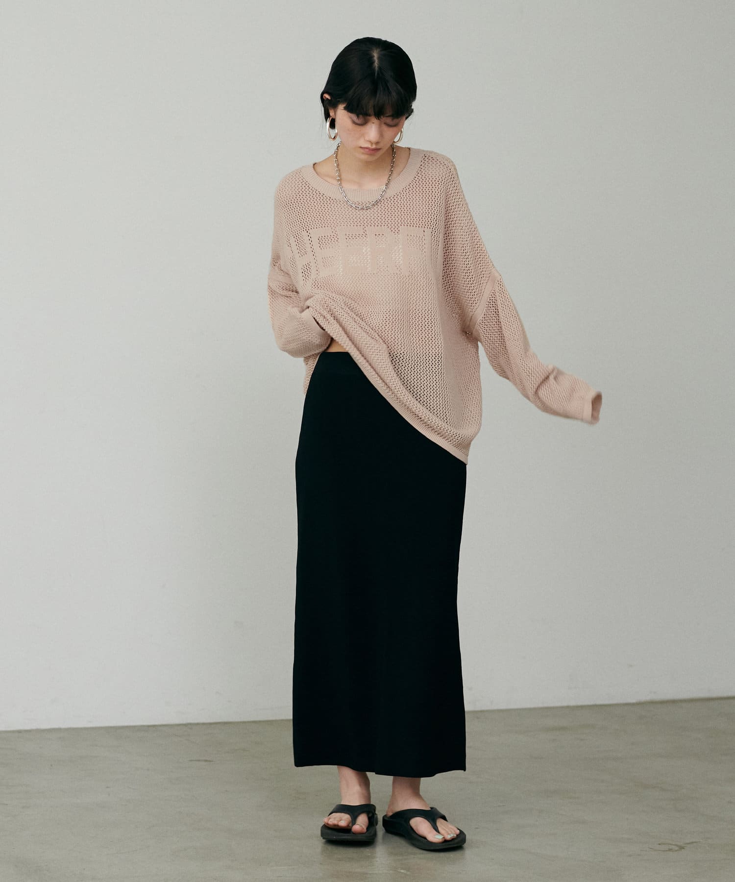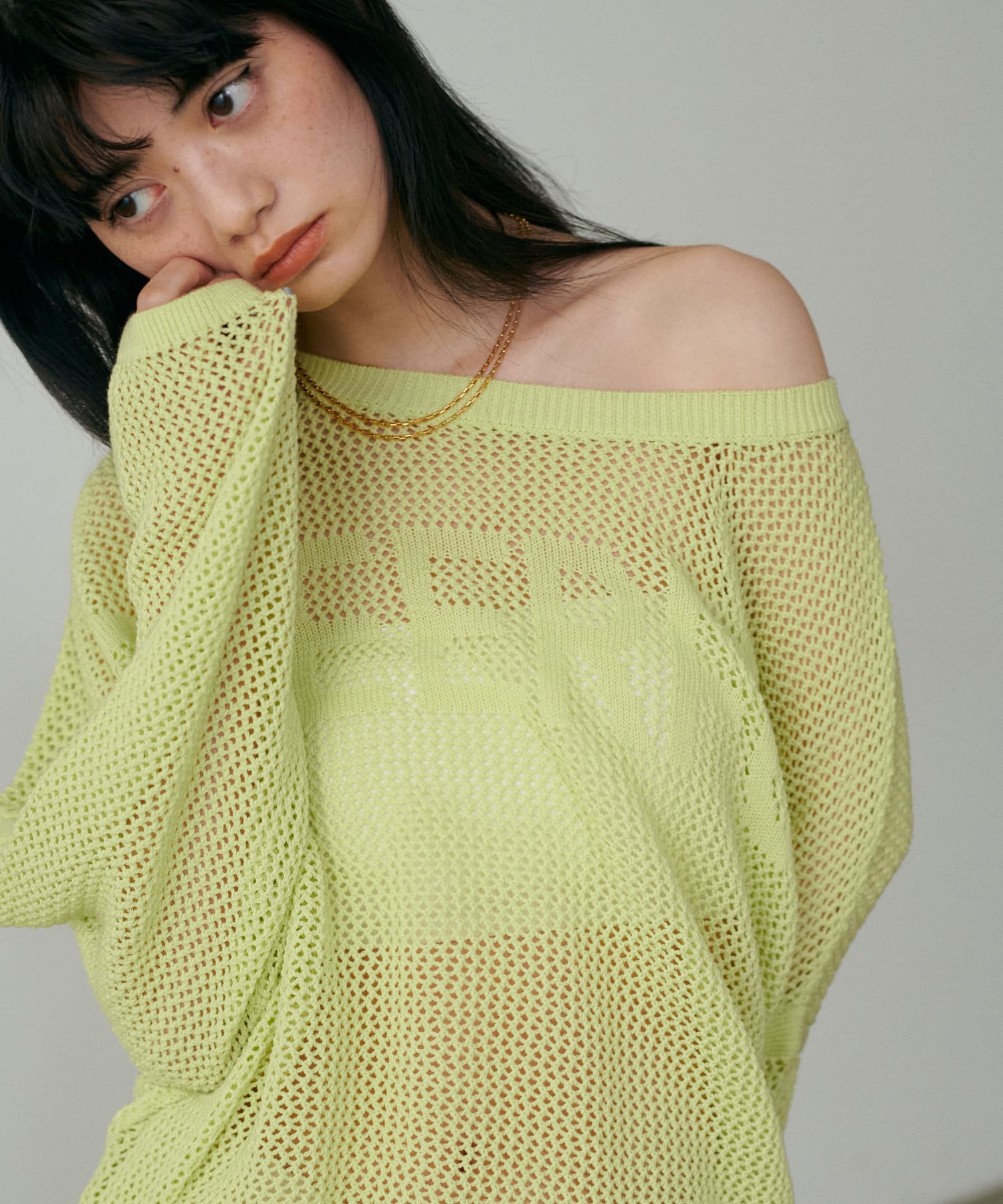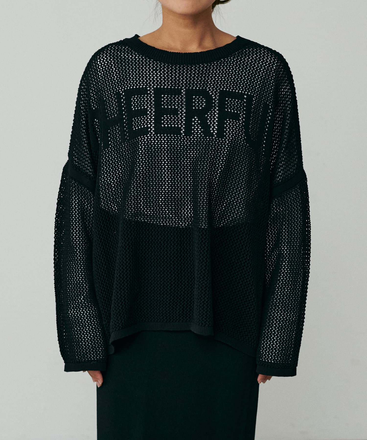 胸にロゴ刺繍入りのざっくりメッシュのニットプルオーバー。