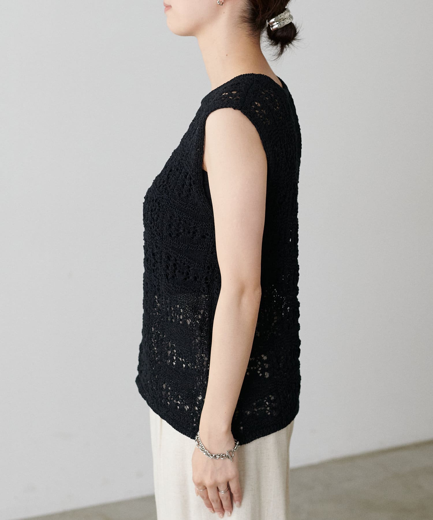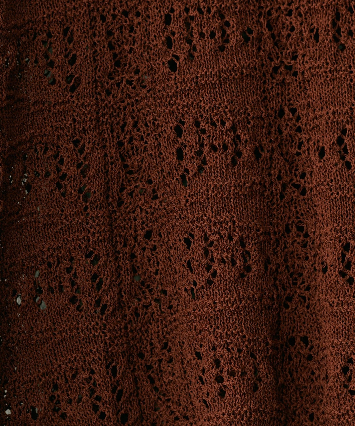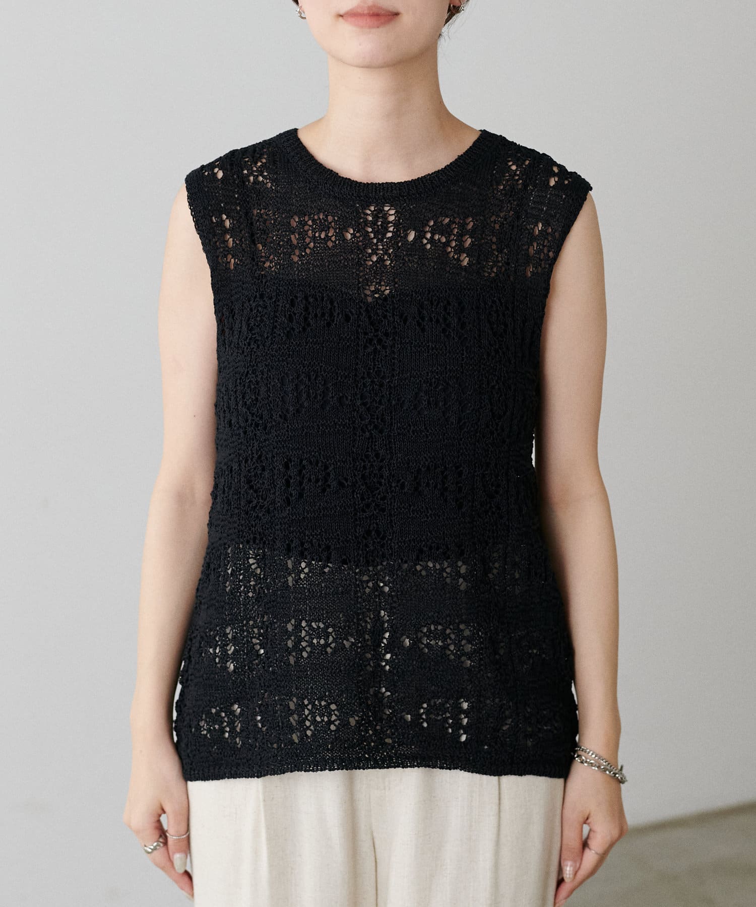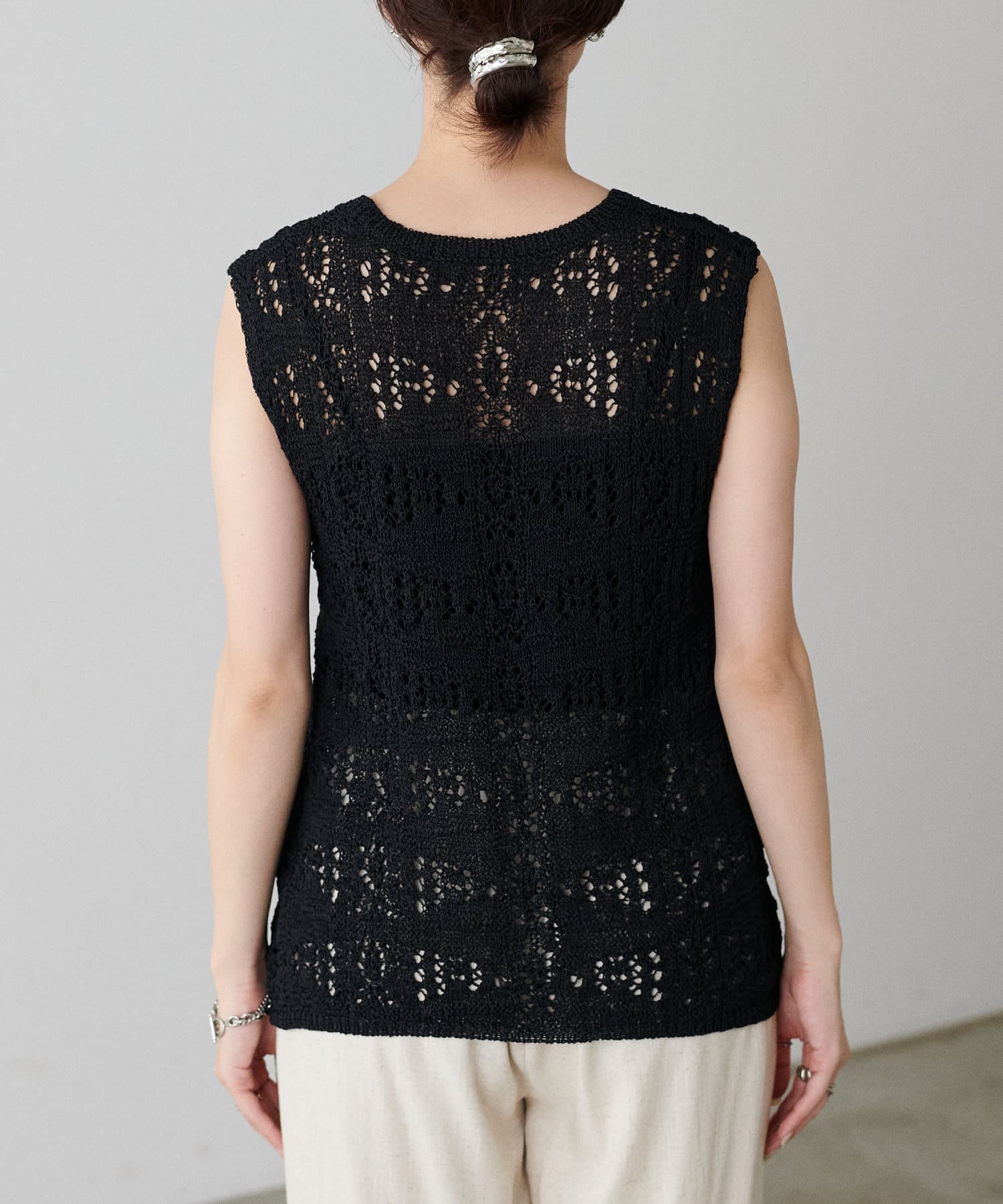 全体に施された繊細な透かし編みが、涼しげで軽やかな印象を与えます。