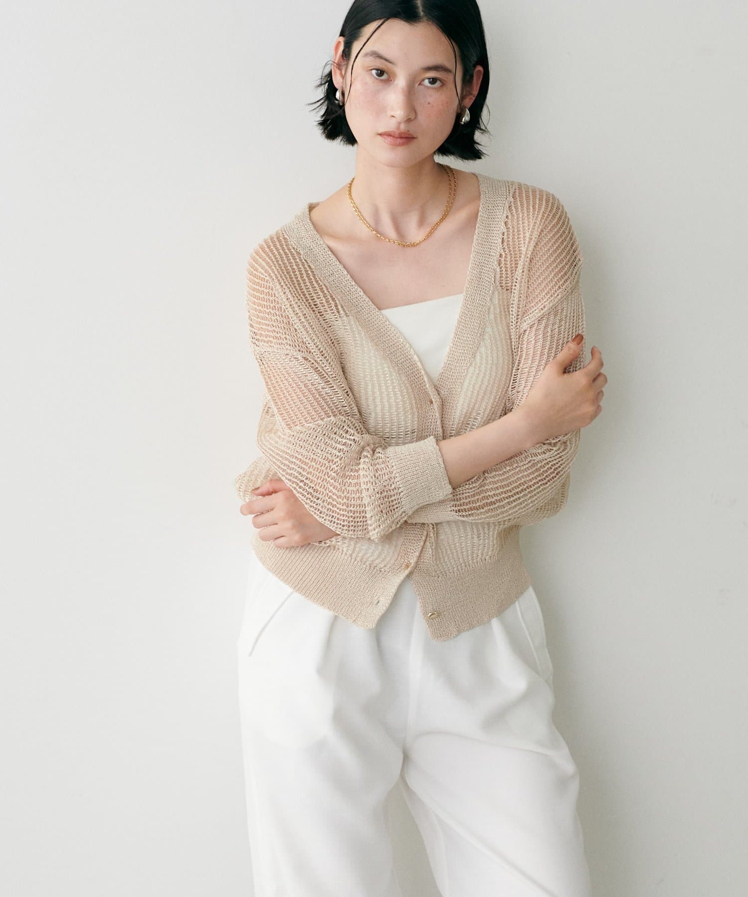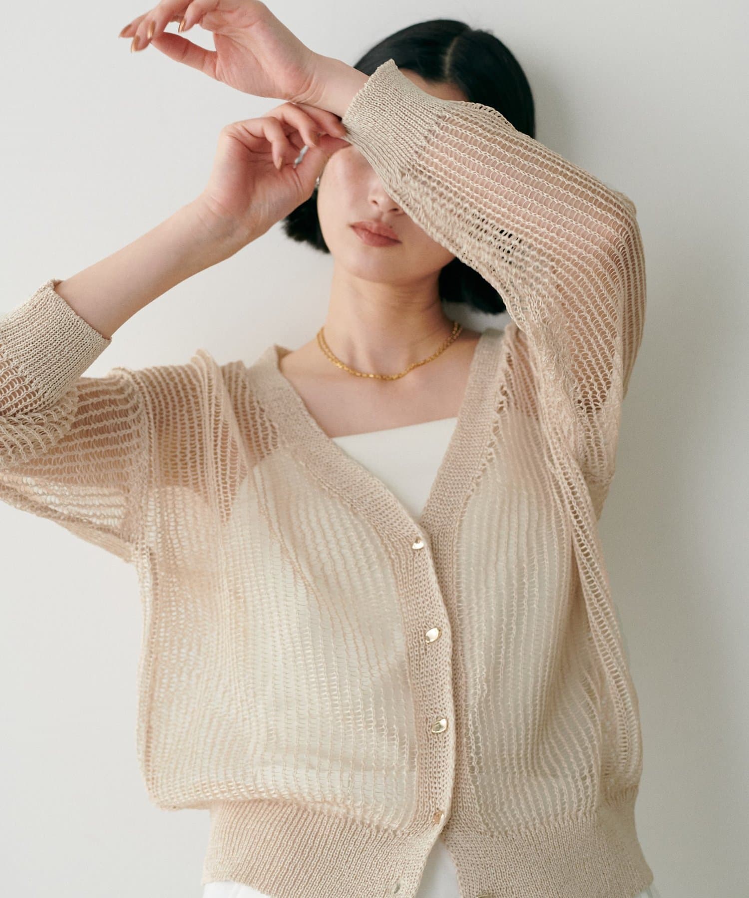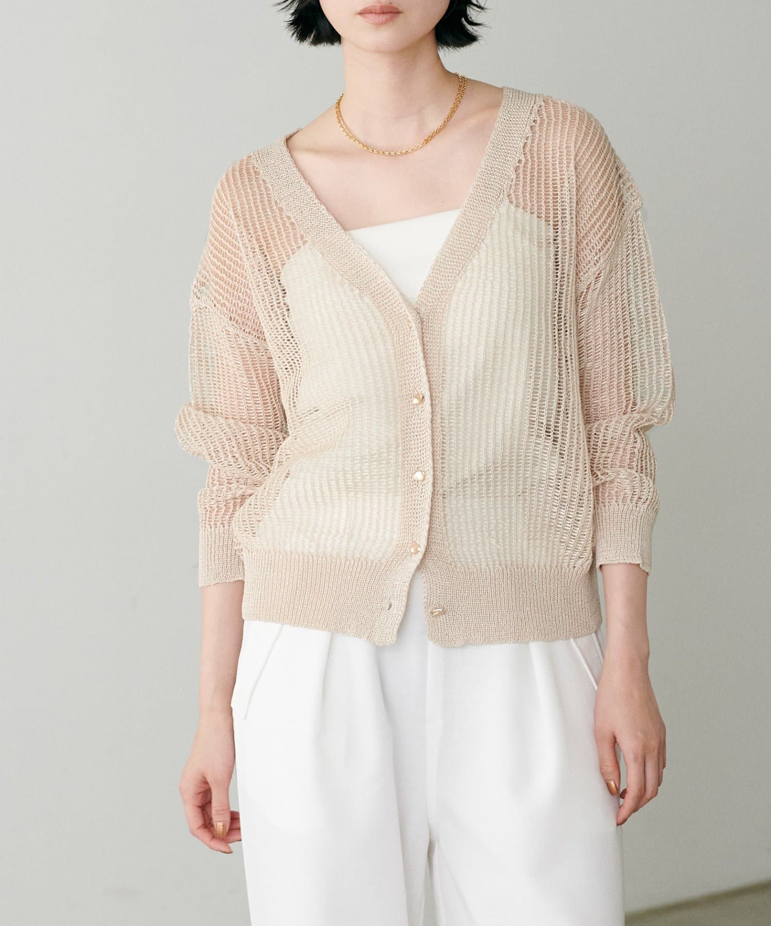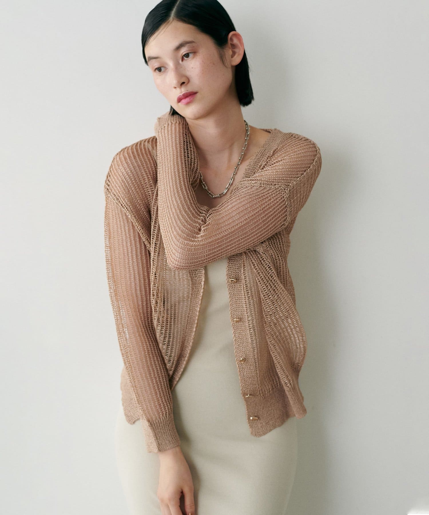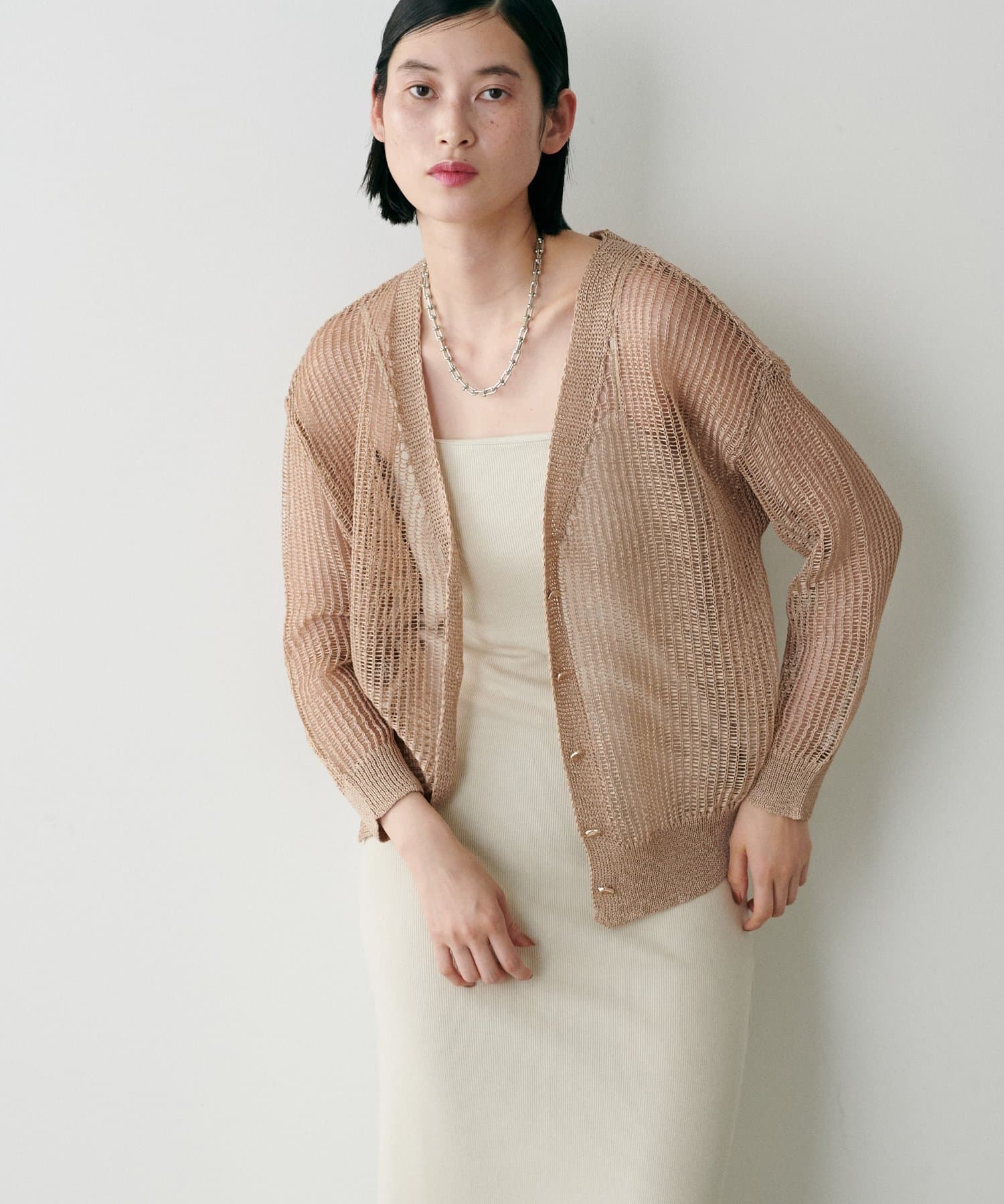 透け感のある編み地が、涼しげで軽やかな印象を与えてくれるカーディガン。