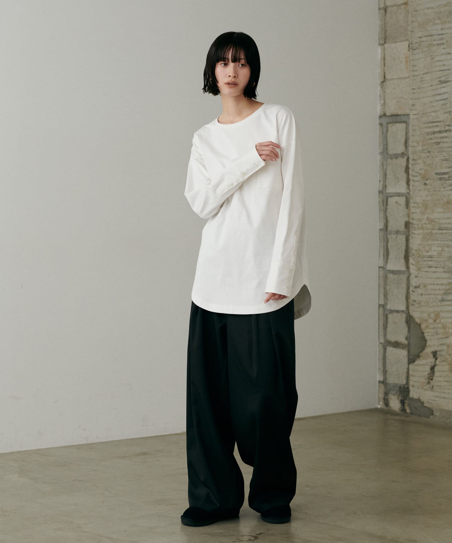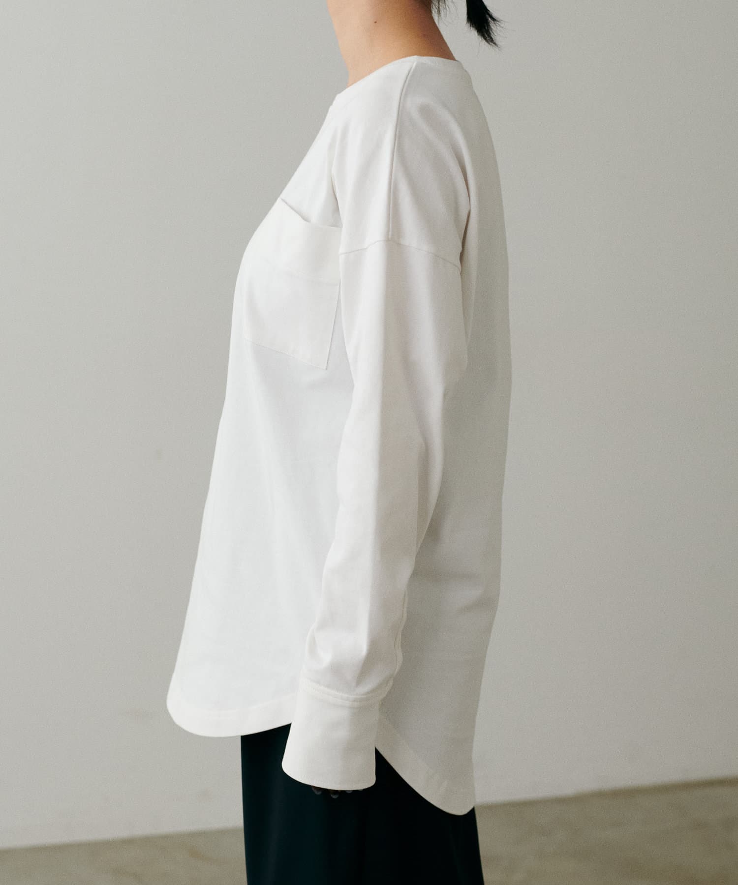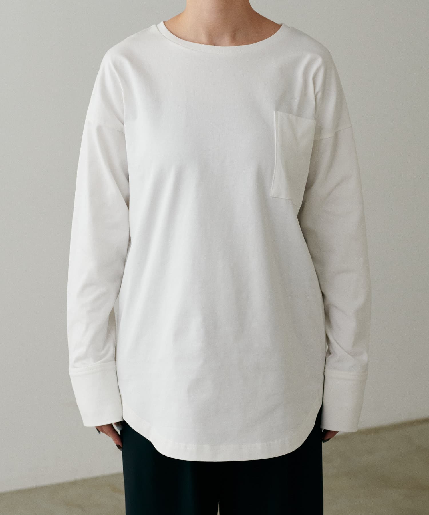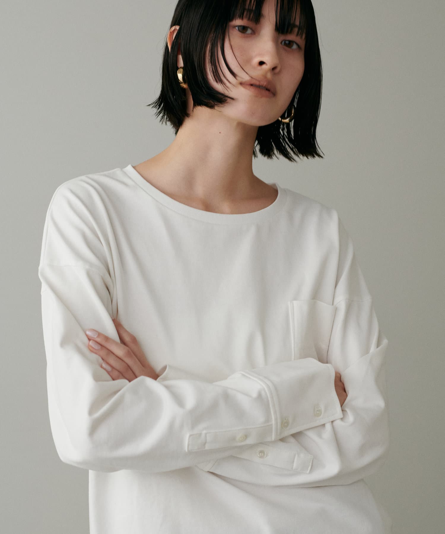 白色のロンT1枚あれば年中着回せる、けど他と違うのは袖口のカフス風のデザイン。重ね着したらおしゃれ感が出る。首が詰まってない襟元ゆったりめ丸首から鎖骨がちらっとみえるヘルシーでフェミニン感もある。身幅にもゆとりあり。やや厚めのコットン生地だからガサッとした肌触りがあるかも、洗うごとに馴染んでくるかな。胸元のポケット付きで1枚で着れるロンT。