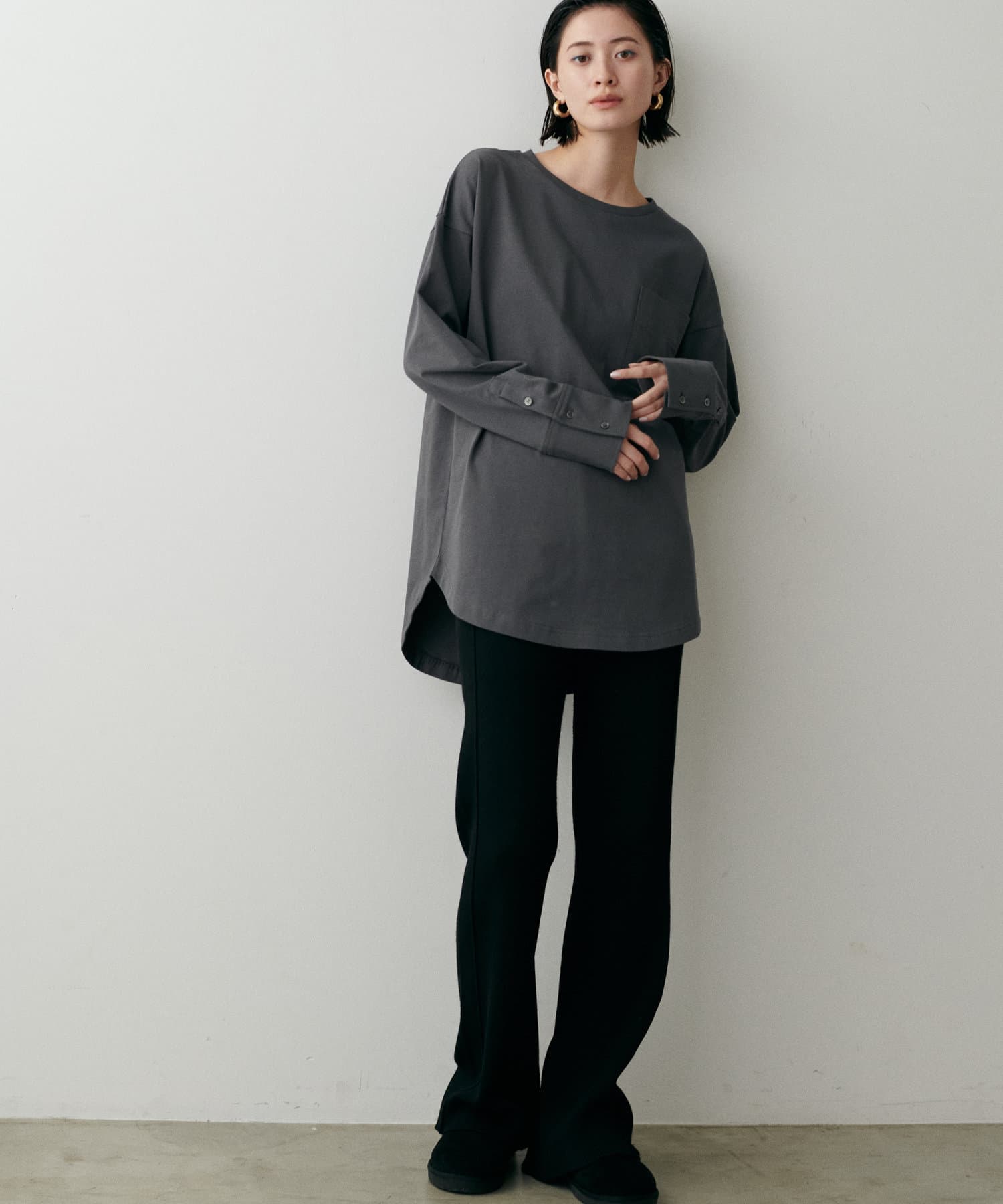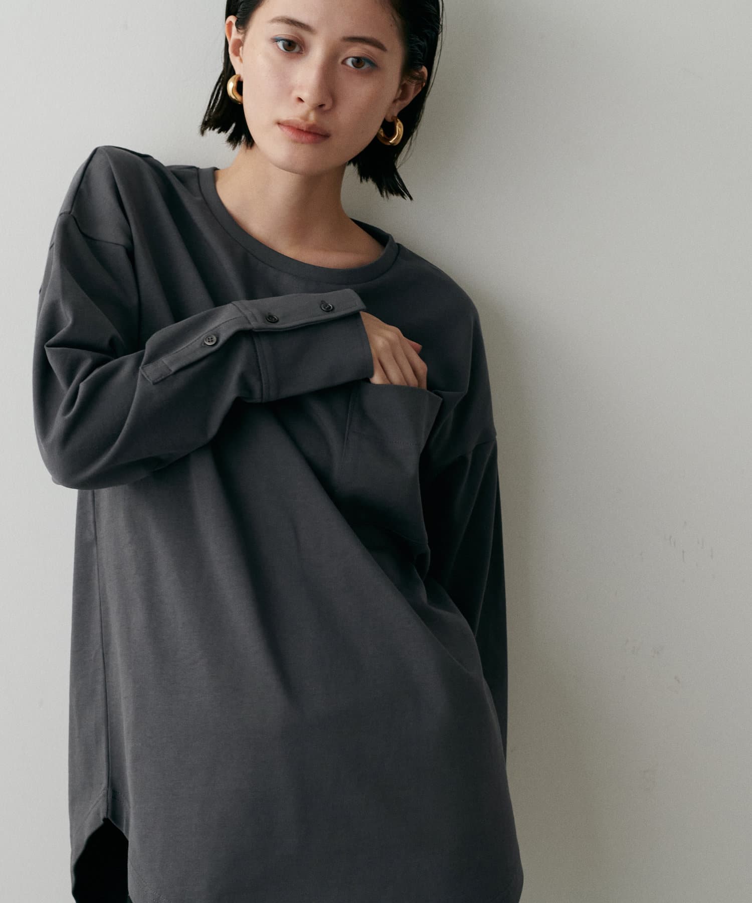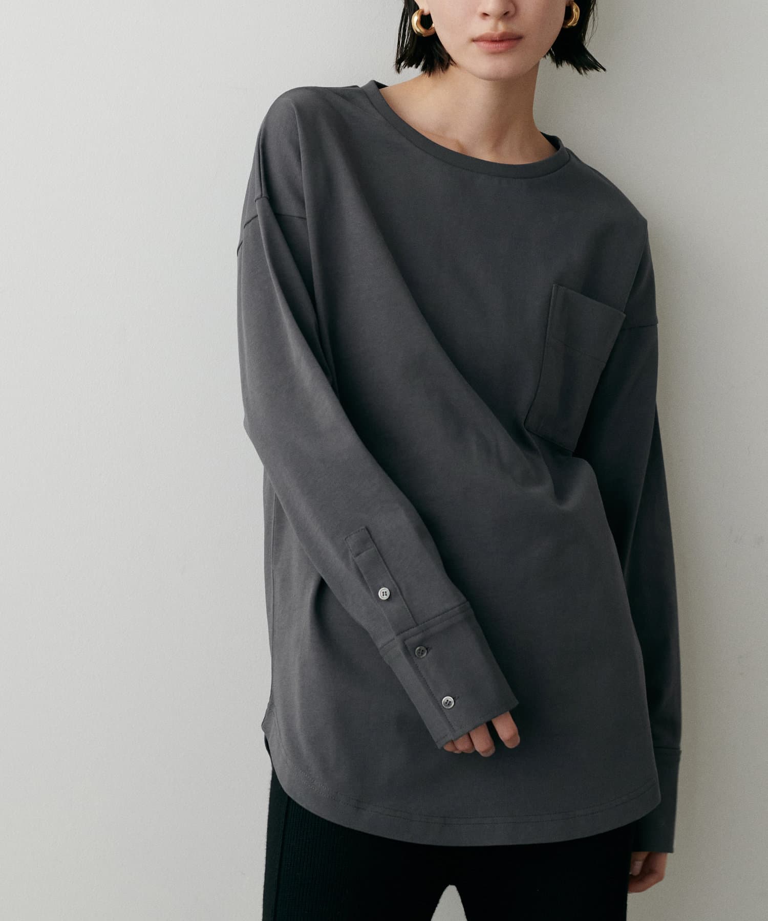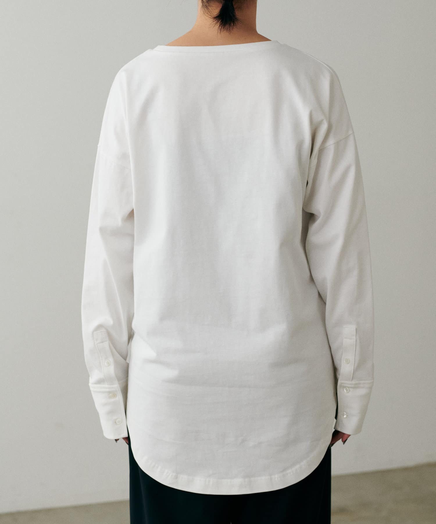 白色のロンT1枚あれば年中着回せる、けど他と違うのは袖口のカフス風のデザイン。重ね着したらおしゃれ感が出る。首が詰まってない襟元ゆったりめ丸首から鎖骨がちらっとみえるヘルシーでフェミニン感もある。身幅にもゆとりあり。やや厚めのコットン生地だからガサッとした肌触りがあるかも、洗うごとに馴染んでくるかな。胸元のポケット付きで1枚で着れるロンT。
