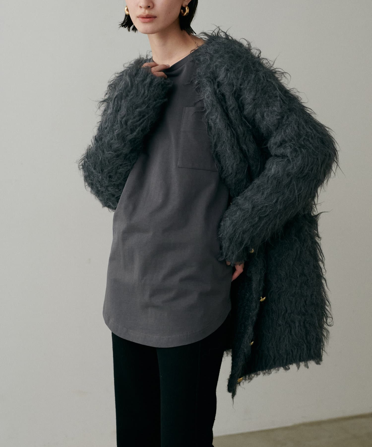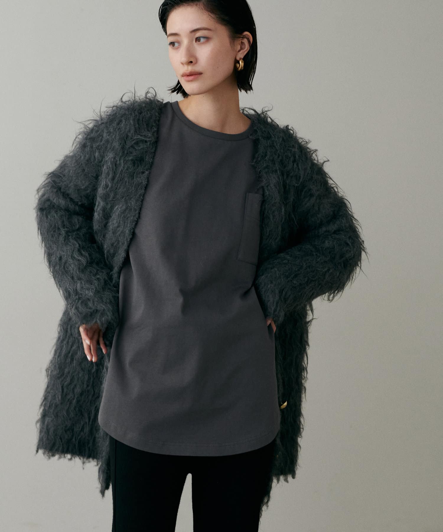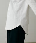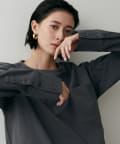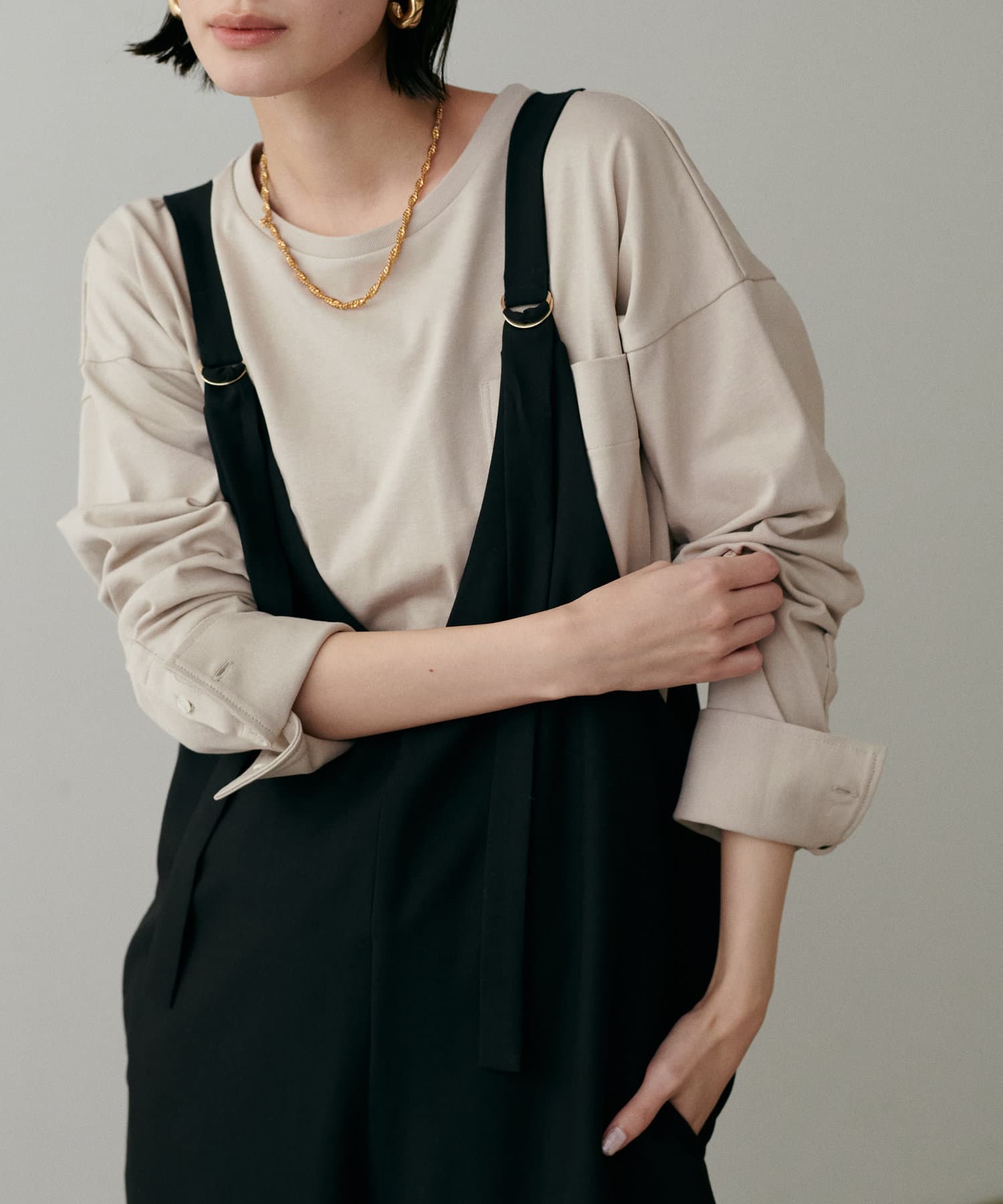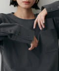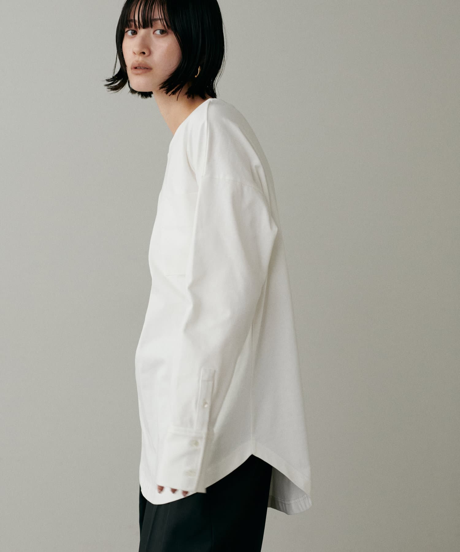 白色のロンT1枚あれば年中着回せる、けど他と違うのは袖口のカフス風のデザイン。重ね着したらおしゃれ感が出る。首が詰まってない襟元ゆったりめ丸首から鎖骨がちらっとみえるヘルシーでフェミニン感もある。身幅にもゆとりあり。やや厚めのコットン生地だからガサッとした肌触りがあるかも、洗うごとに馴染んでくるかな。胸元のポケット付きで1枚で着れるロンT。