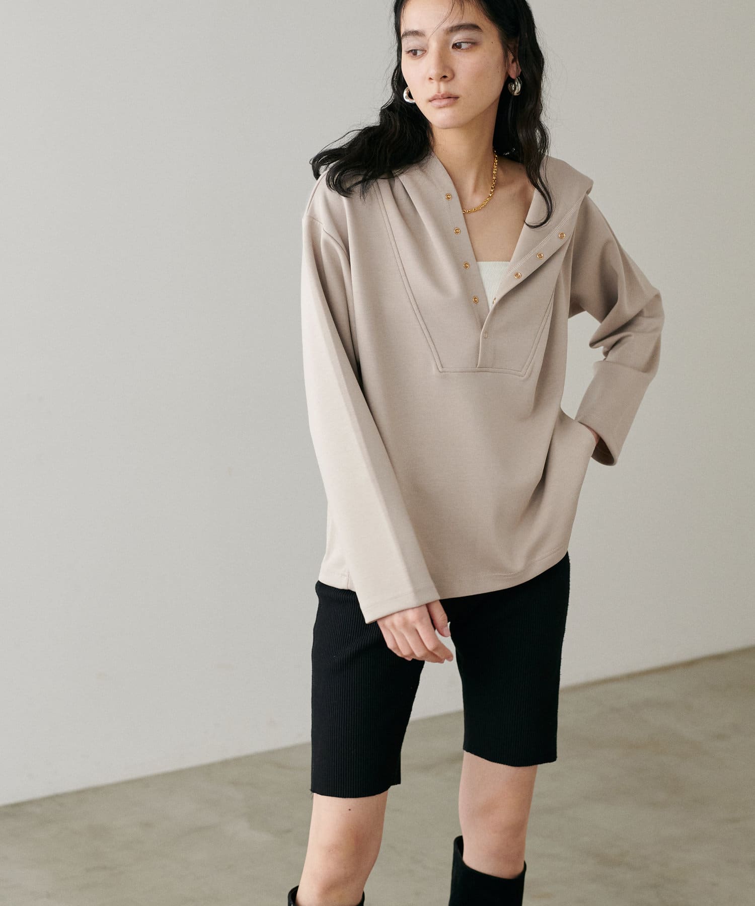 インナーにハイネックやシアーカットソーをお召いただいて