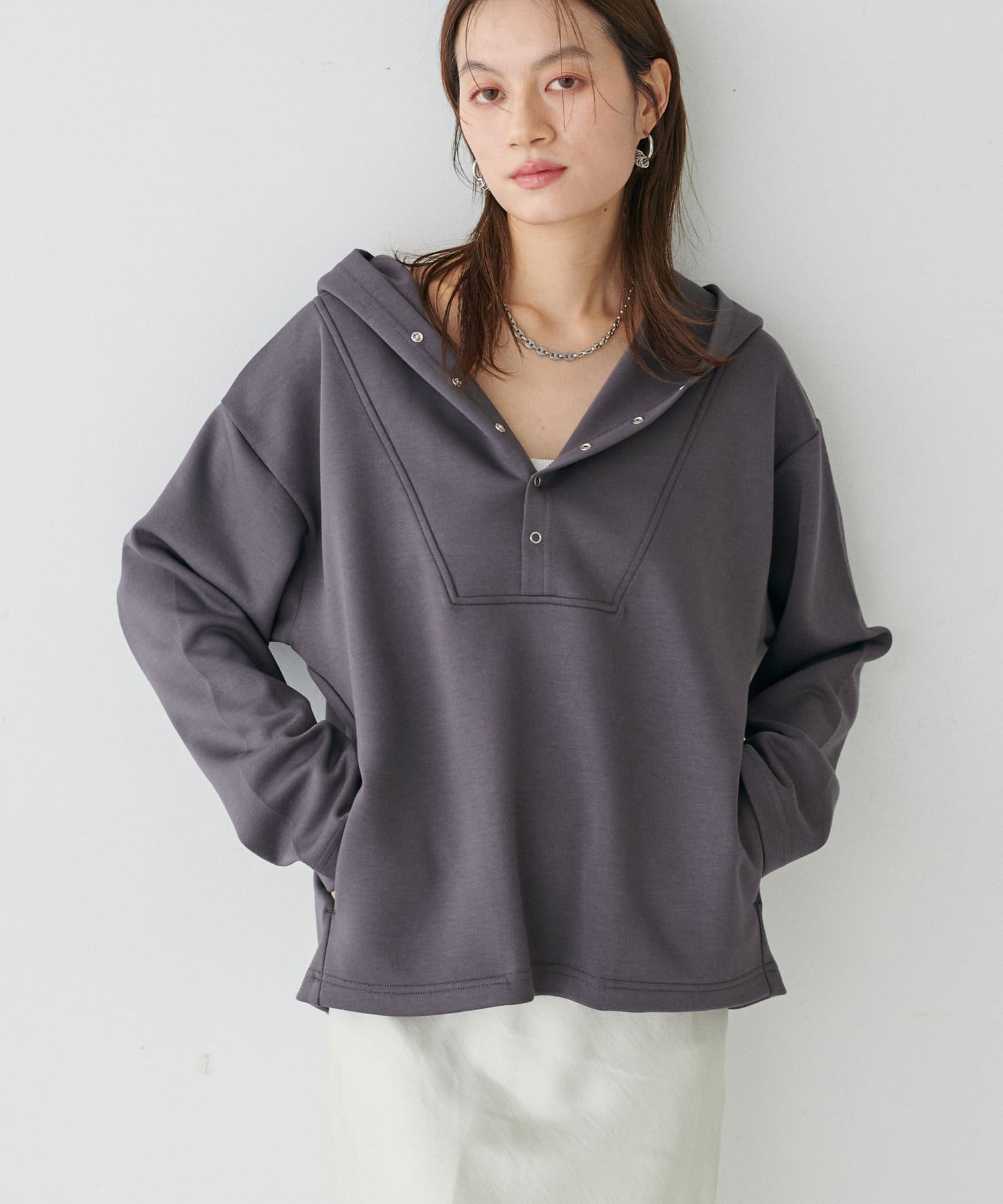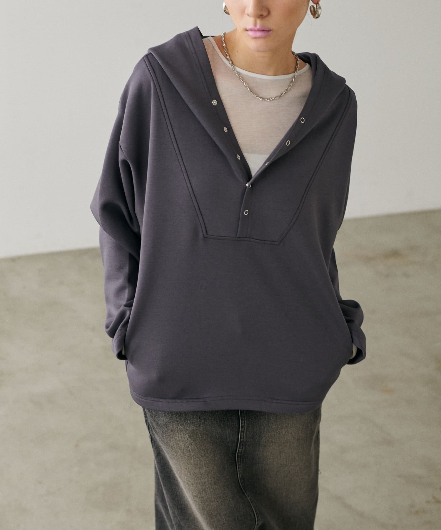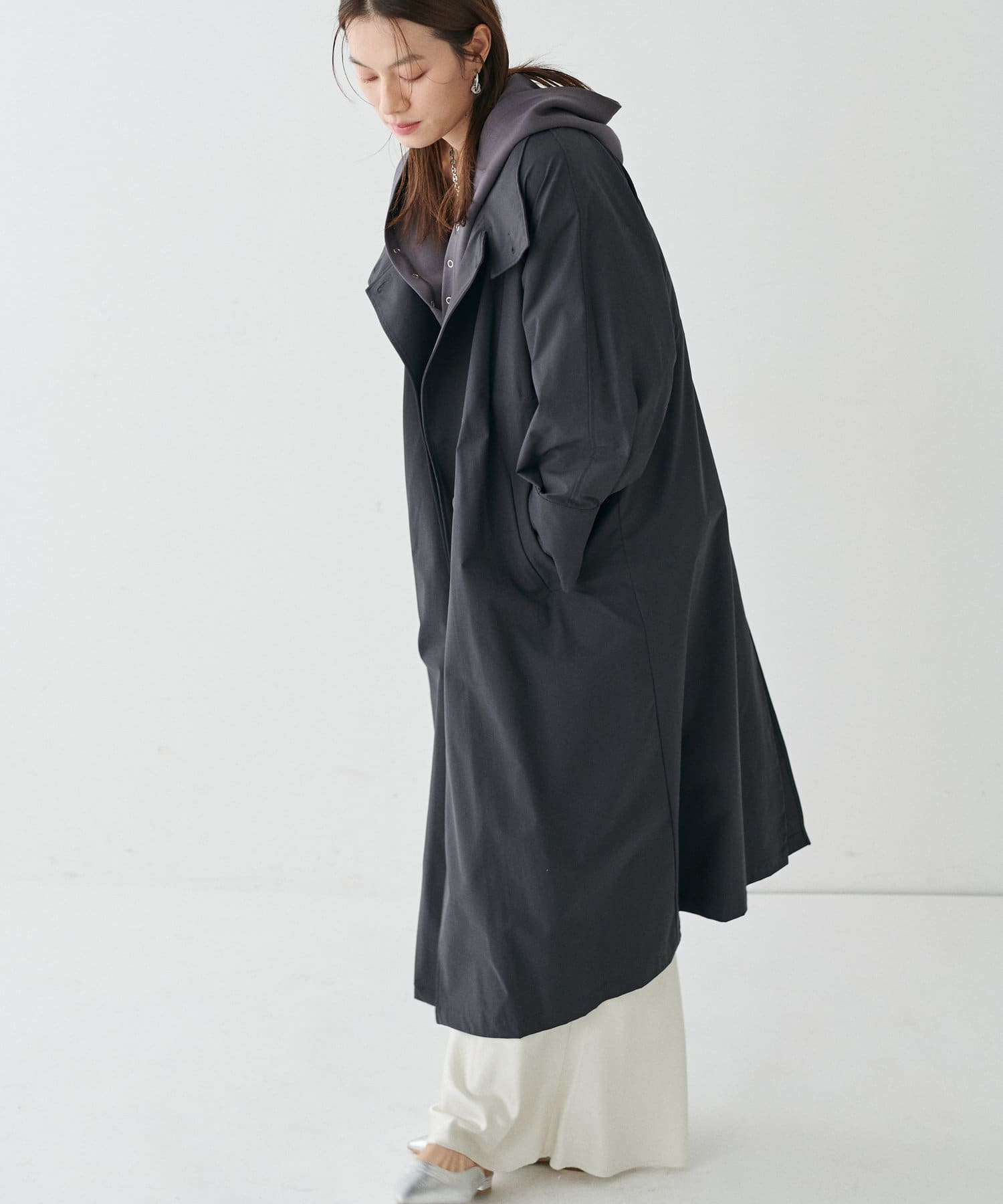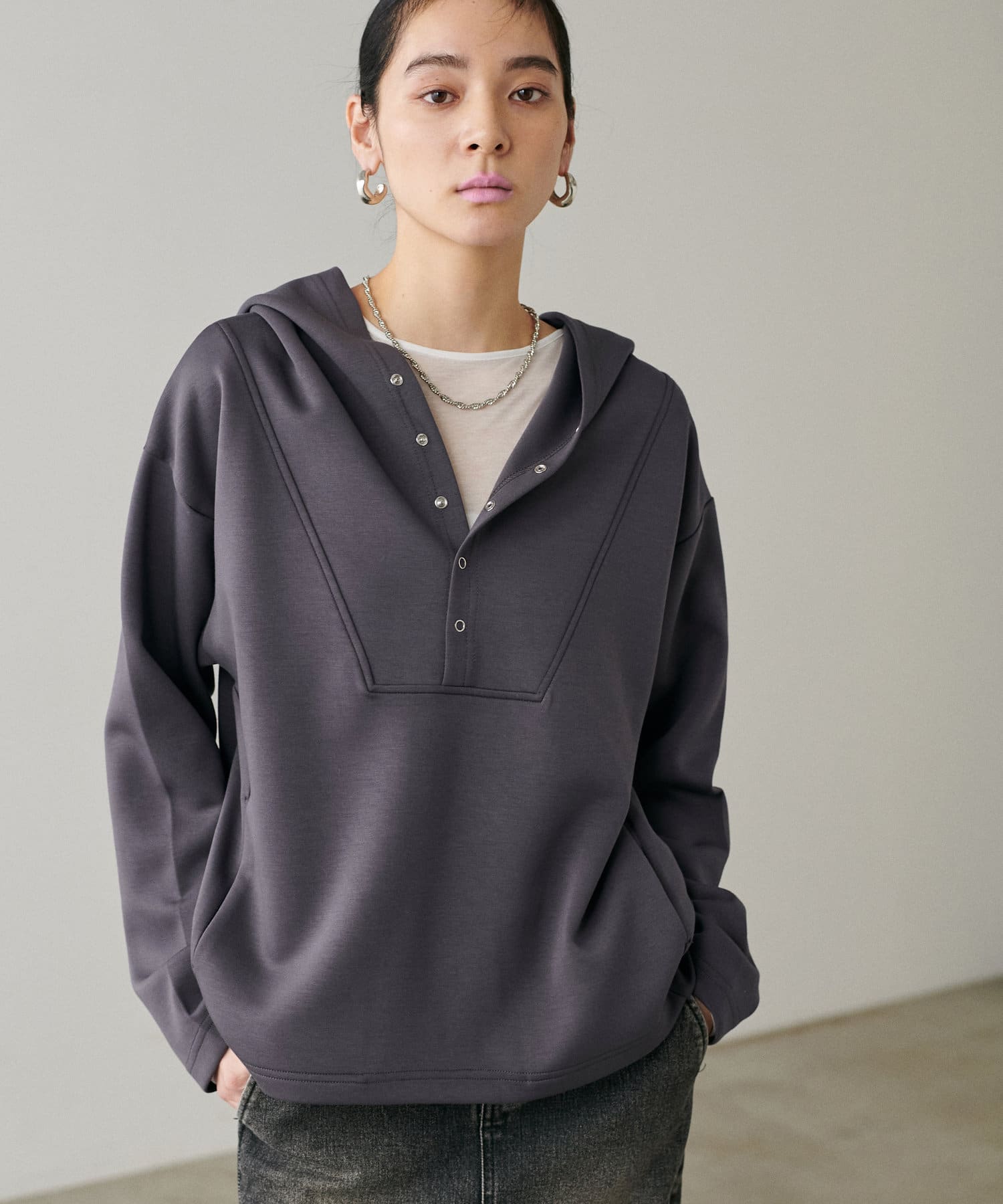 素材の特性を生かした大きめのフードや