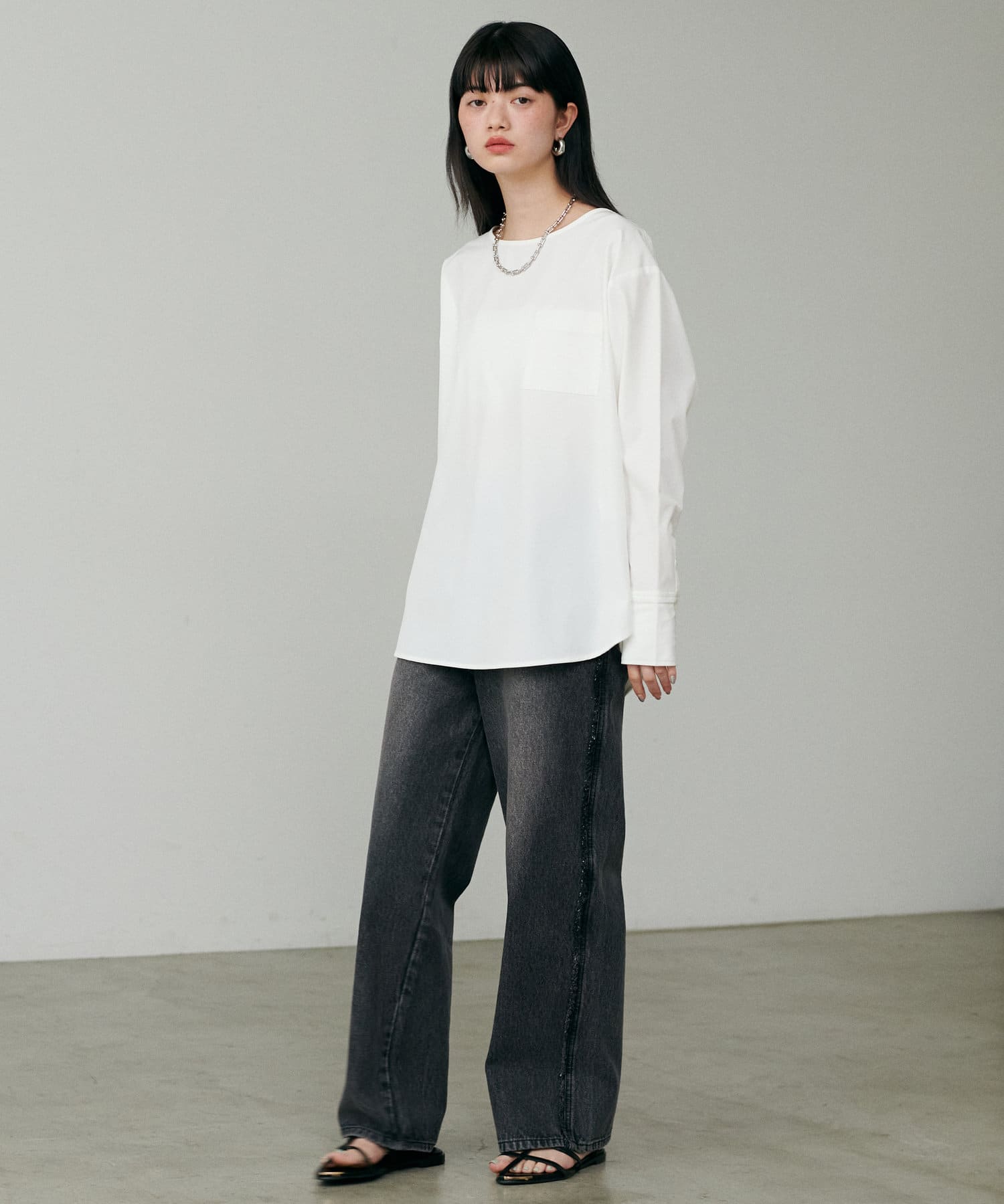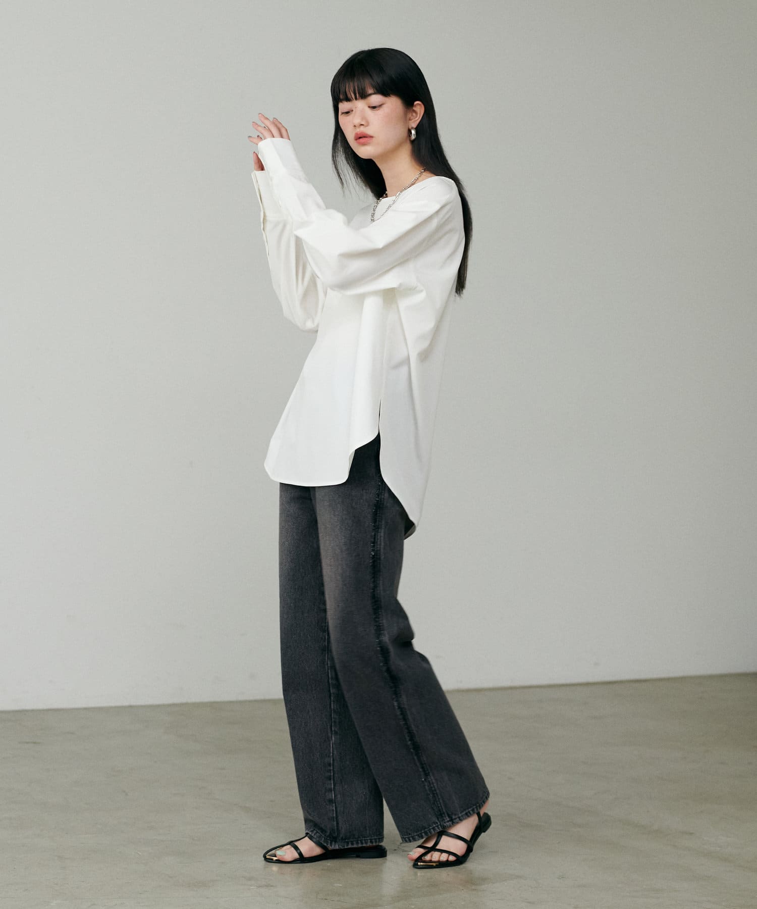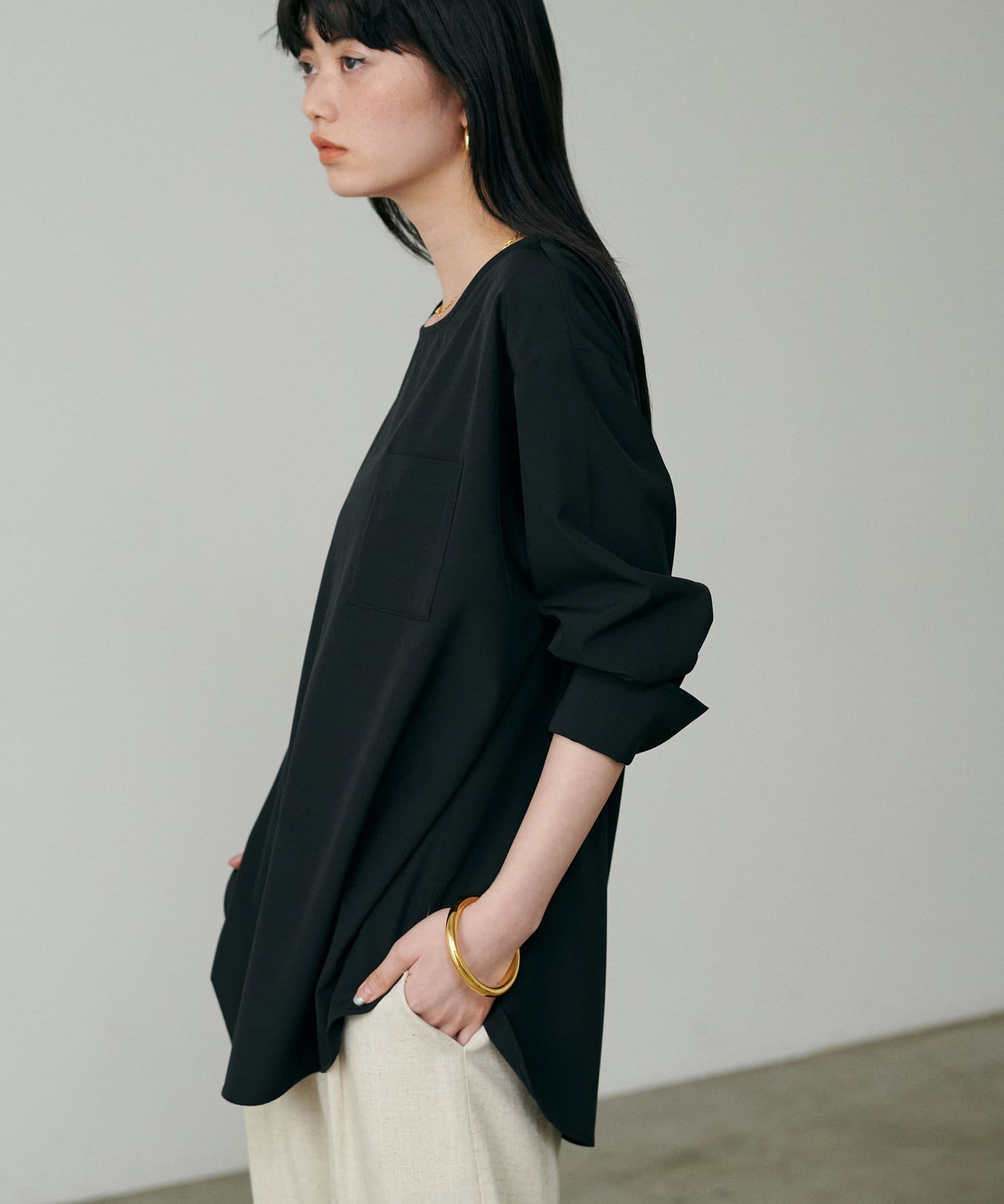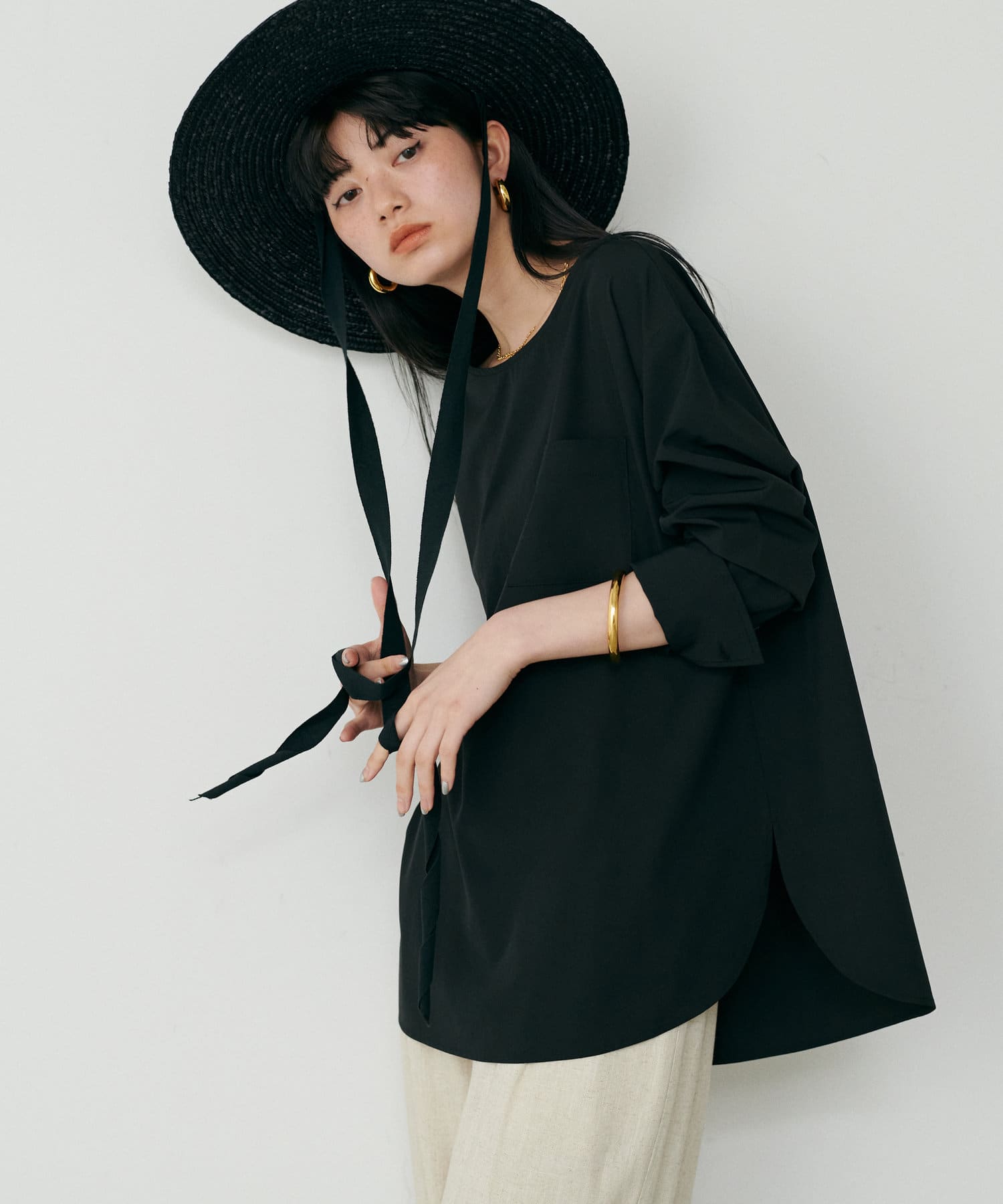 お尻が隠れる長めの丈感と裾のラウンドカットが