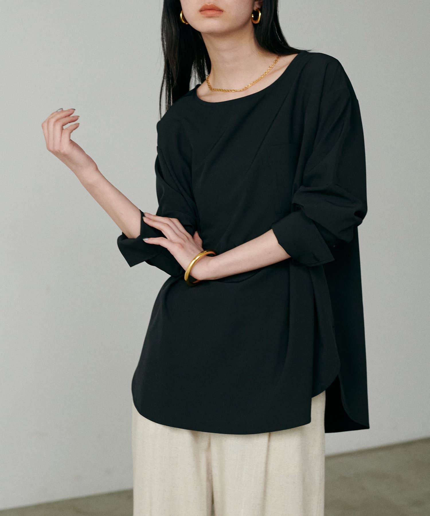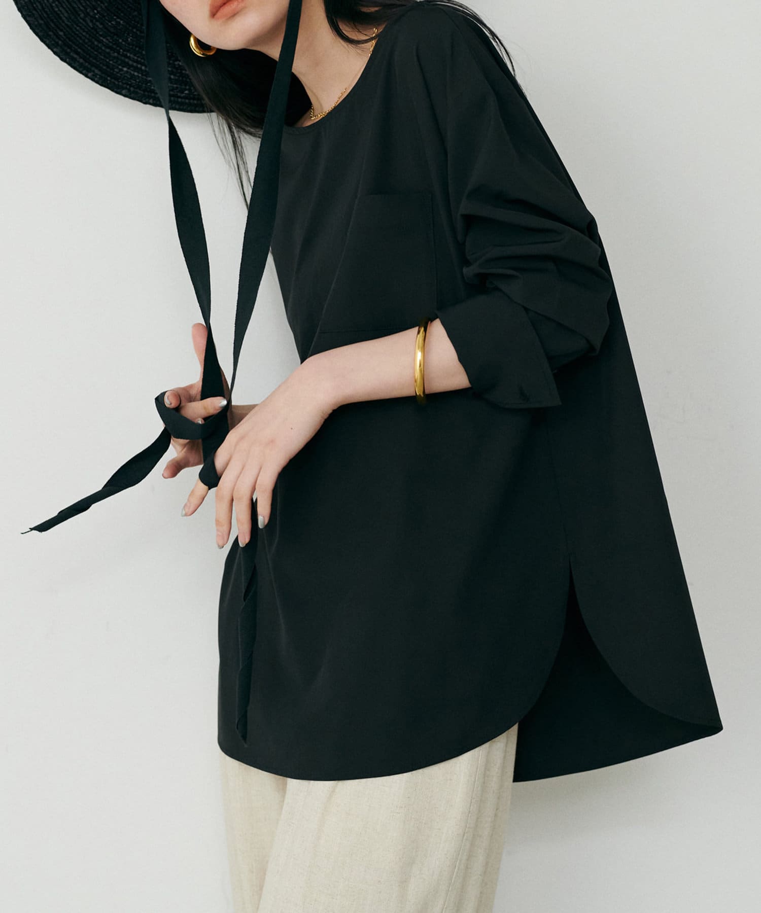お尻が隠れる長めの丈感と裾のラウンドカットが