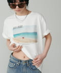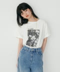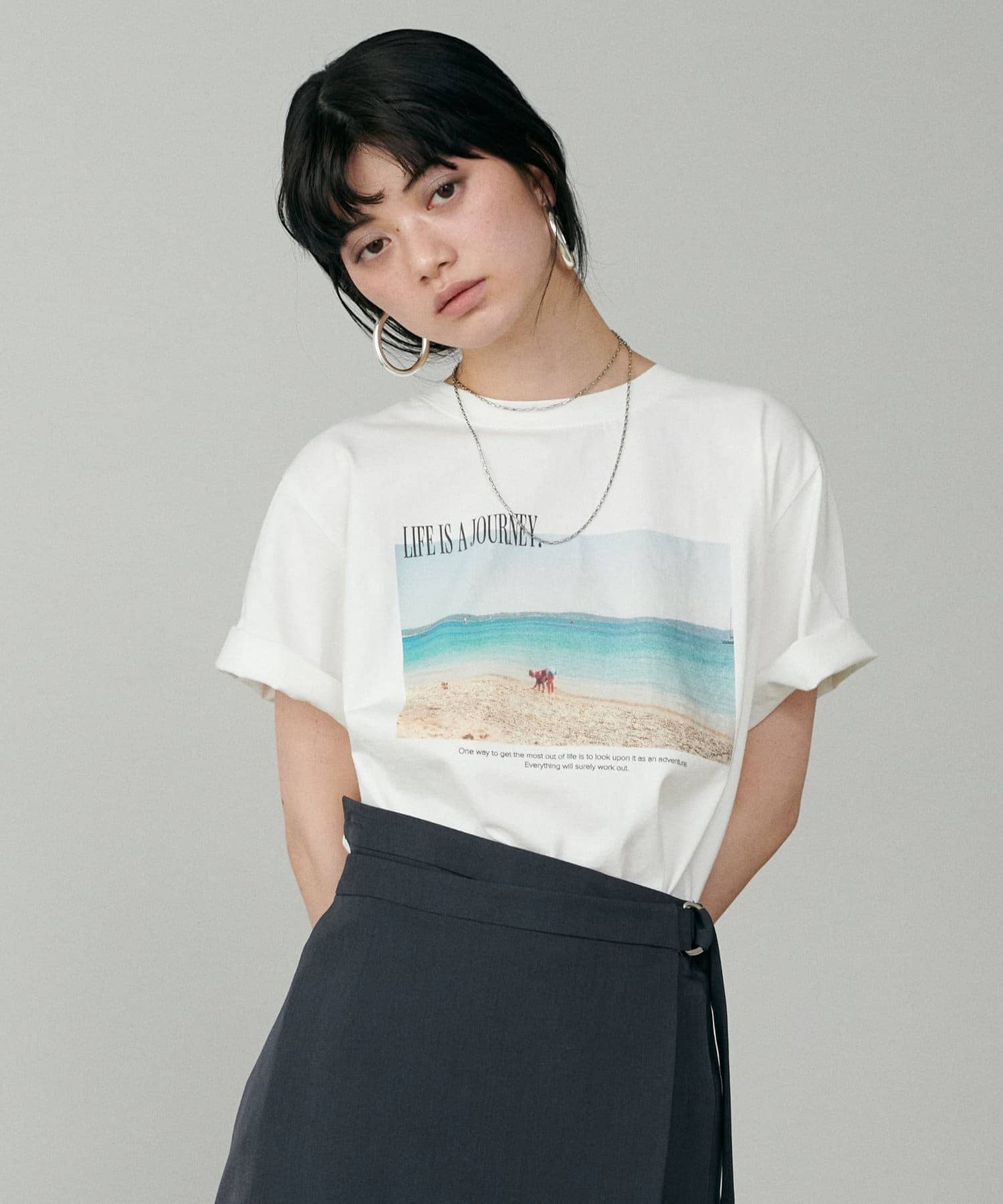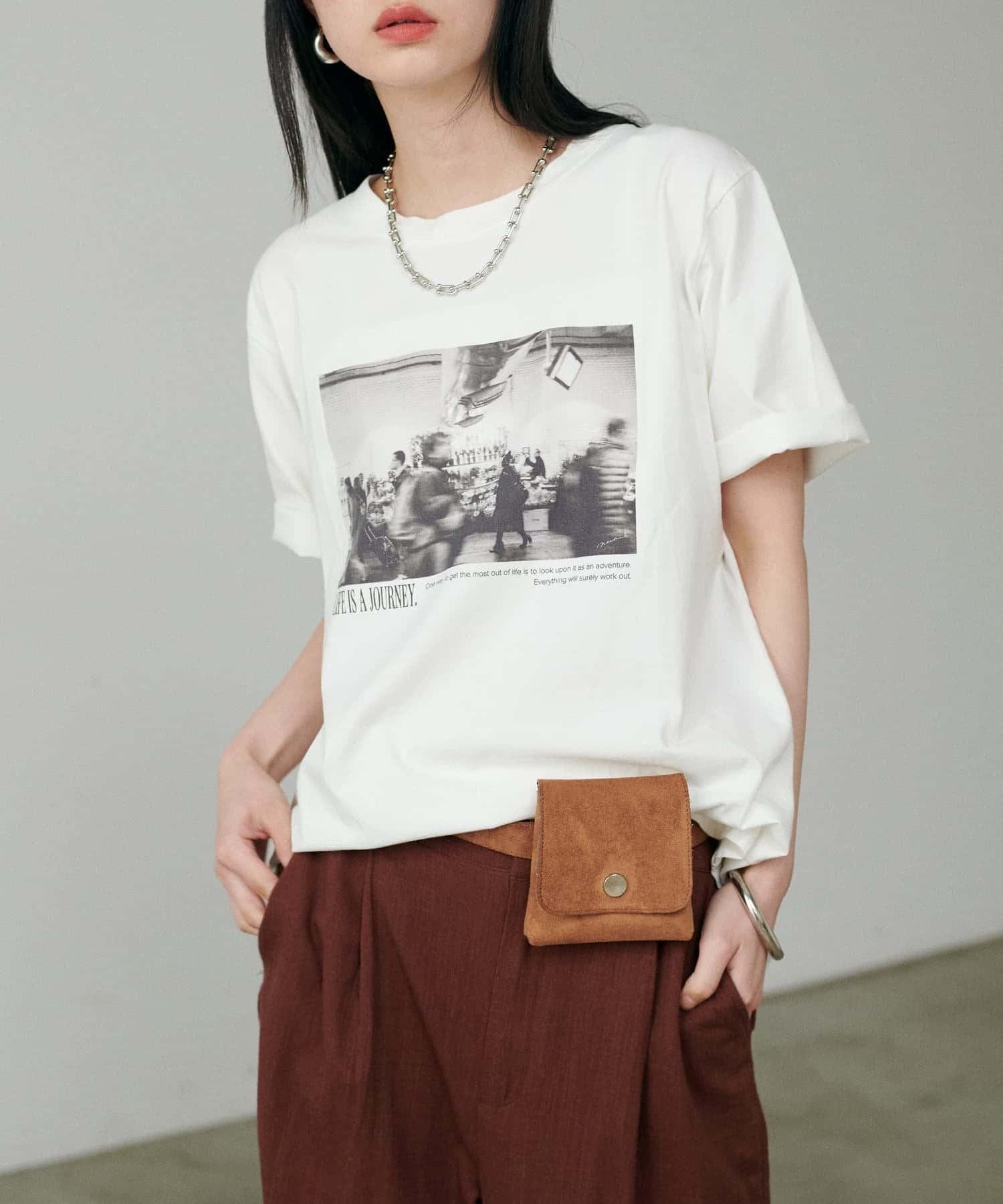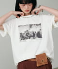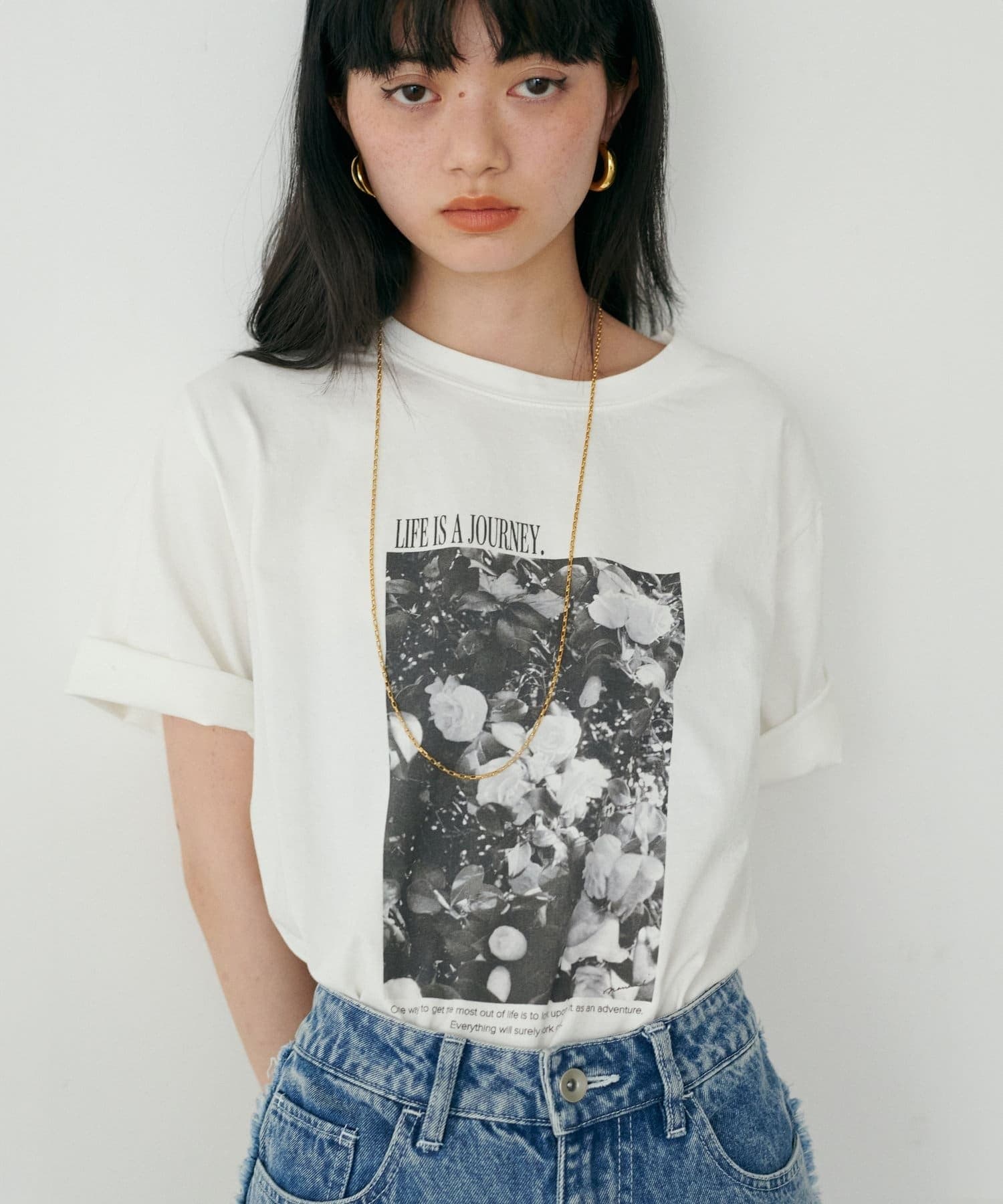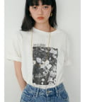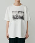 写真とメッセージ性のあるロゴが施されたオリジナルTシャツ。