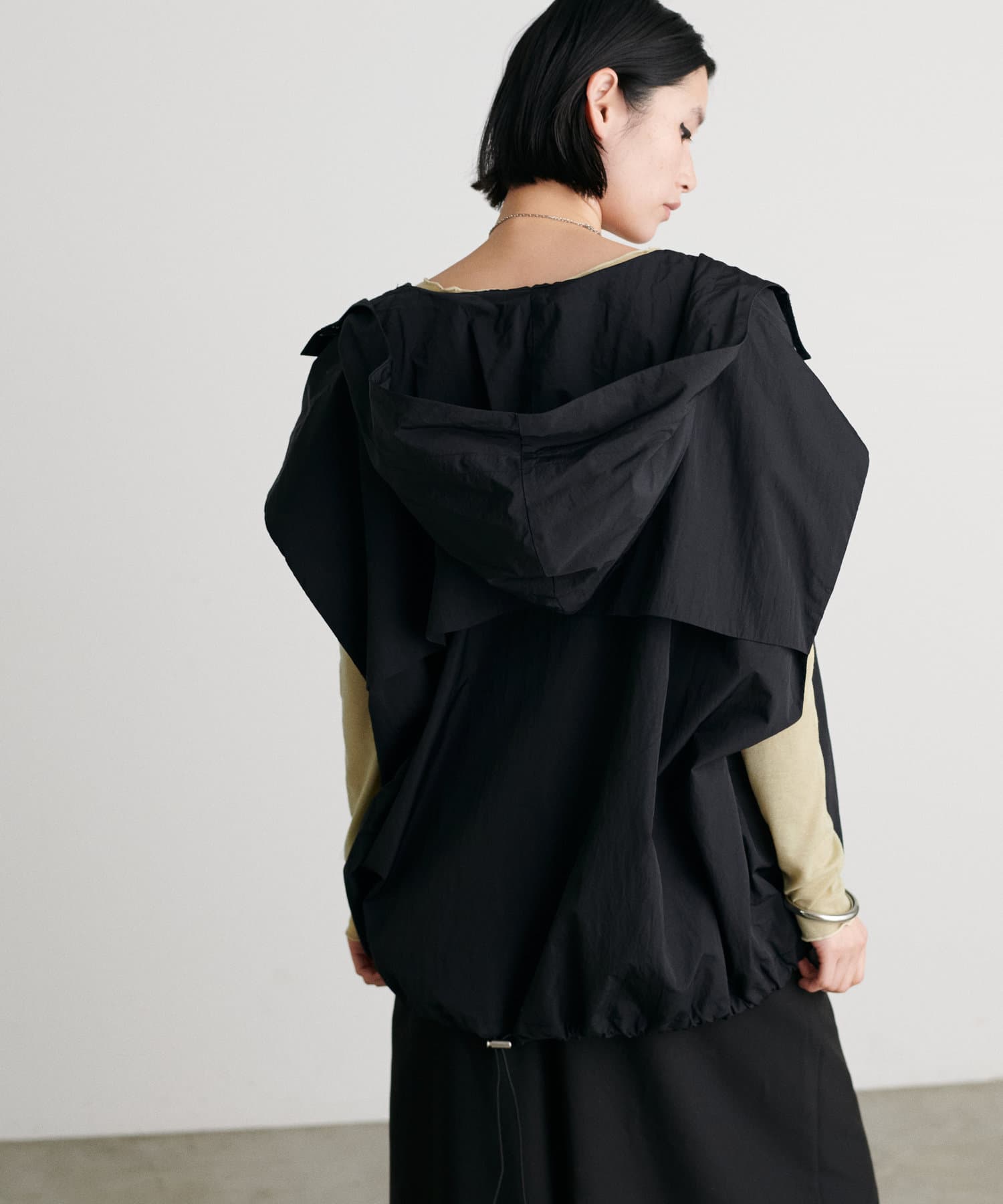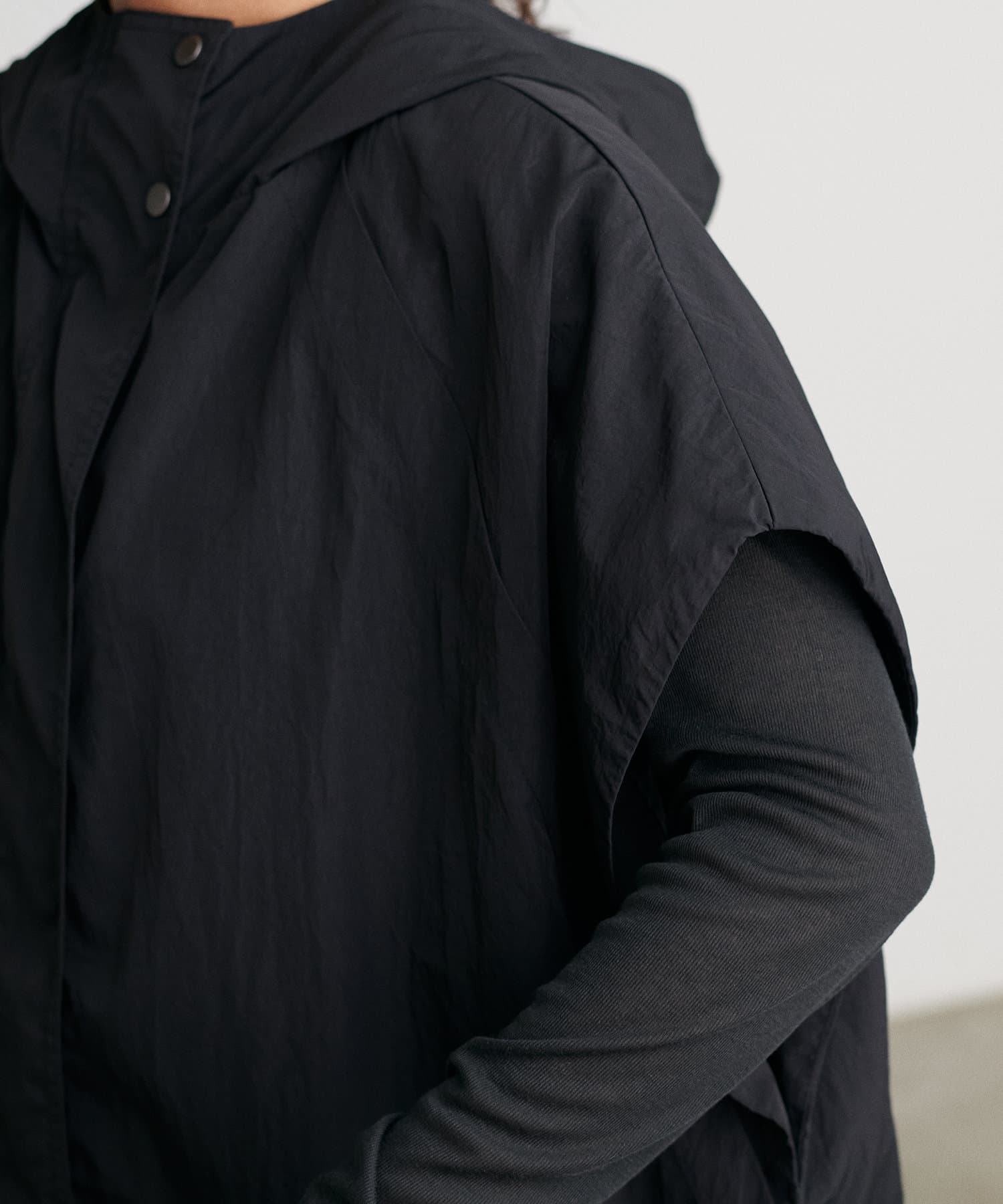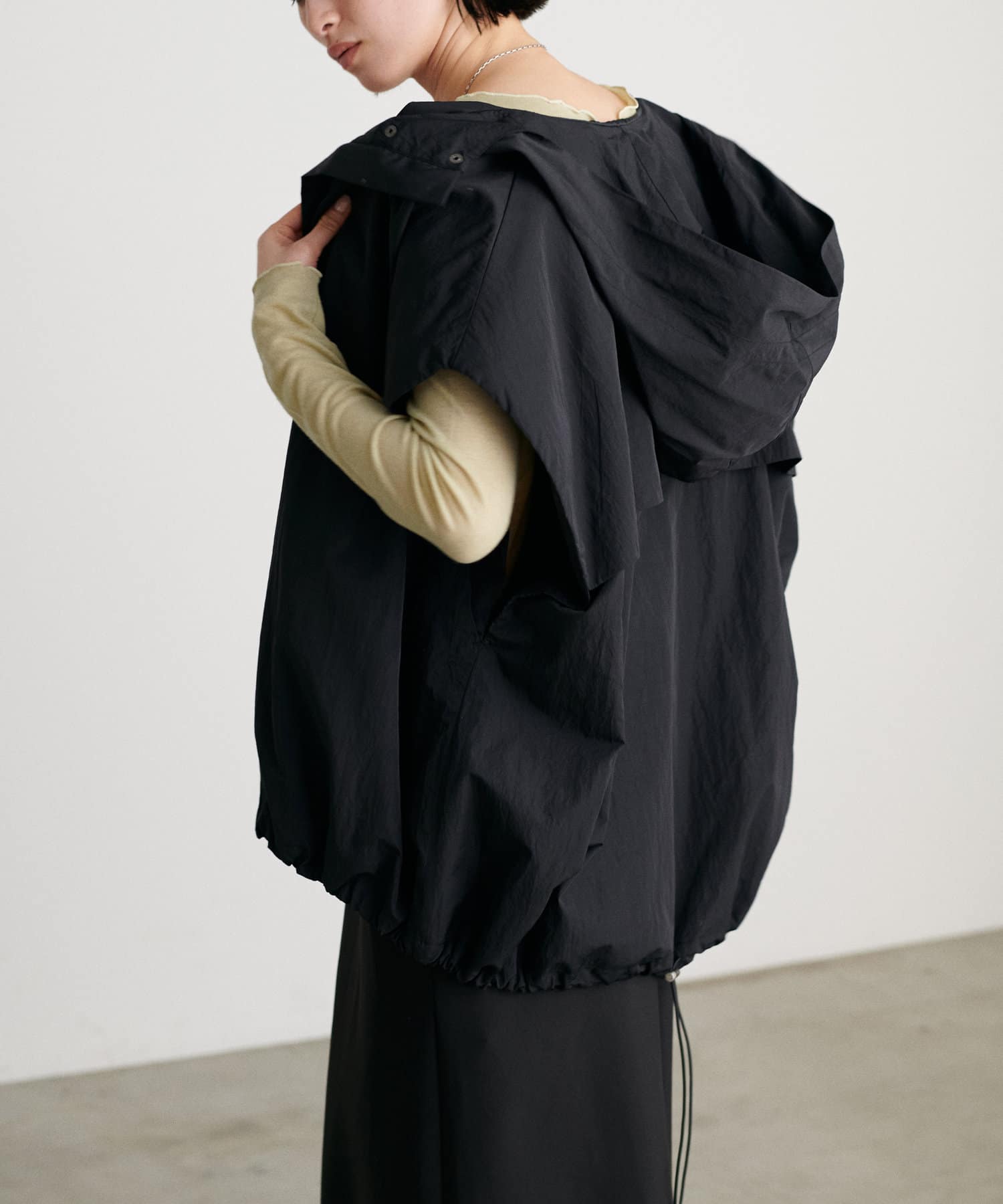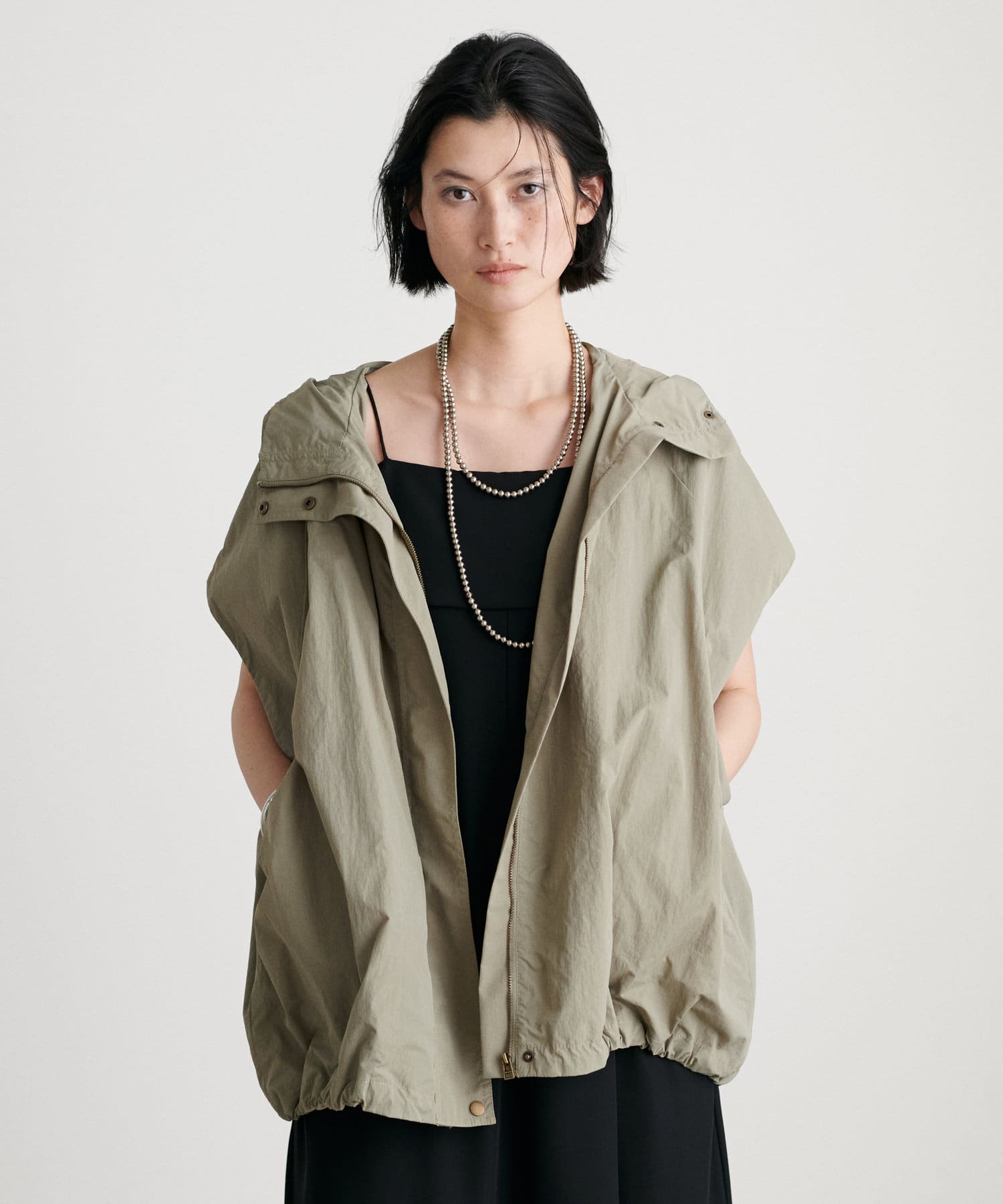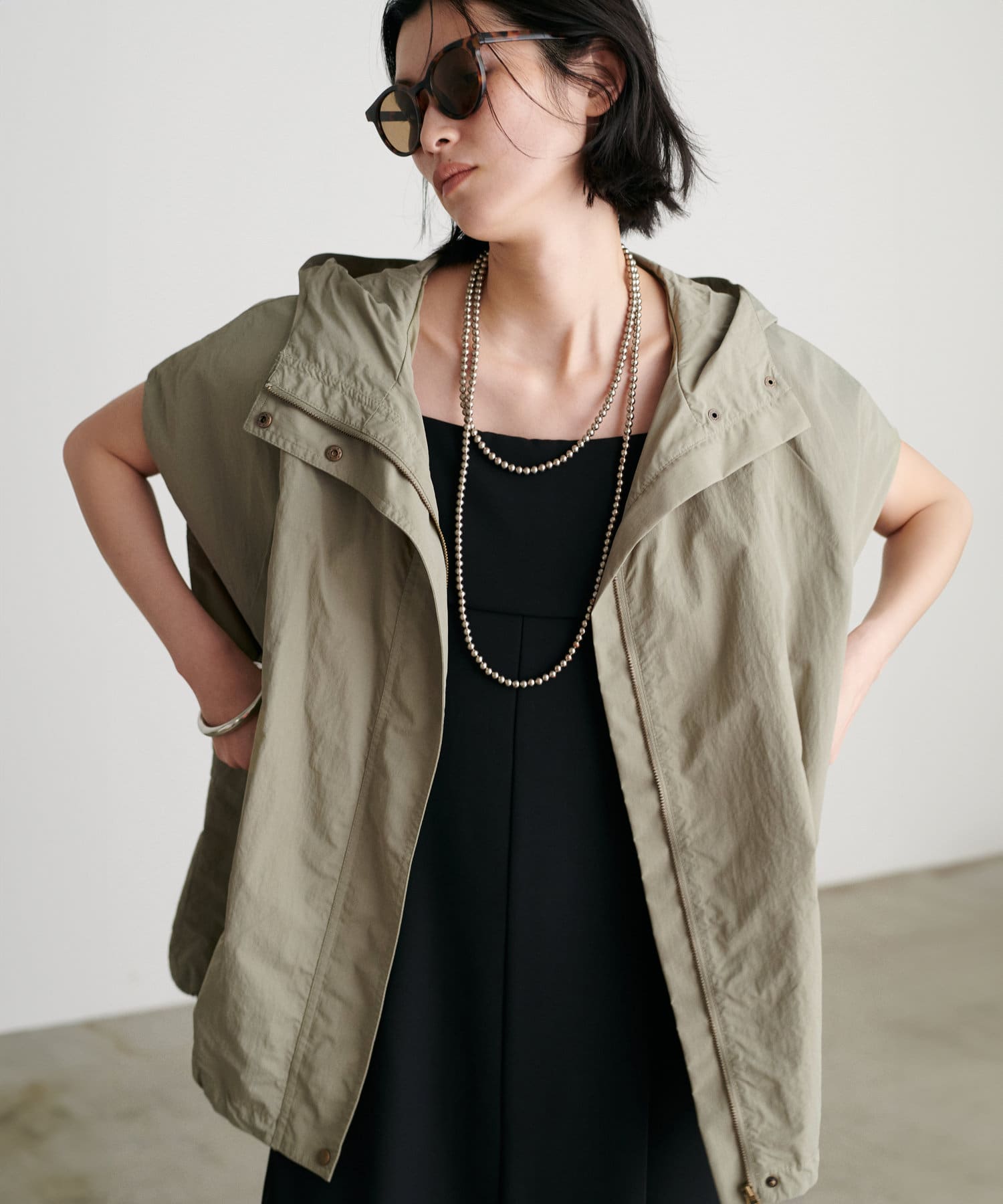 春のライトアウターとして活躍するフード付きのナイロンベストが登場。