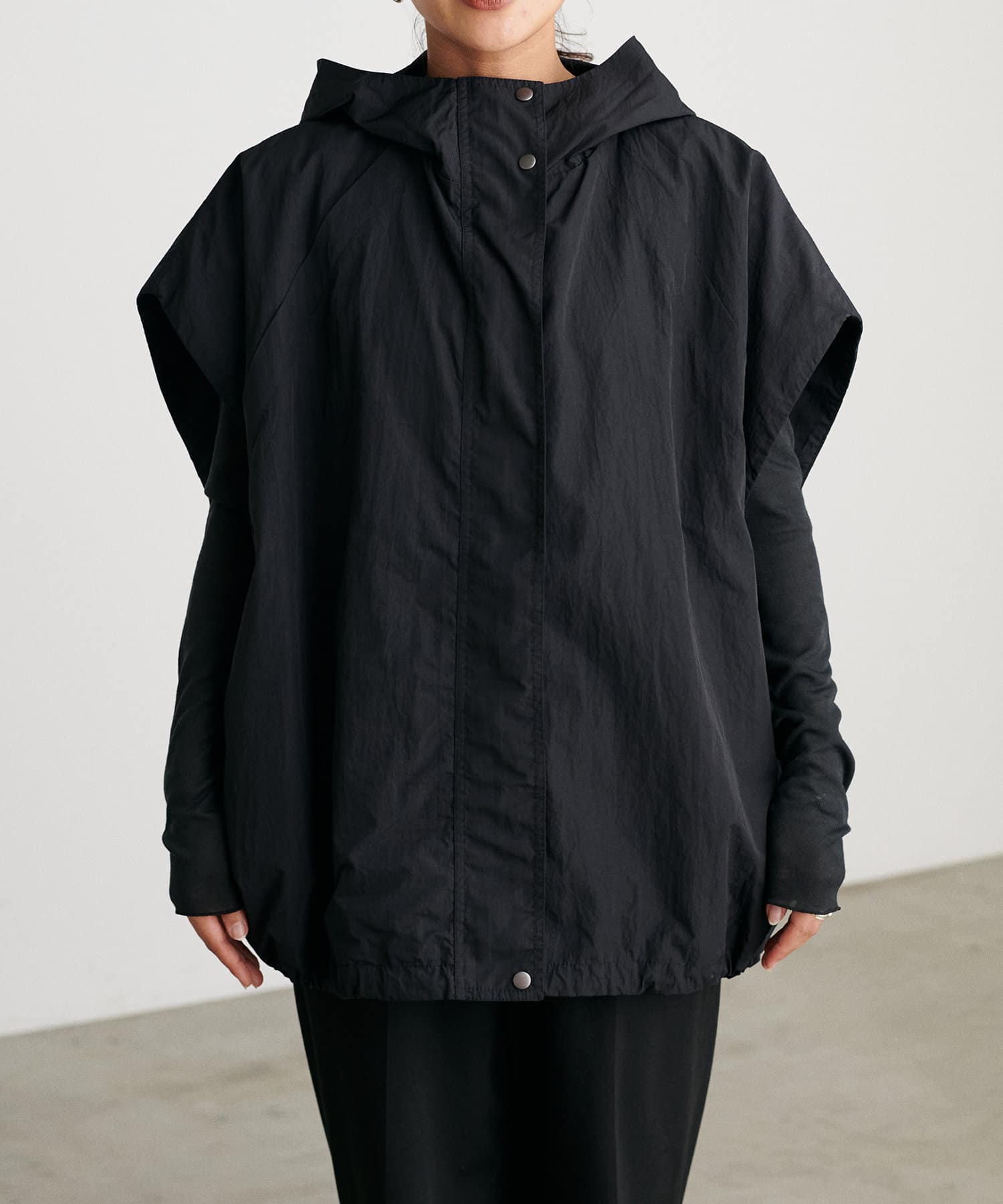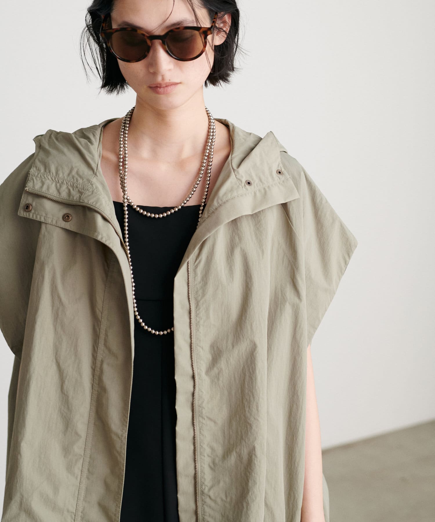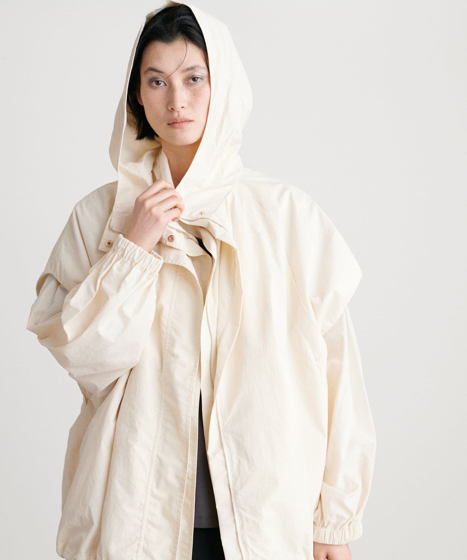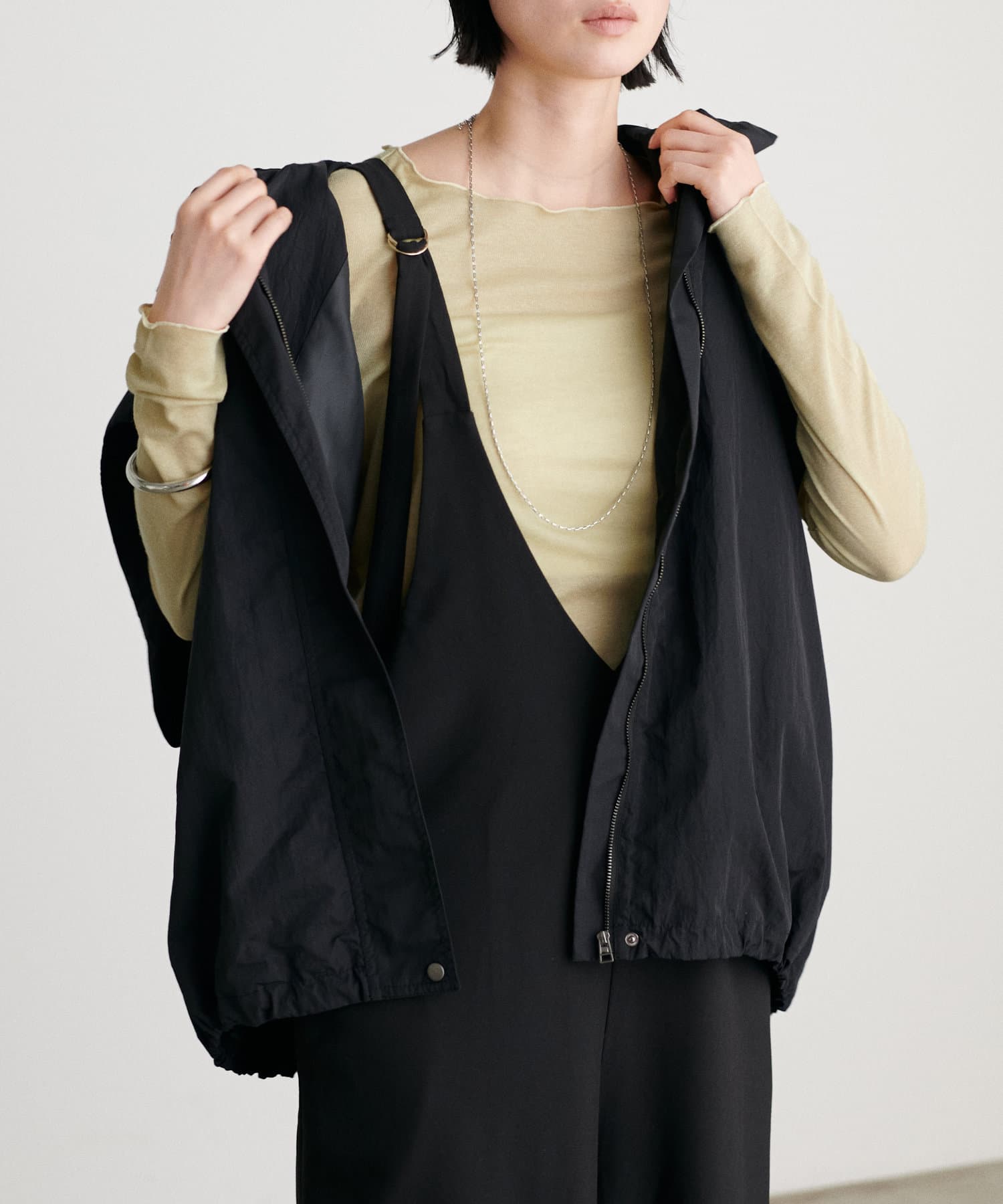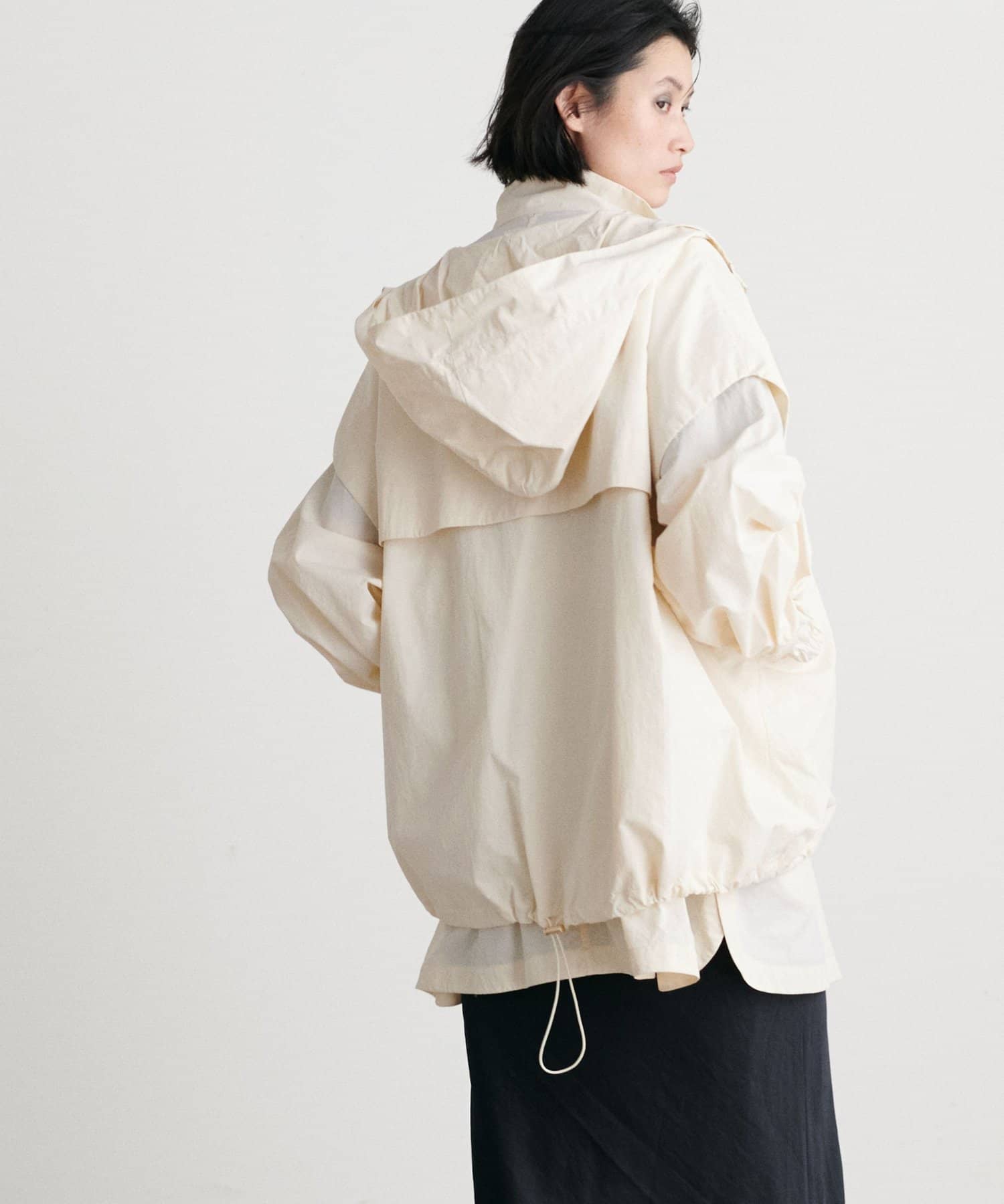 春のライトアウターとして活躍するフード付きのナイロンベストが登場。