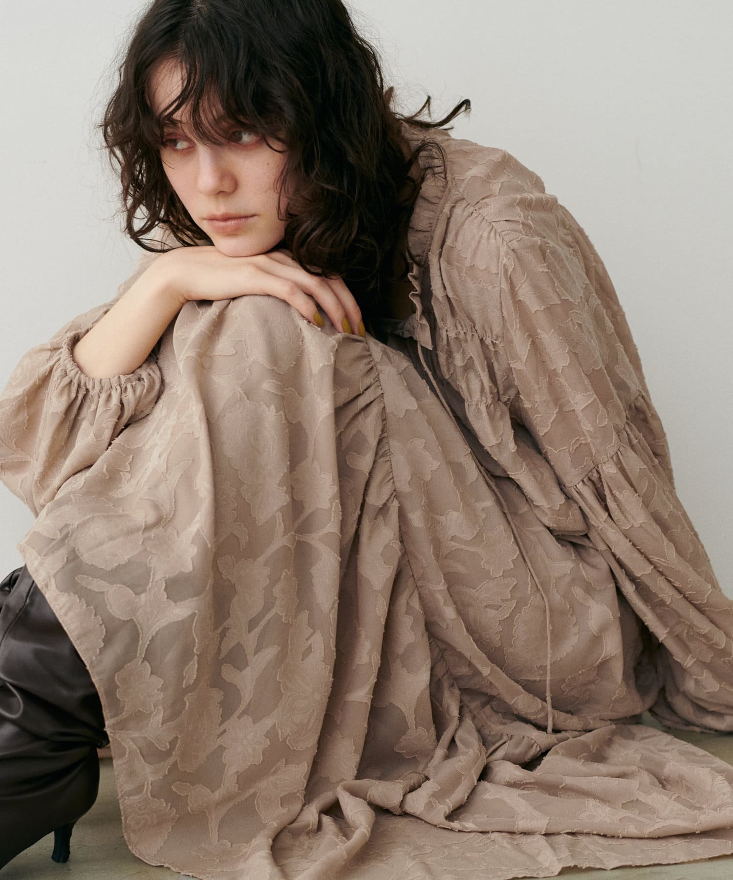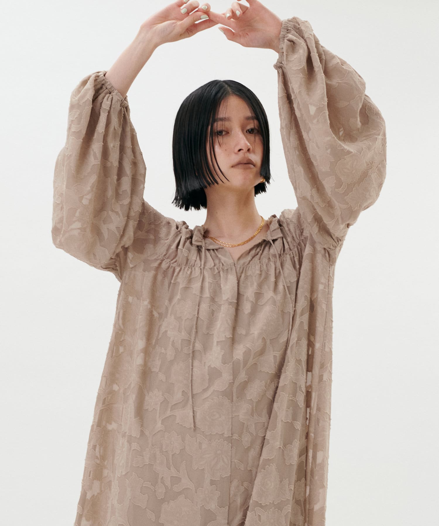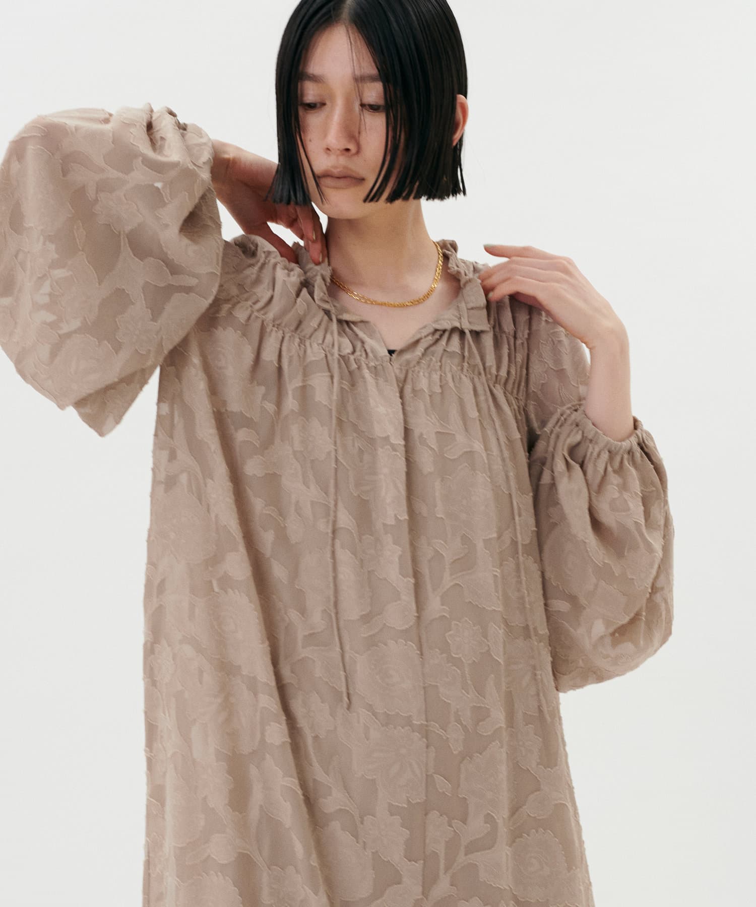 肩まわりや袖口、足元にギャザーを施すことで
