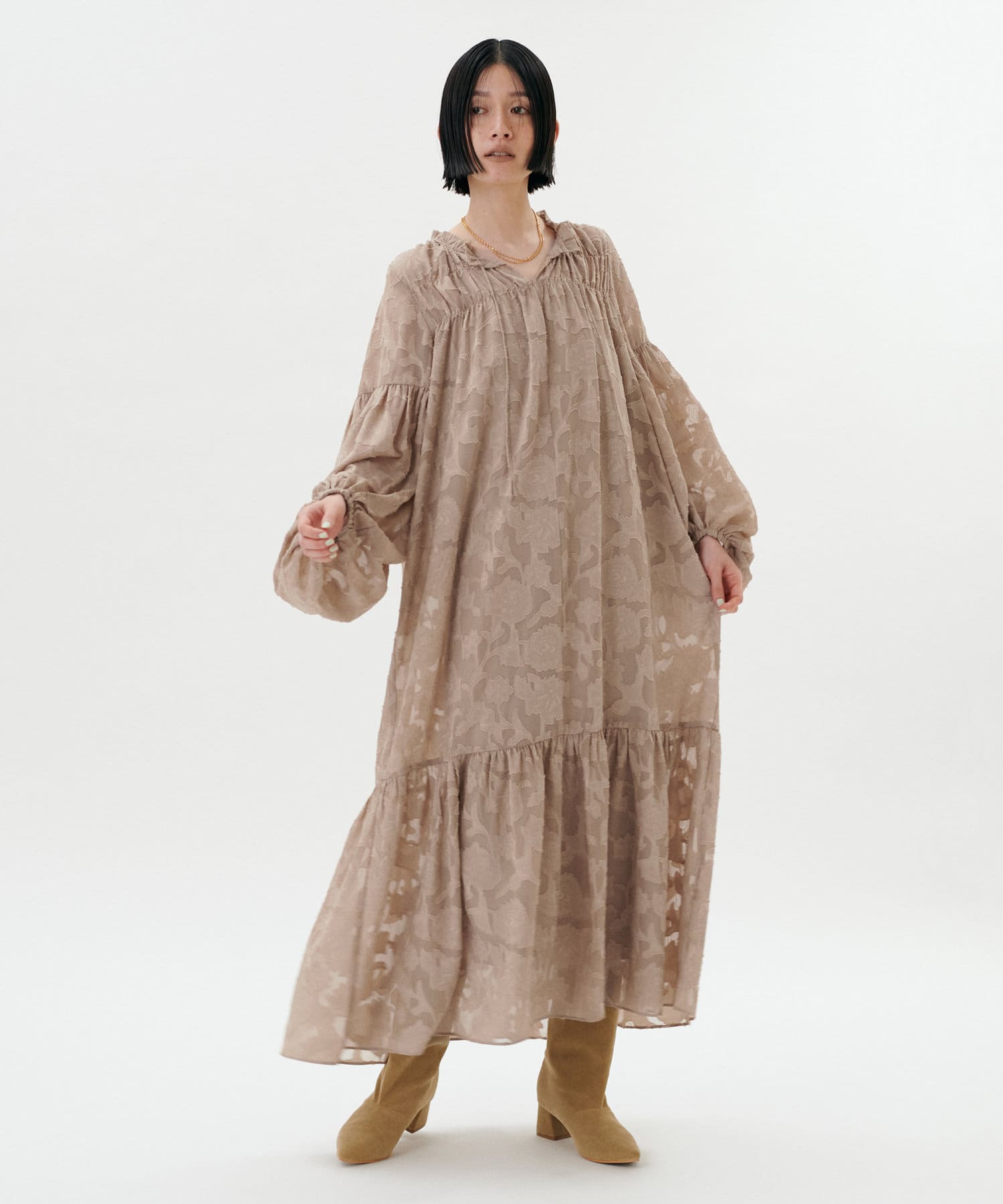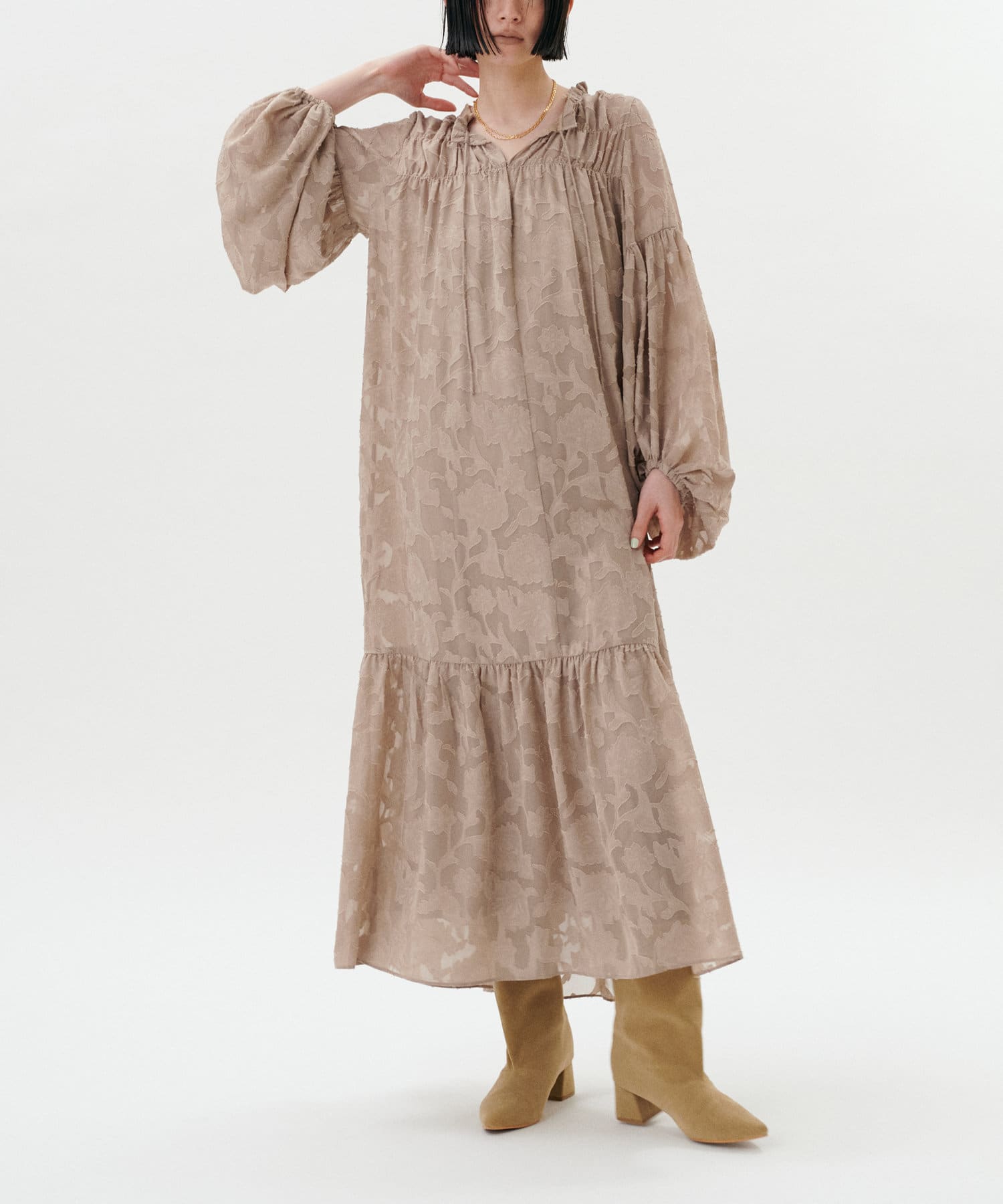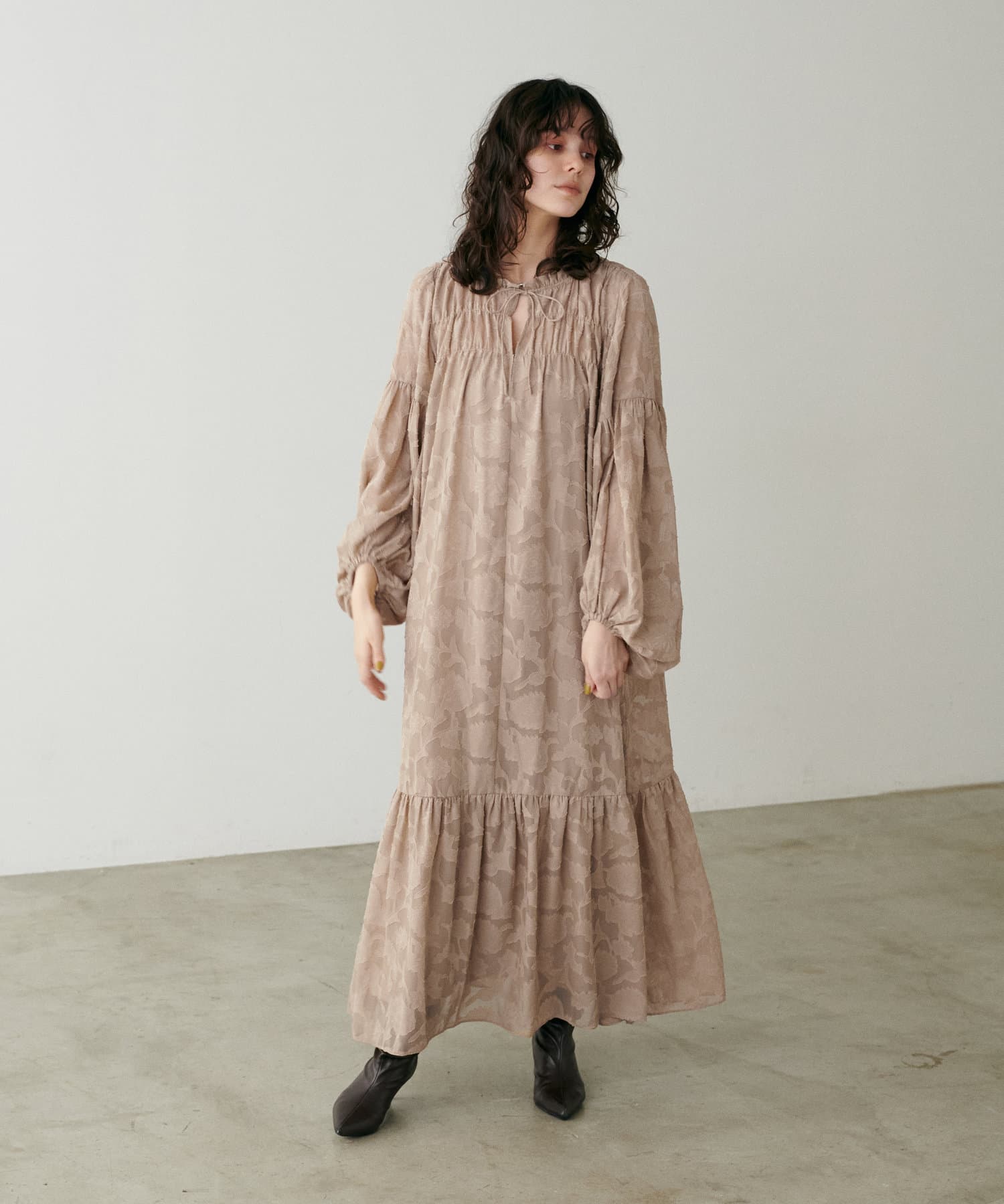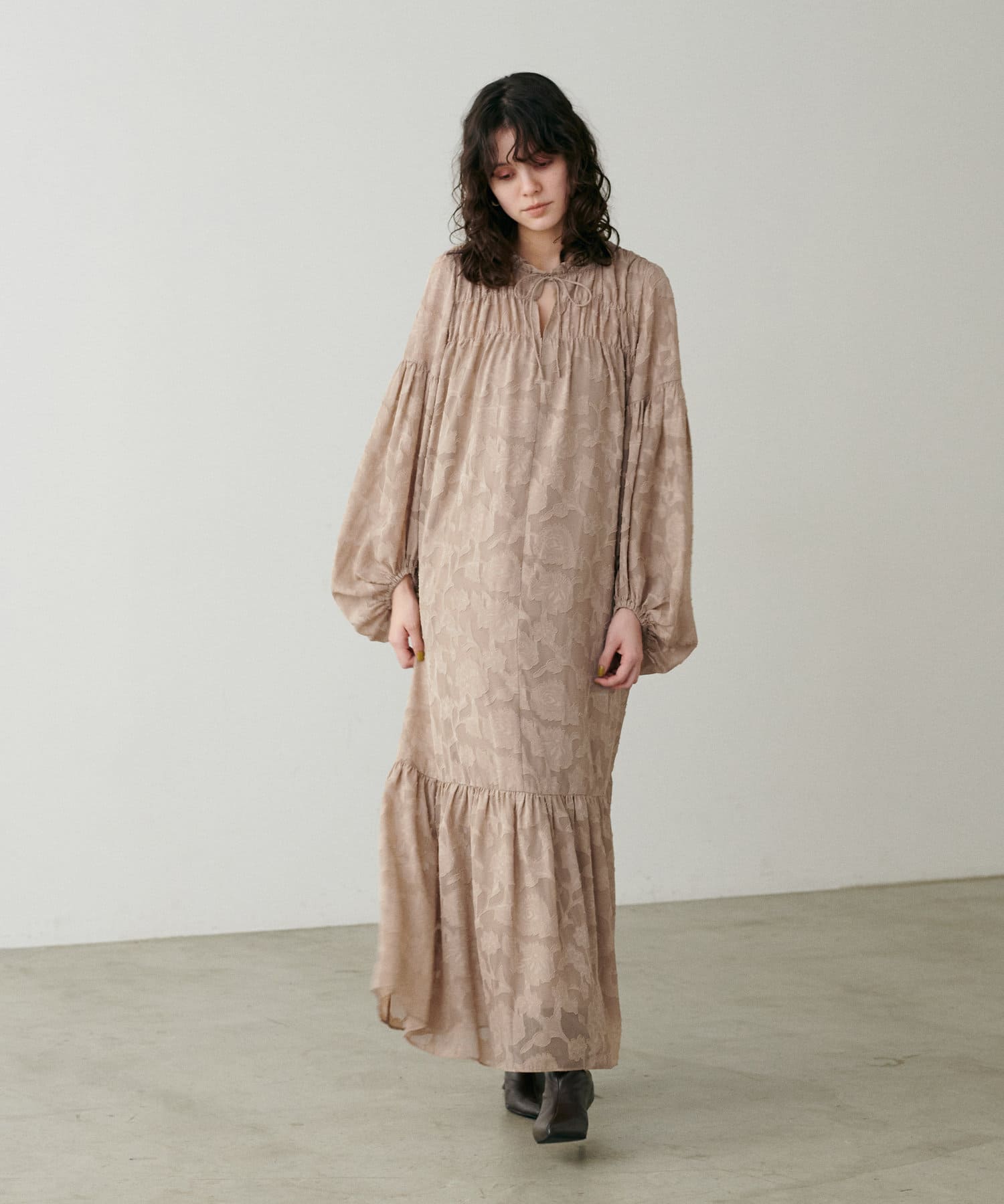 肩まわりや袖口、足元にギャザーを施すことで