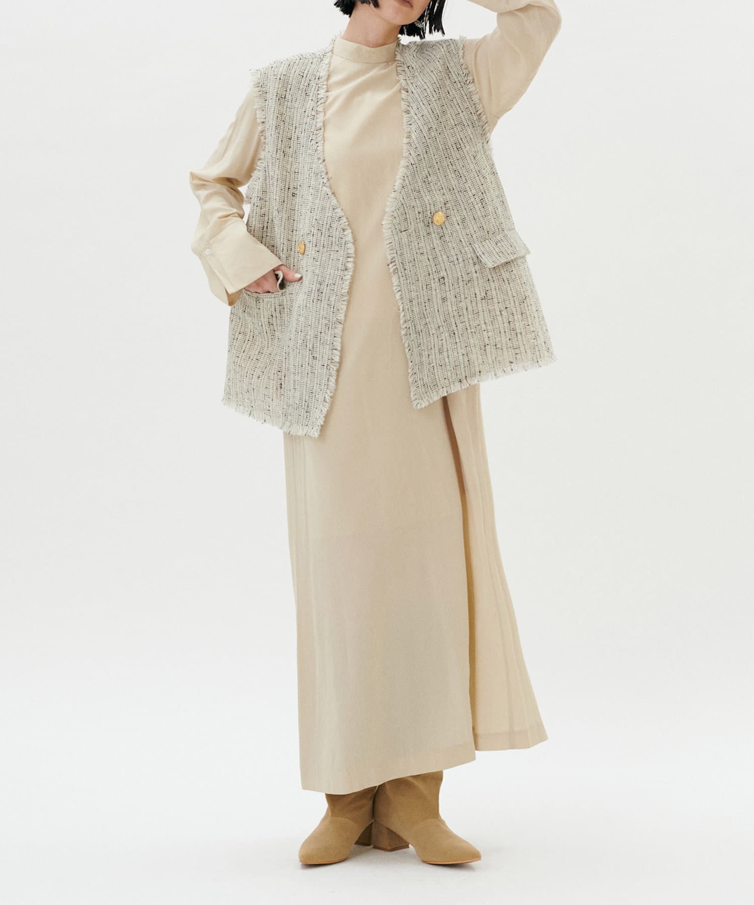 マットな素材感とギャップのあるツイードなどの素材のアイテムと
