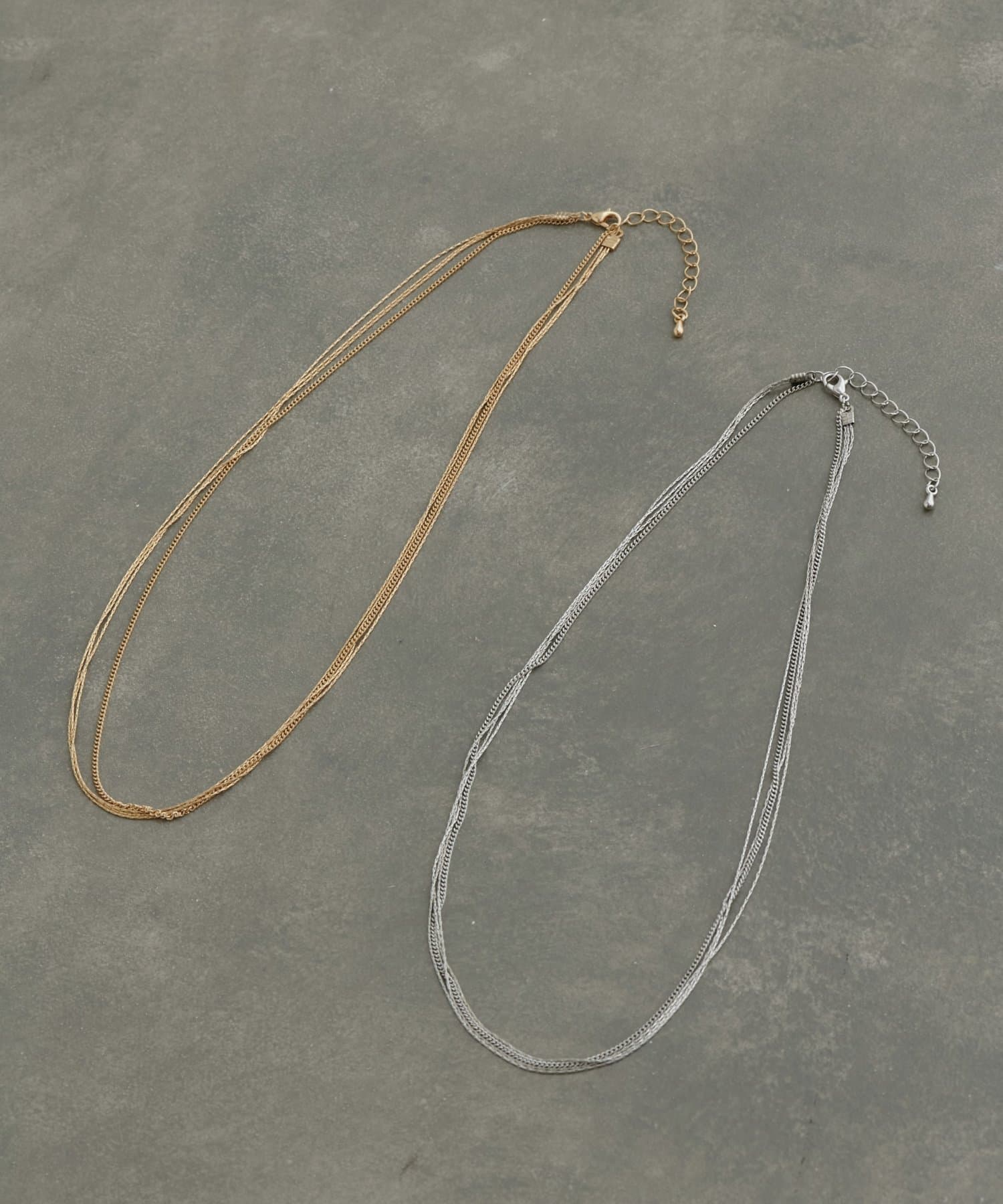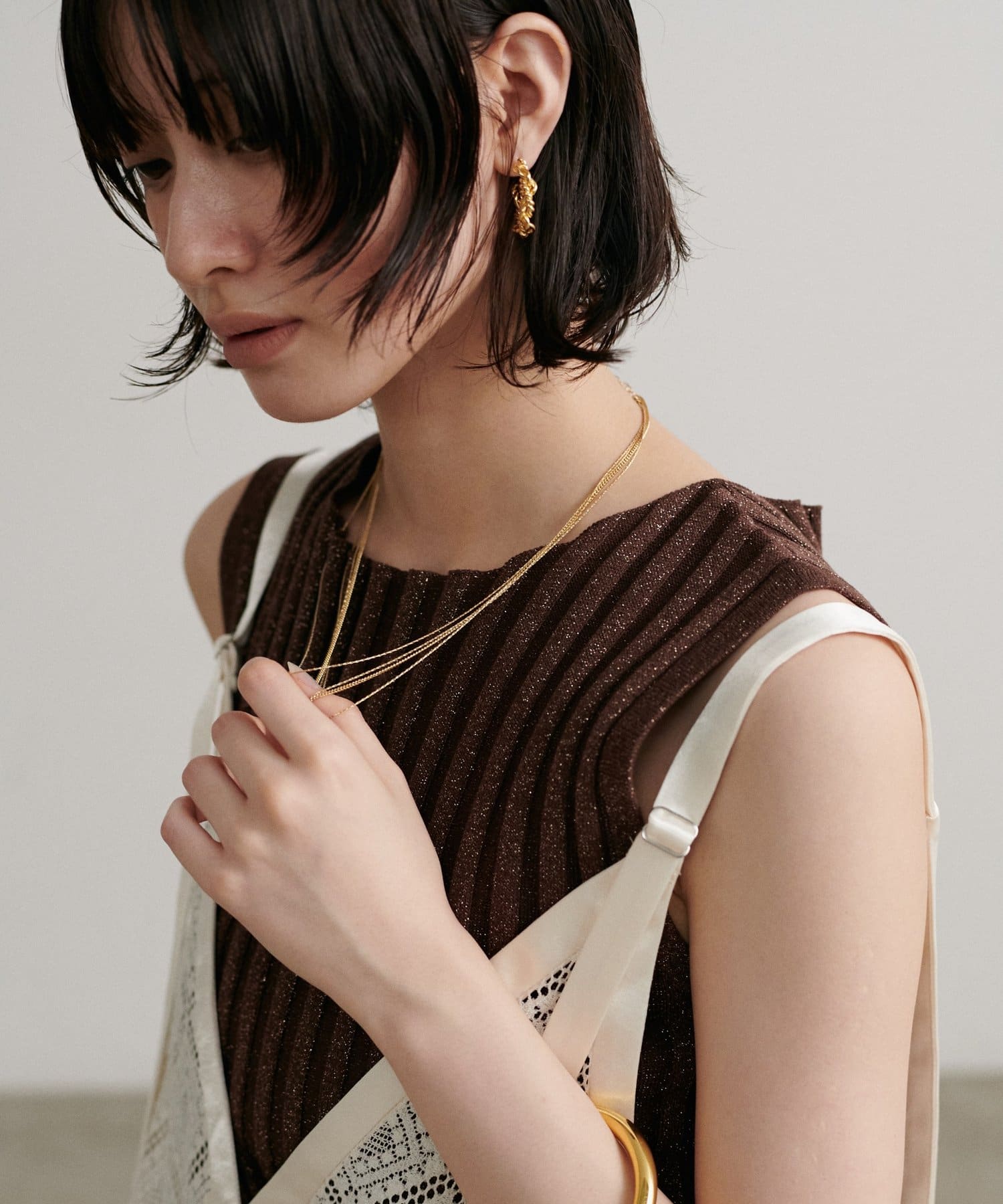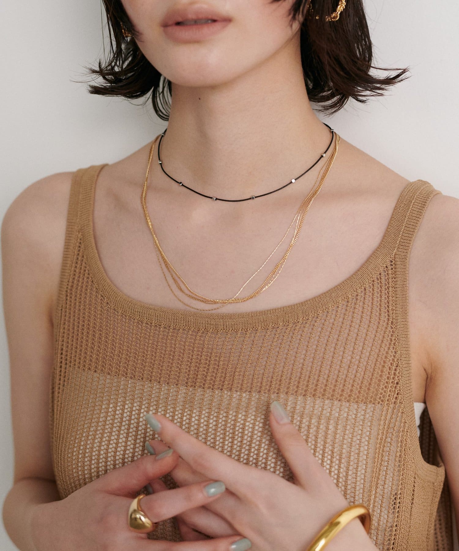 大人な華やかさとモダンな印象を兼ね備えた、重ねチェーンネックレス。