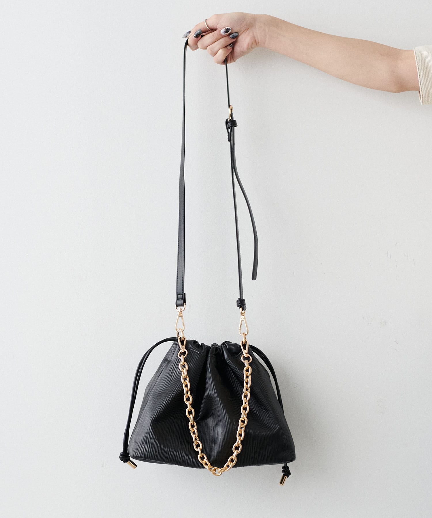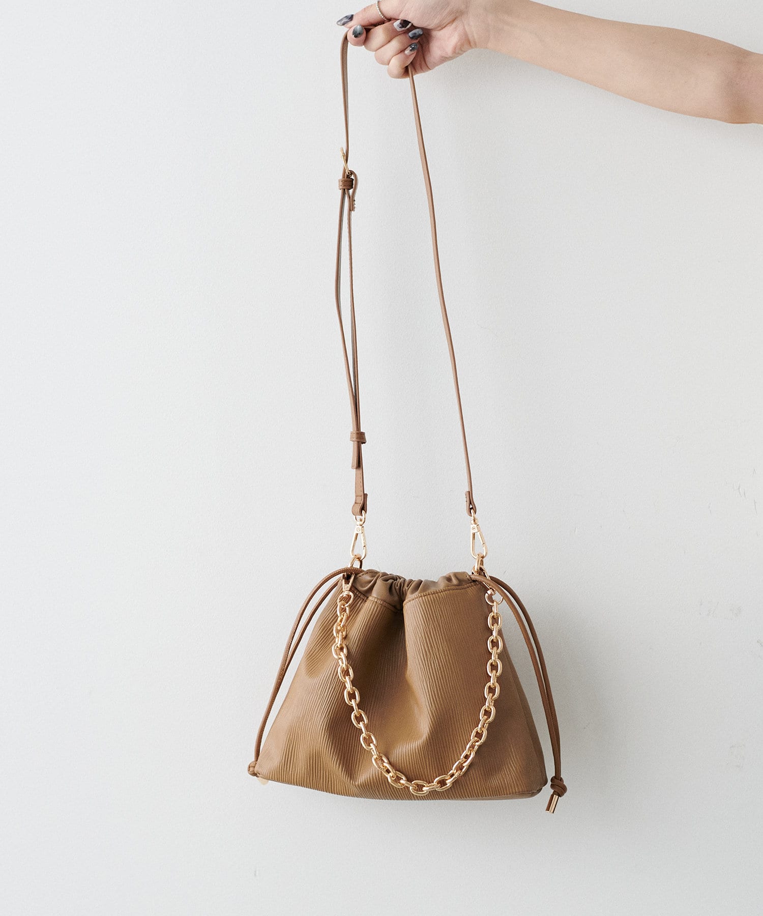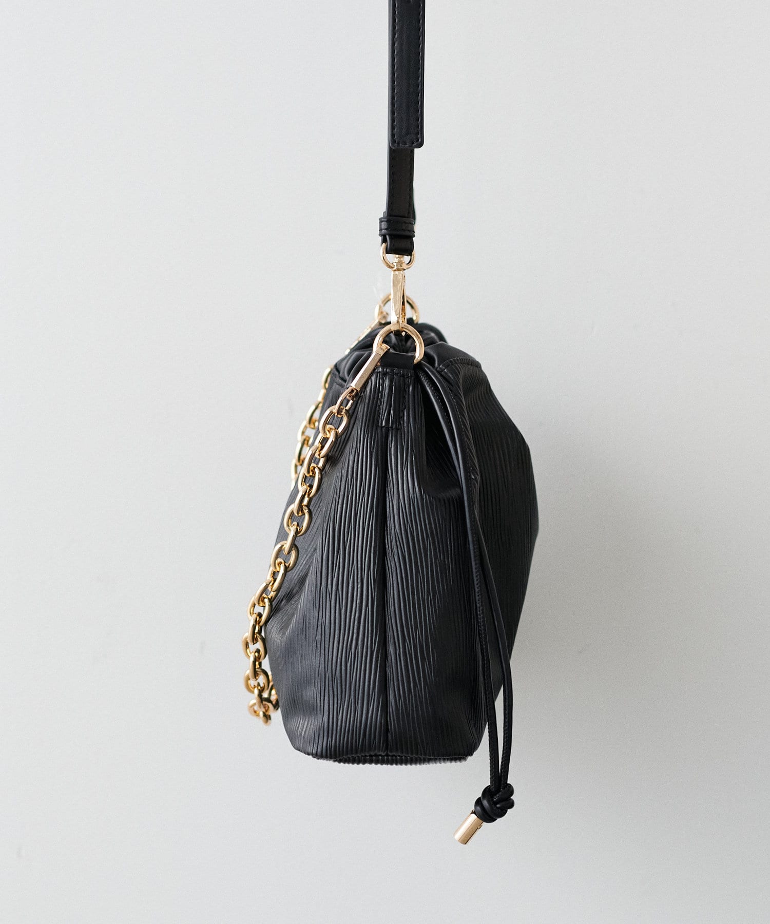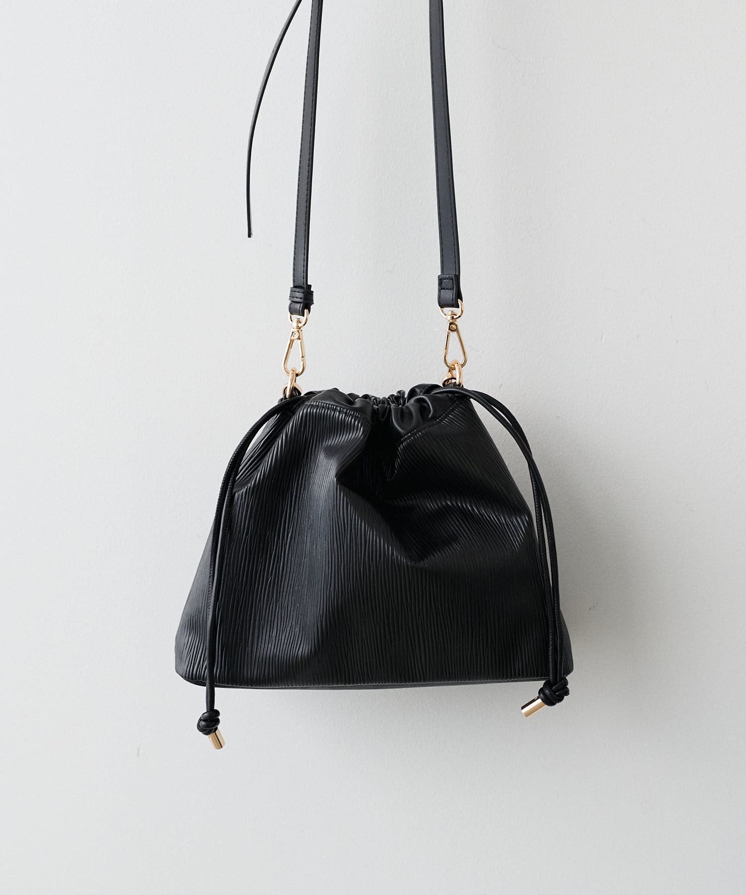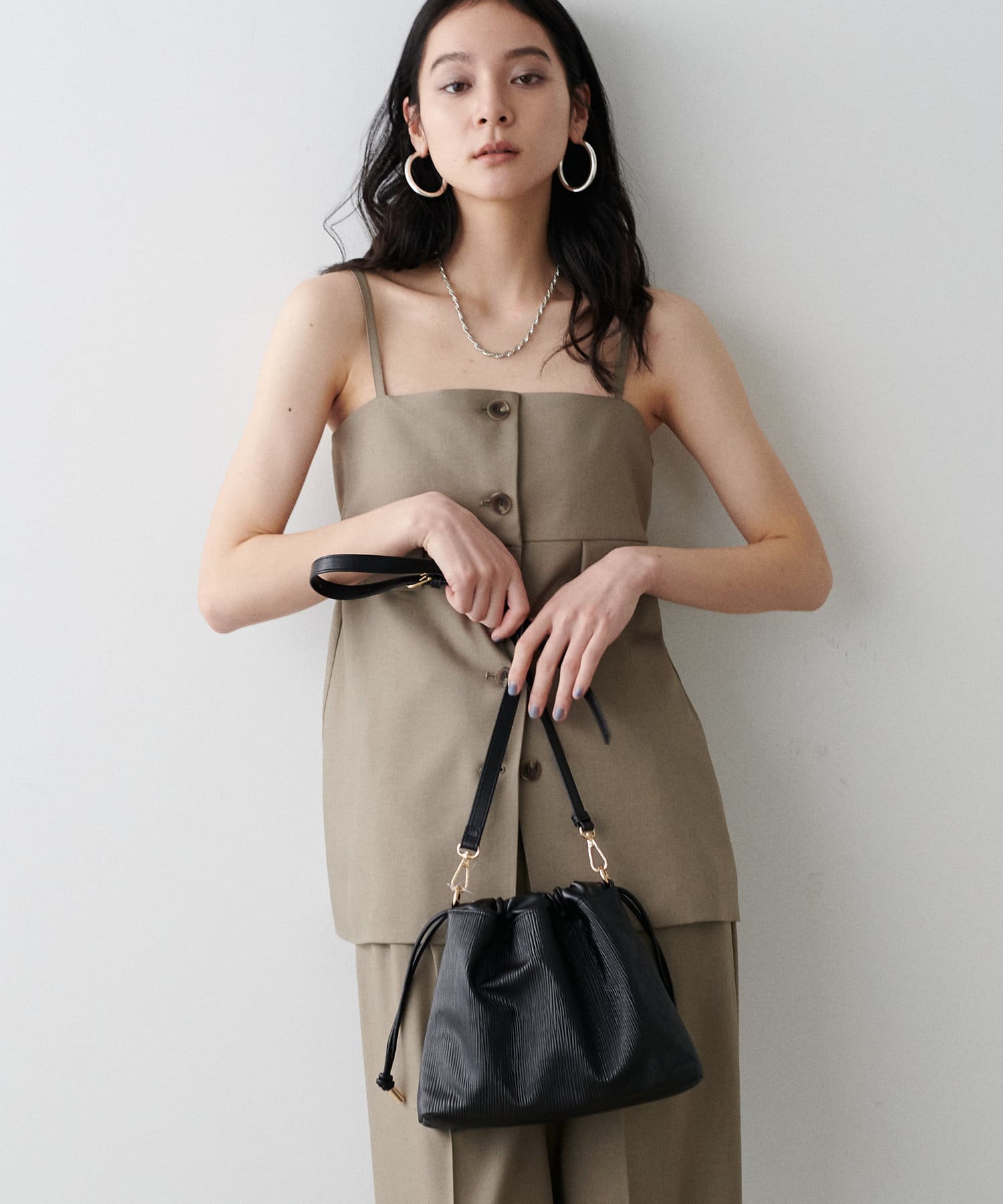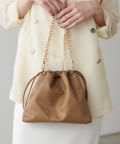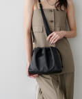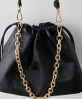 ハードに見えがちなレザーも巾着デザインになることで、柔らかく上品な印象に。