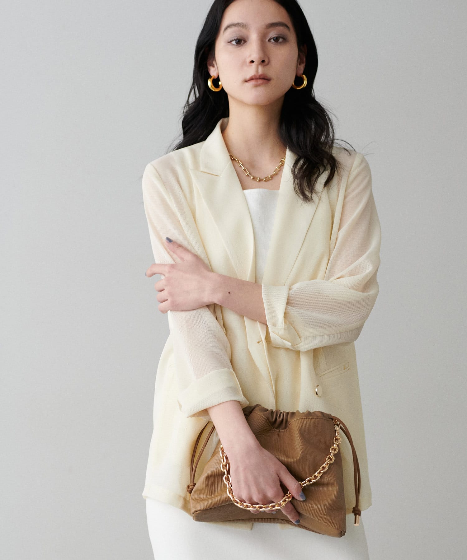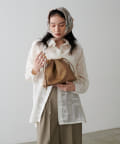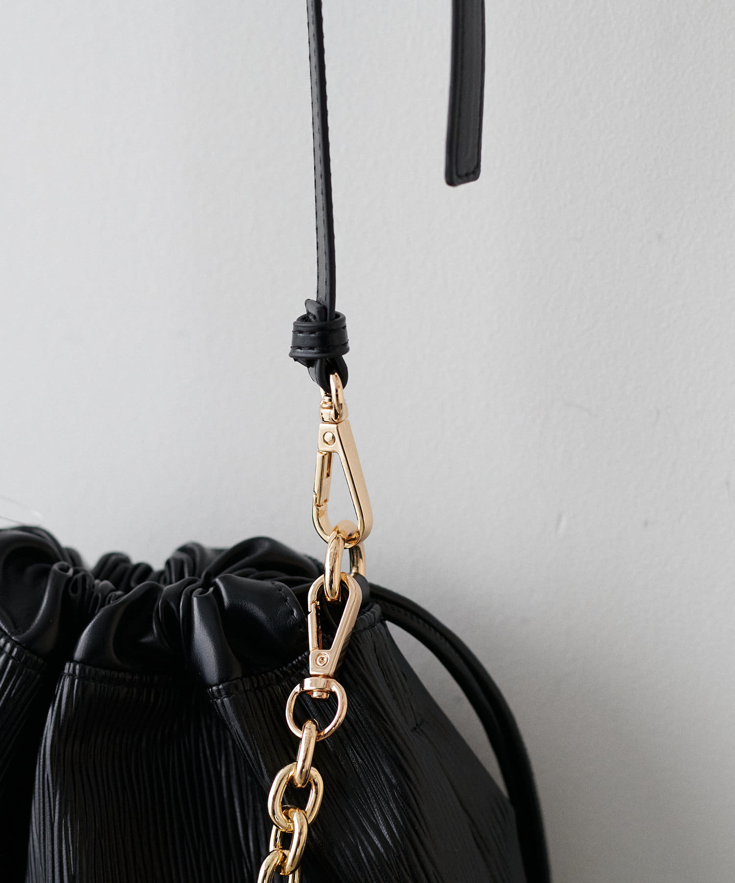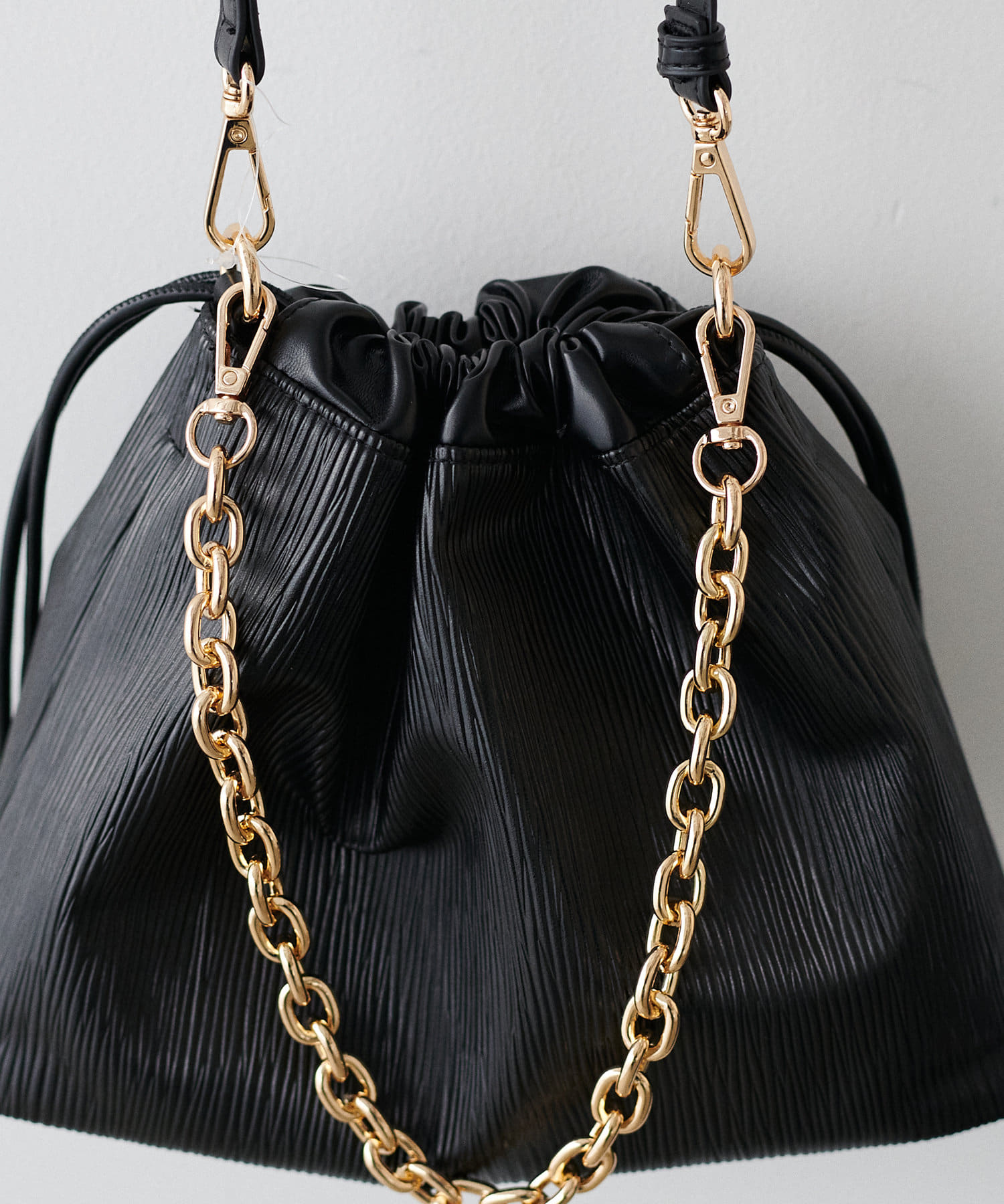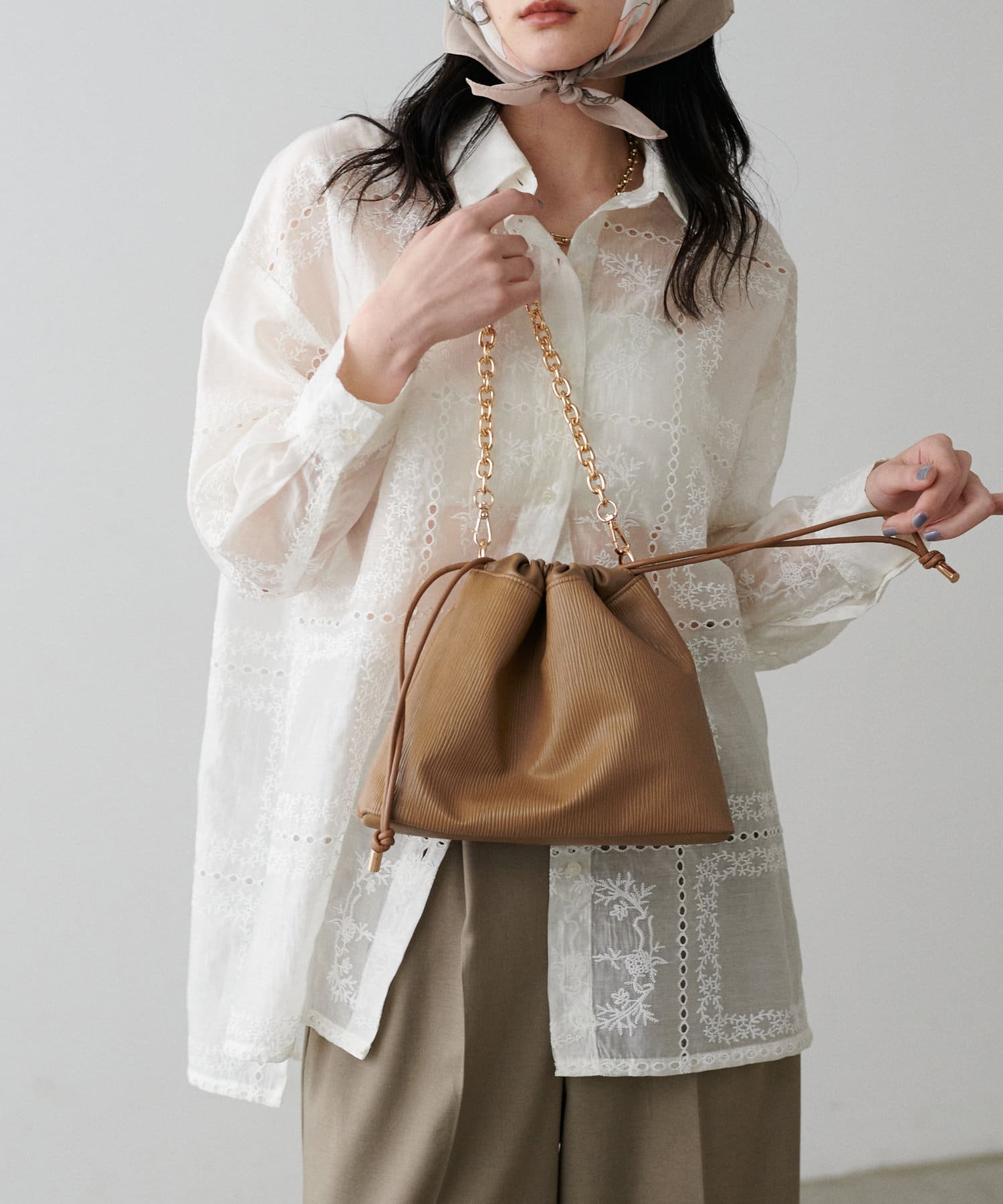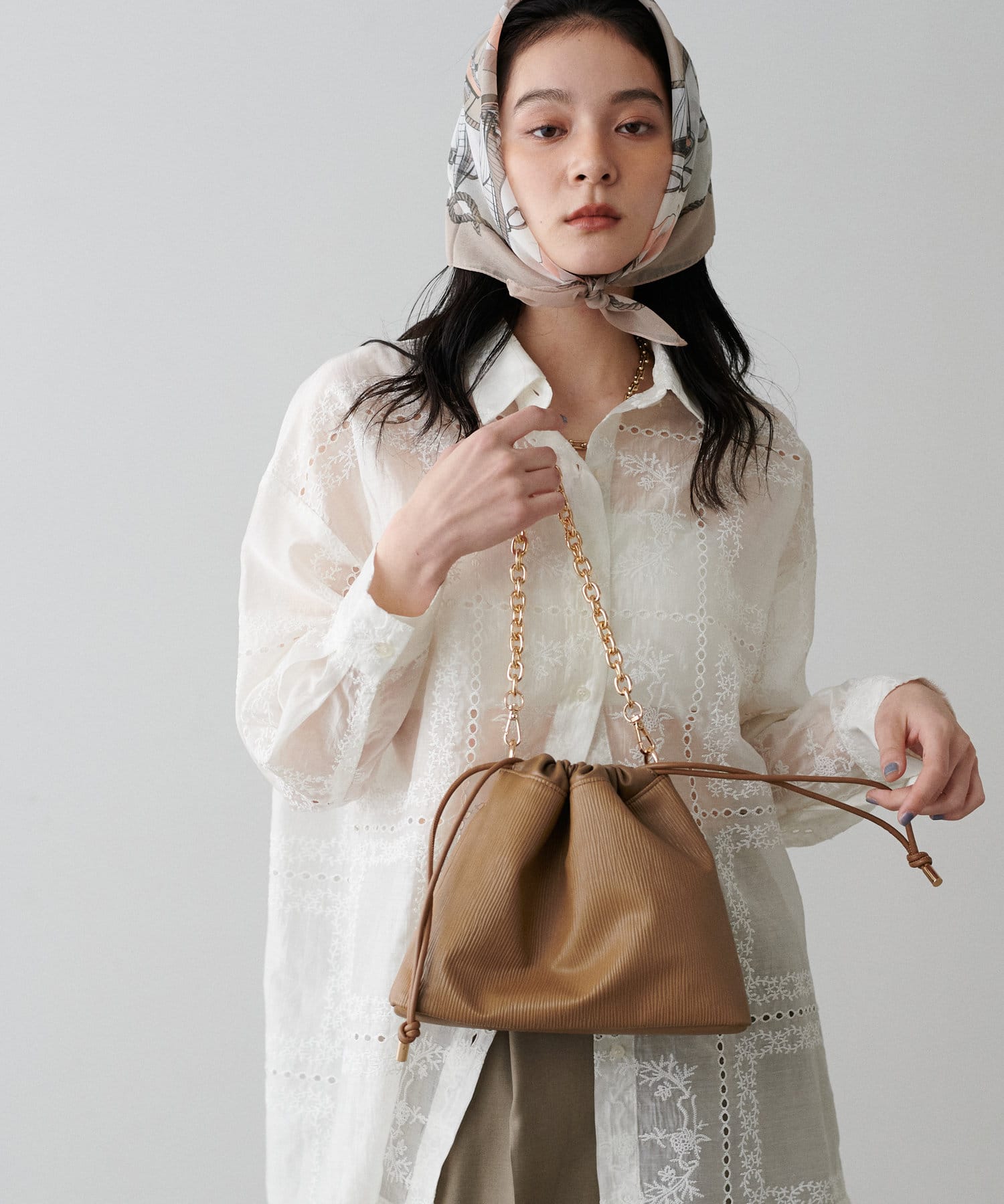 ハードに見えがちなレザーも巾着デザインになることで、柔らかく上品な印象に。