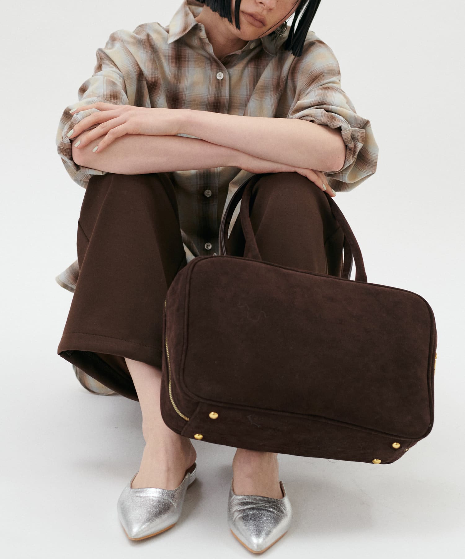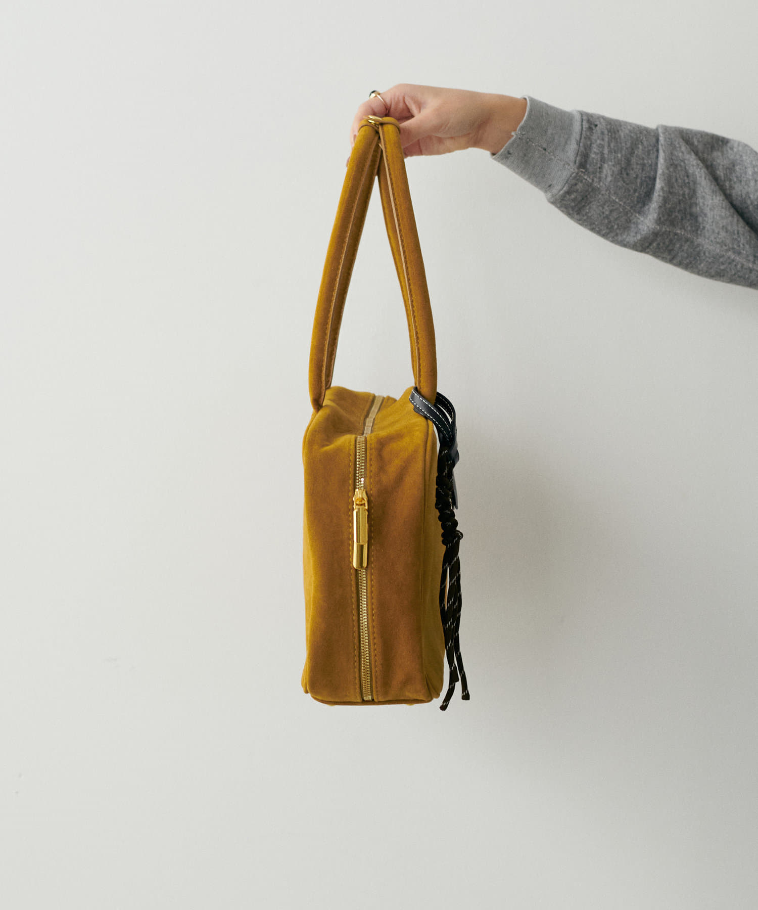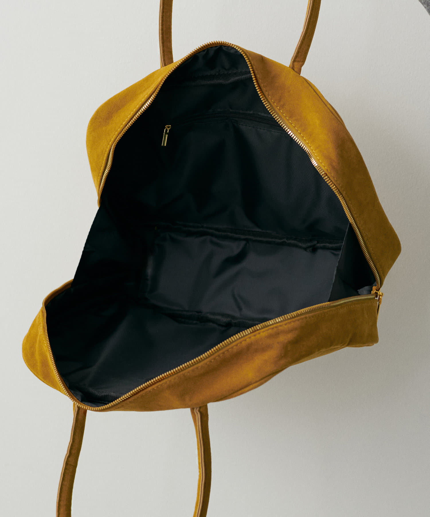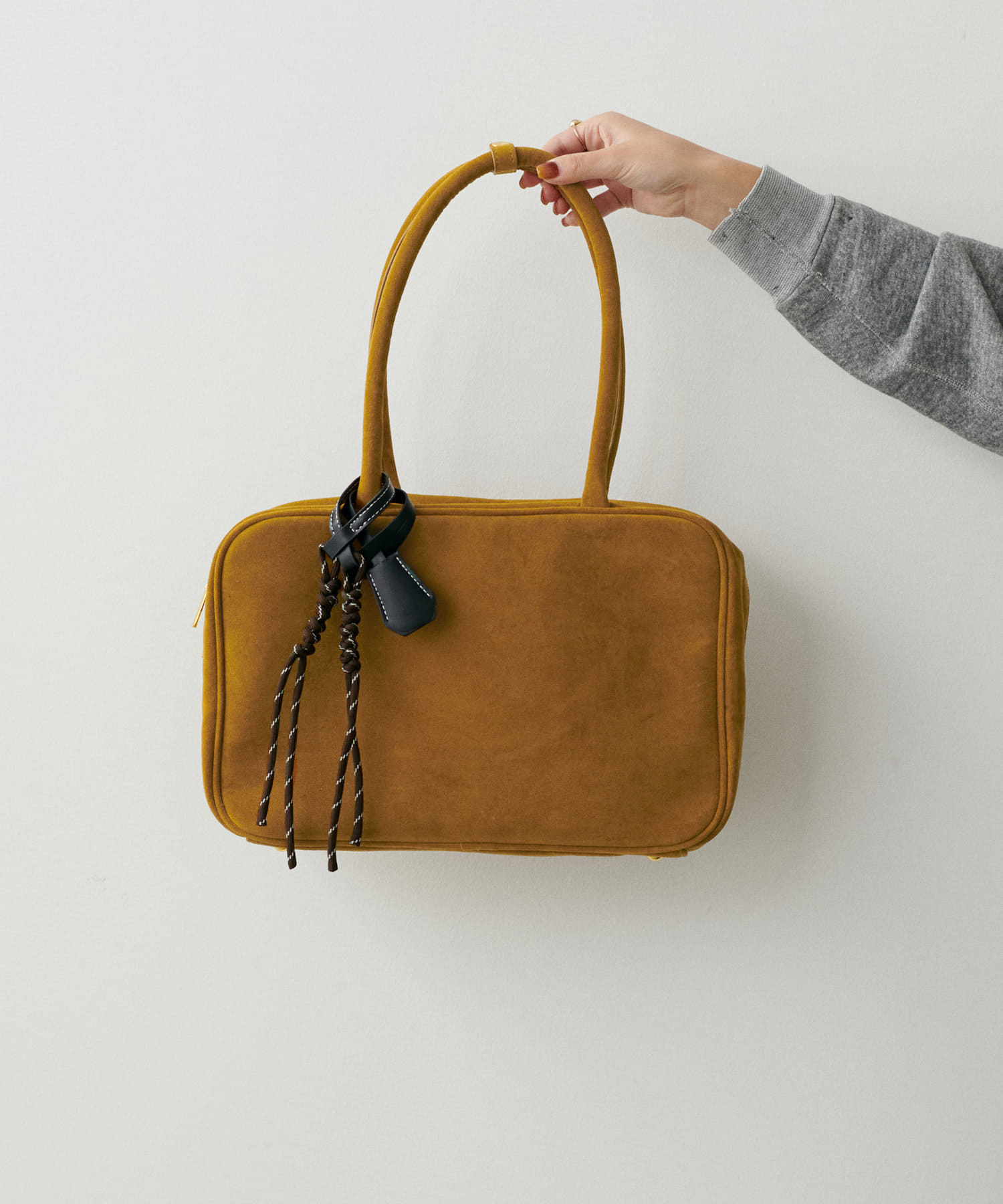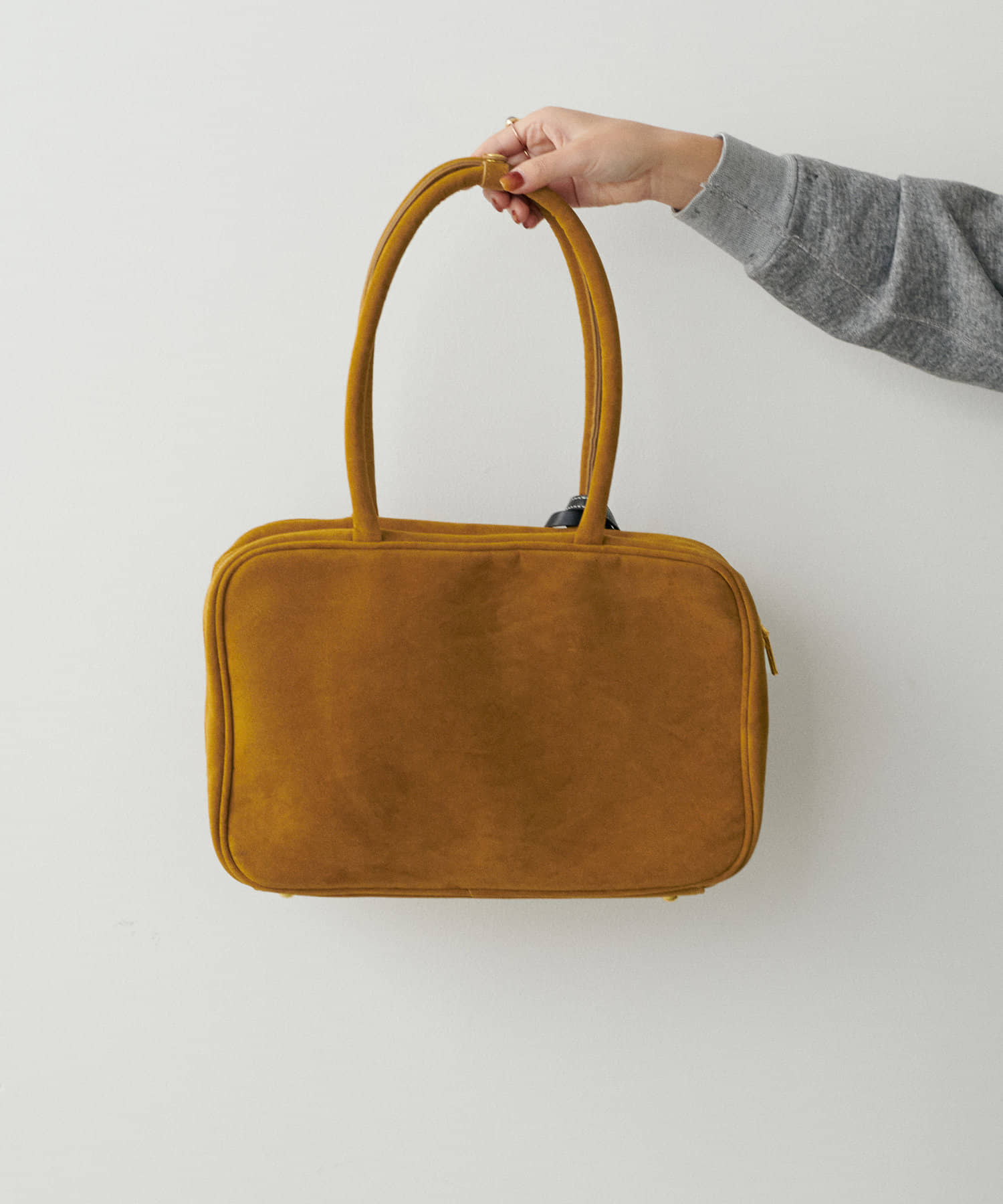 容量の大きいサイズ感のスエード風のハンドバッグ。
